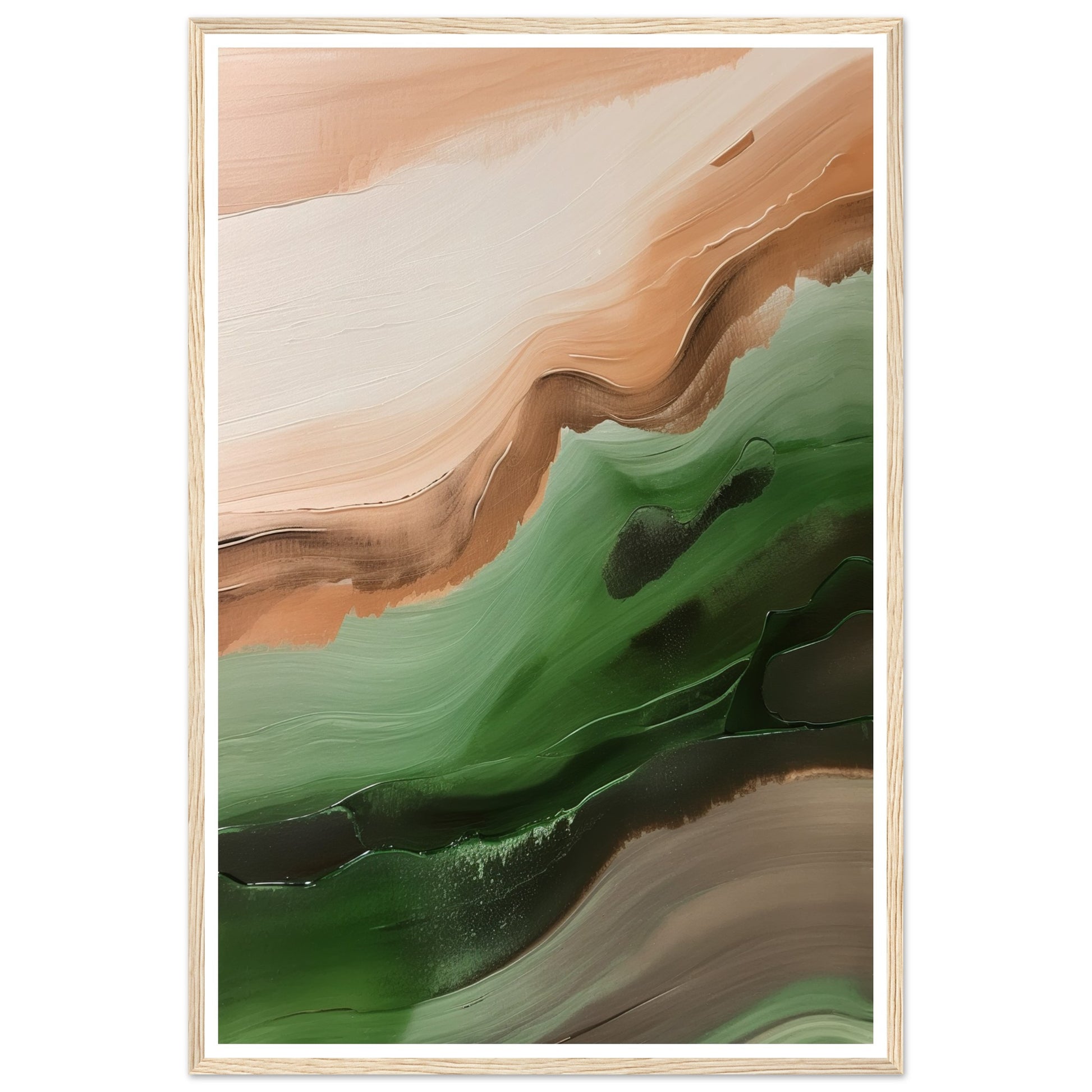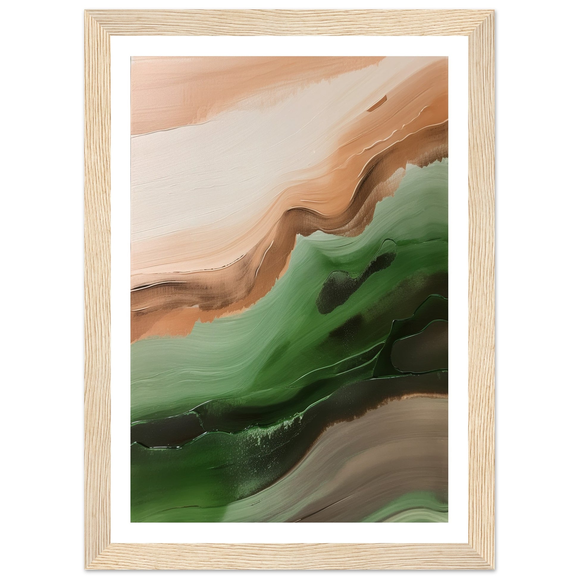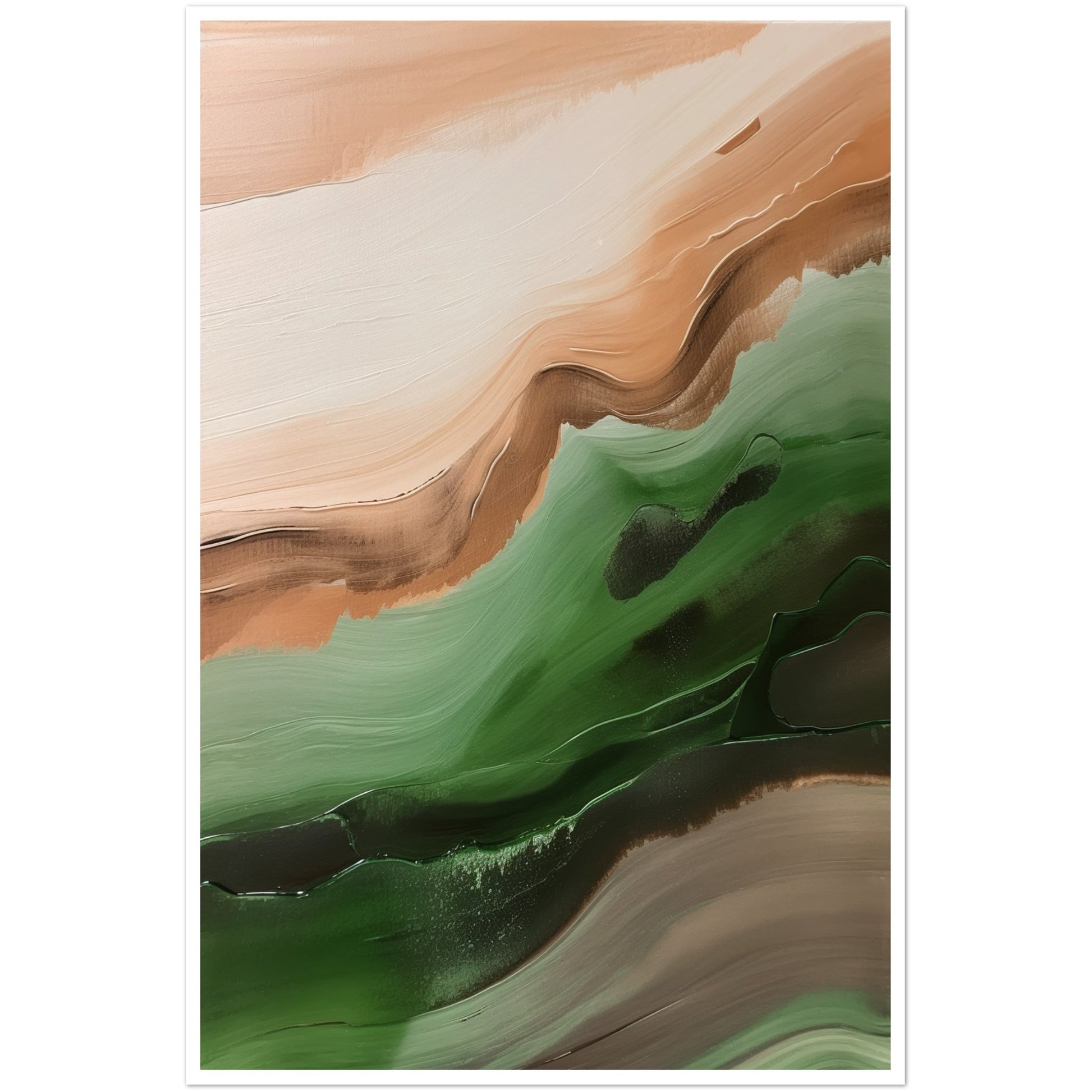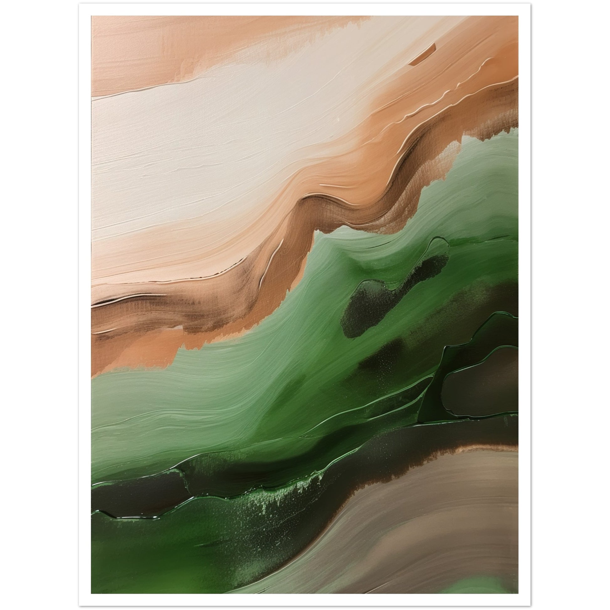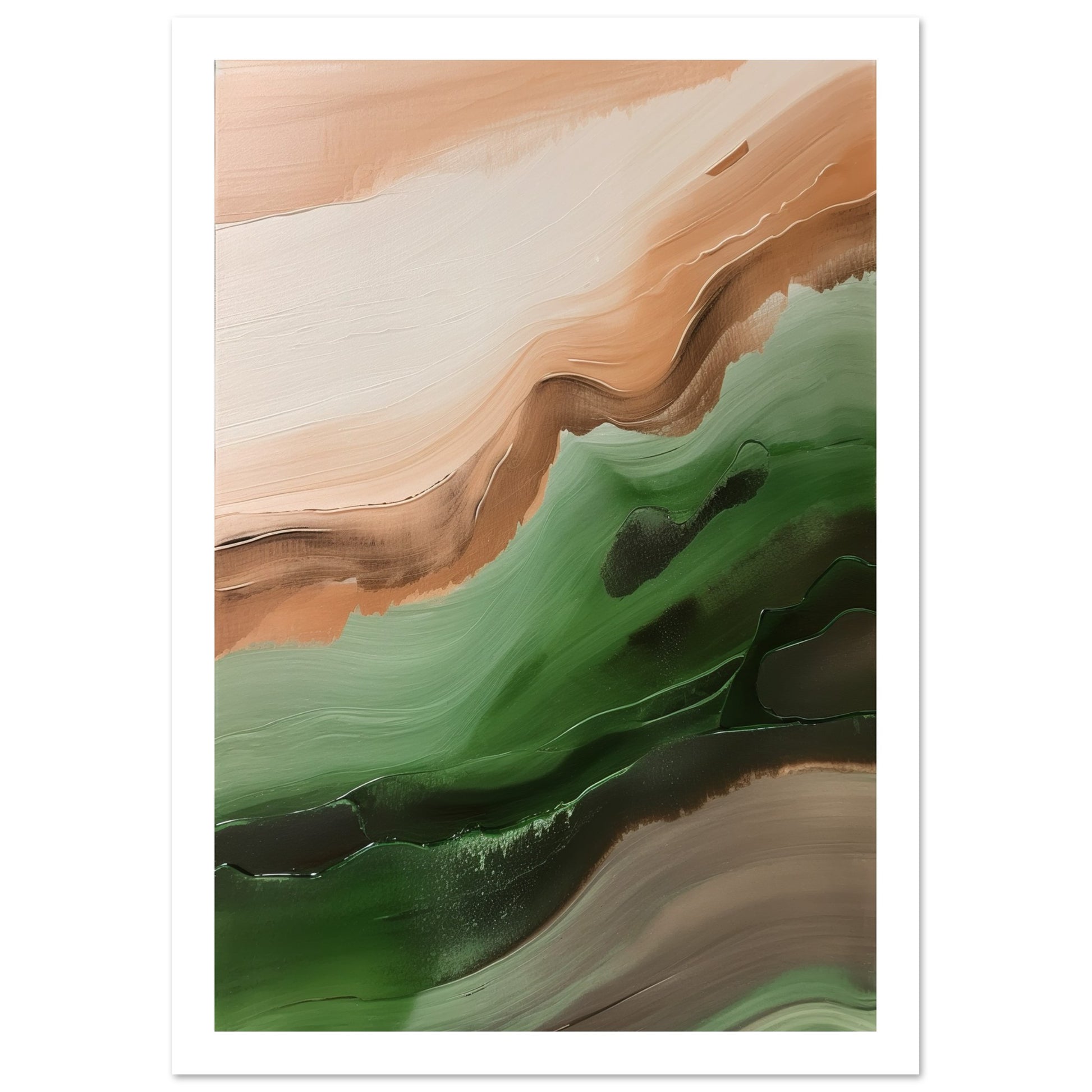 This abstract artwork showcases wavy strokes of green and brown, evoking a sense of movement and rhythm, skilfully captures the essence of nature with flowing and dynamic brushwork.