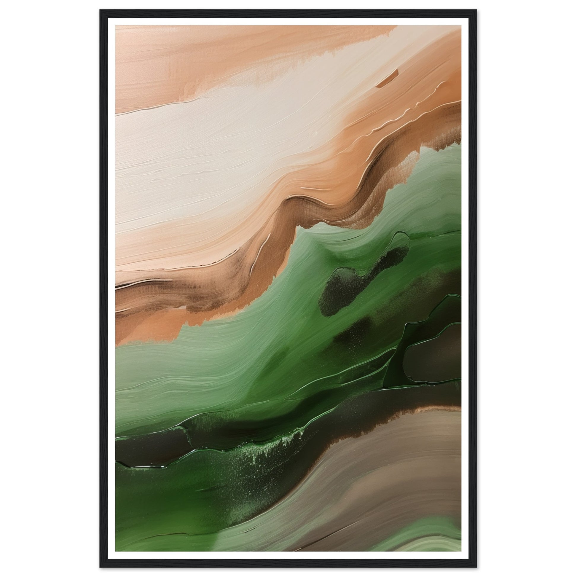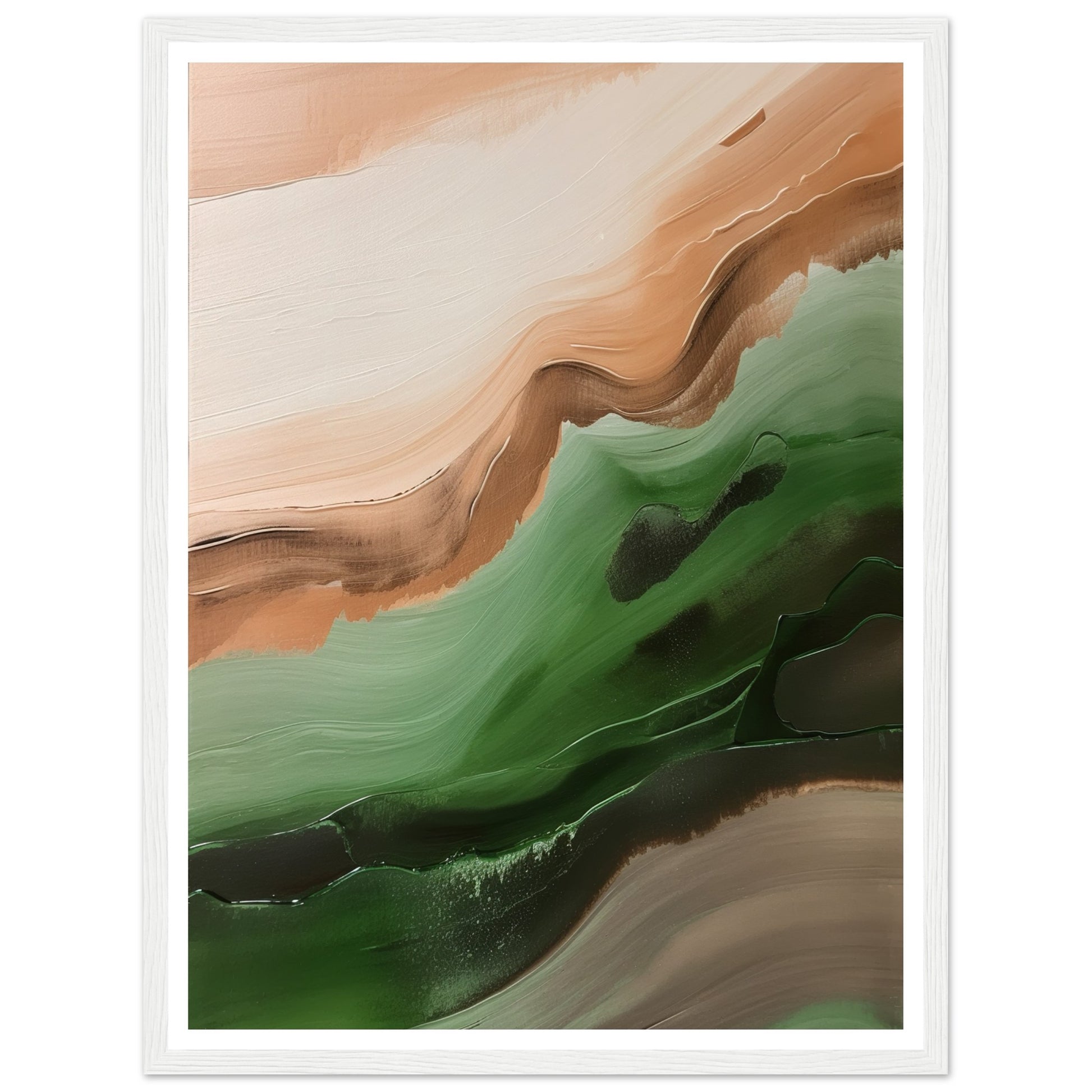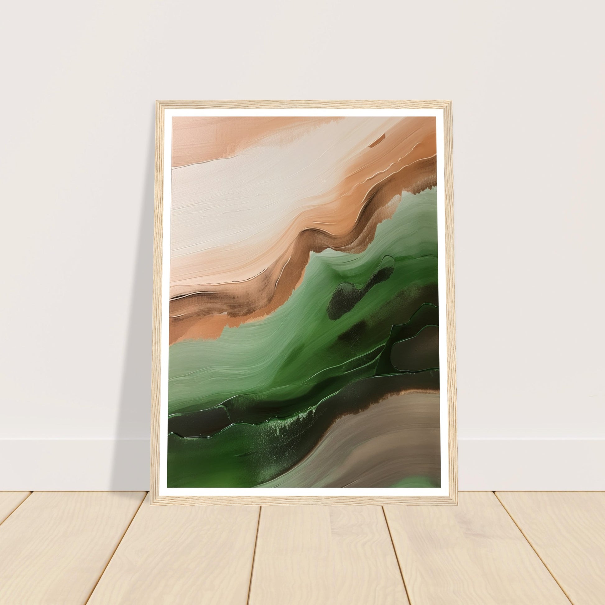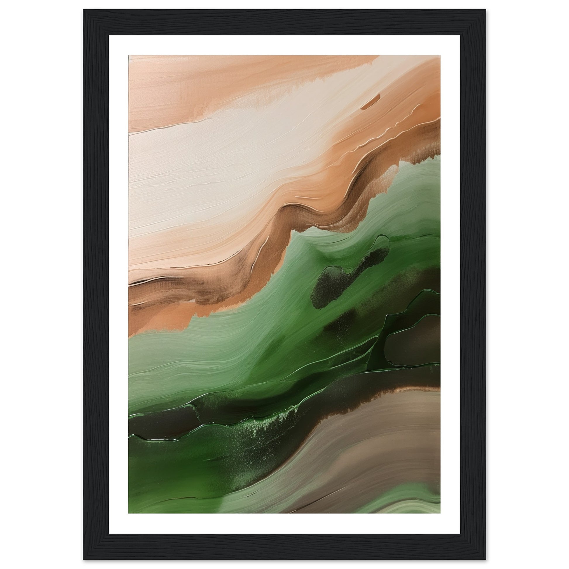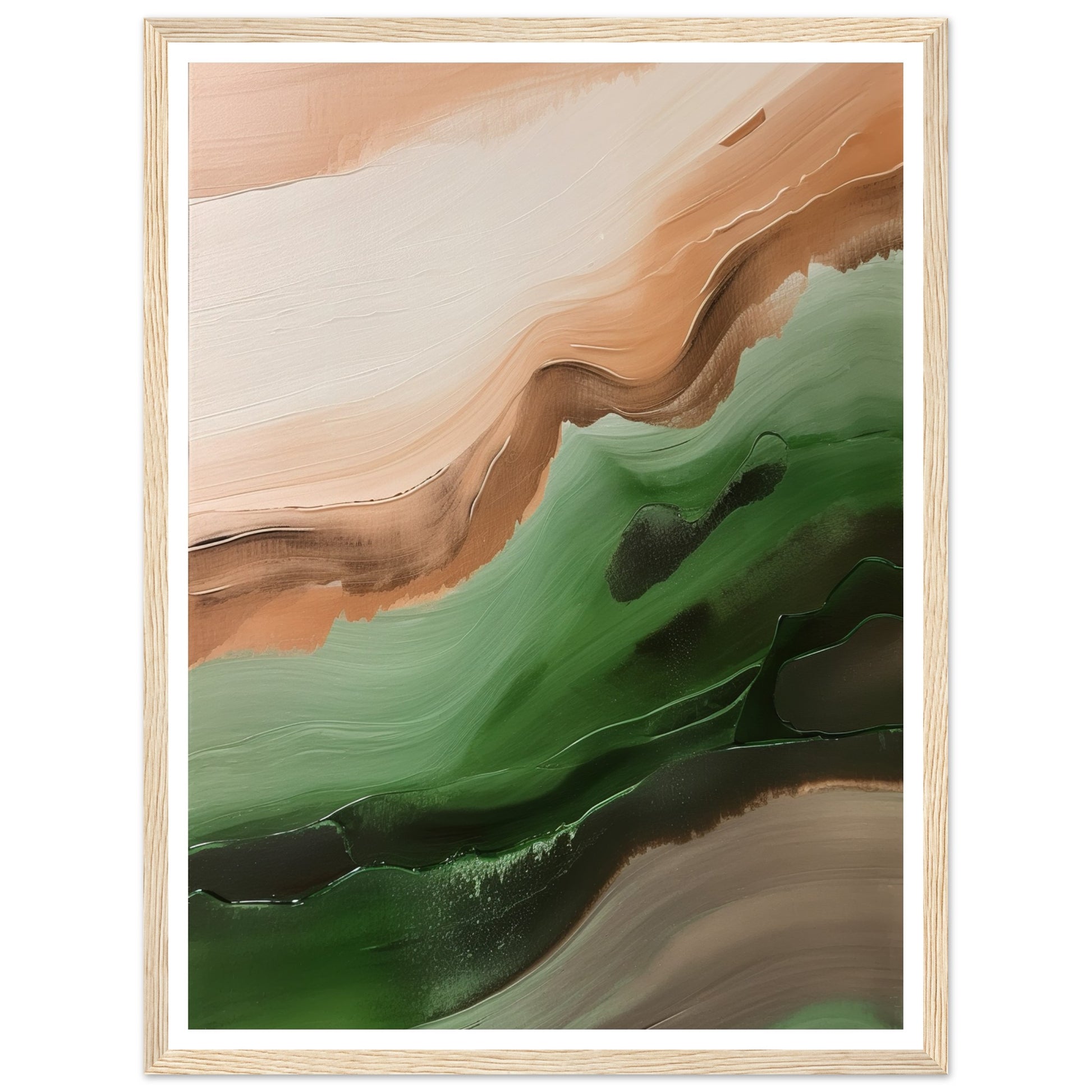 This abstract artwork showcases wavy strokes of green and brown, evoking a sense of movement and rhythm, skilfully captures the essence of nature with flowing and dynamic brushwork.