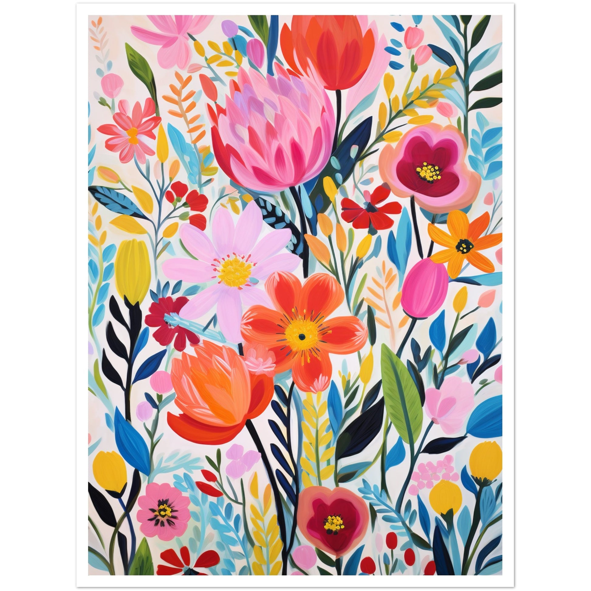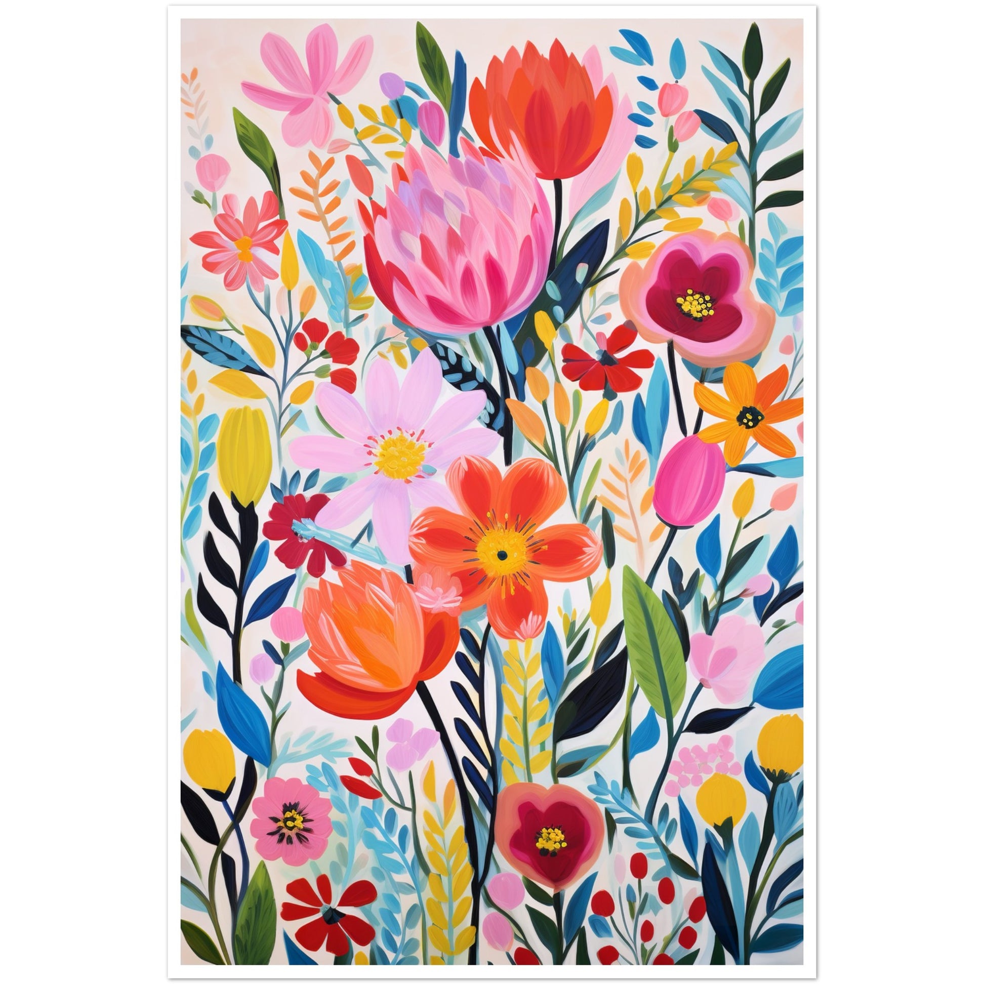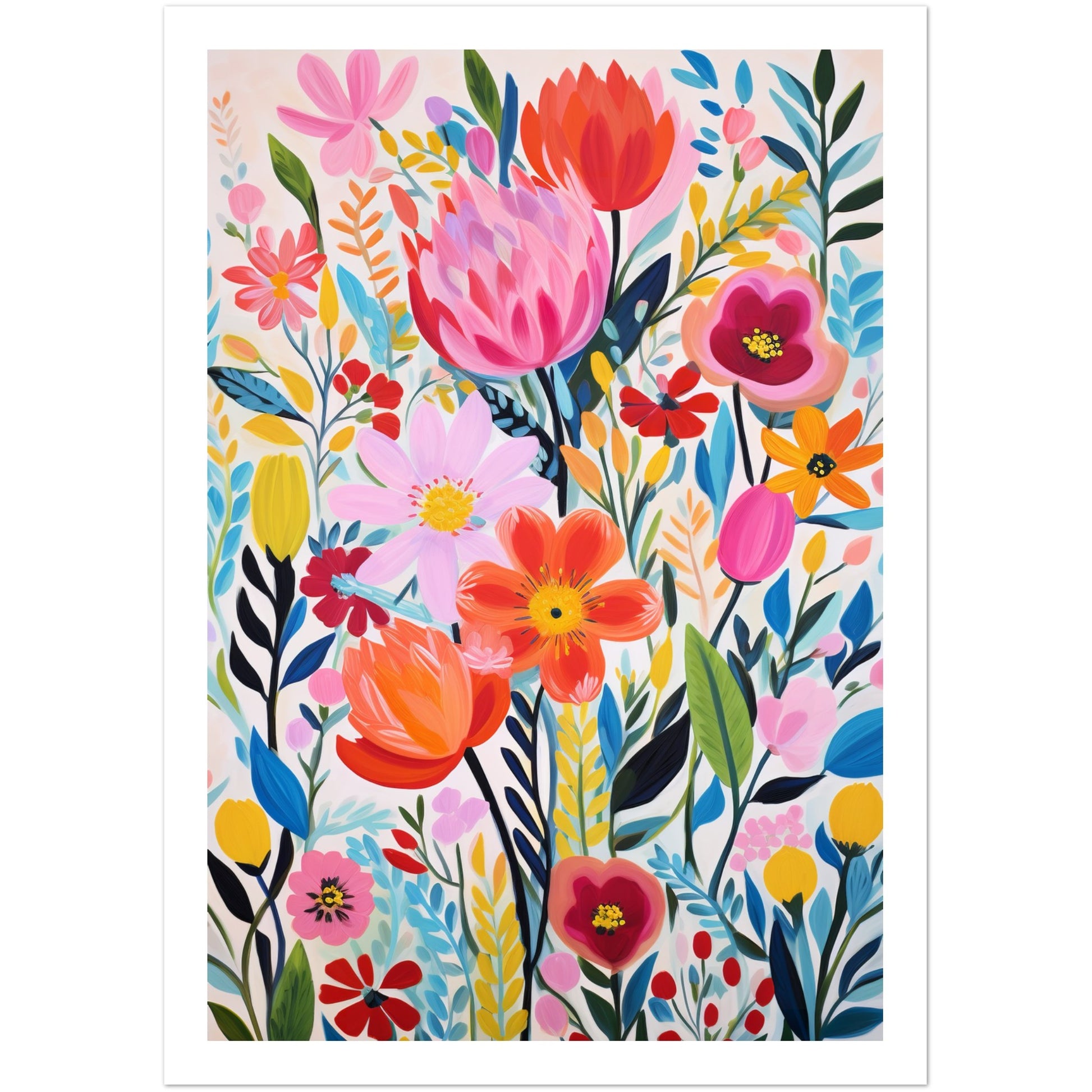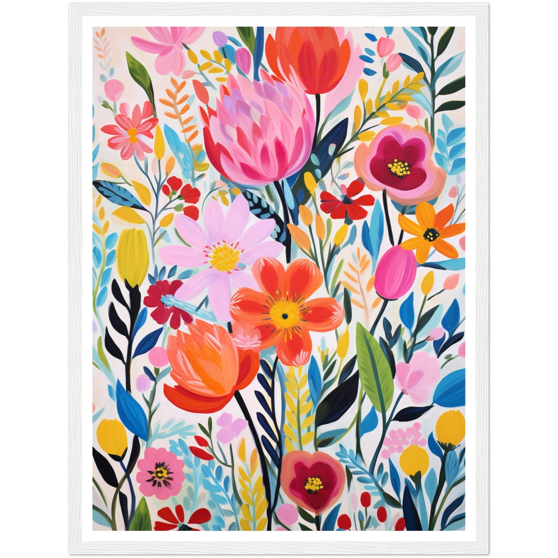 A vibrant painting created with playful brushstrokes, this artwork print features a burst of nature-inspired shapes in bold colours against a backdrop of light white and pink tones. The dynamic brushwork and bold, vibrant colours evoke a sense of joy and celebration, turning "Folklore Blooms" into a lively explosion of flowers.