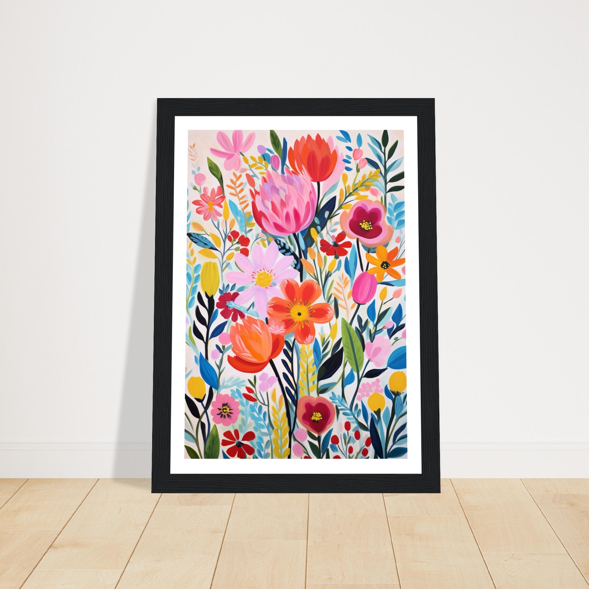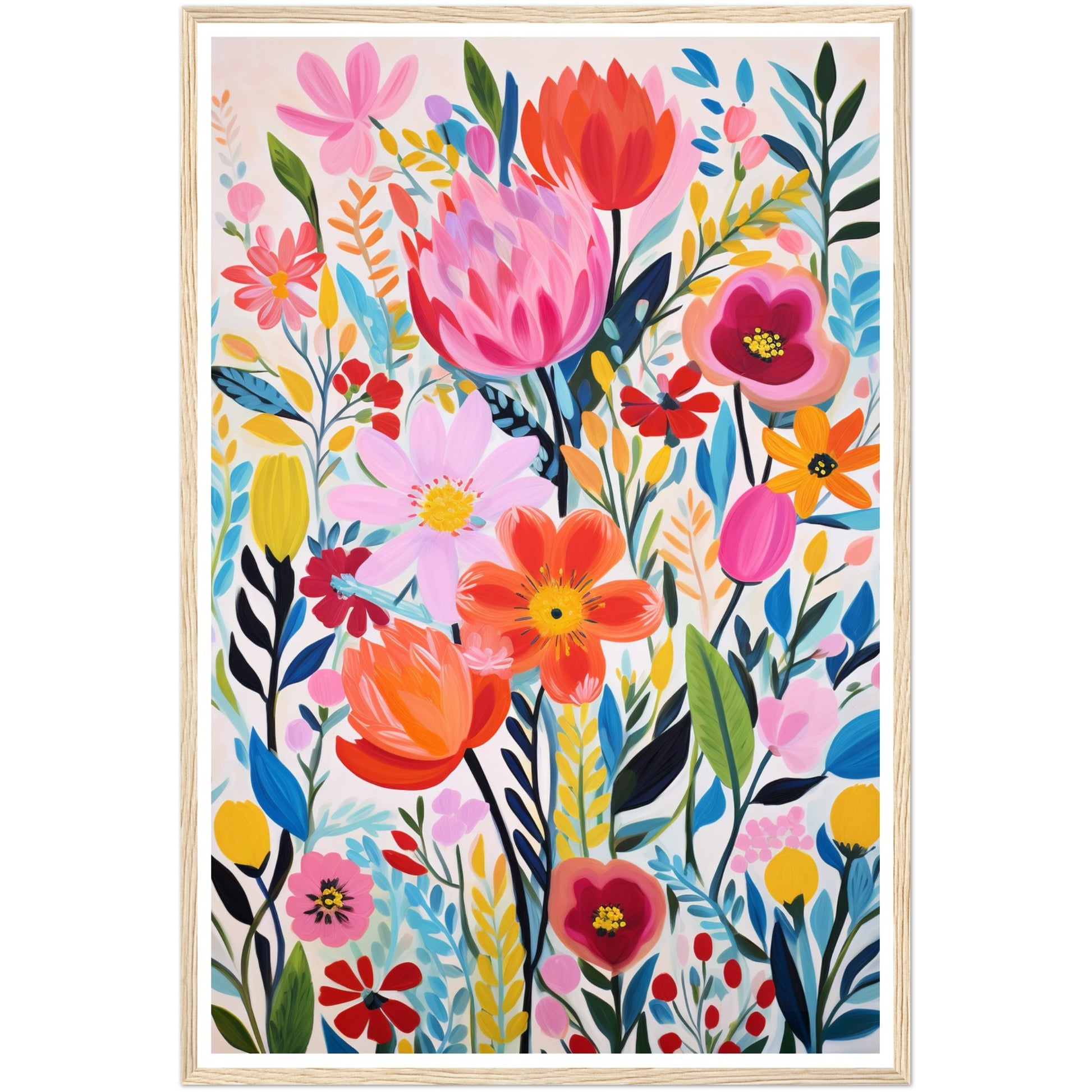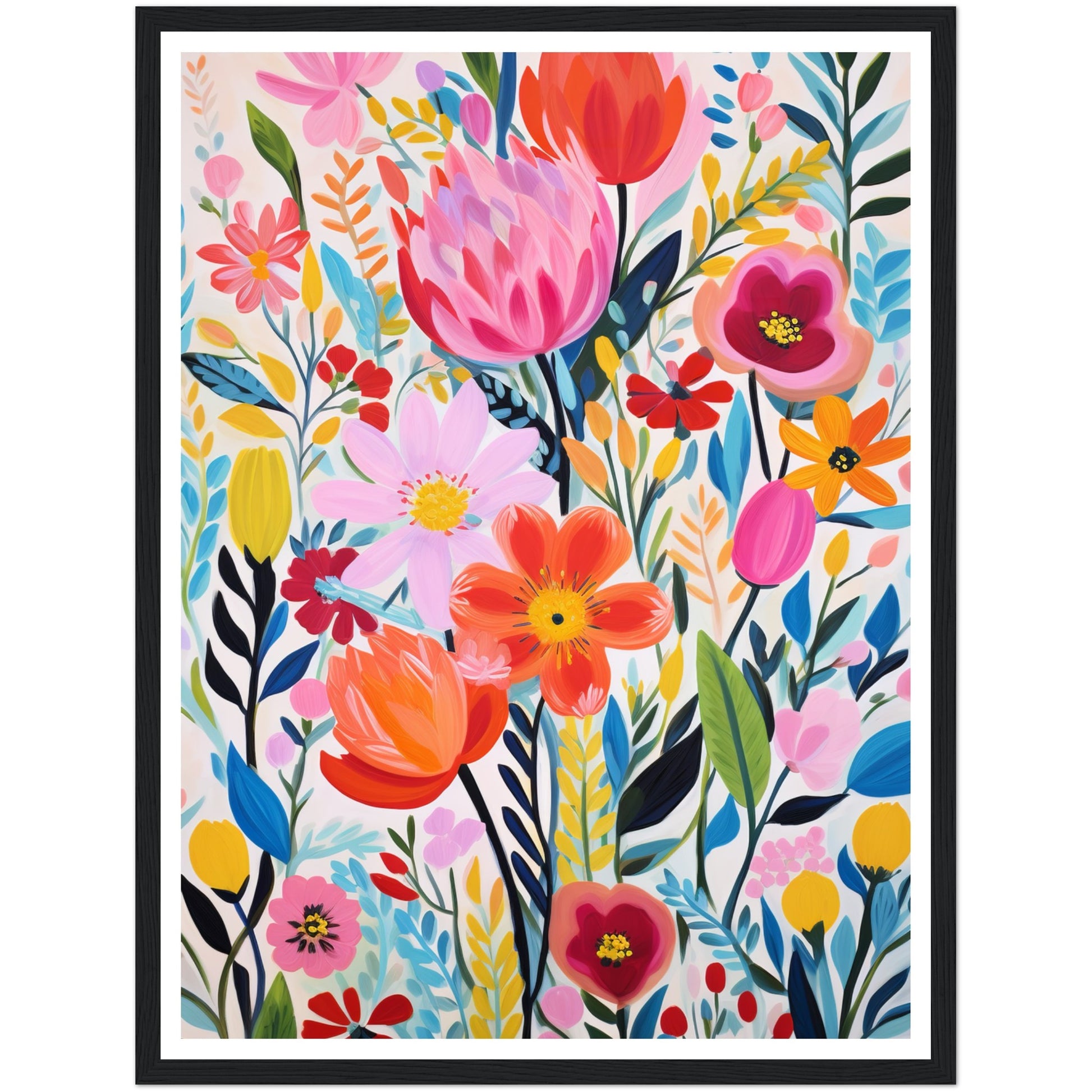 The nature-inspired shapes add an extra layer of whimsy, creating a harmonious and playful composition. Immerse yourself in the lively spirit of "Folklore Blooms," where each brushstroke contributes to the vibrant tapestry of a flower-filled celebration. This artwork is a visual feast, bringing the essence of a colourful explosion of flowers to any space with a touch of folkloric charm.
