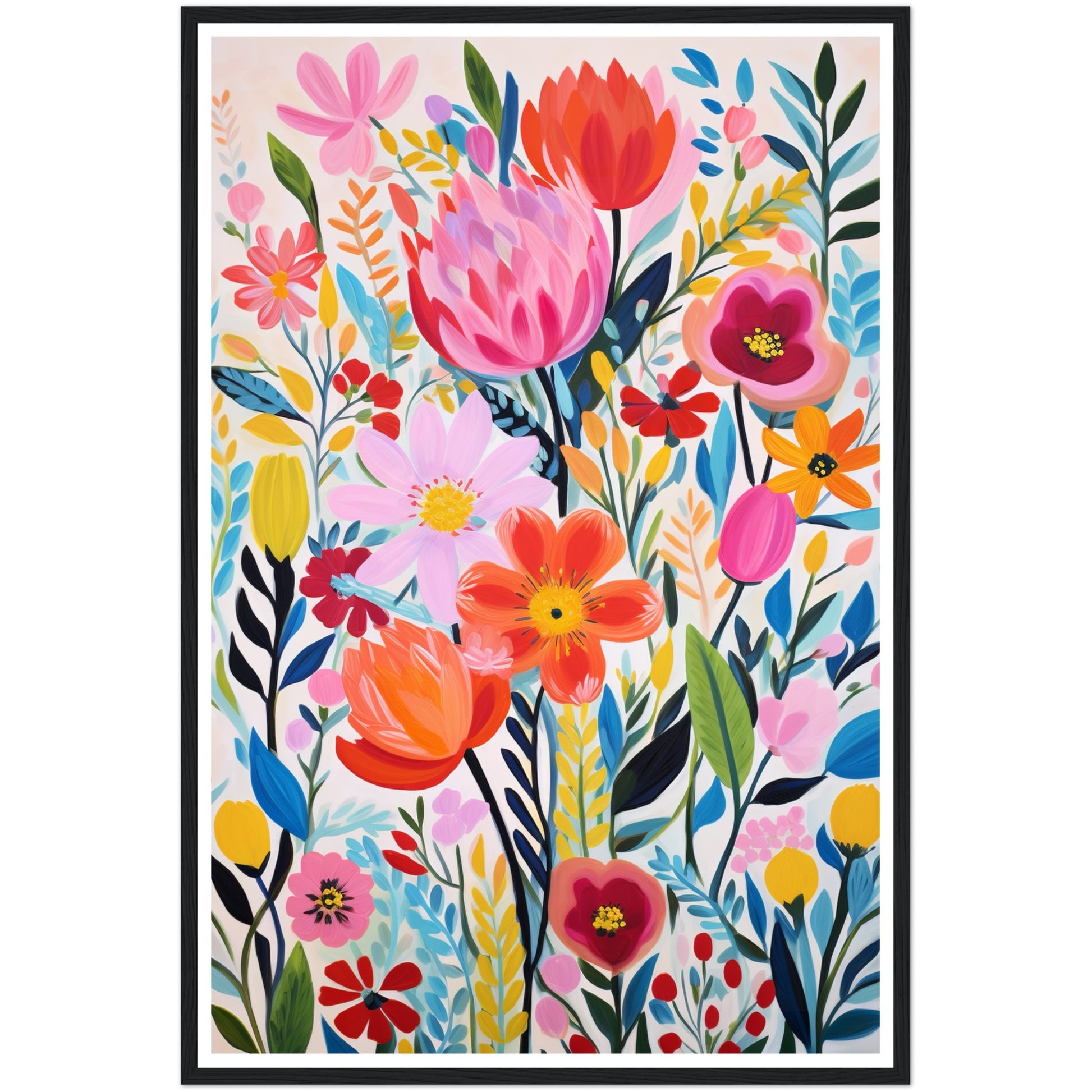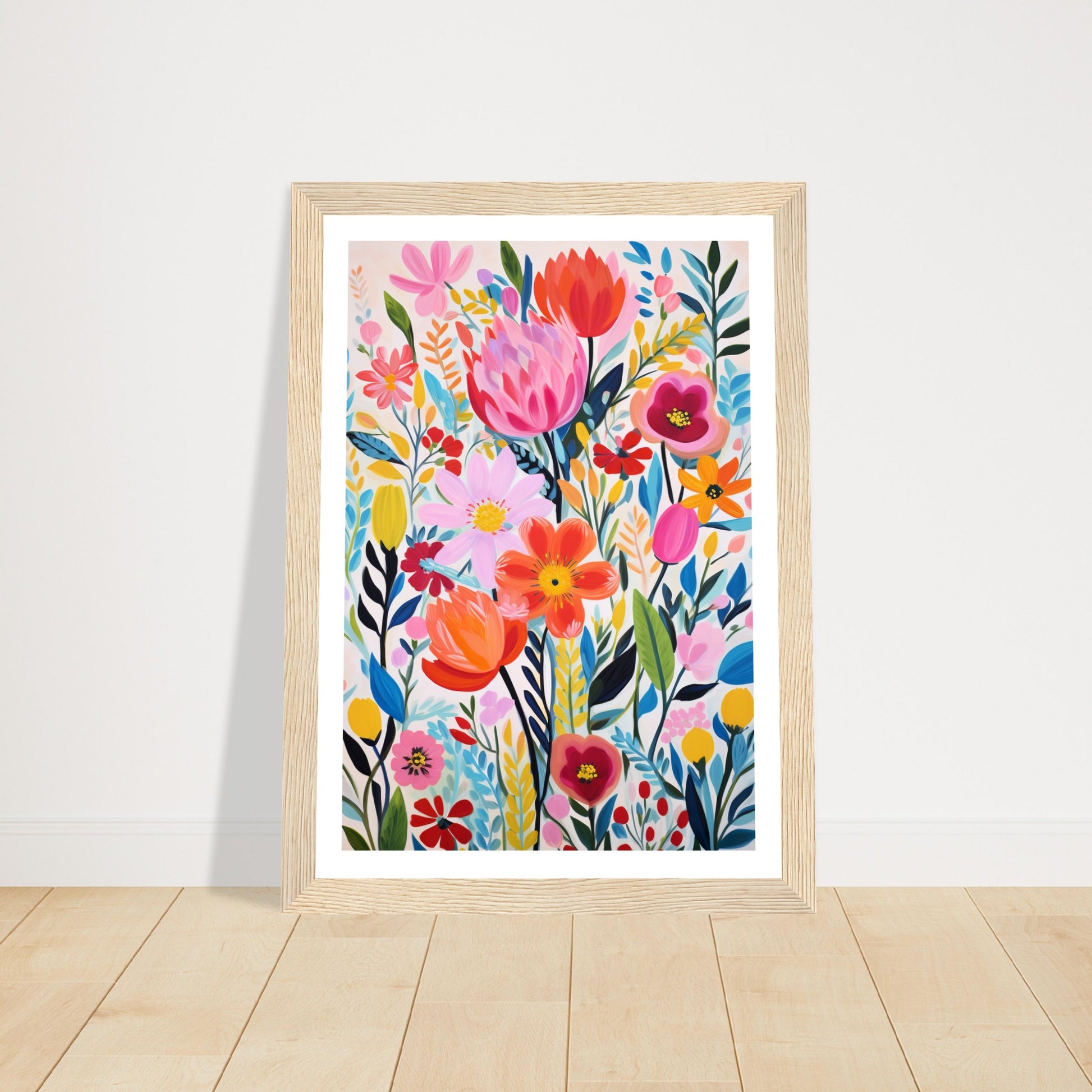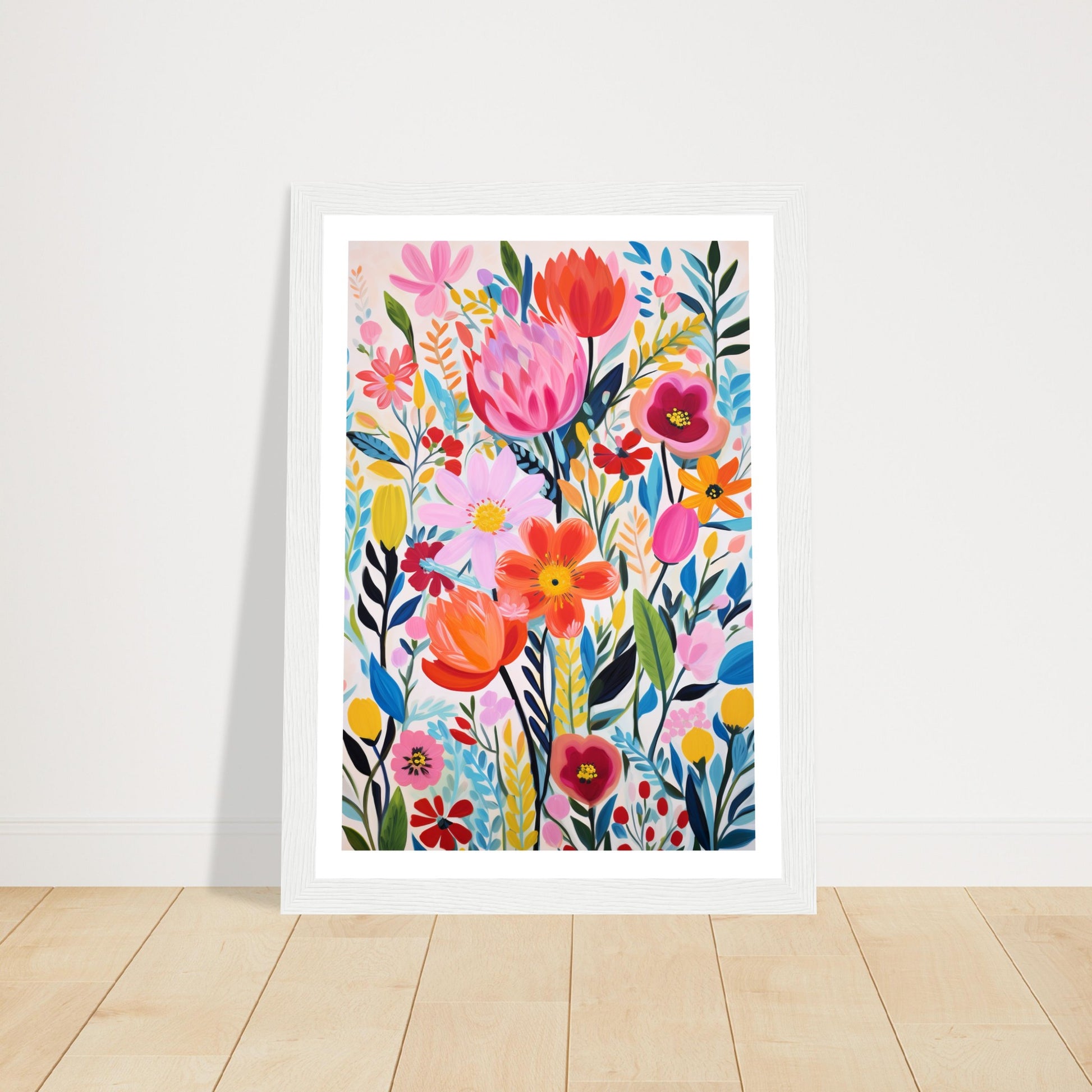 The nature-inspired shapes add an extra layer of whimsy, creating a harmonious and playful composition. Immerse yourself in the lively spirit of "Folklore Blooms," where each brushstroke contributes to the vibrant tapestry of a flower-filled celebration. This artwork is a visual feast, bringing the essence of a colourful explosion of flowers to any space with a touch of folkloric charm.
