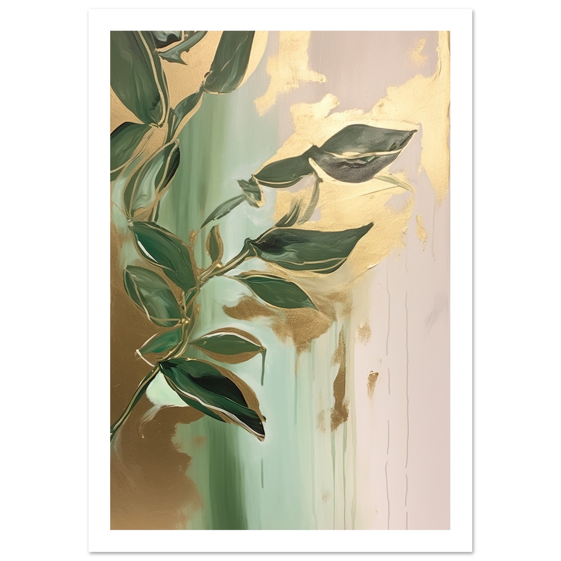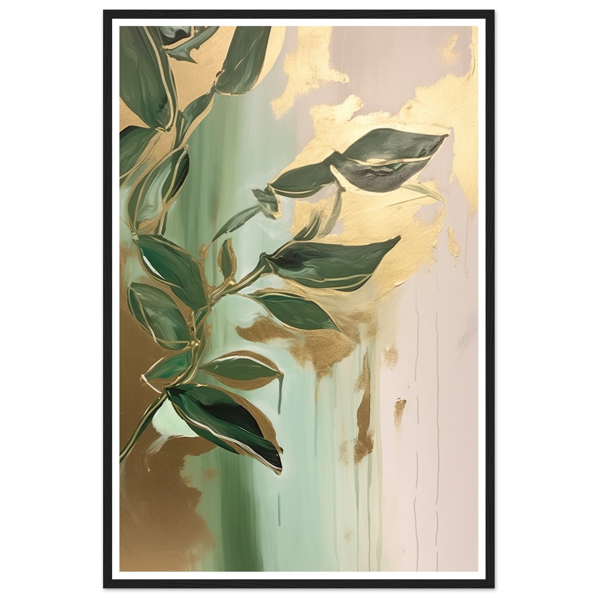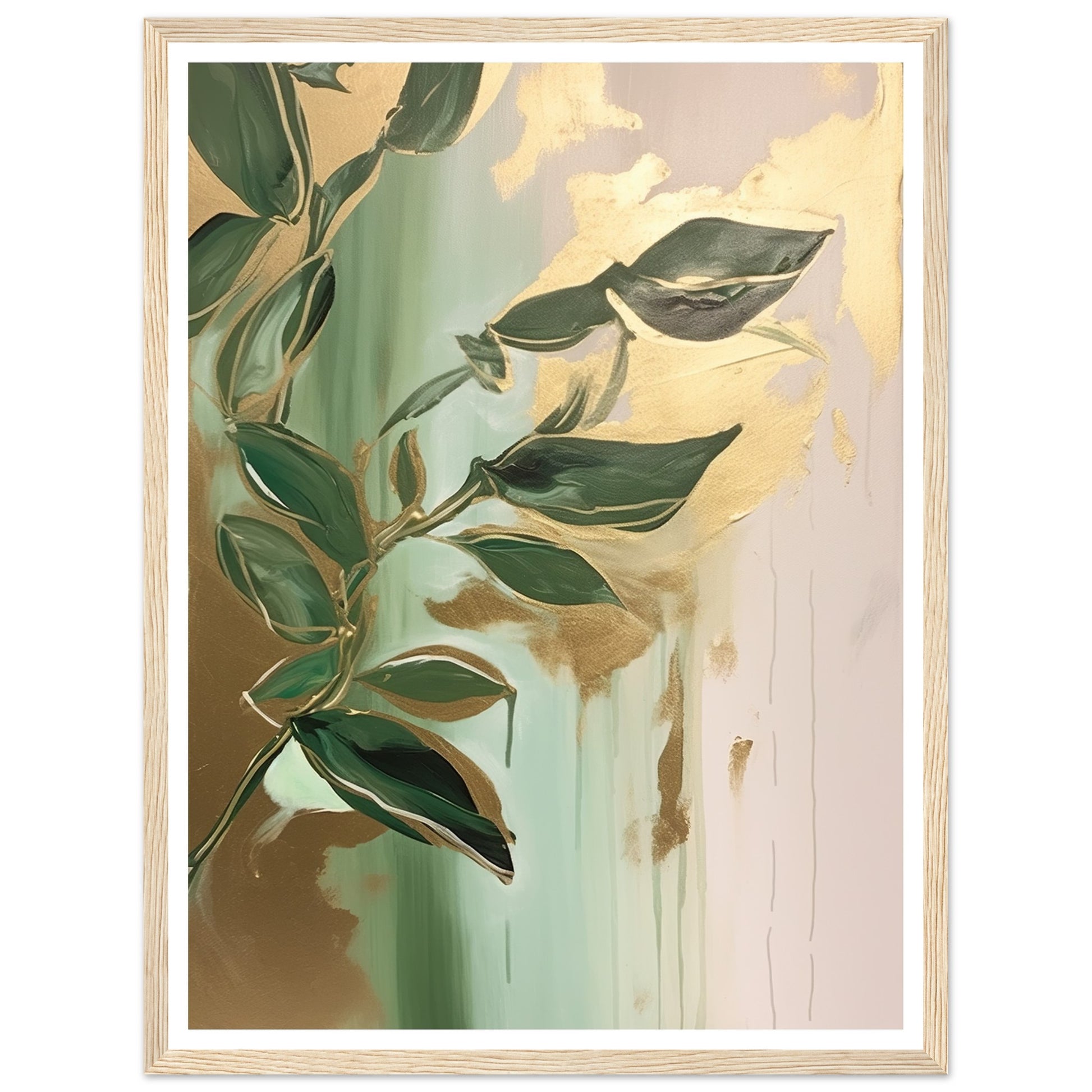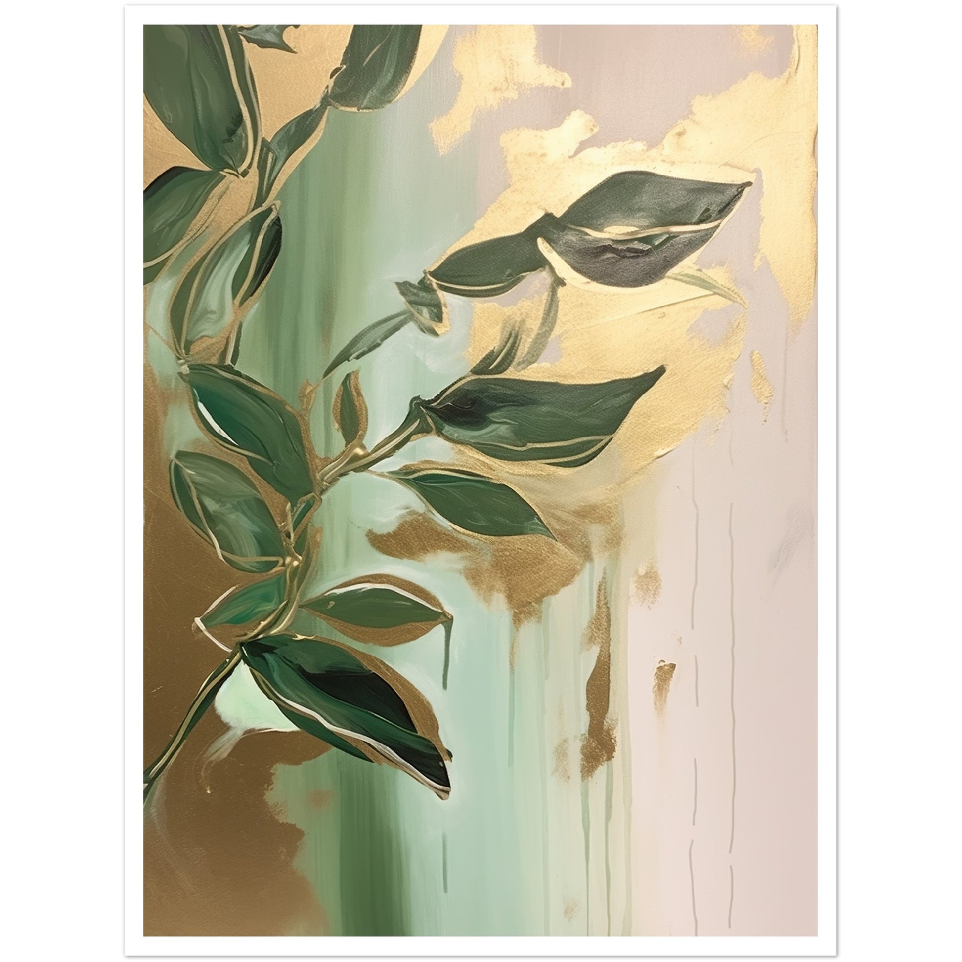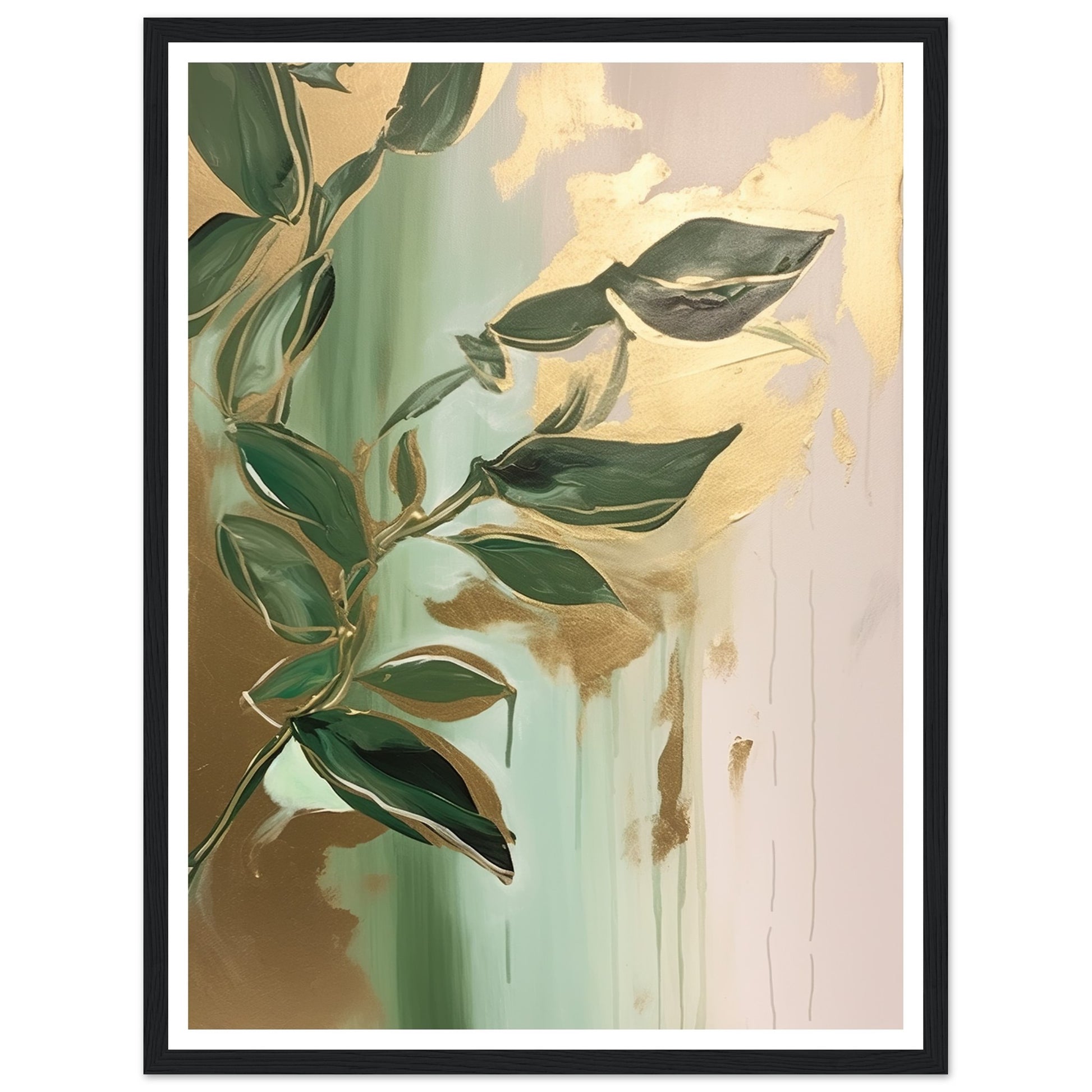 This artwork showcases mesmerizing shades of green and gold, as the fluid forms delicately melt into the shape of plant leaves. Immerse yourself in the harmonious fusion of fluidity and botanical elegance, bringing a touch of organic serenity and artistic allure to your space.