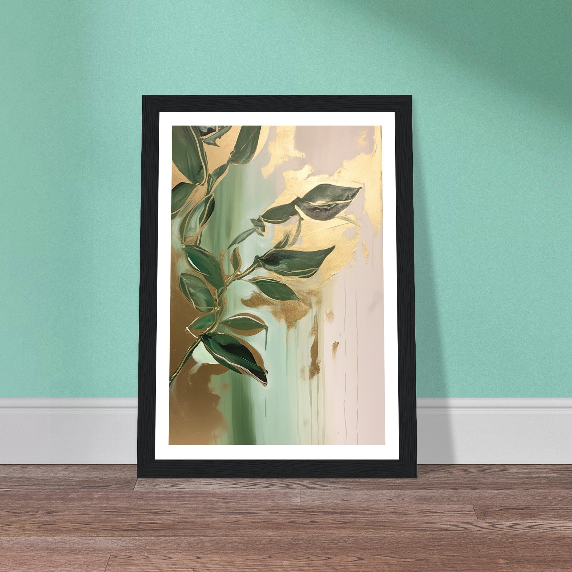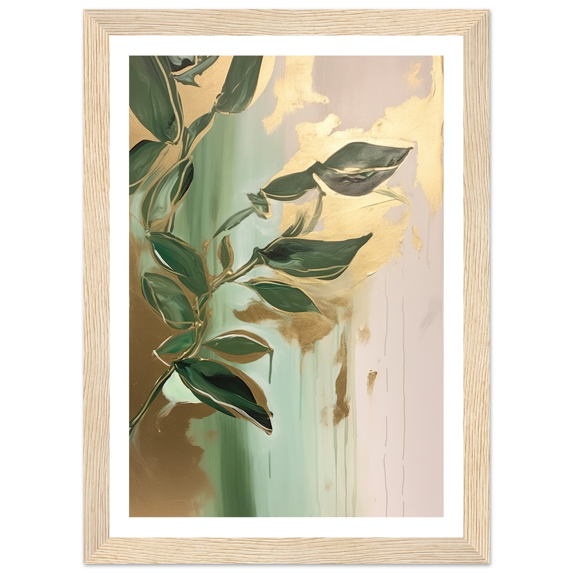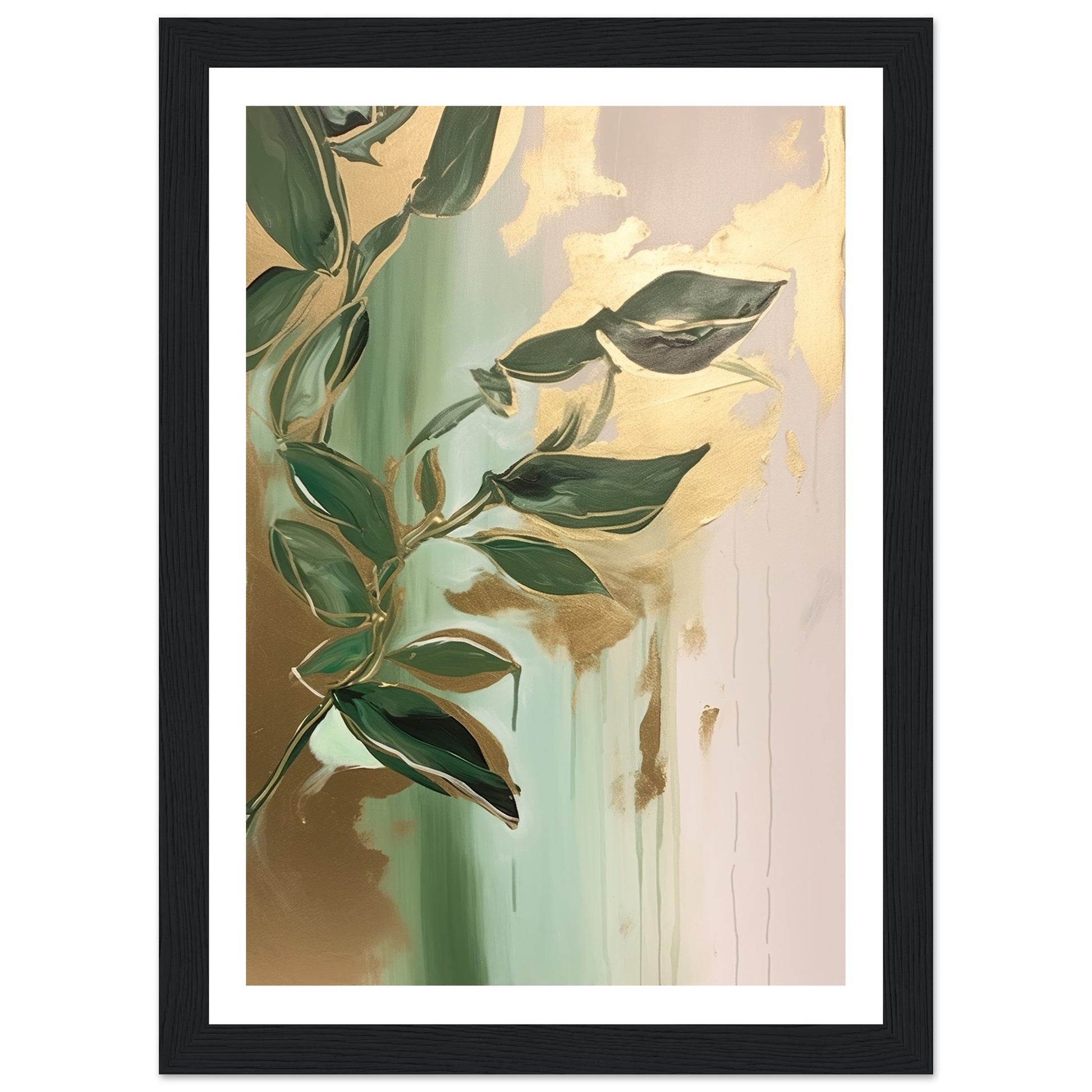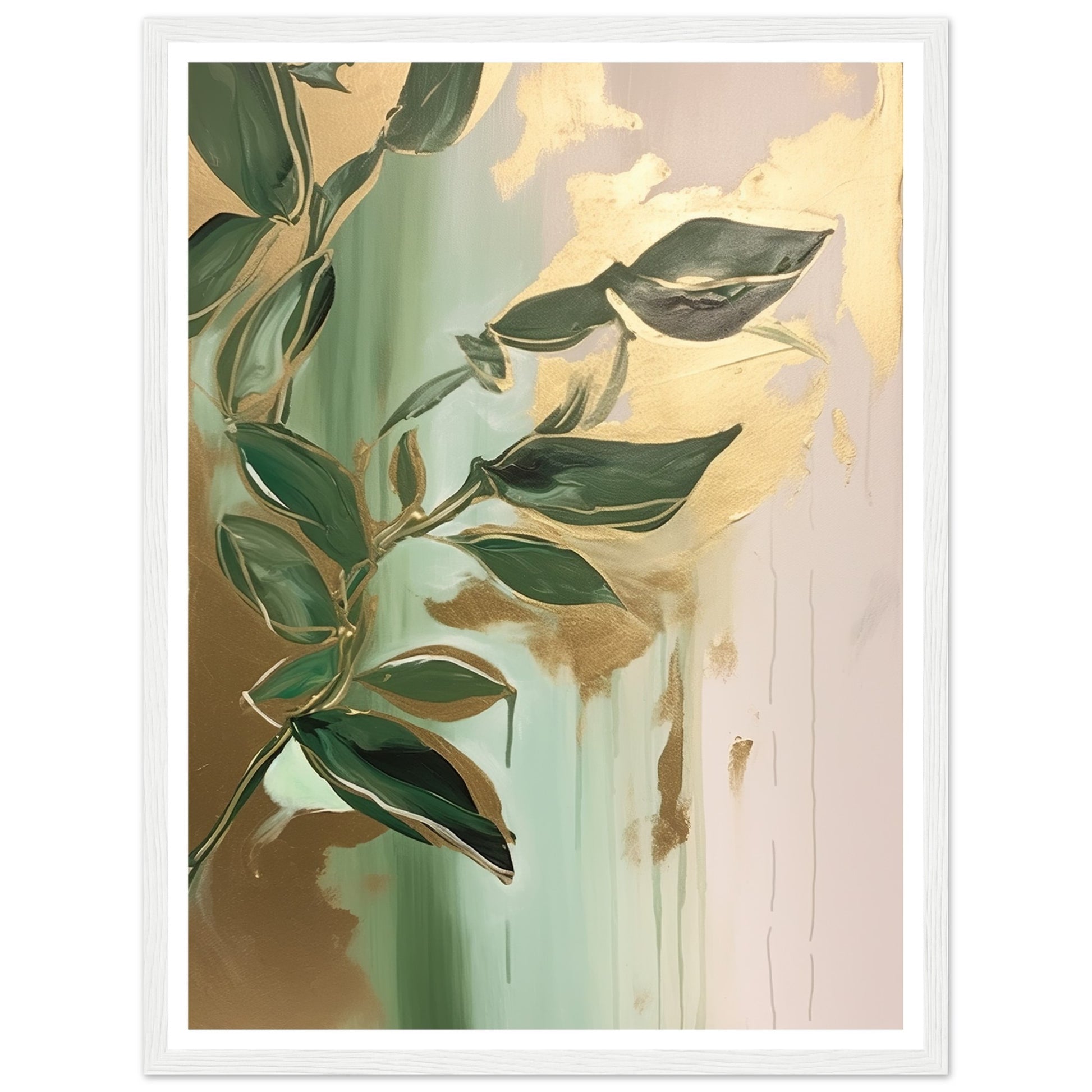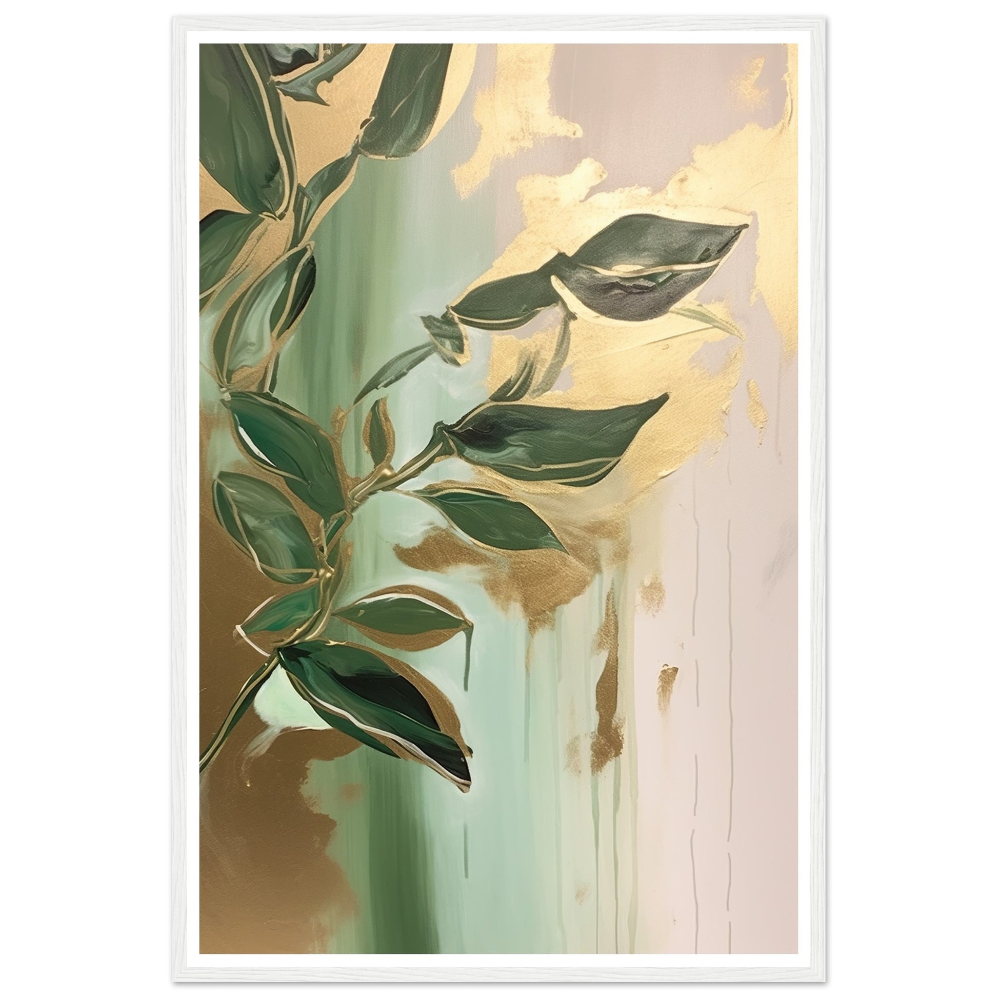 This artwork showcases mesmerizing shades of green and gold, as the fluid forms delicately melt into the shape of plant leaves. Immerse yourself in the harmonious fusion of fluidity and botanical elegance, bringing a touch of organic serenity and artistic allure to your space.