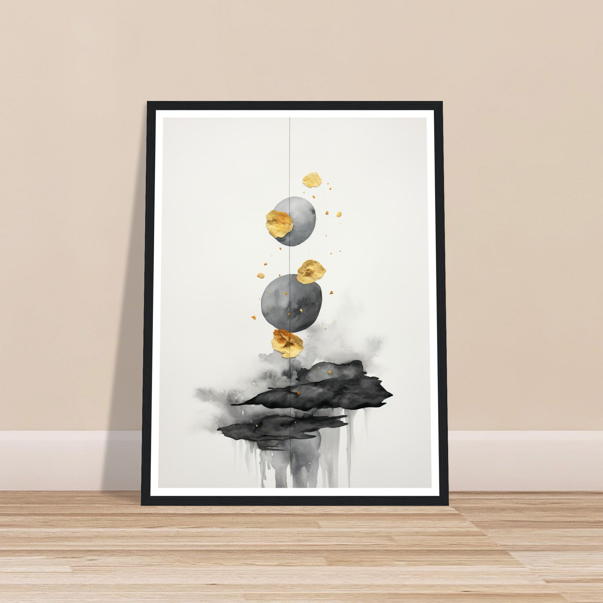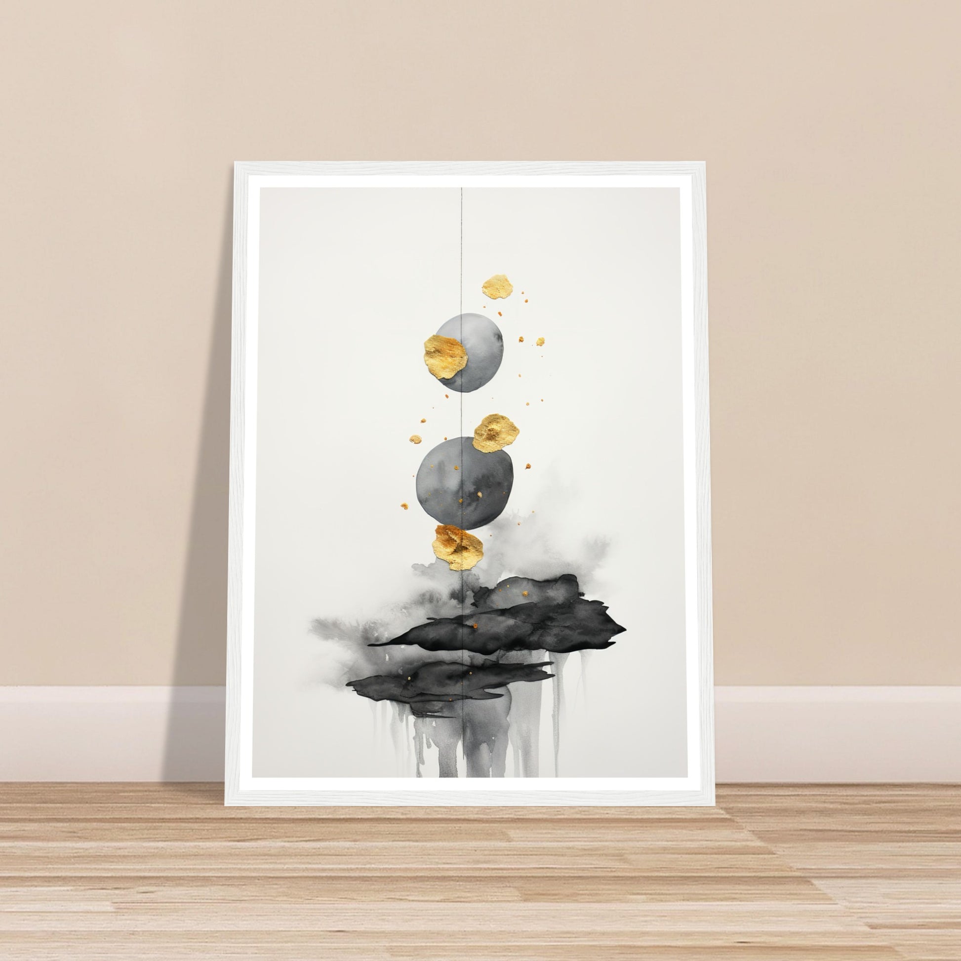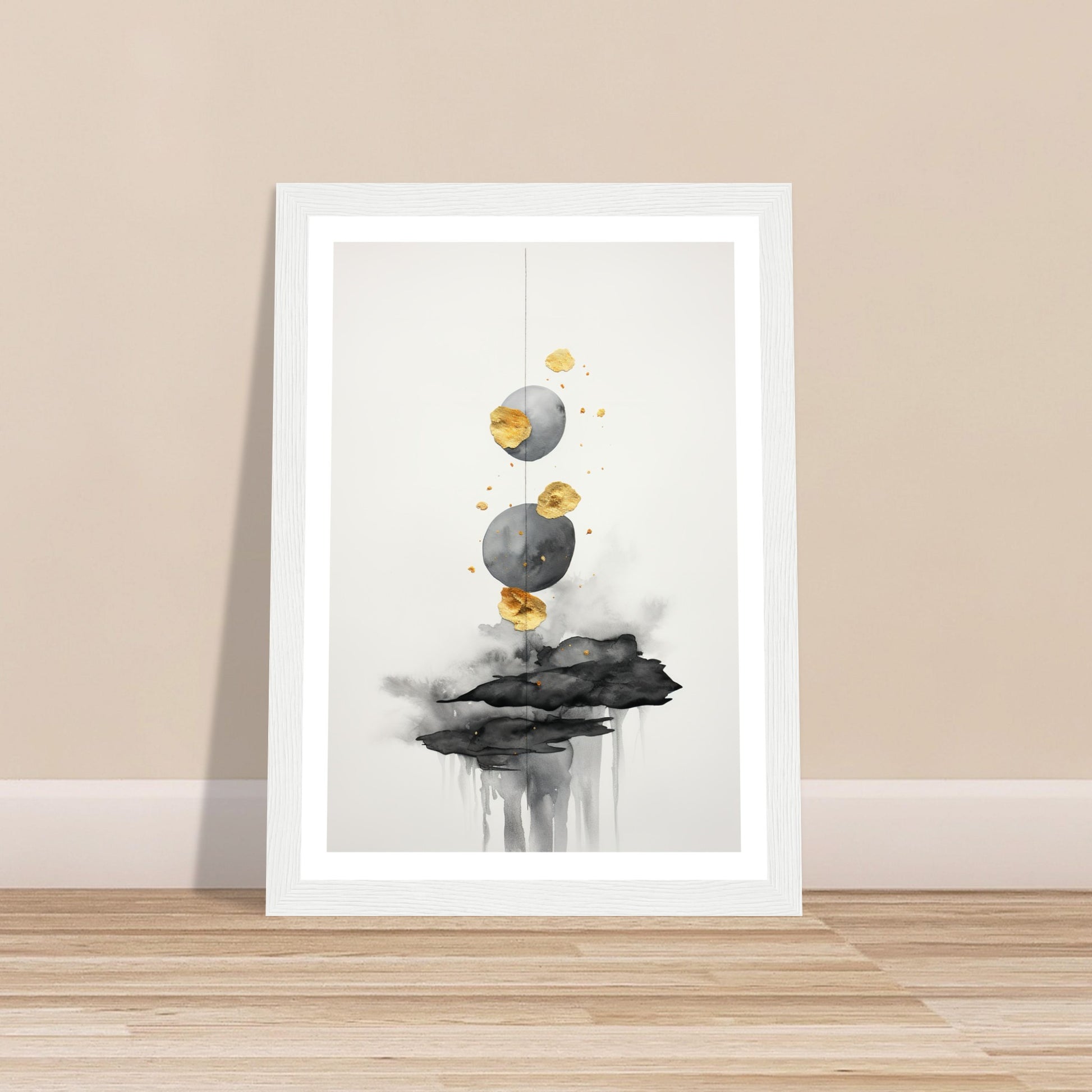 An enchanting abstract painting that weaves intricate patterns on a serene blank white canvas. This artwork features black watercolour clouds swirling gracefully amidst gold and dark metallic circles.