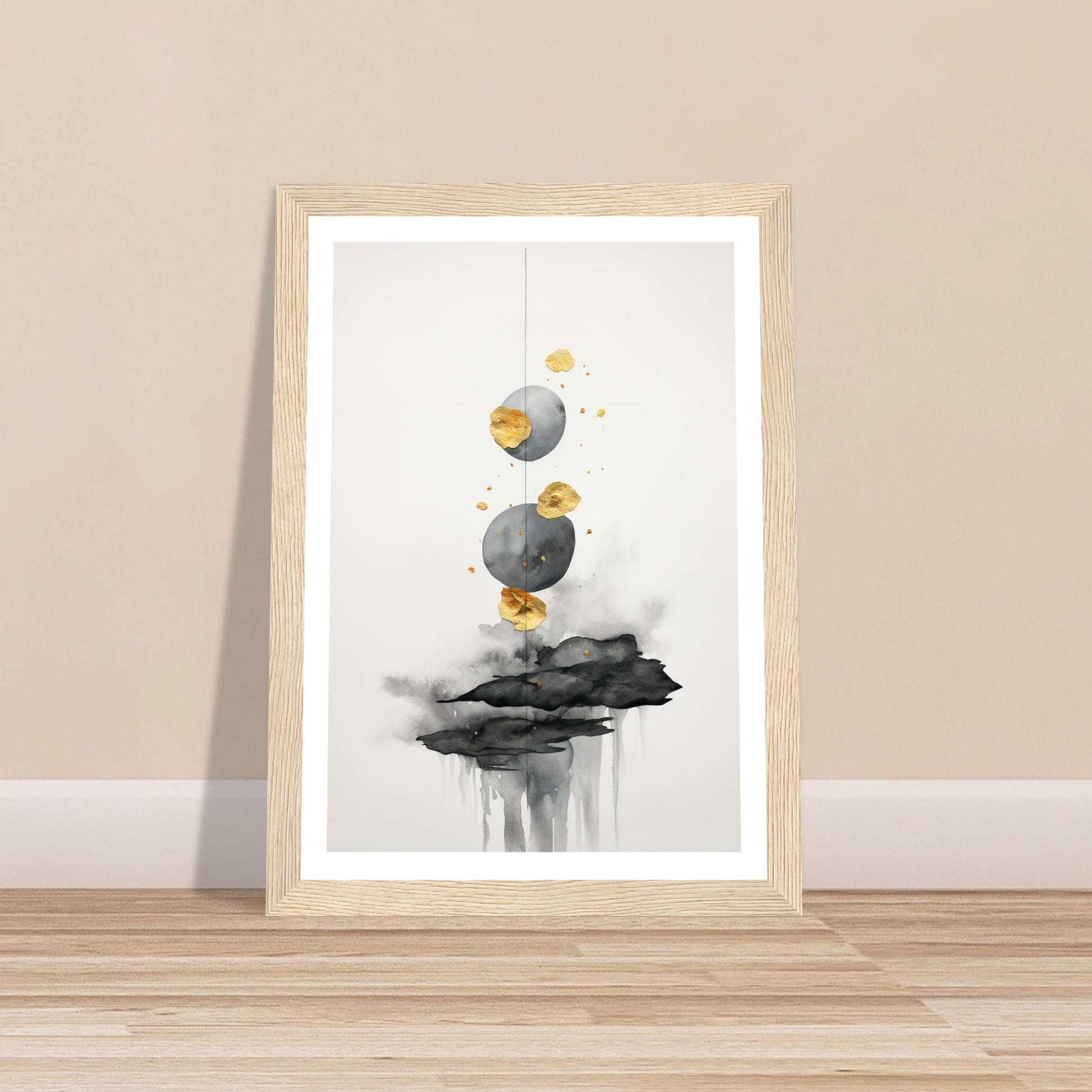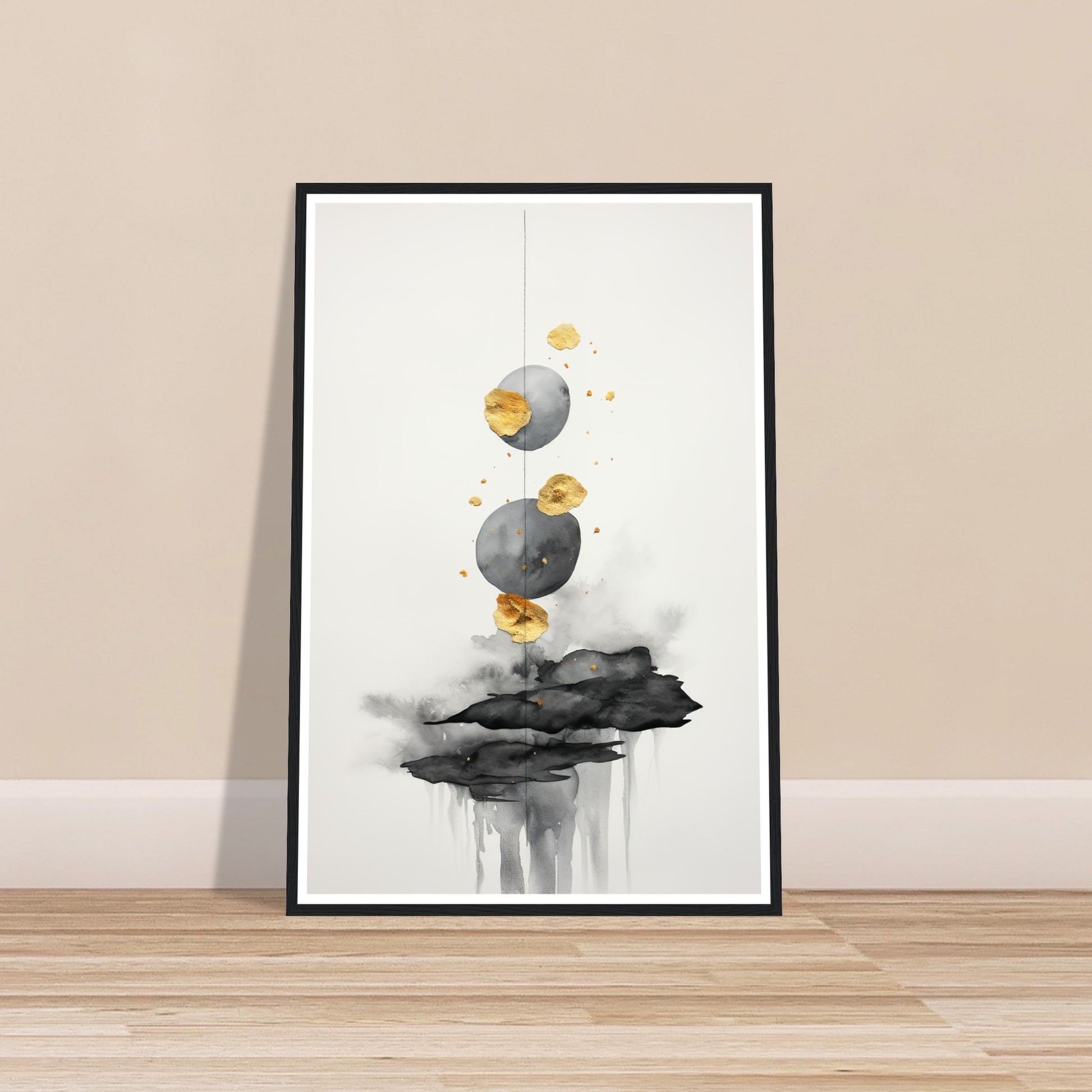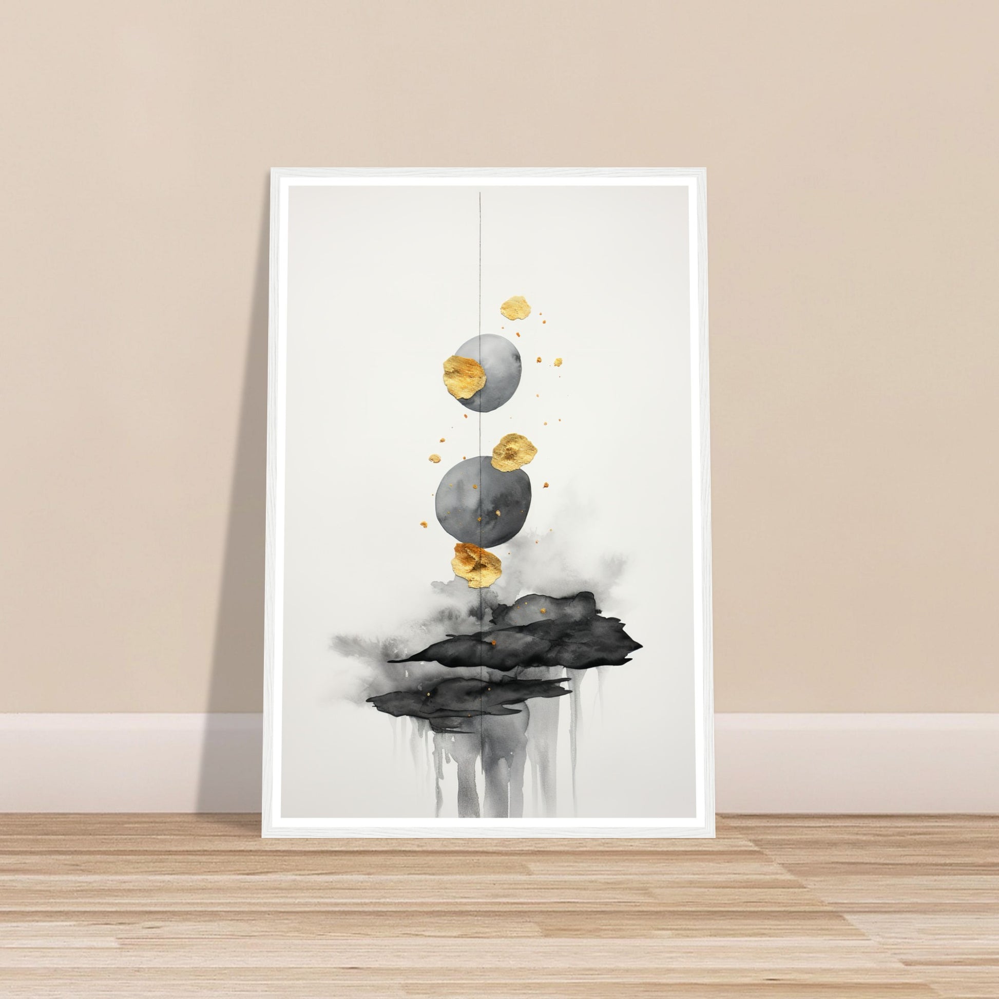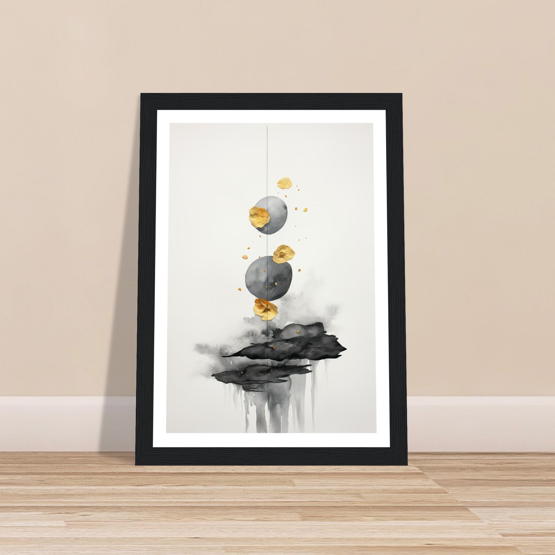 An enchanting abstract painting that weaves intricate patterns on a serene blank white canvas. This artwork features black watercolour clouds swirling gracefully amidst gold and dark metallic circles.