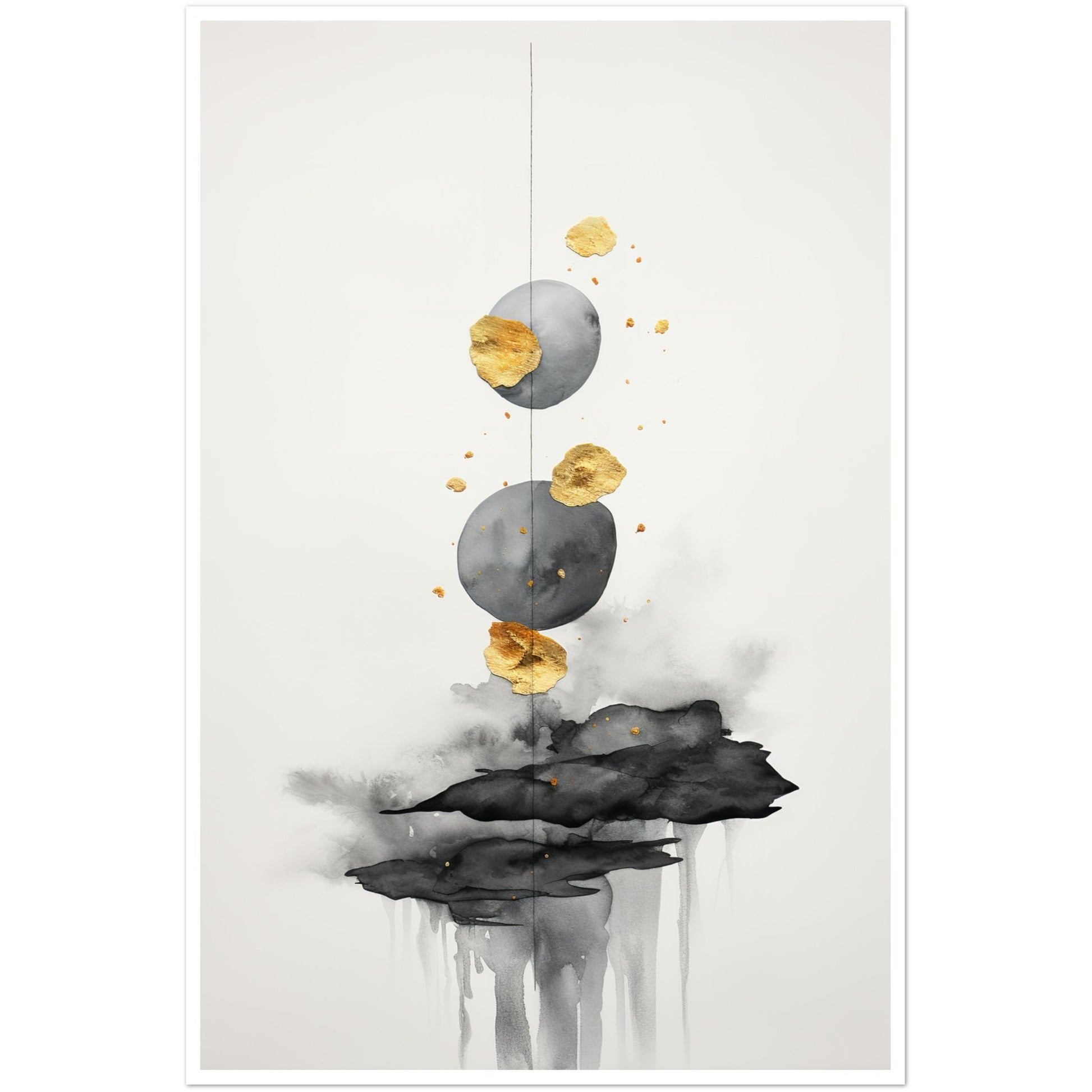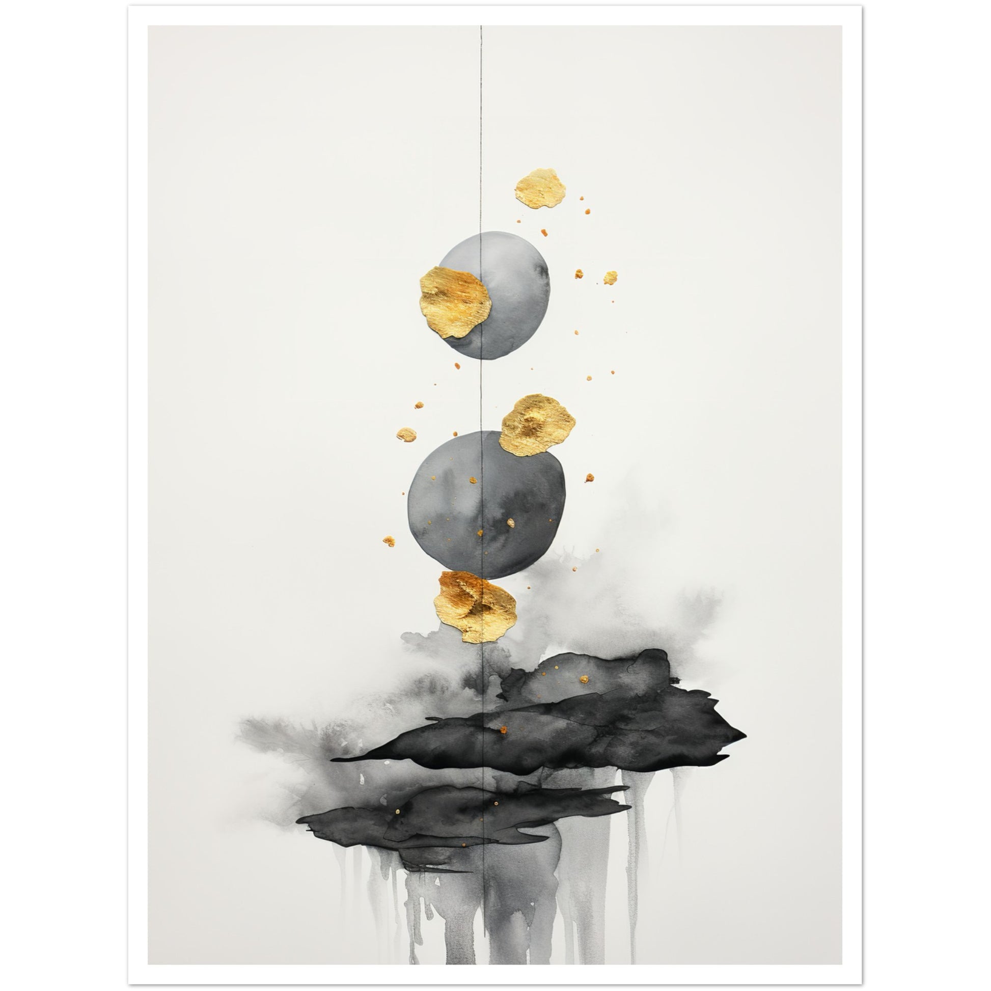 The dreamlike atmospheres created by the black watercolour clouds draw you into a world of contemplation and wonder. The gold and dark metallic circles, placed thoughtfully against the white background, add a luxurious and captivating accent. The painting captures a delicate equilibrium between symmetry and a hint of unpredictability.