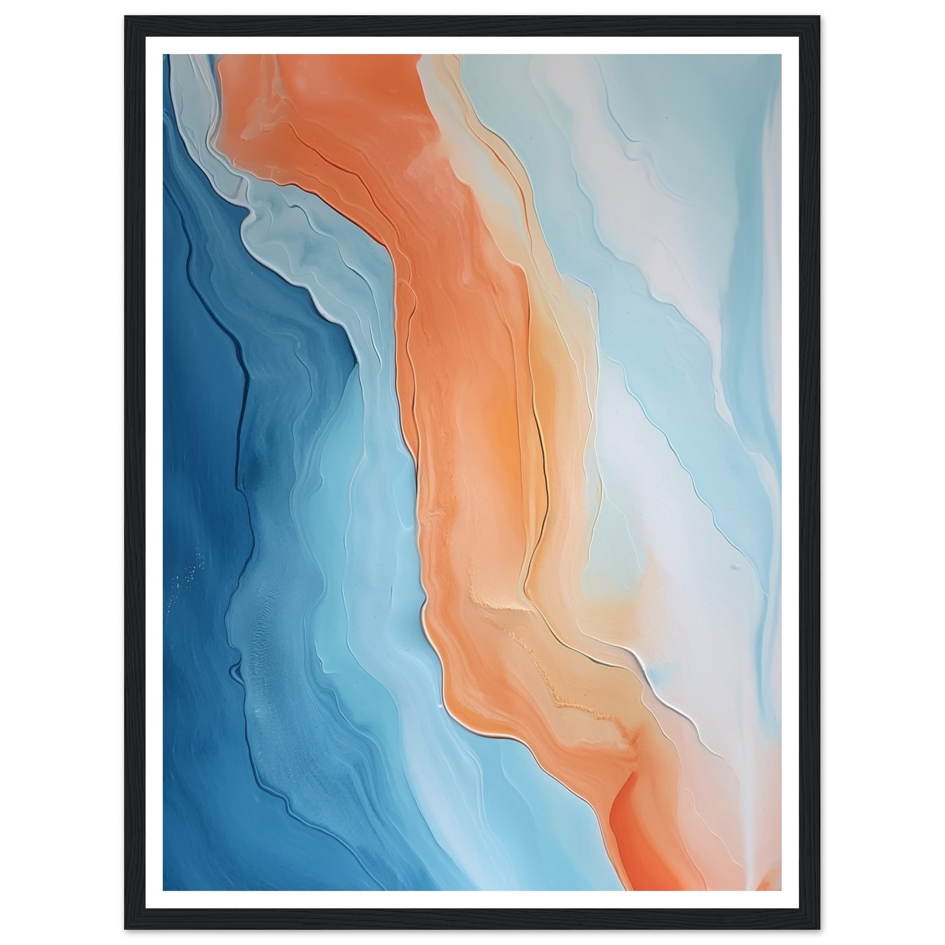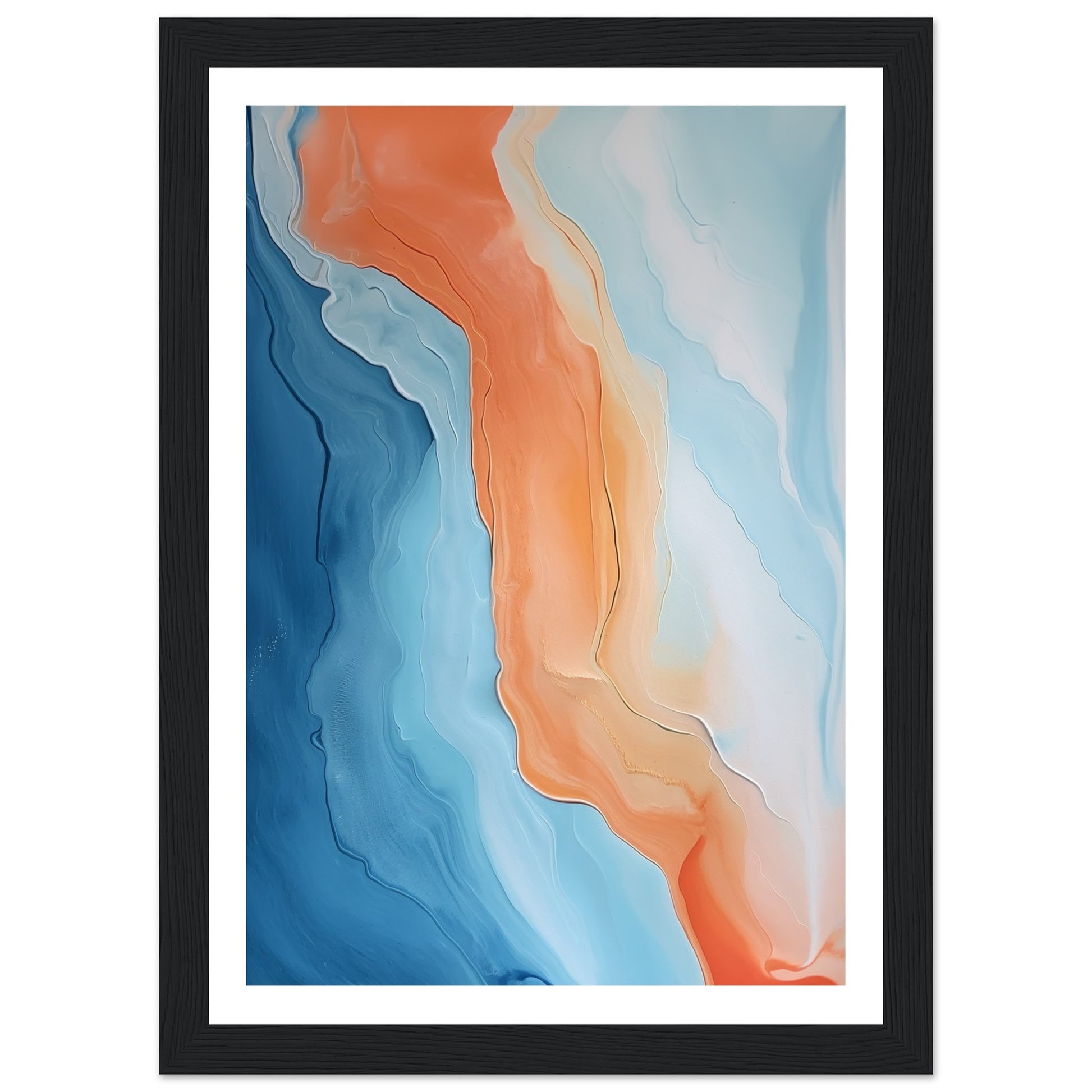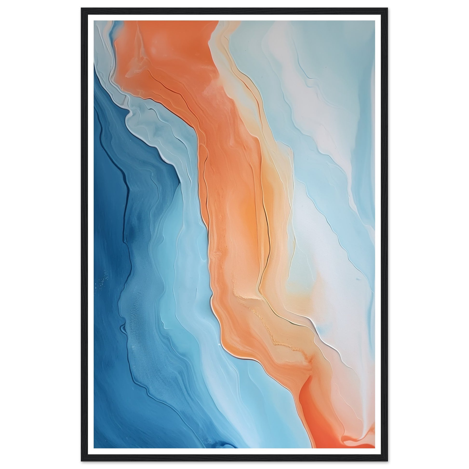 The orange and blue pigments blend and intertwine in a mesmerizing dance of colors. The abstract composition evokes a sense of movement and fluidity, as if witnessing the convergence of vibrant currents.