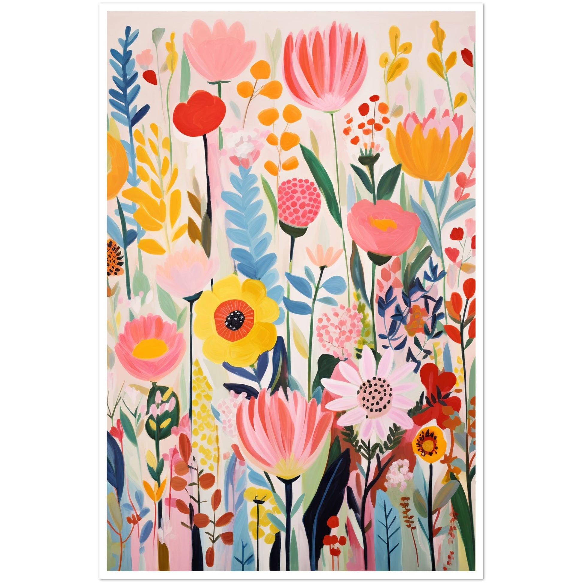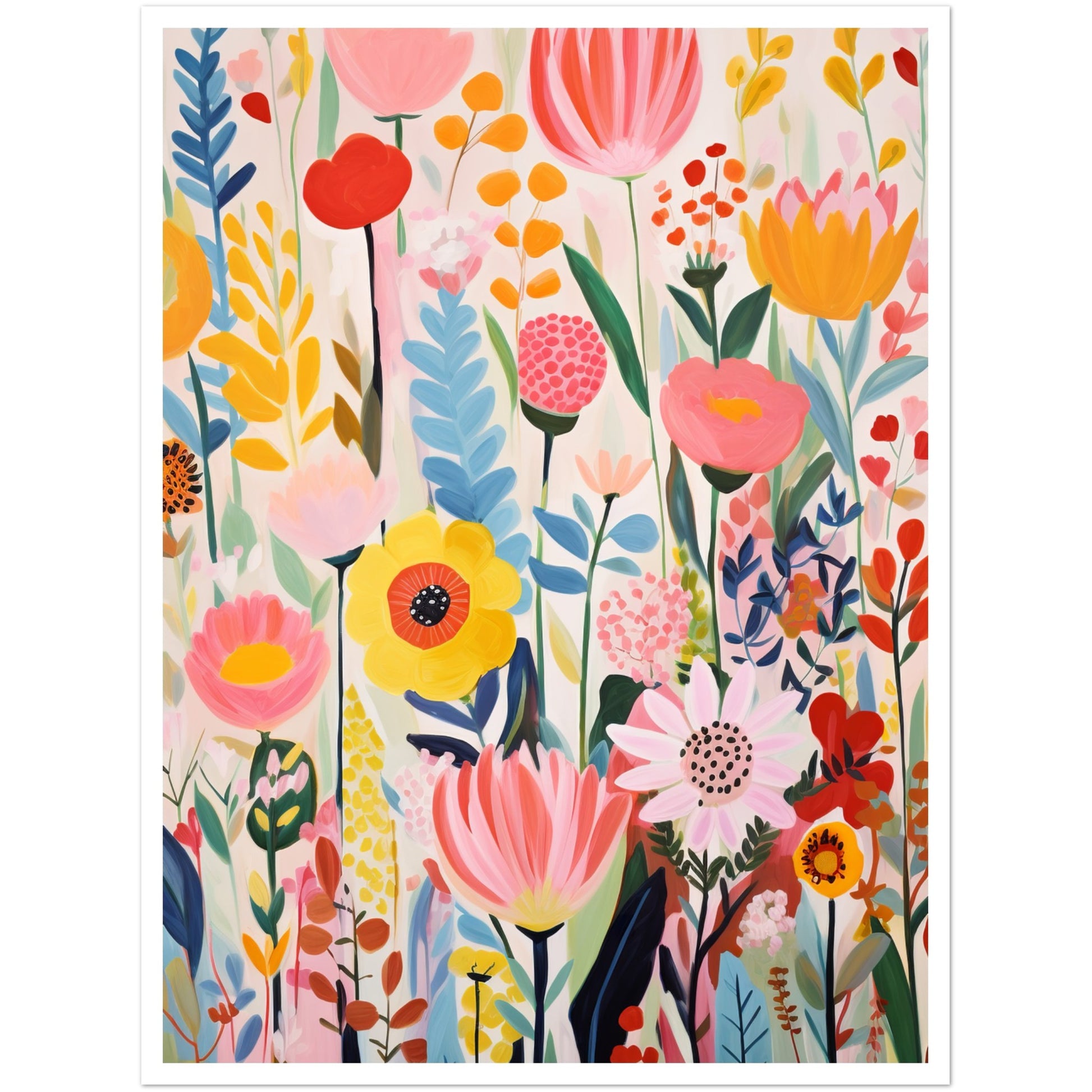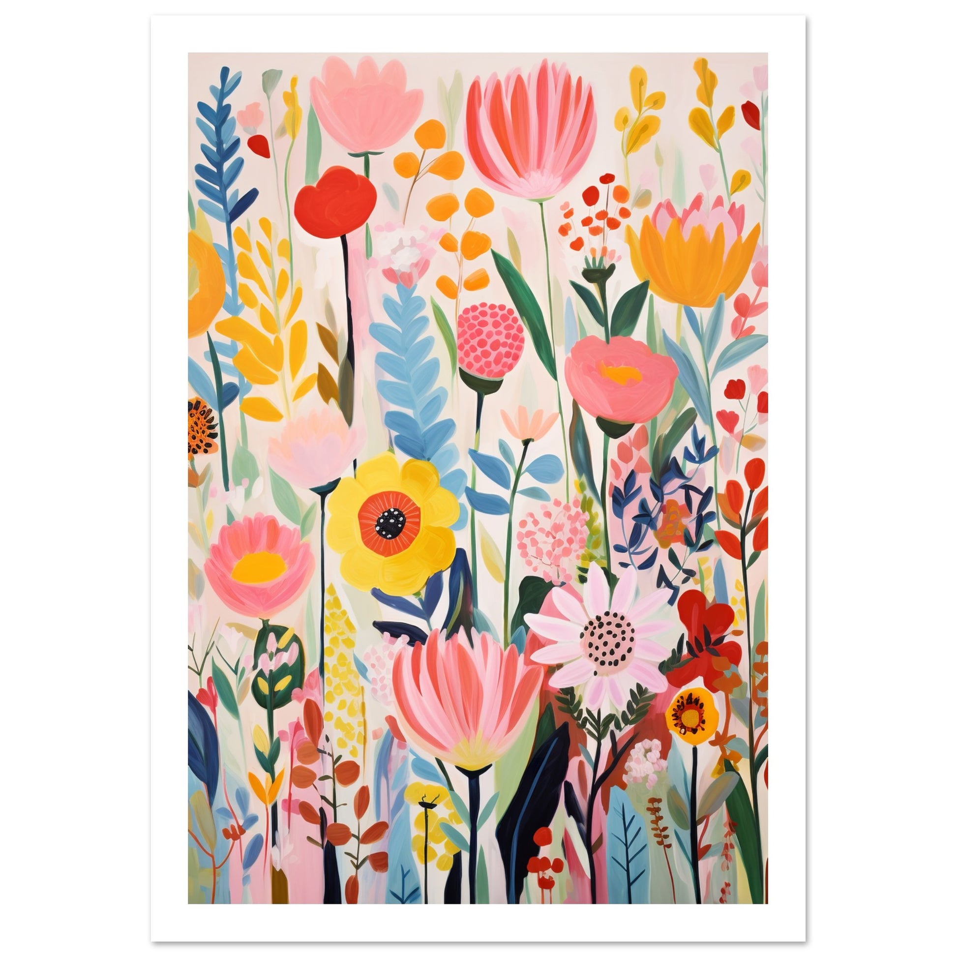 The light white and pink tones serve as a backdrop, allowing the bold primary colours to pop and create a lively composition. The artwork is a celebration of nature's beauty through dynamic brushwork and an array of playful, nature-inspired shapes. This artwork is a visual feast, bringing the lively essence of an explosion of flowers into any space.
