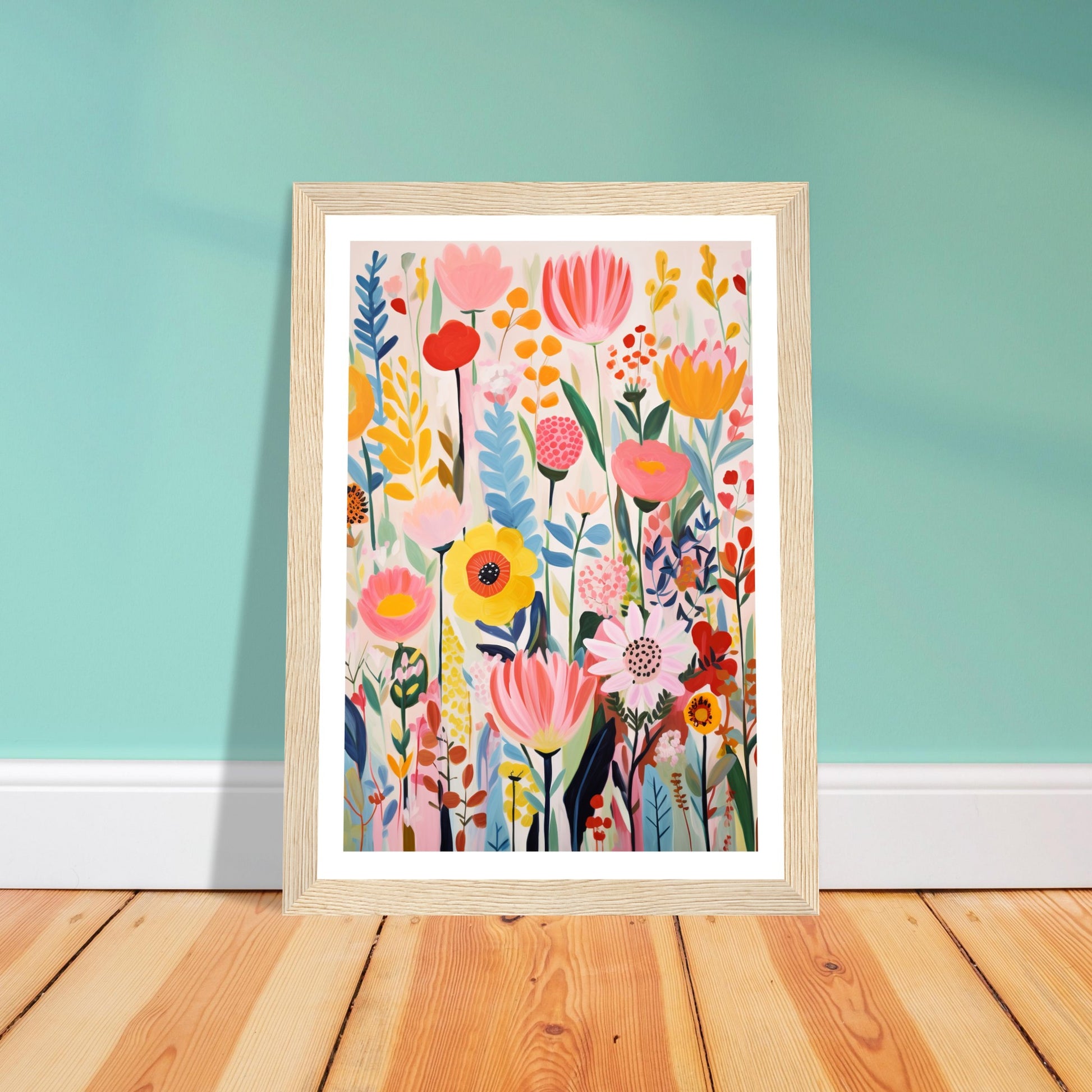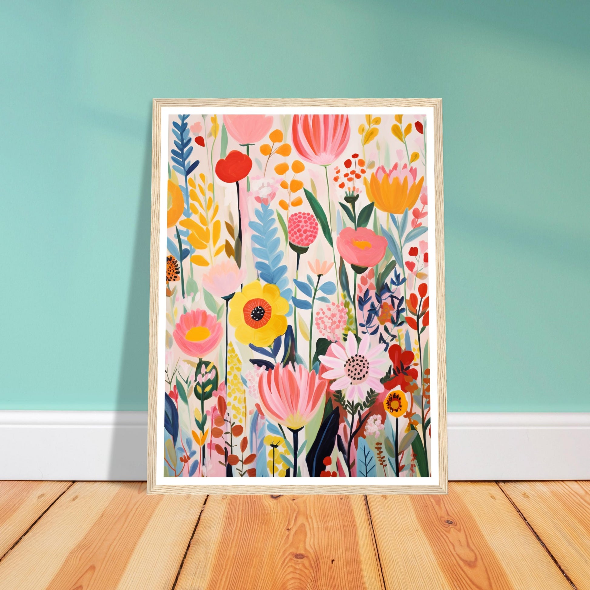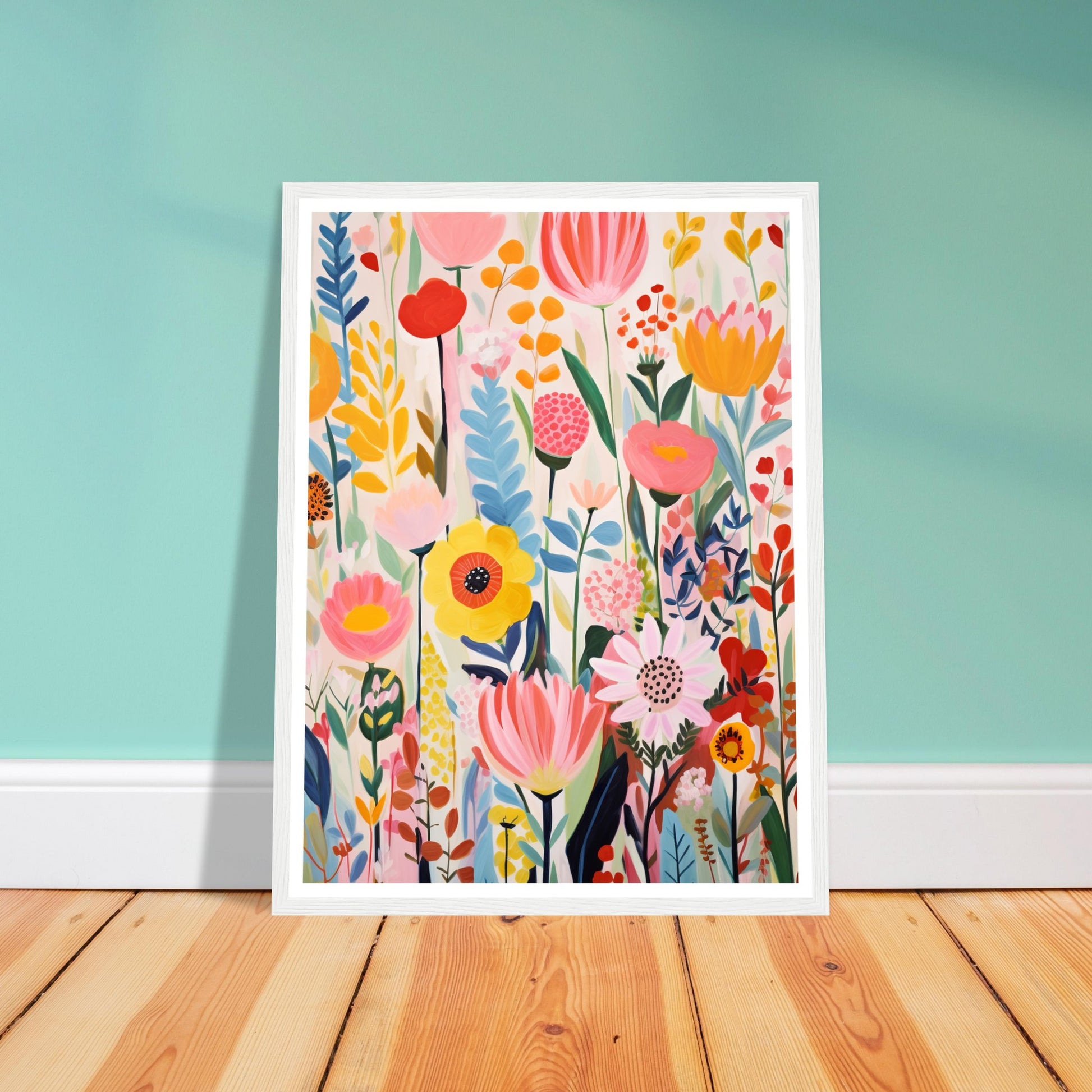 The light white and pink tones serve as a backdrop, allowing the bold primary colours to pop and create a lively composition. The artwork is a celebration of nature's beauty through dynamic brushwork and an array of playful, nature-inspired shapes. This artwork is a visual feast, bringing the lively essence of an explosion of flowers into any space.
