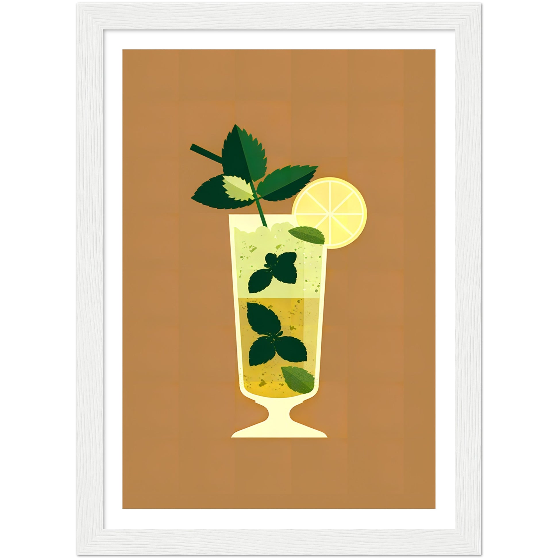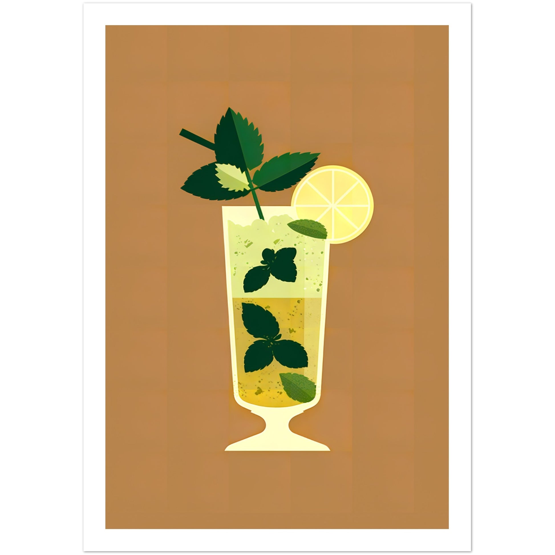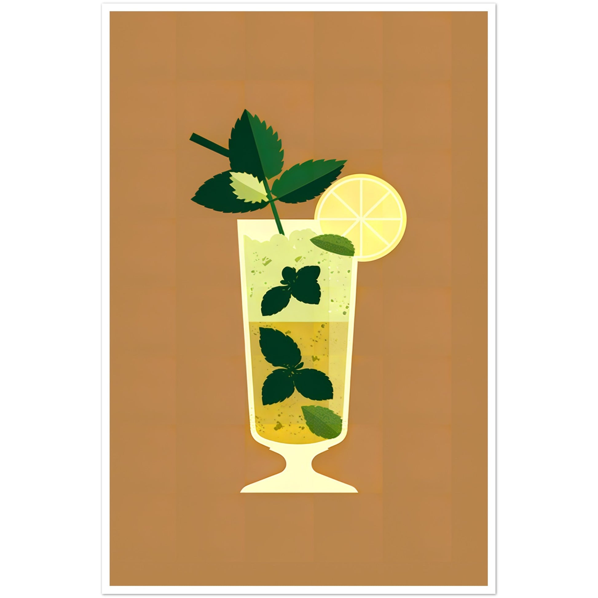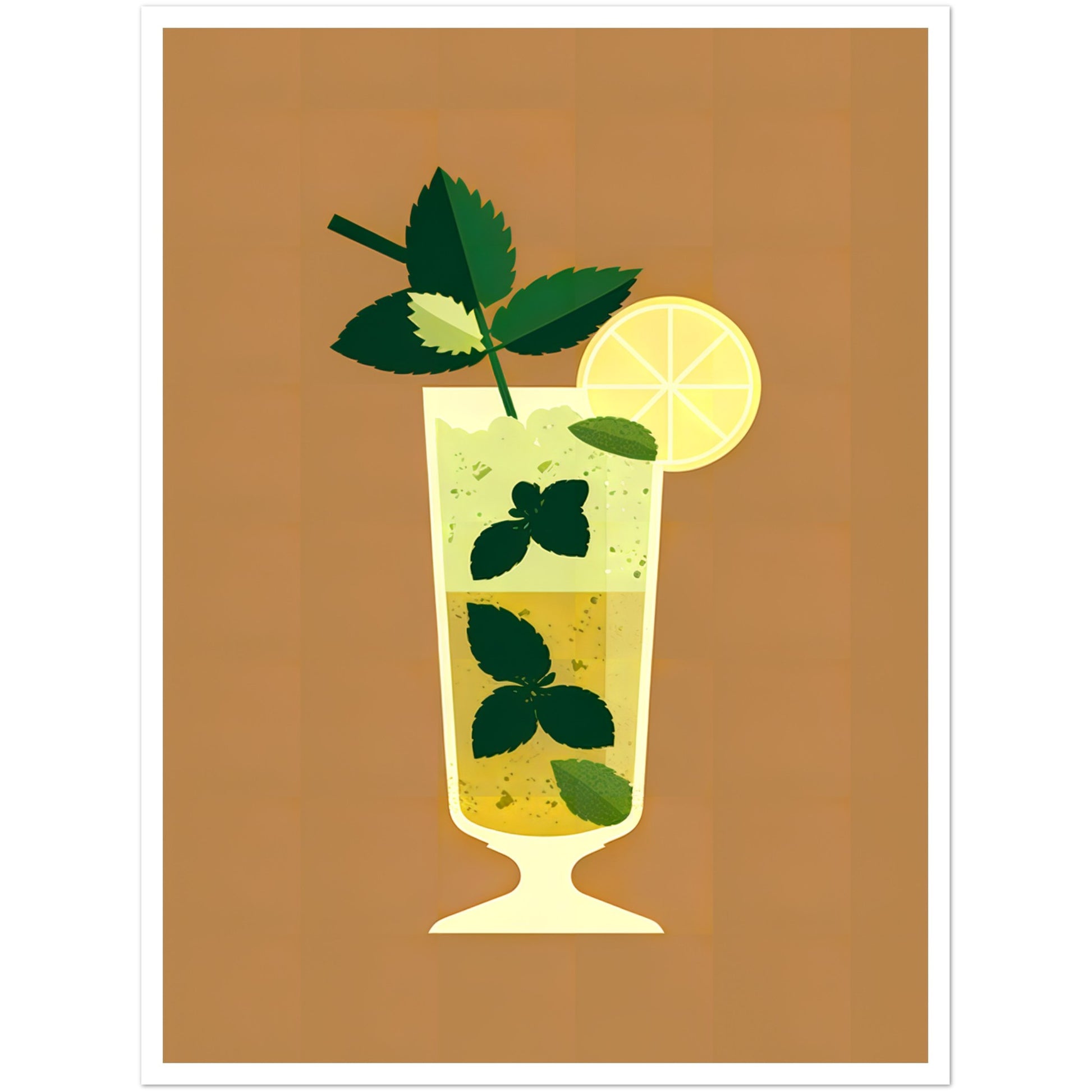 This minimalist illustration features a refreshing Mojito cocktail in a flat design. The simple yet striking design captures the essence of the classic cocktail, with its green hue and signature mint leaves.