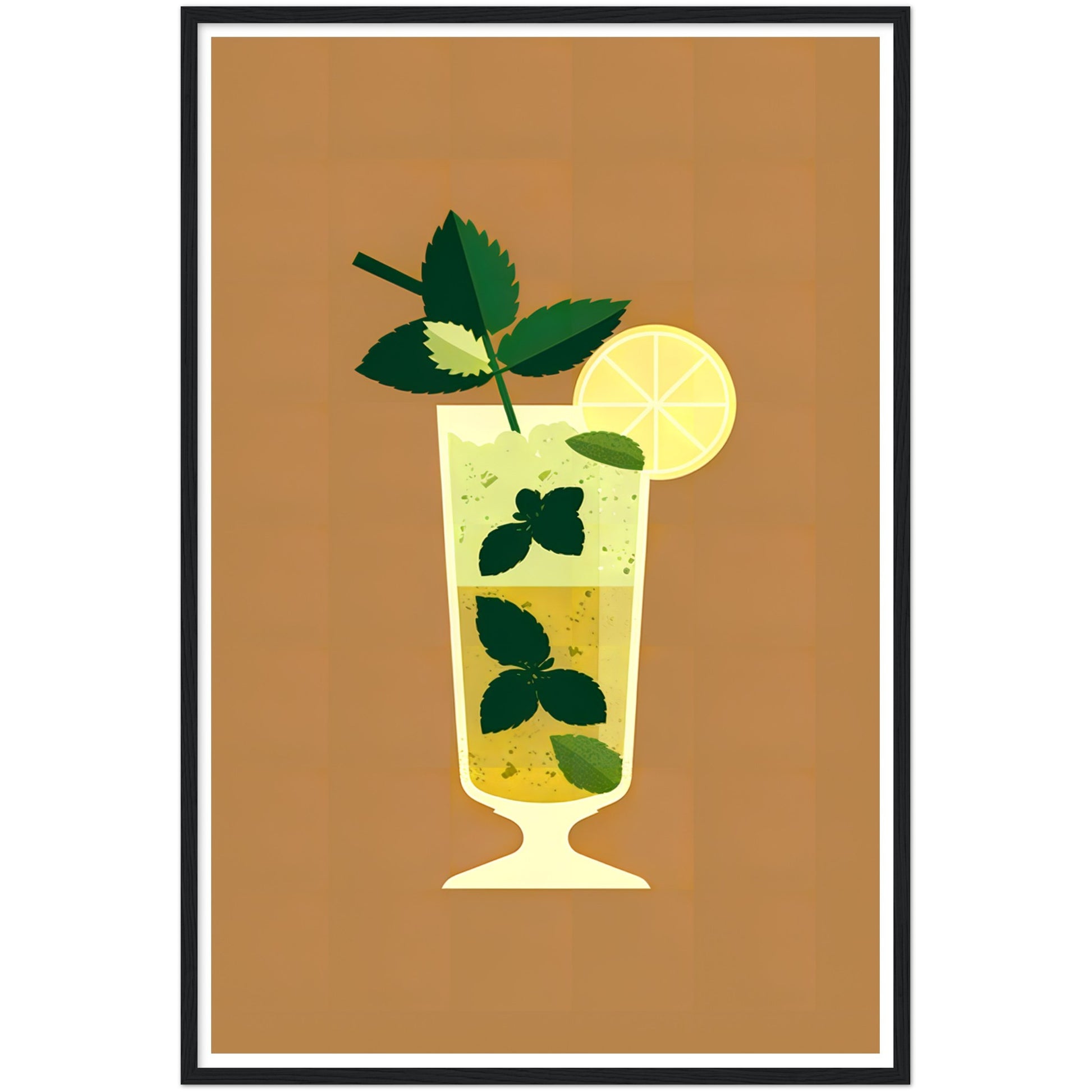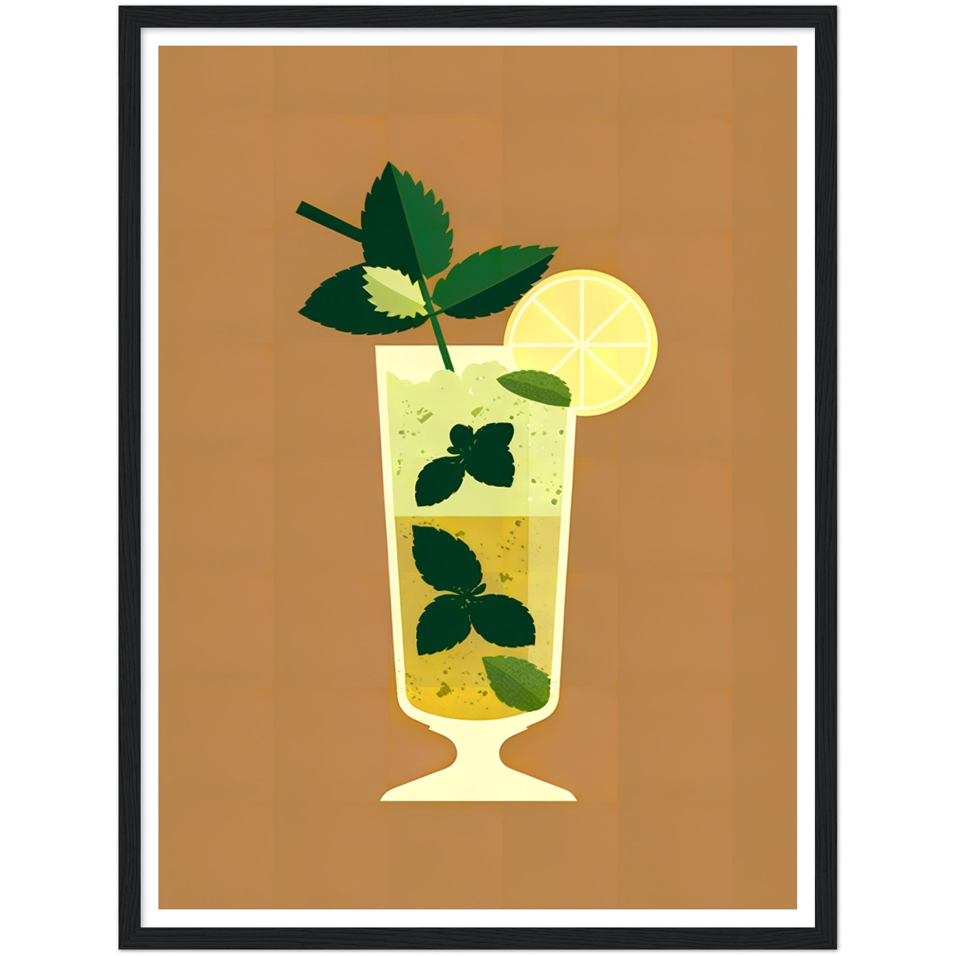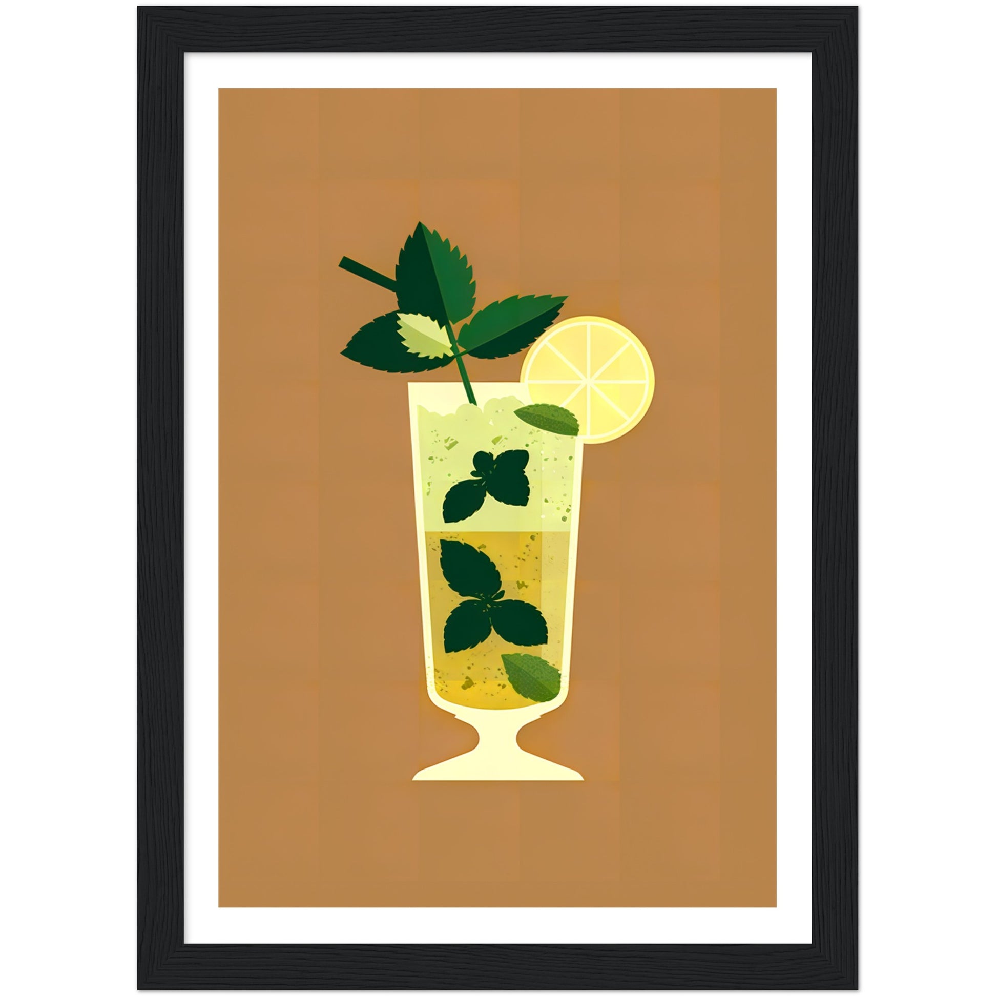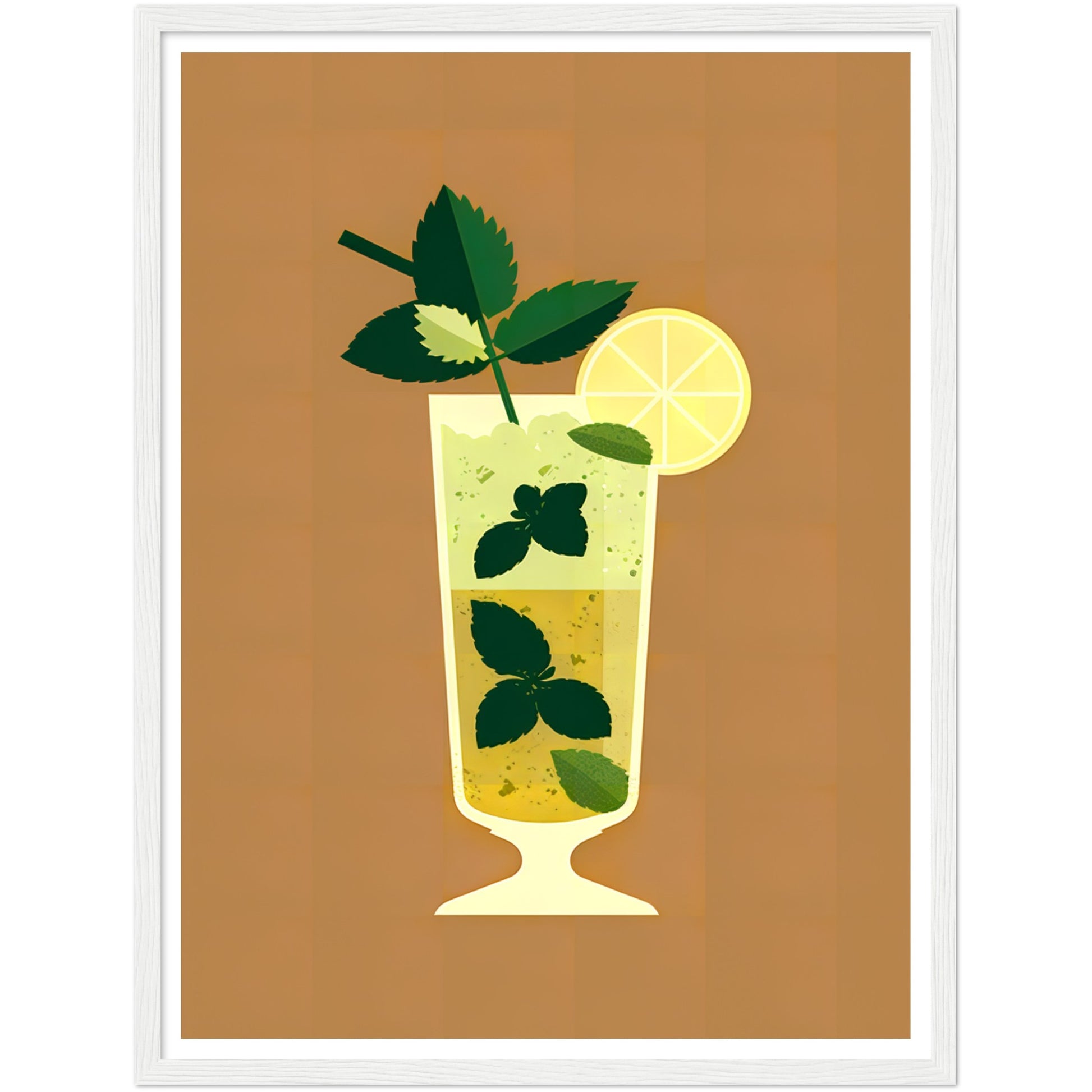 This minimalist illustration features a refreshing Mojito cocktail in a flat design. The simple yet striking design captures the essence of the classic cocktail, with its green hue and signature mint leaves.