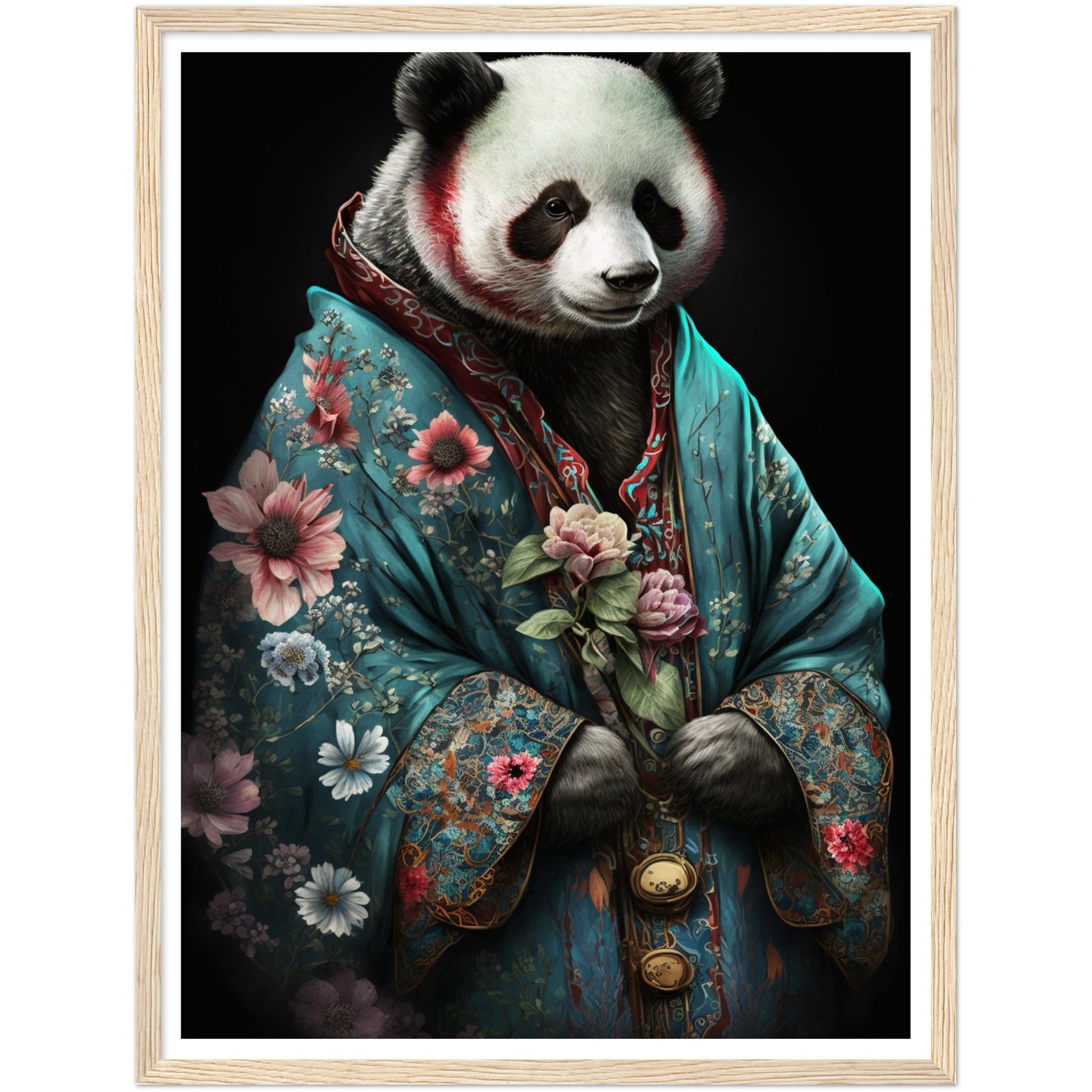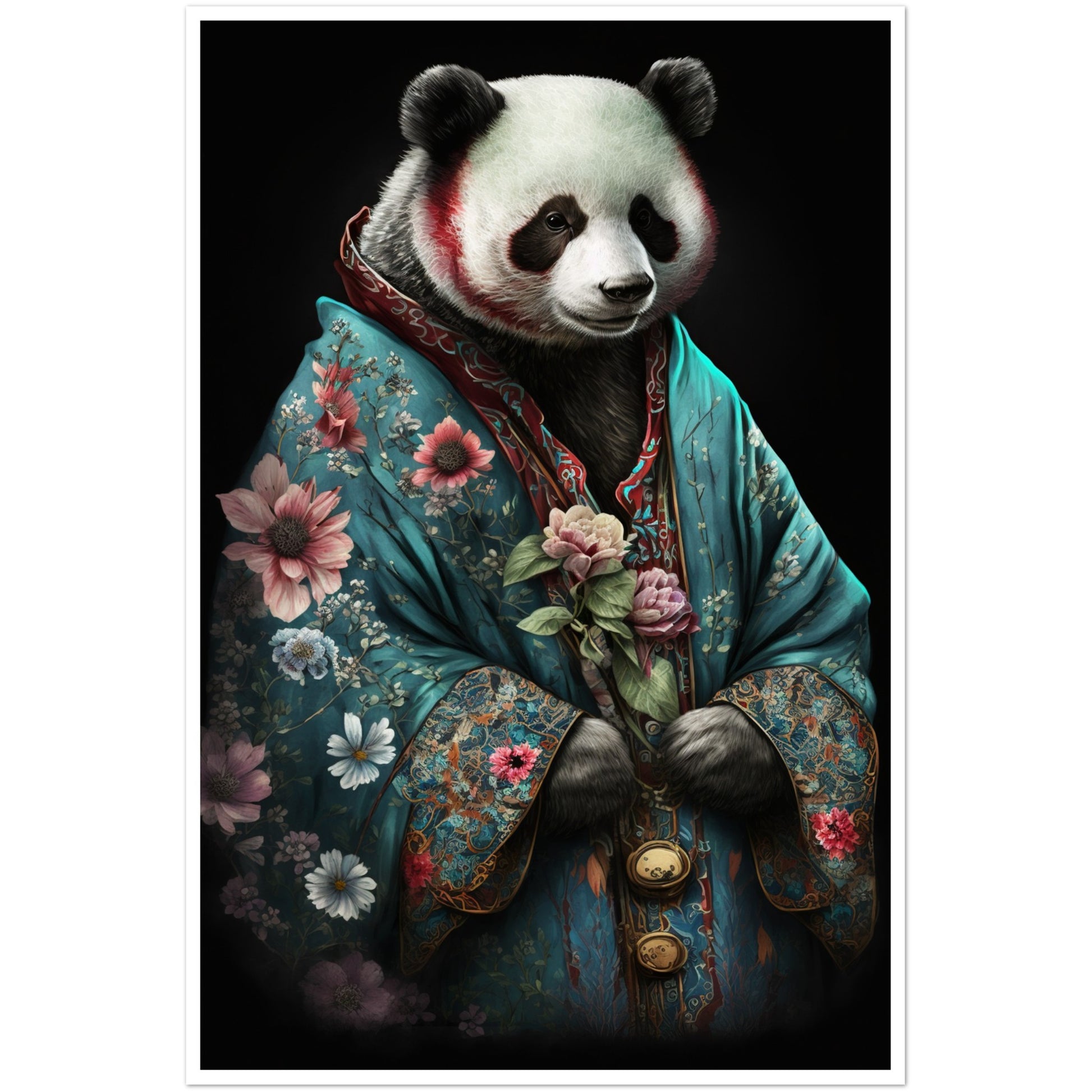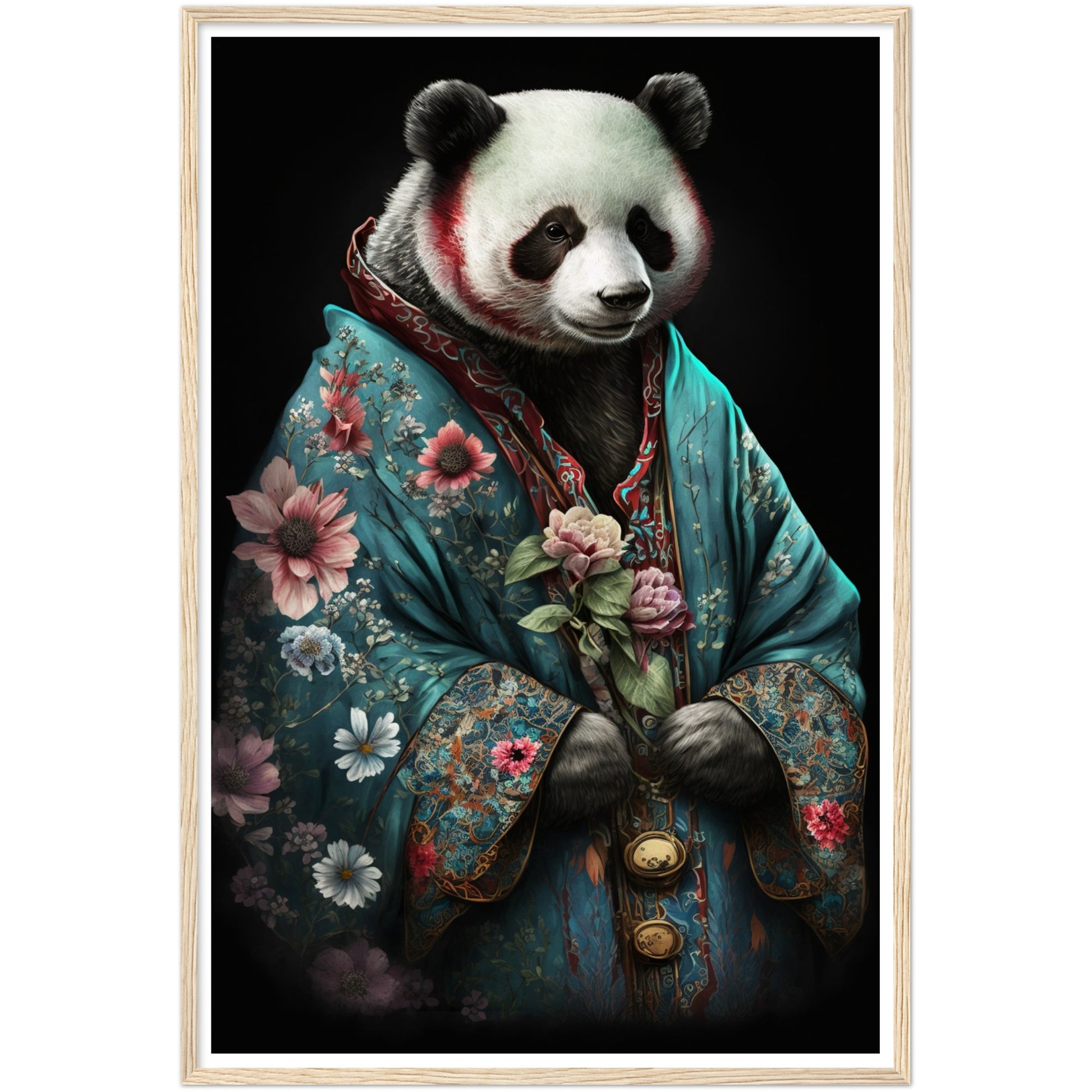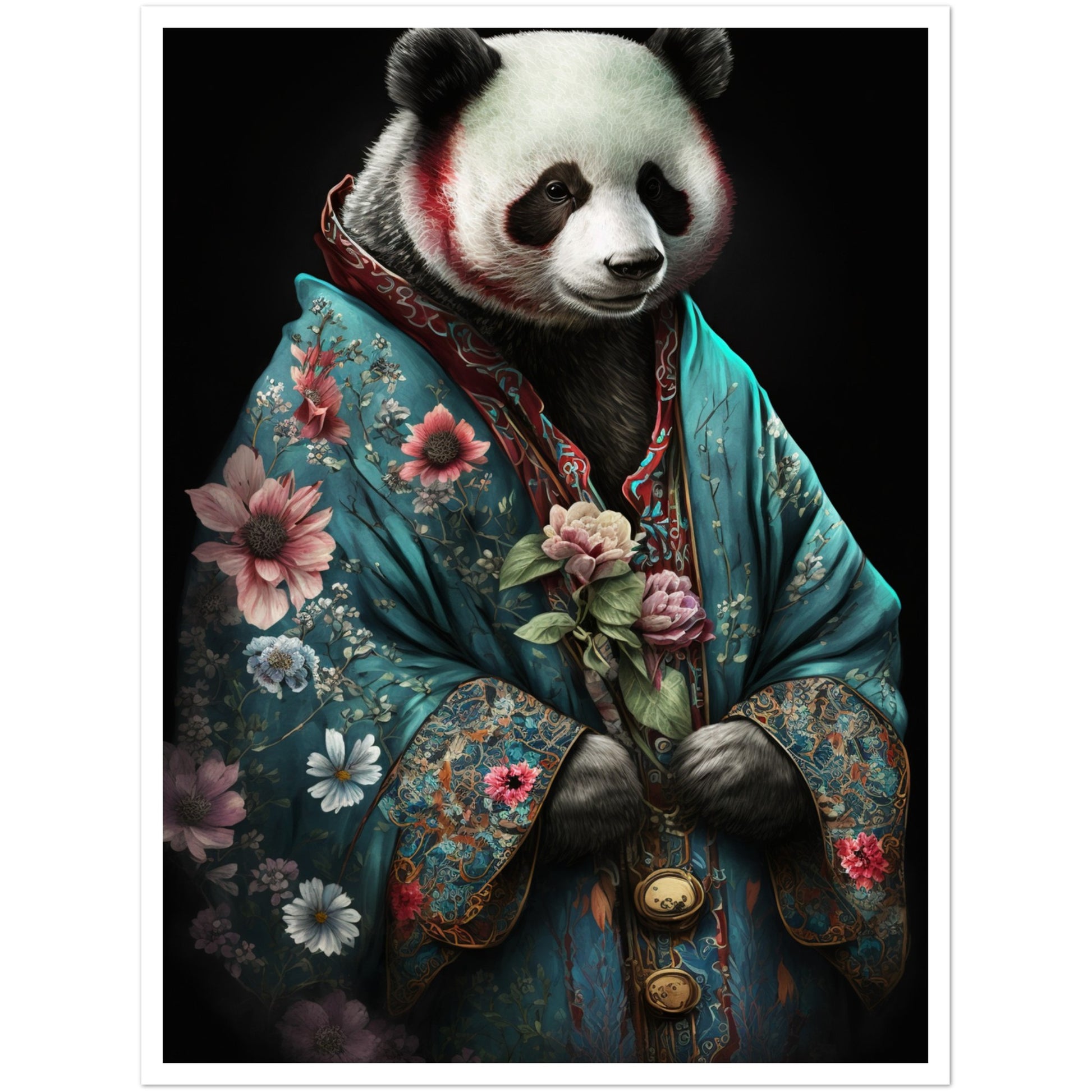 This stunning illustration depicts a playful panda dressed in a vibrant kimono outfit. The intricate details of the kimono, from the delicate floral patterns to the bold colors, are expertly captured in this artwork. The panda's expression is both mischievous and endearing, it is sure to bring joy and whimsy to any space it is displayed in.