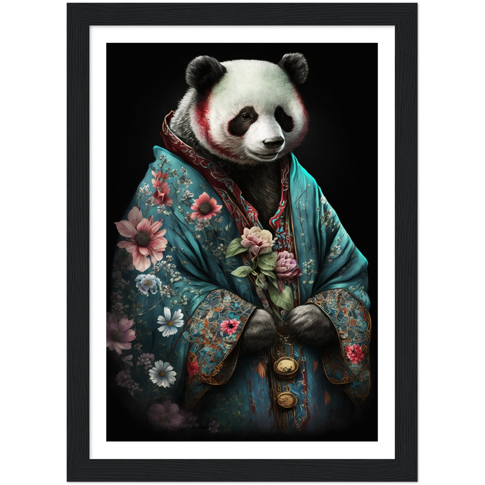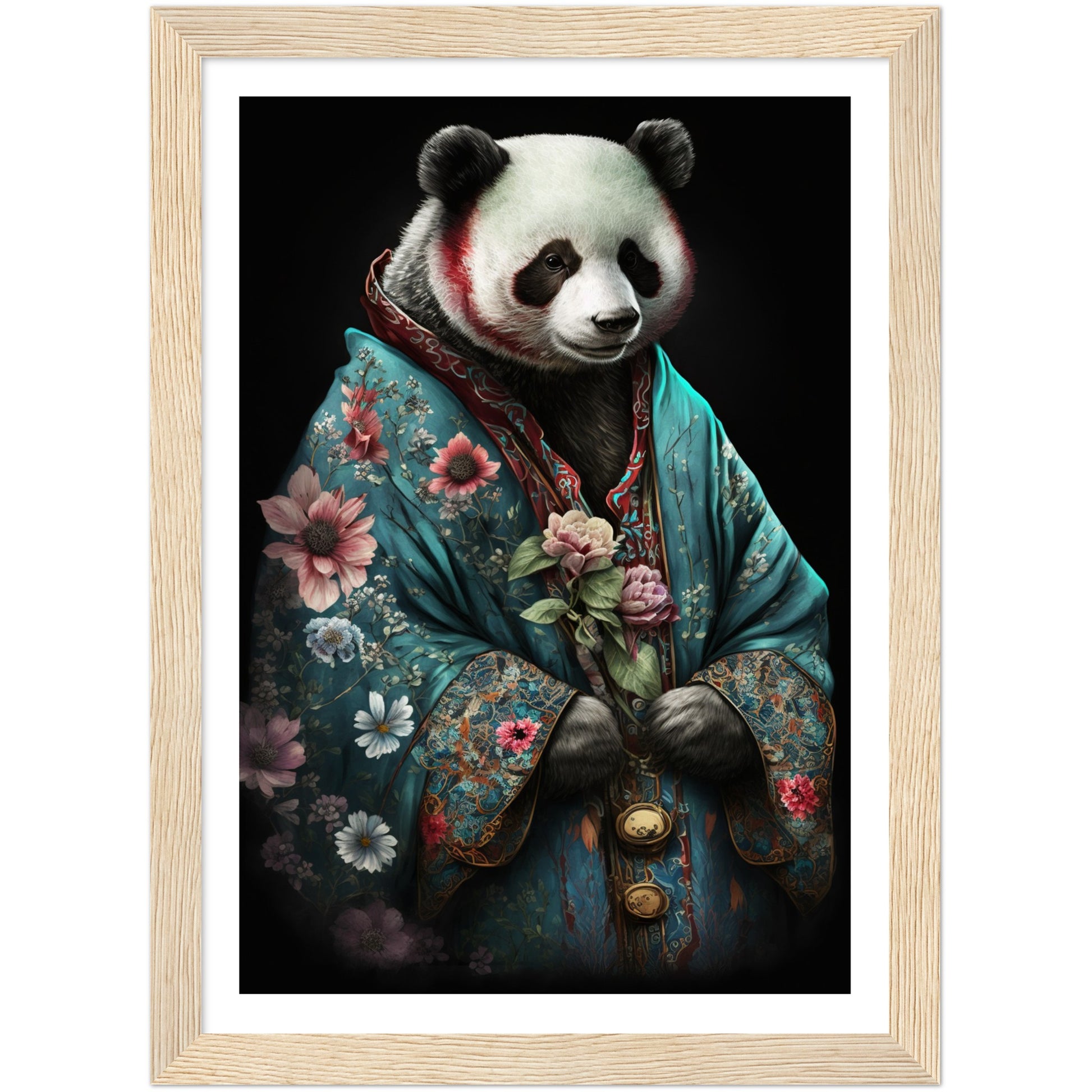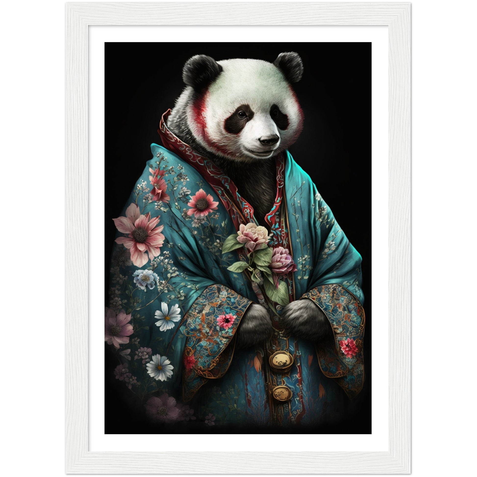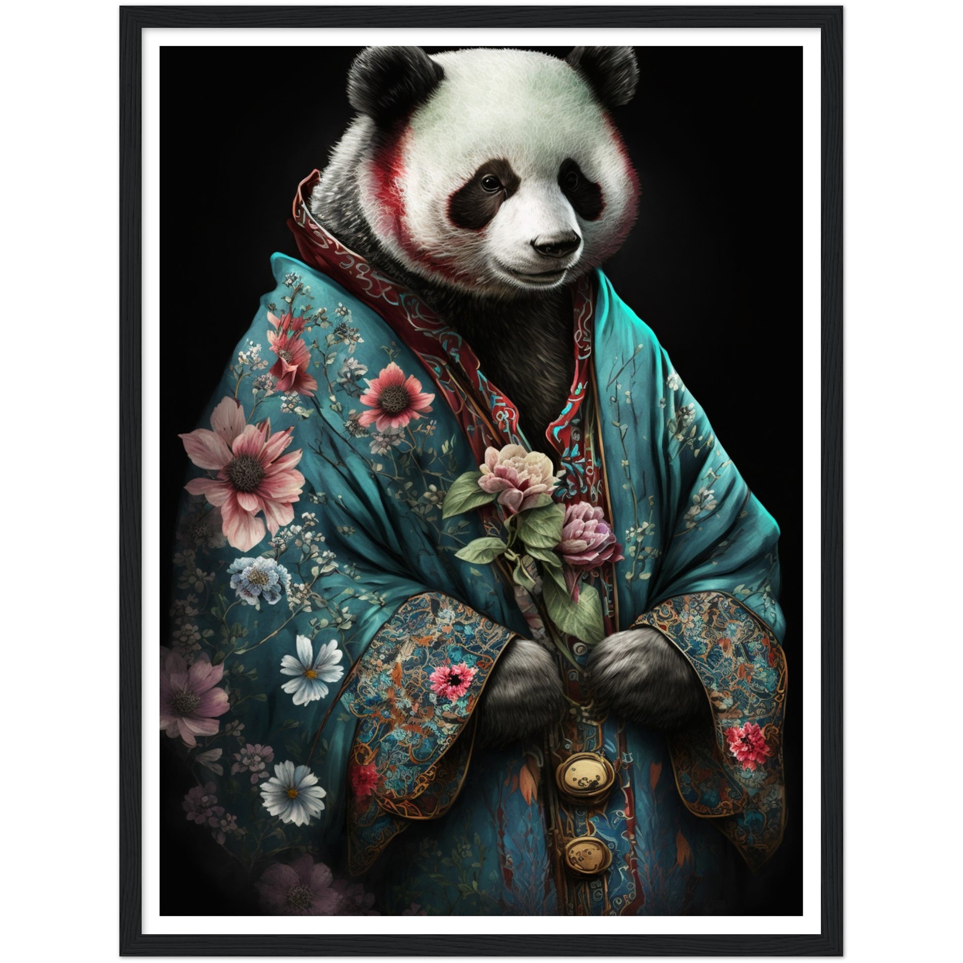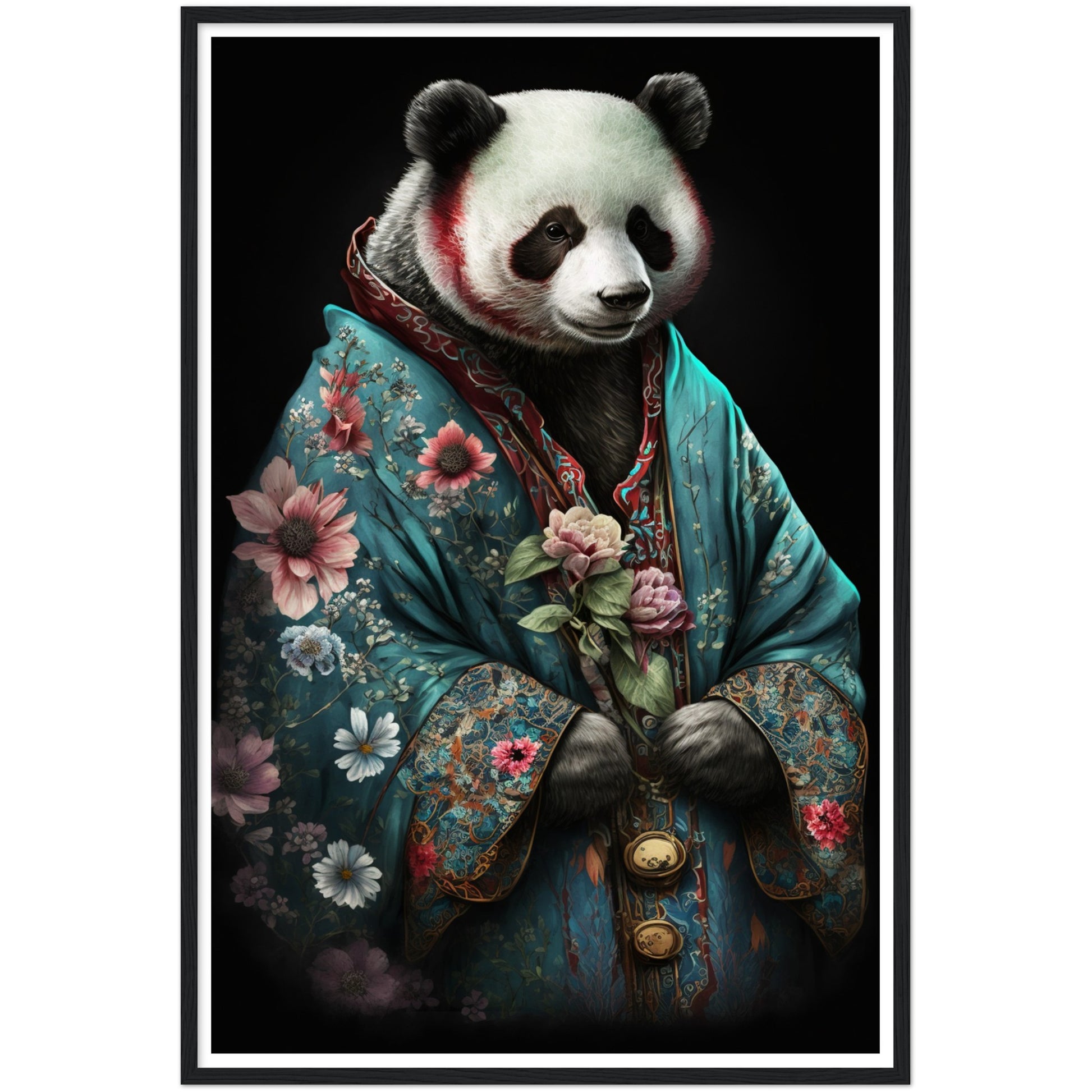 This stunning illustration depicts a playful panda dressed in a vibrant kimono outfit. The intricate details of the kimono, from the delicate floral patterns to the bold colors, are expertly captured in this artwork. The panda's expression is both mischievous and endearing, it is sure to bring joy and whimsy to any space it is displayed in.