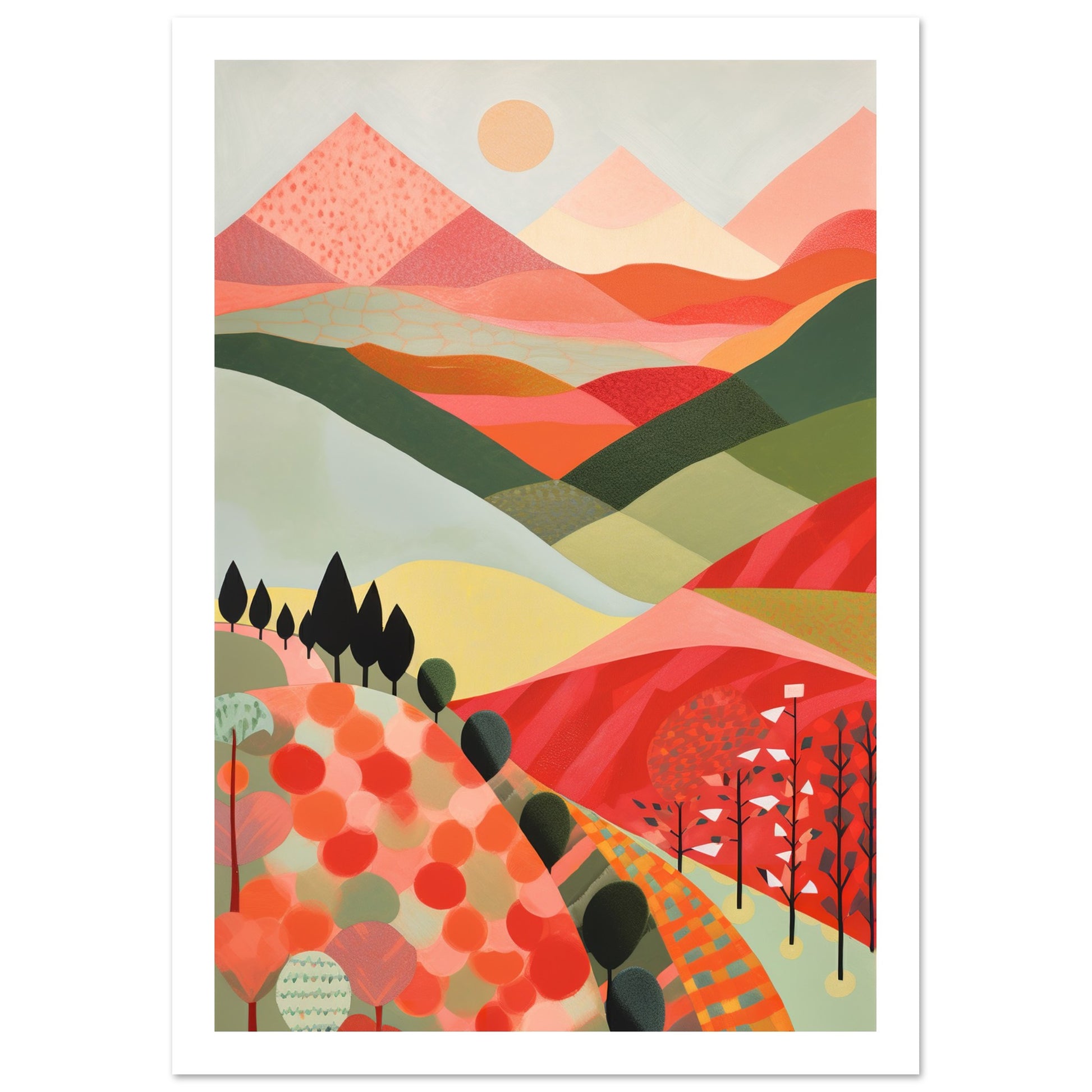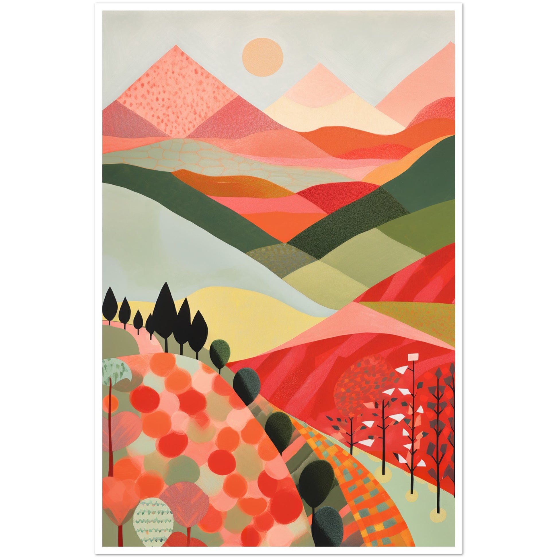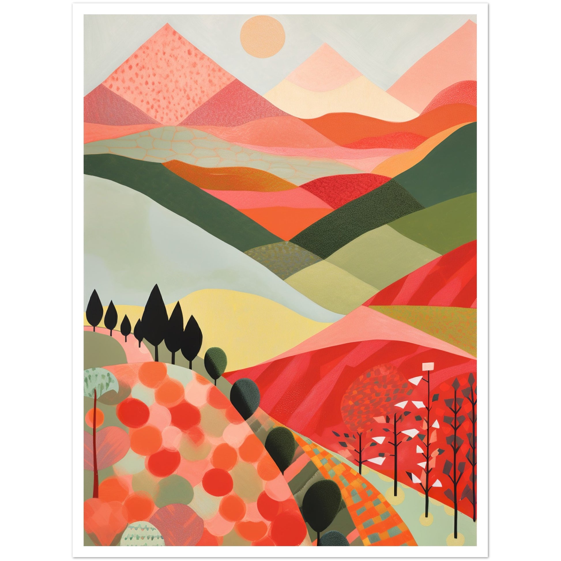 A captivating piece that invites you to explore a unique and mesmerizing world. This striking illustration portrays a landscape of red mountains adorned with intricate abstract patterns, crafted in a captivating painted style.