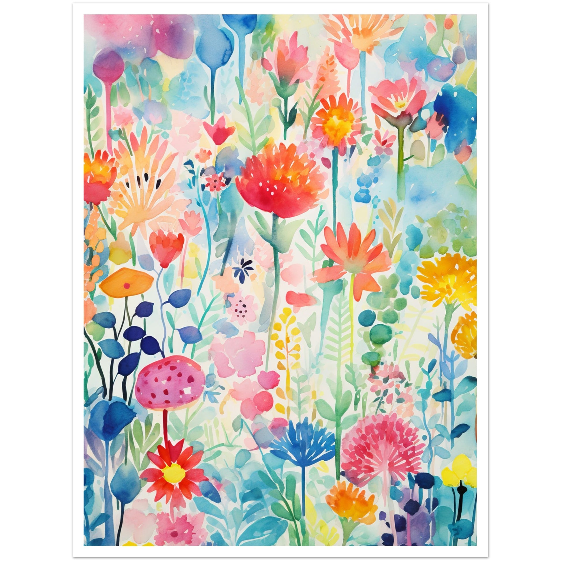 Step into the enchanting world of "Rainbow Petal Symphony," a watercolour painting print that bursts with an explosion of colourful flowers, creating a dreamy and cute ambiance. The translucent watercolours achieve a delicate and ethereal quality, allowing the hues to blend and dance. The painting is a celebration of pretty blooms in a spectrum of colours, each petal contributing to the overall symphony of beauty.