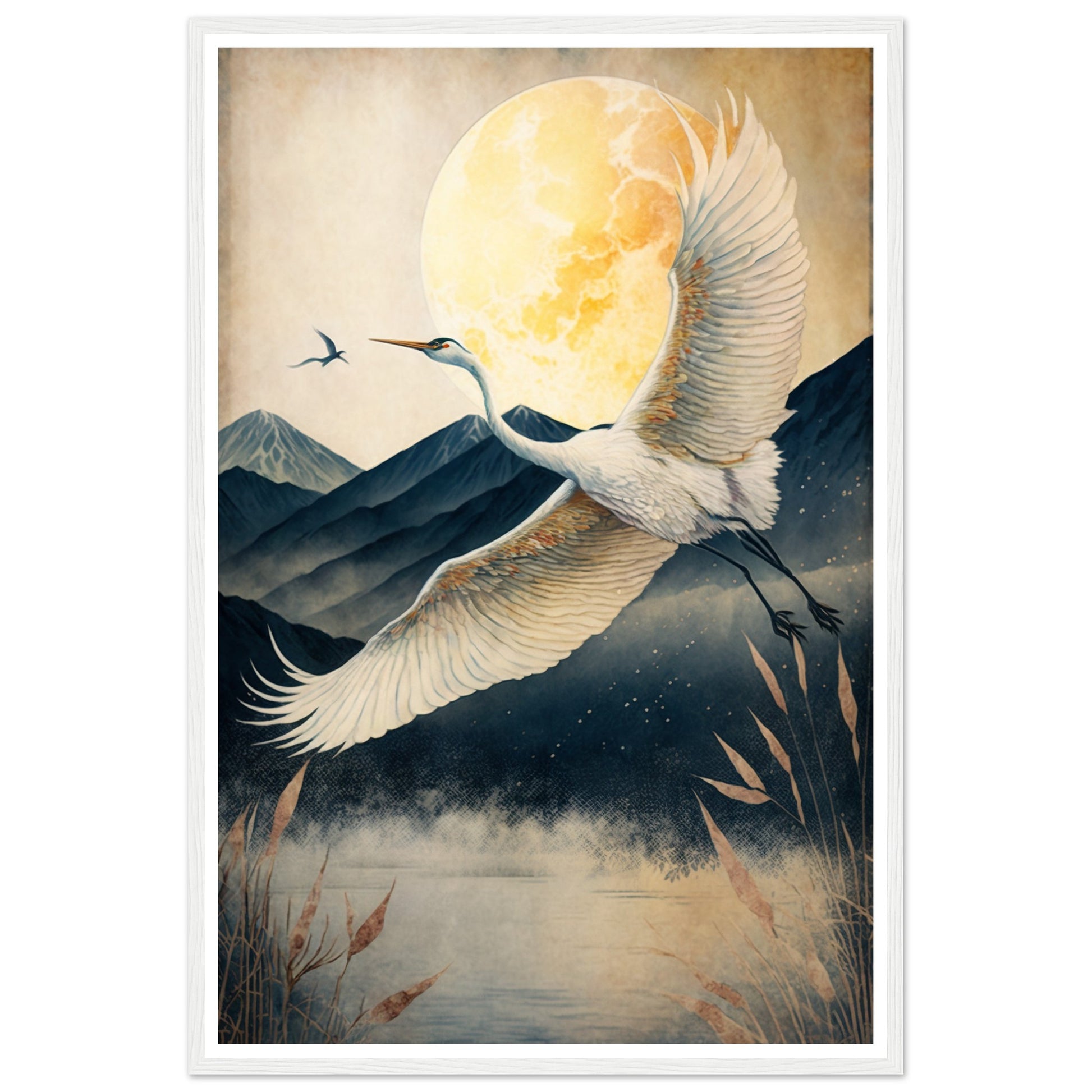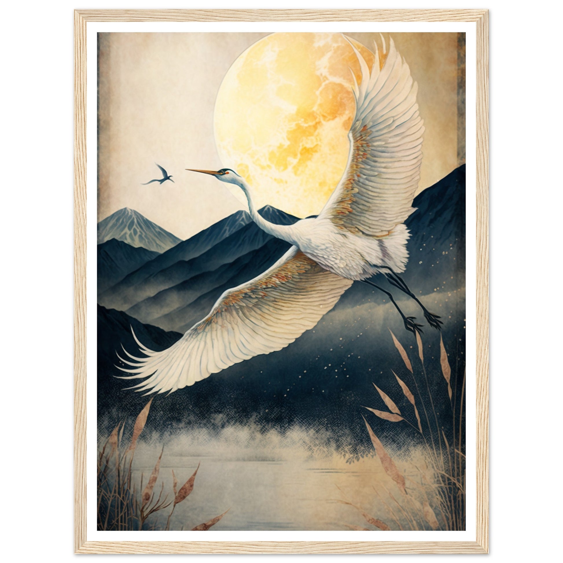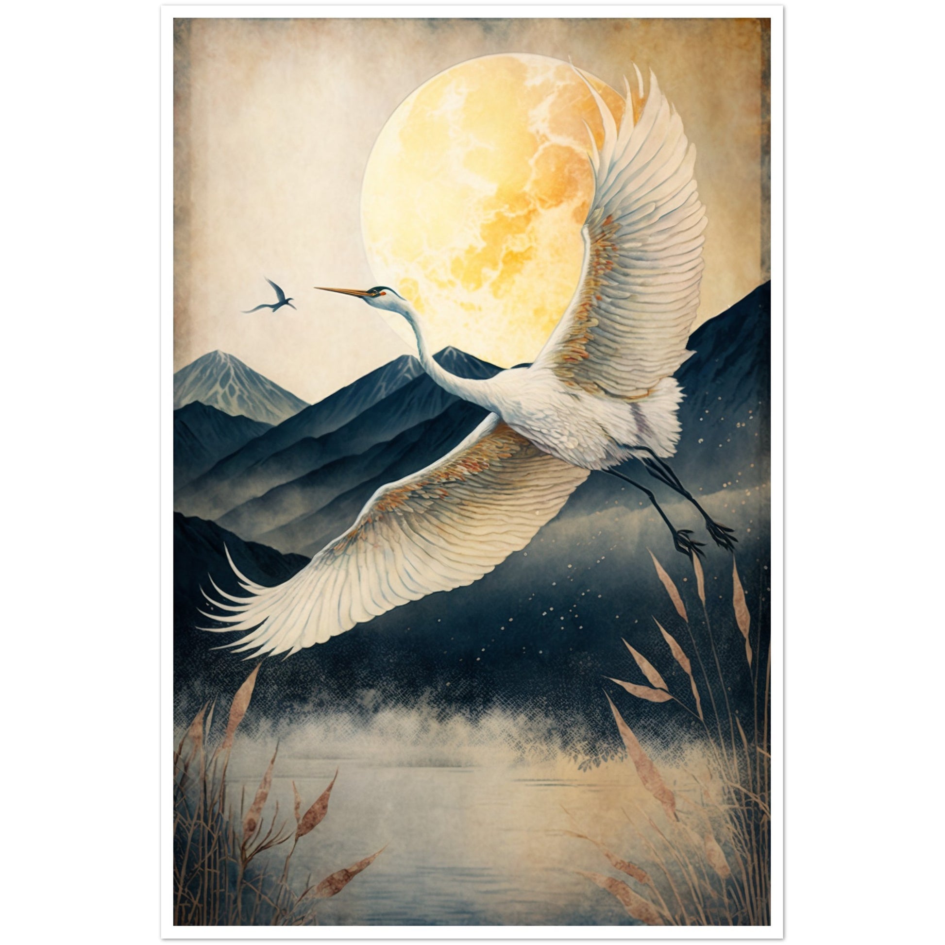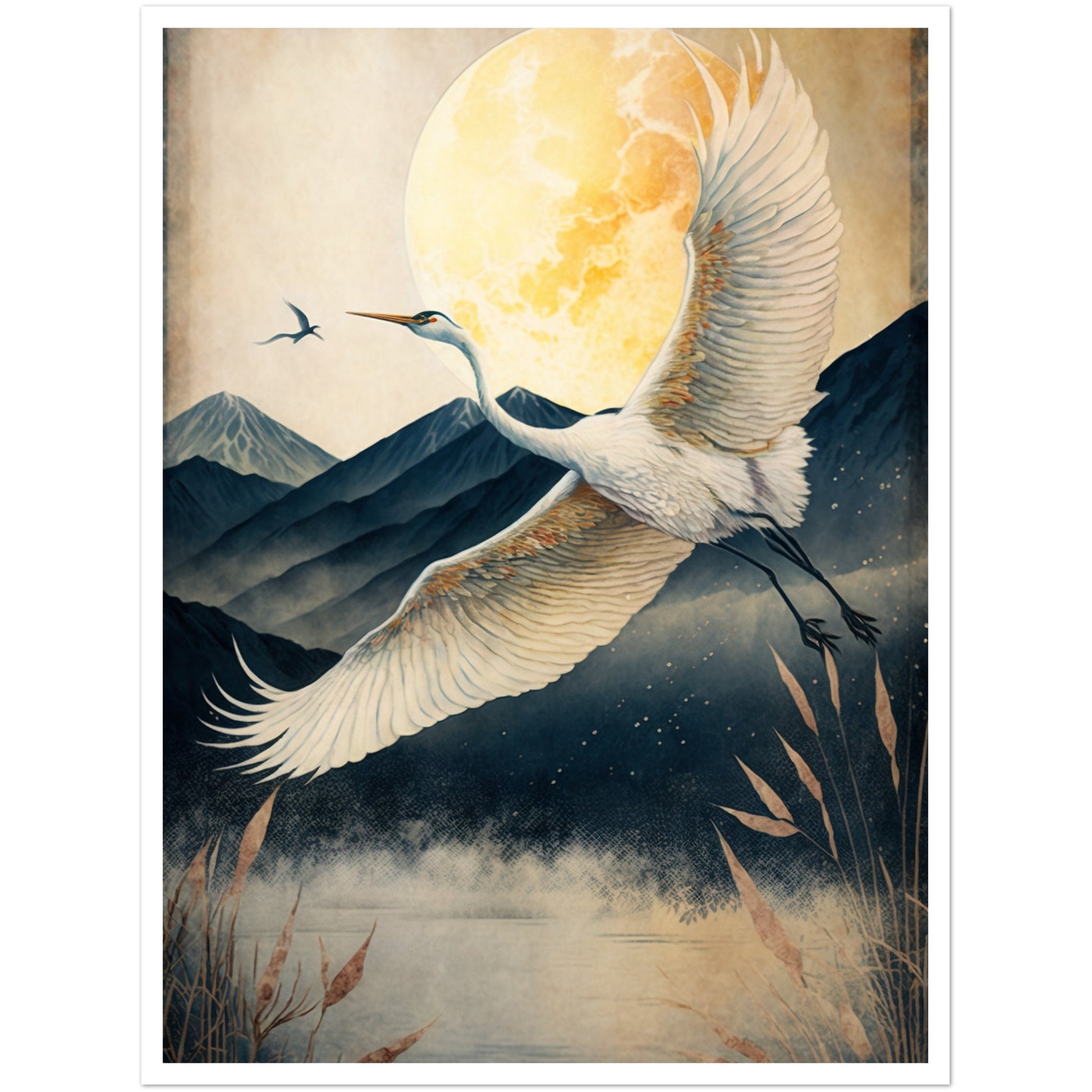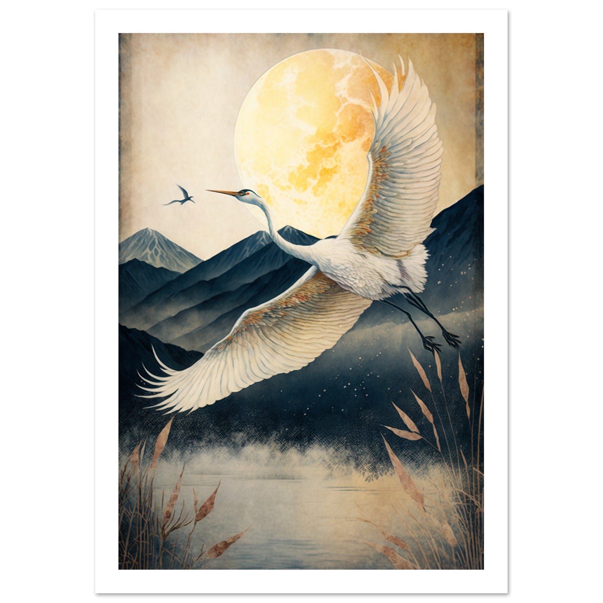 A hauntingly beautiful artwork that embodies the beauty of a white crane in flight over grasses, in the style of golden age illustrations. This artwork transports you to mountainous vistas with its Japanese-inspired imagery and golden sun backdrop. The golden sun and intricate details add a touch of warmth and radiance to the composition. Immerse yourself in the graceful flight of the crane and let its elegant presence bring tranquillity and serenity to your space.