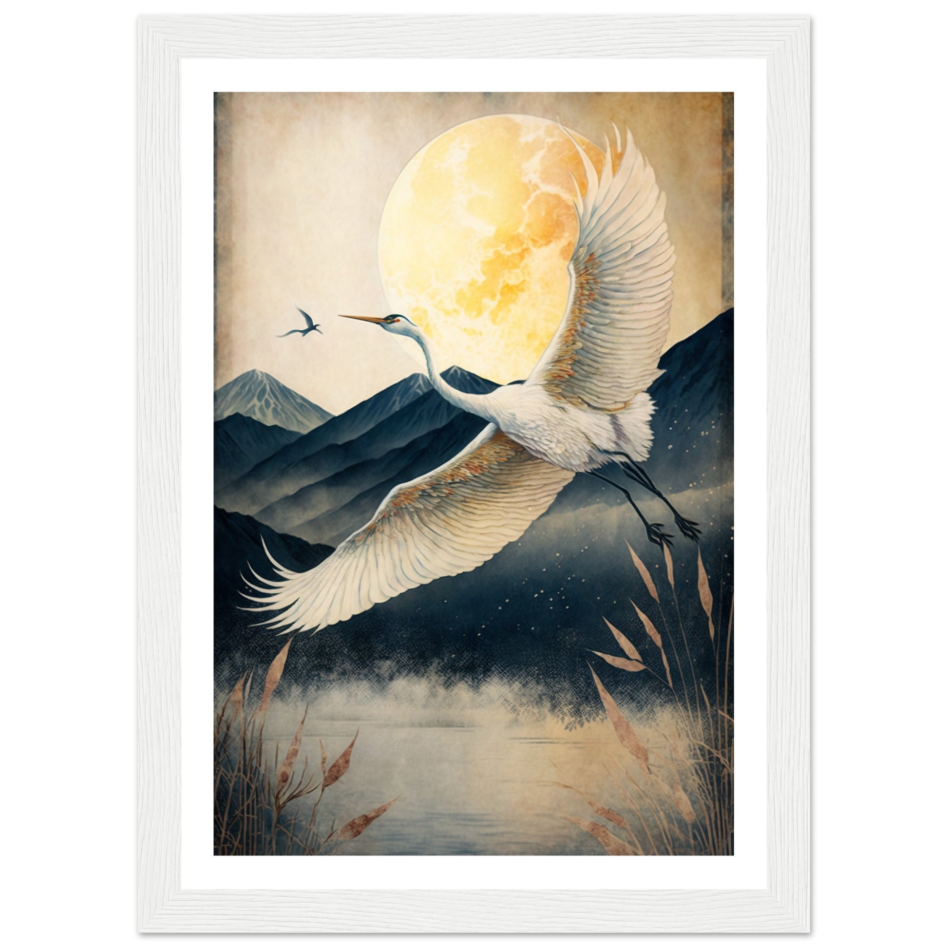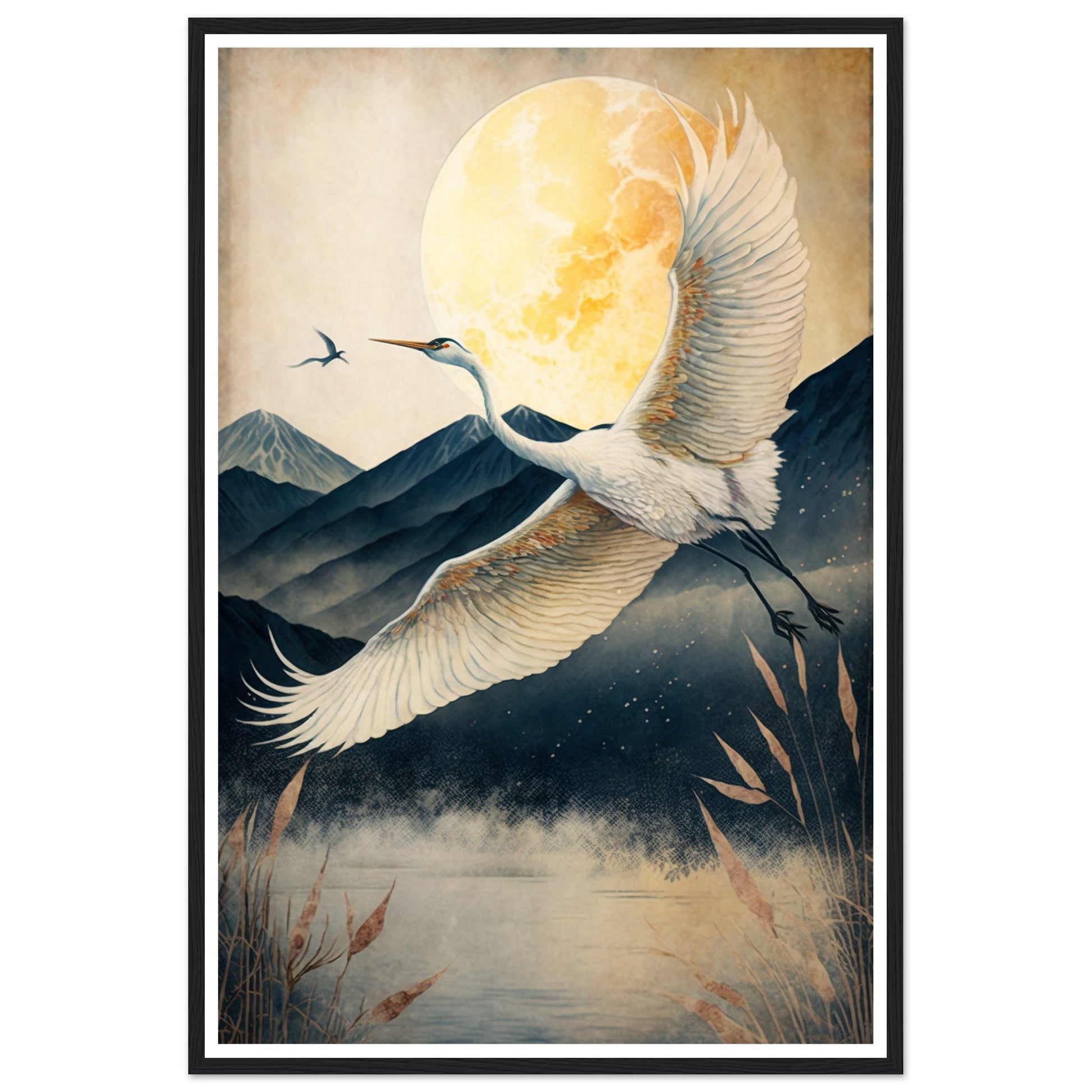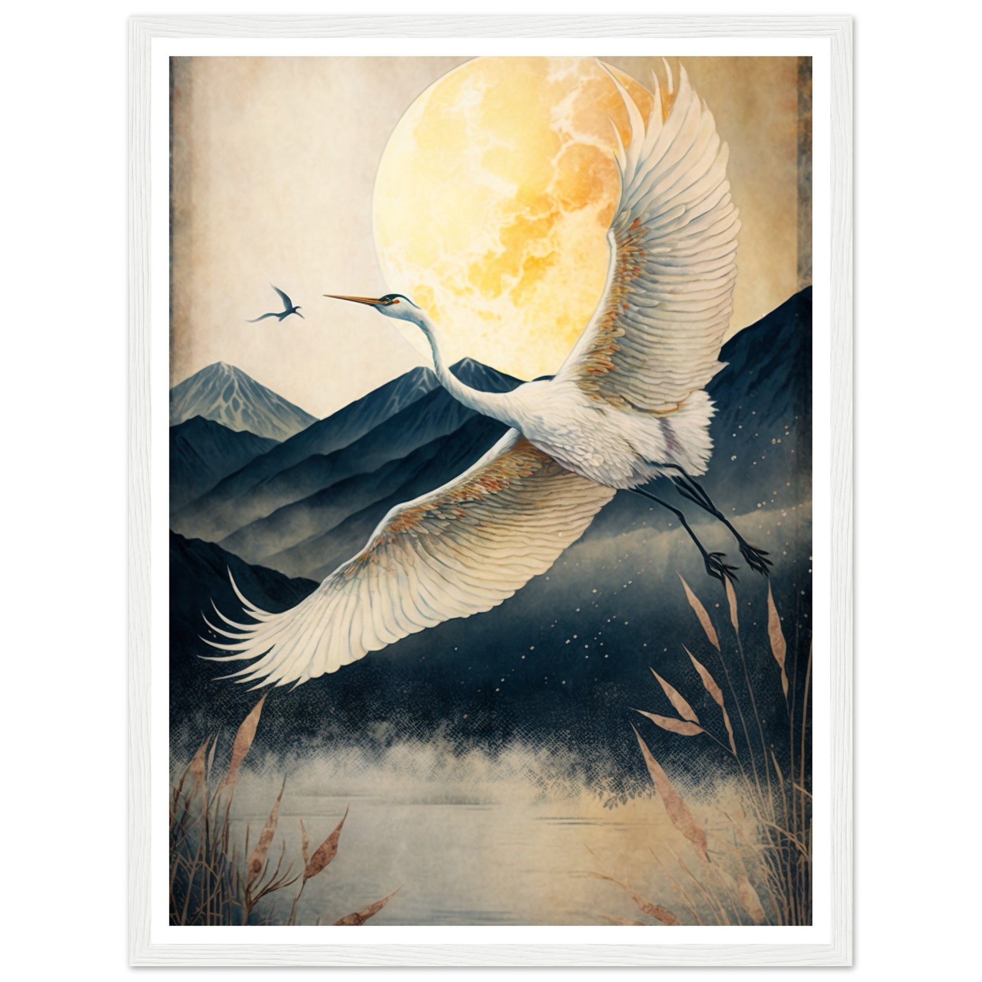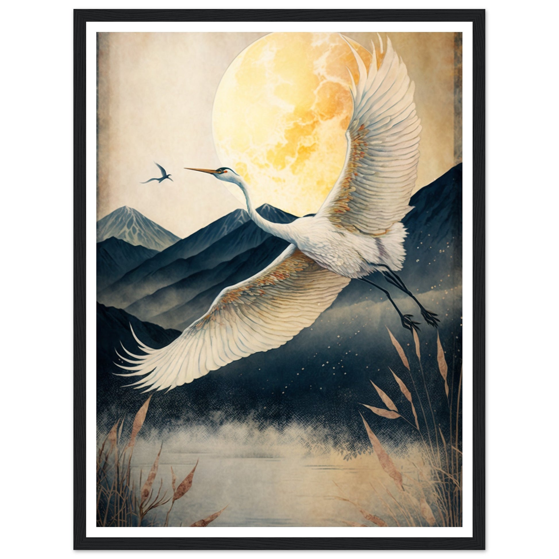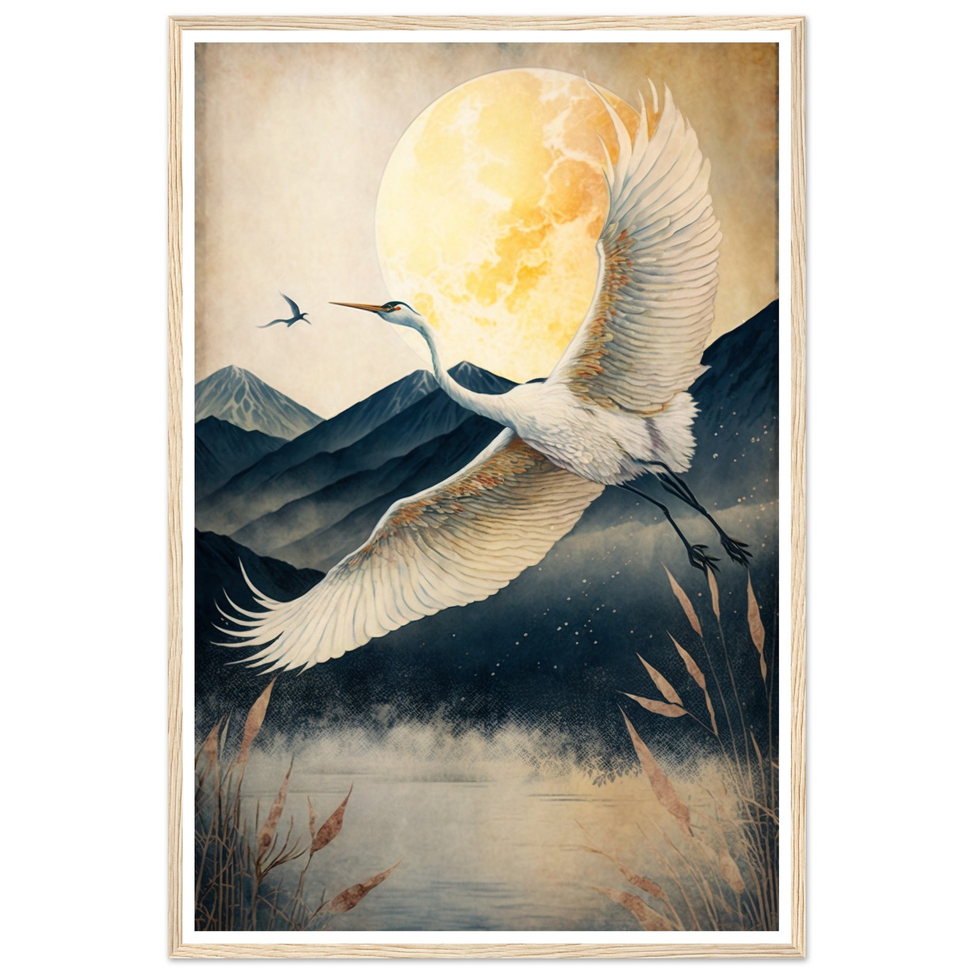 A hauntingly beautiful artwork that embodies the beauty of a white crane in flight over grasses, in the style of golden age illustrations. This artwork transports you to mountainous vistas with its Japanese-inspired imagery and golden sun backdrop. The golden sun and intricate details add a touch of warmth and radiance to the composition. Immerse yourself in the graceful flight of the crane and let its elegant presence bring tranquillity and serenity to your space.