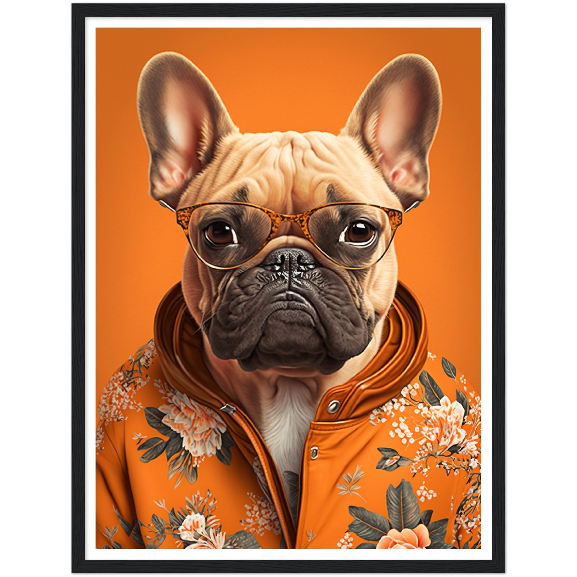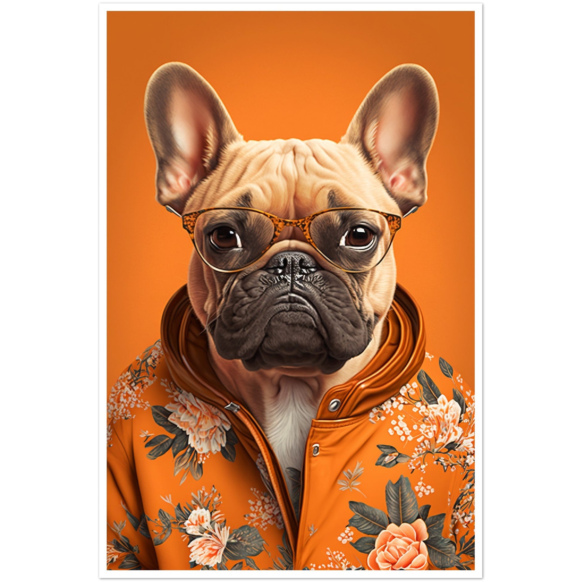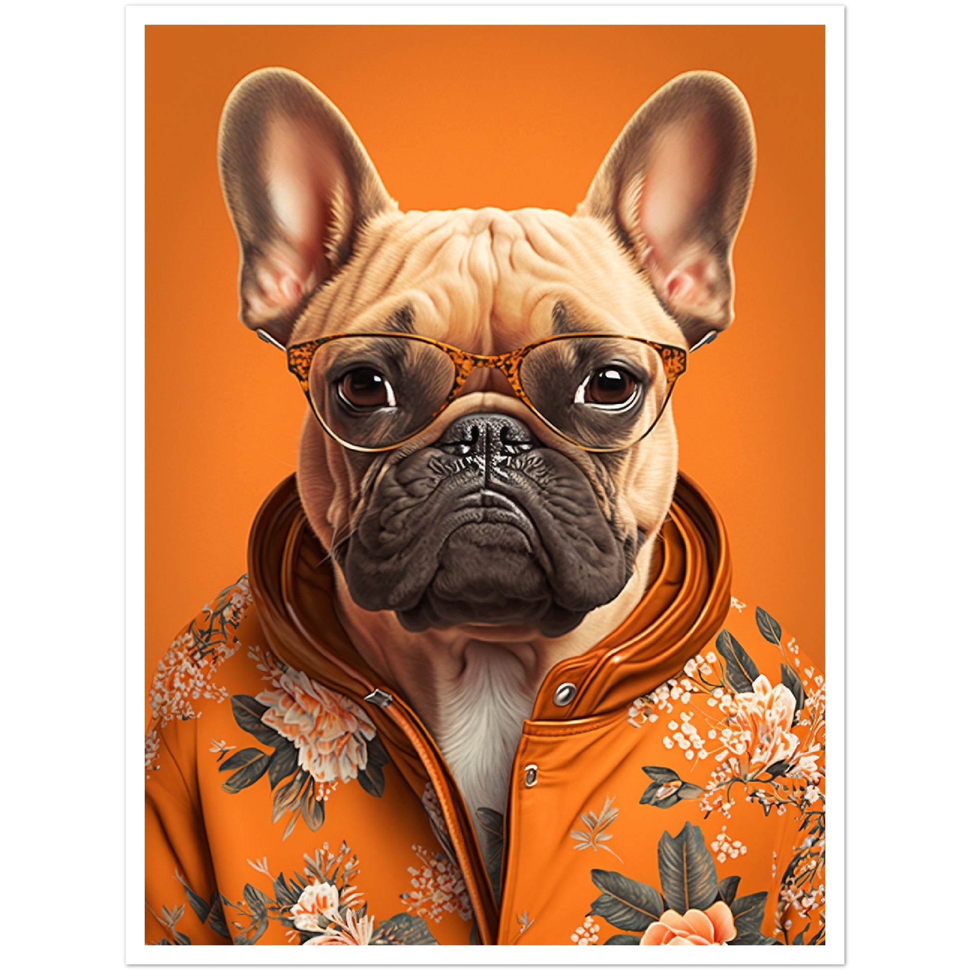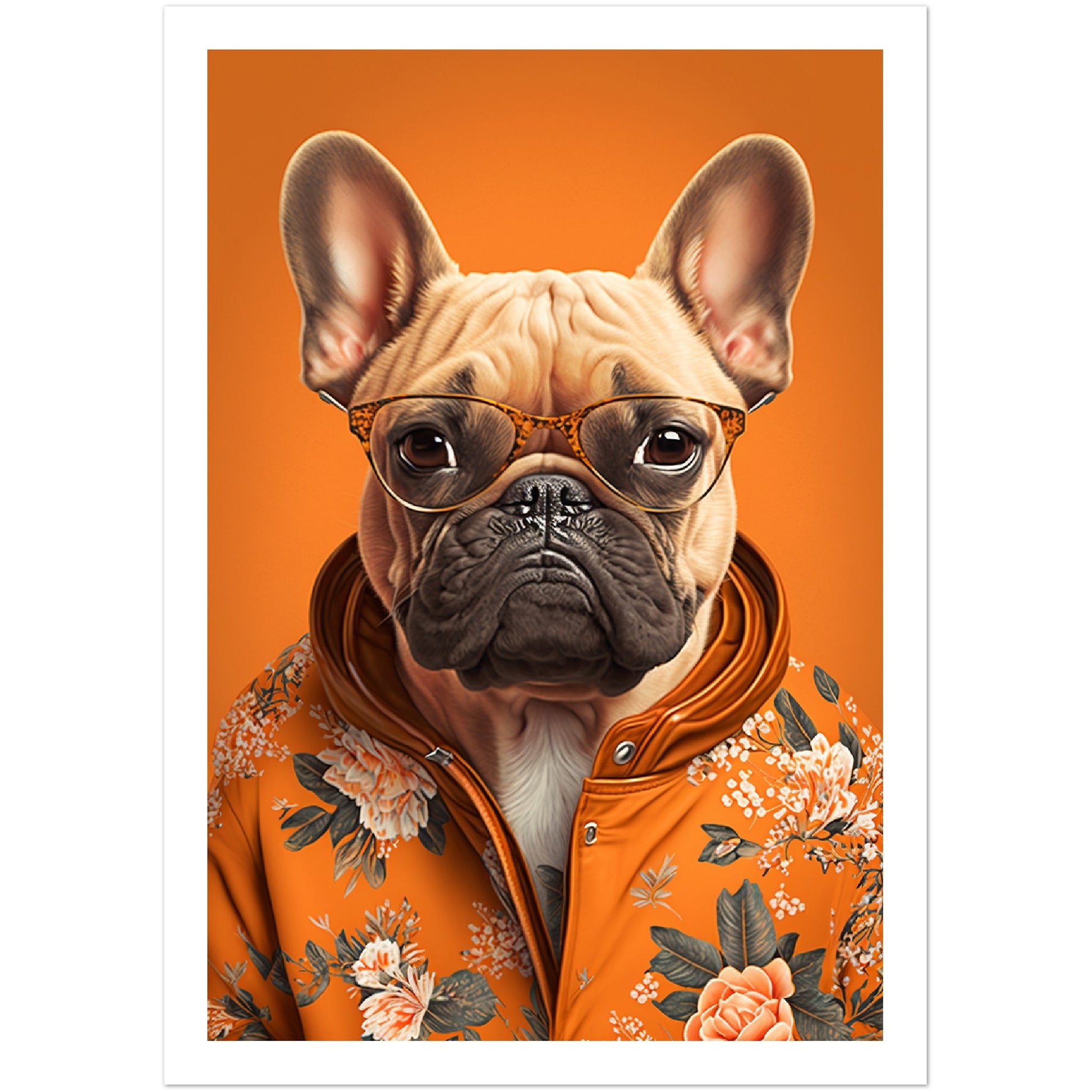 The art illustration features a French Bulldog wearing a stylish floral patterned jacket and quirky fashionable glasses. The vibrant orange background adds a pop of color to the piece, making it a perfect addition to any room. The attention to detail in the intricate floral pattern and the dog's expression make this artwork a unique and charming piece.