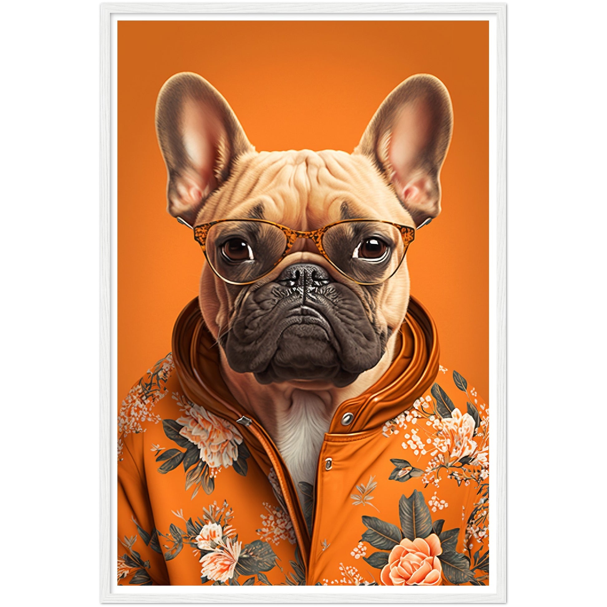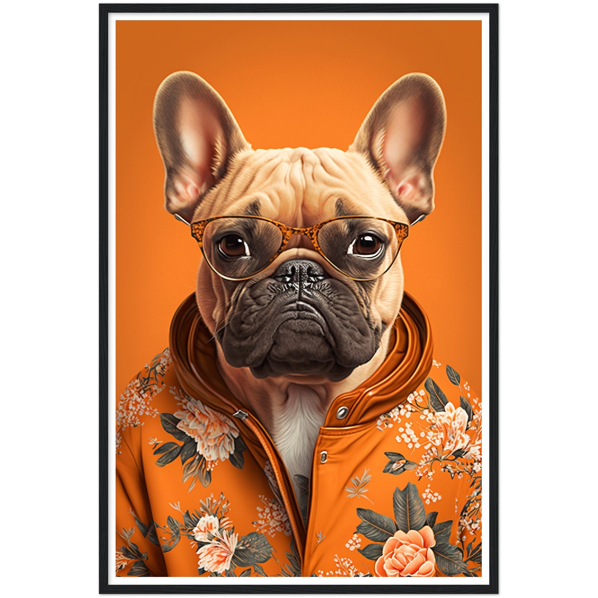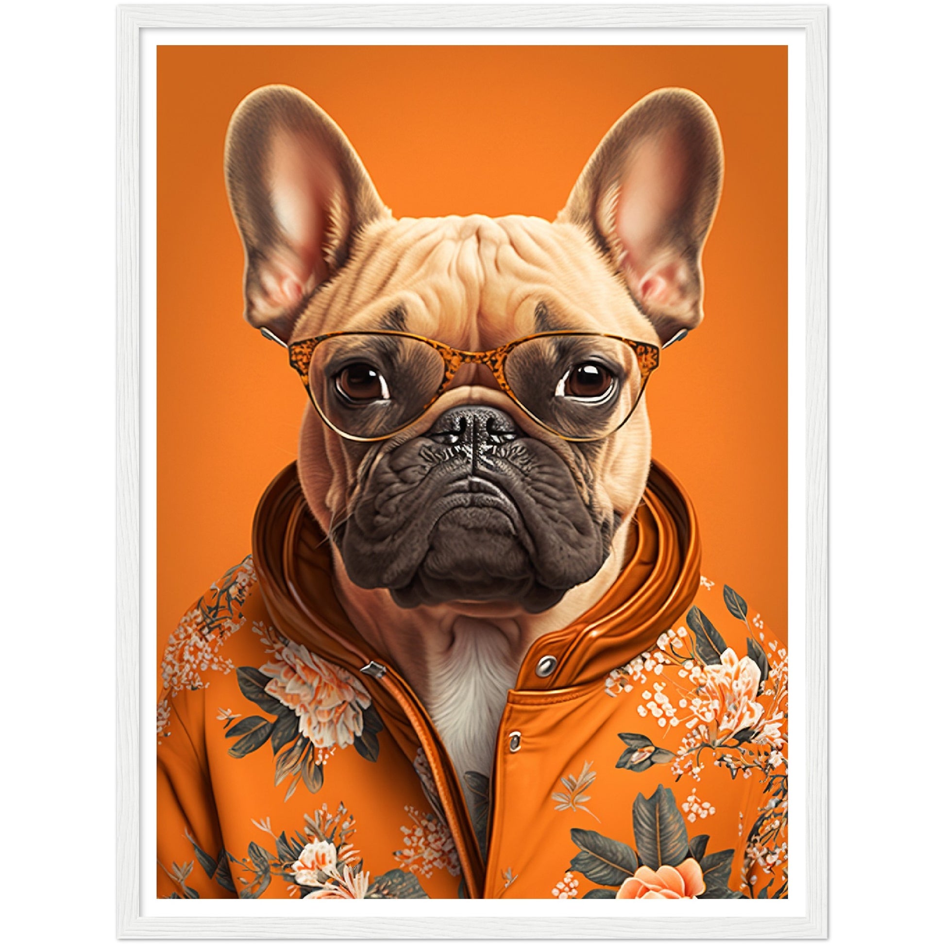 The art illustration features a French Bulldog wearing a stylish floral patterned jacket and quirky fashionable glasses. The vibrant orange background adds a pop of color to the piece, making it a perfect addition to any room. The attention to detail in the intricate floral pattern and the dog's expression make this artwork a unique and charming piece.