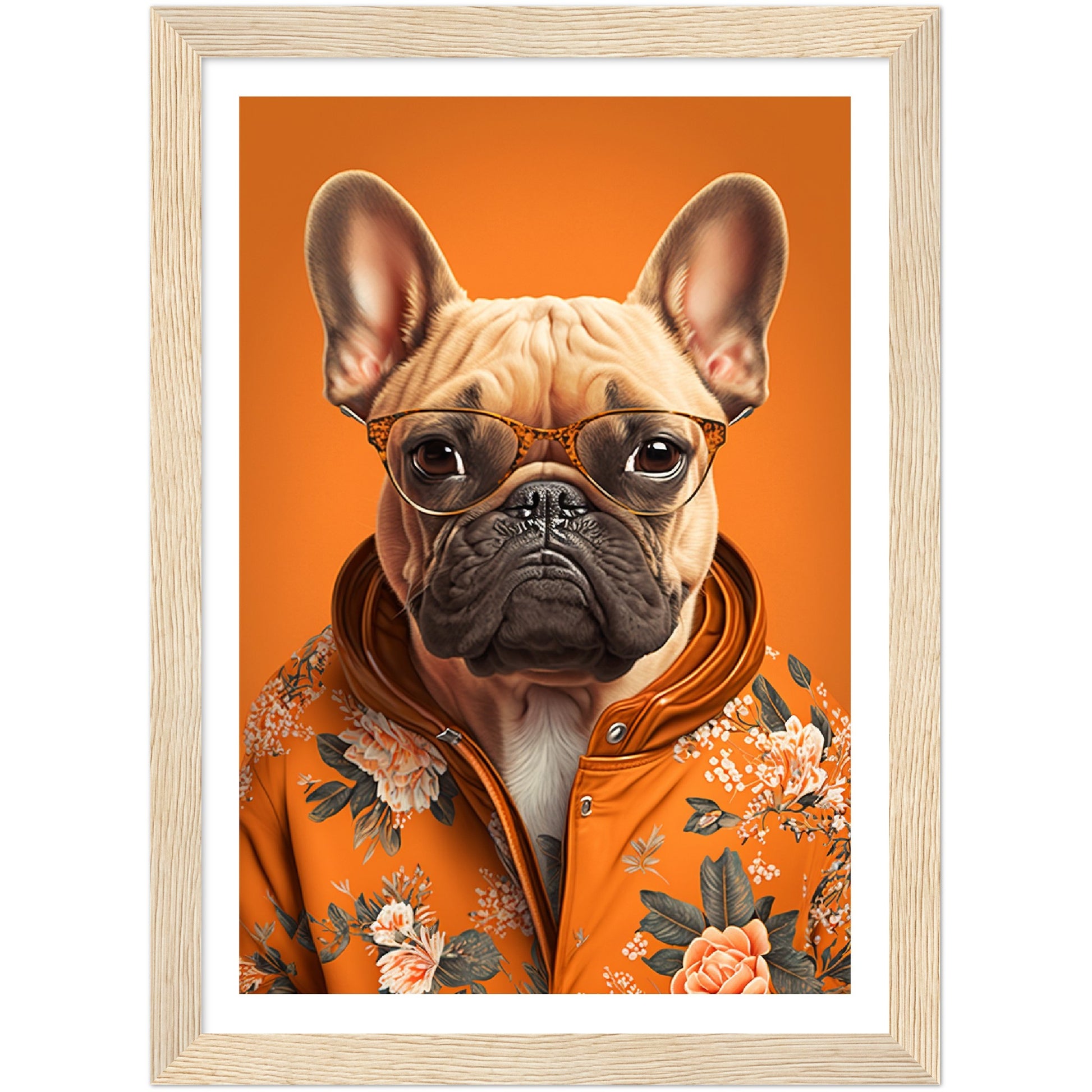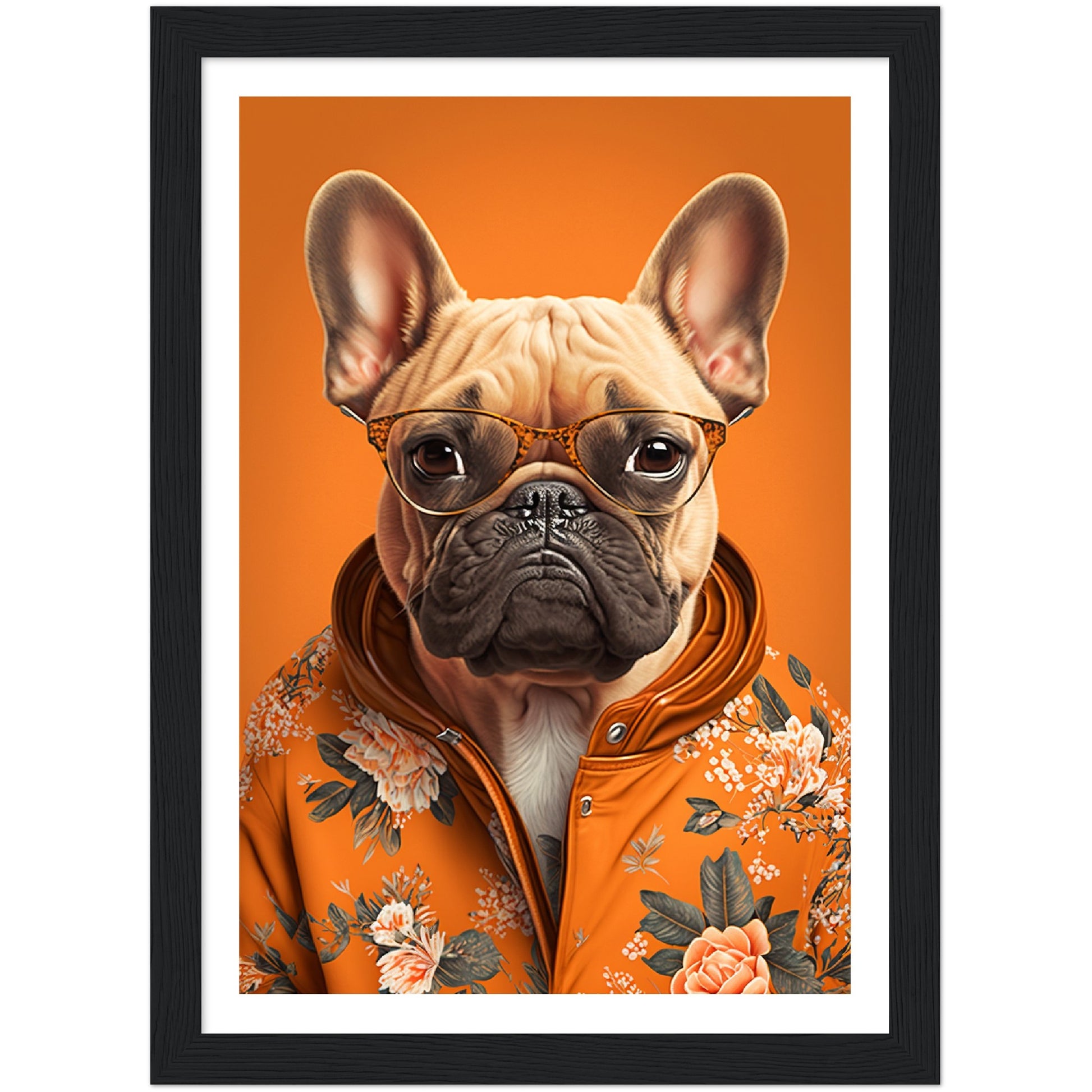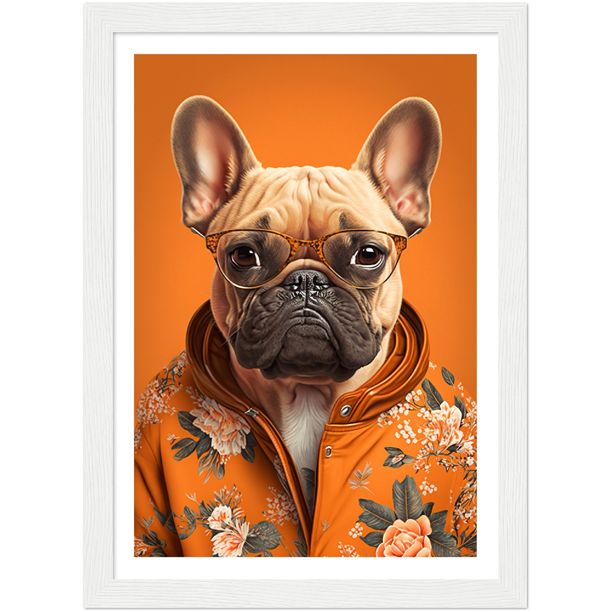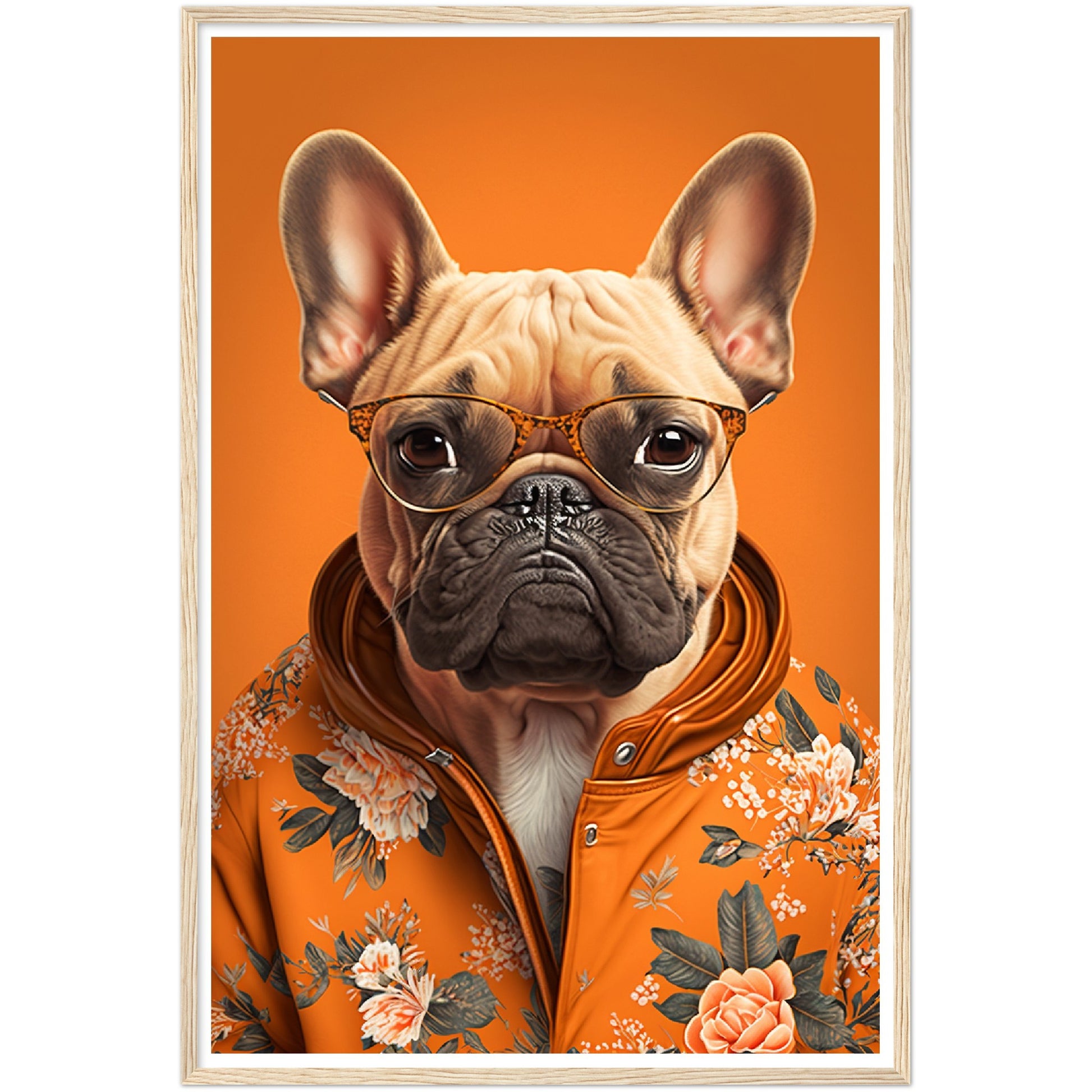 The art illustration features a French Bulldog wearing a stylish floral patterned jacket and quirky fashionable glasses. The vibrant orange background adds a pop of color to the piece, making it a perfect addition to any room. The attention to detail in the intricate floral pattern and the dog's expression make this artwork a unique and charming piece.