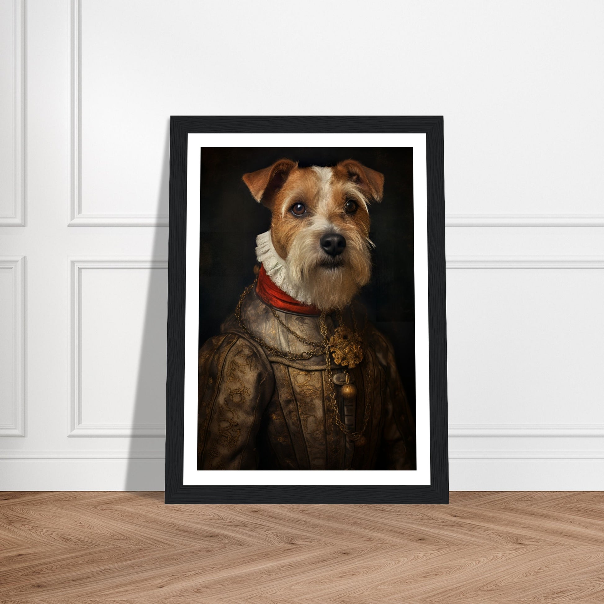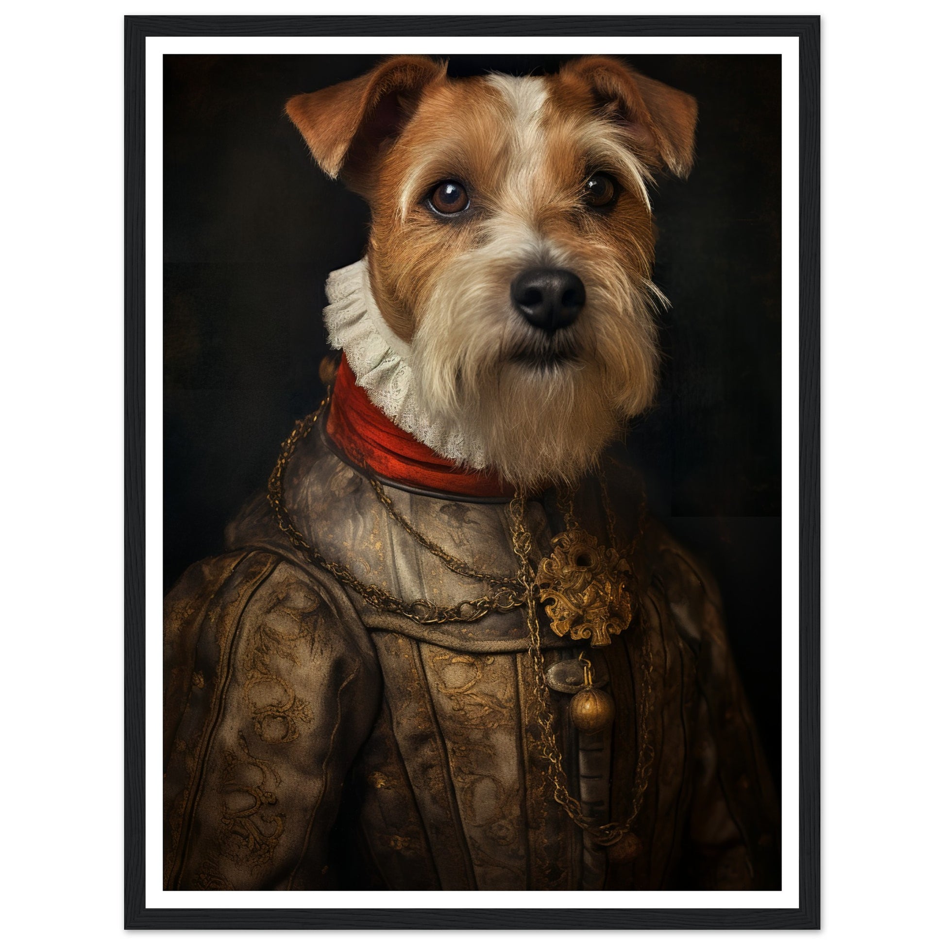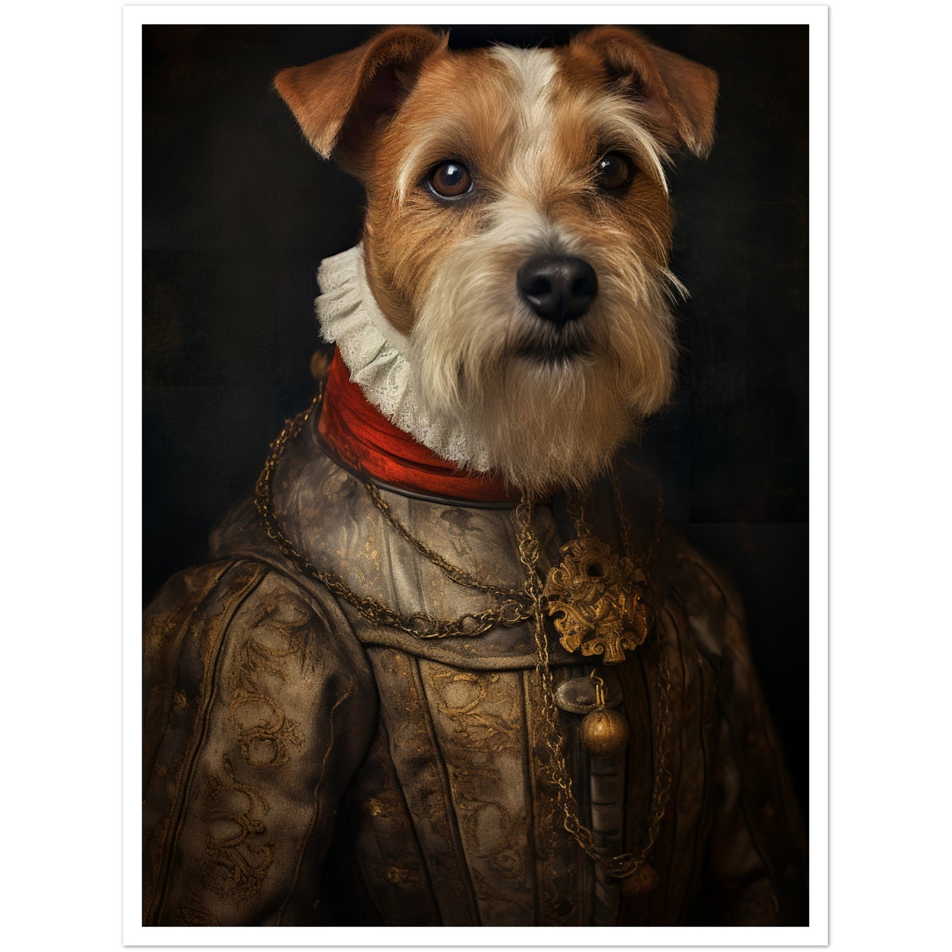Step back in time to the illustrious Tudor era with our captivating "Tudor-Era Dog Portrait." This exquisite masterpiece encapsulates the grandeur of the 16th century, featuring a noble dog adorned in a Tudor neck ruff and a regal royal outfit.