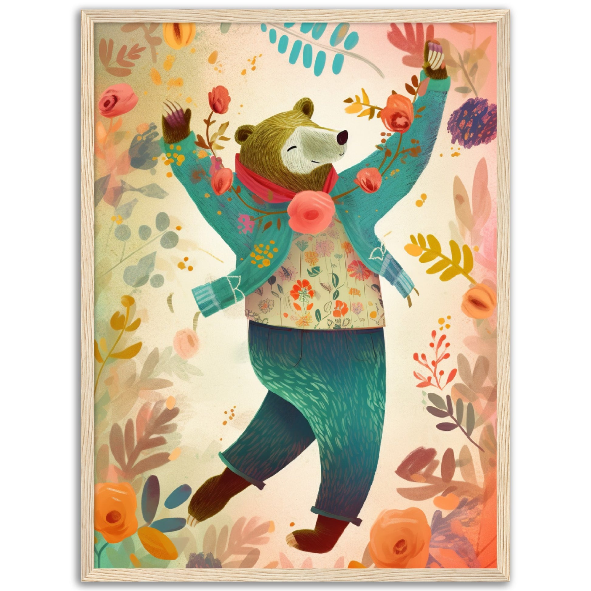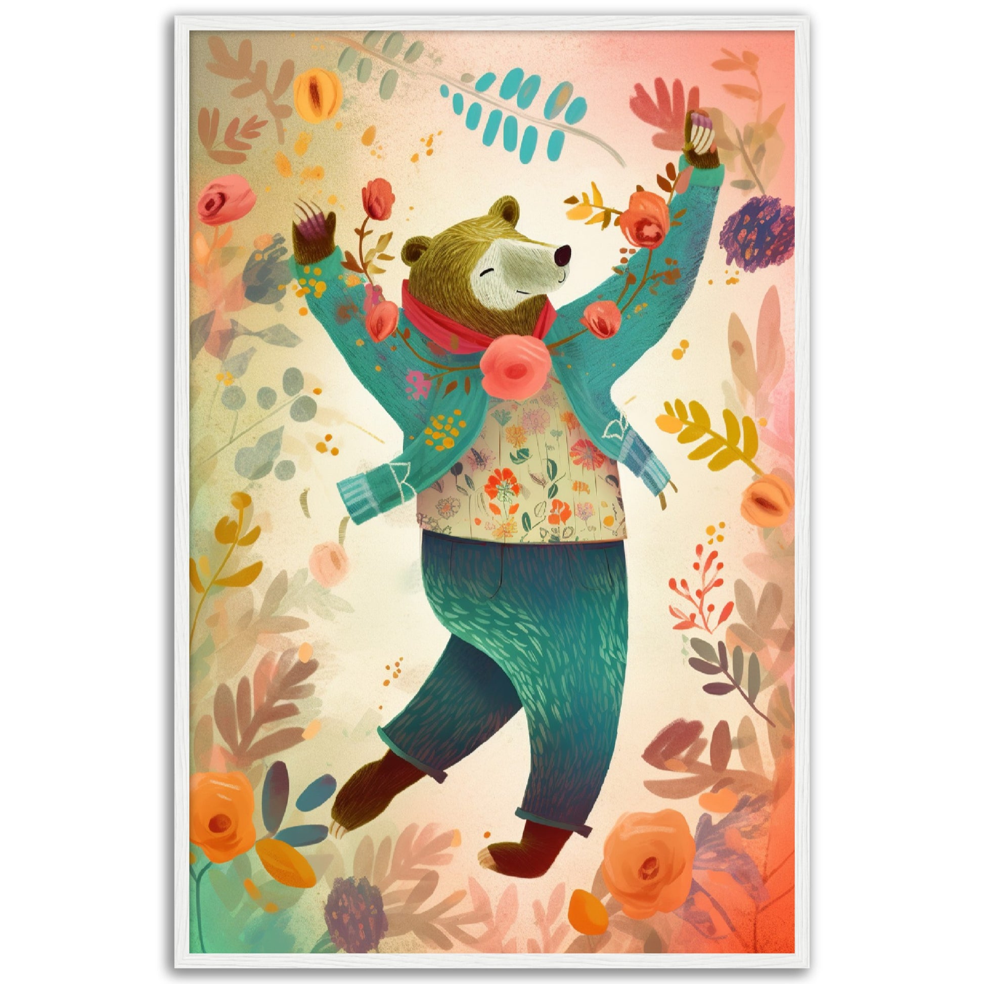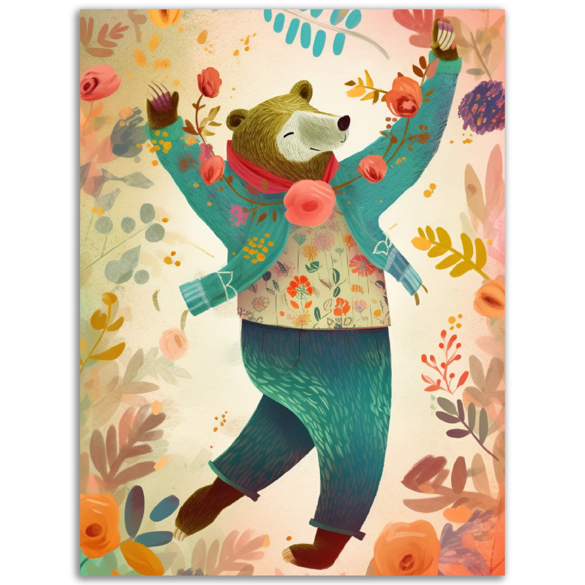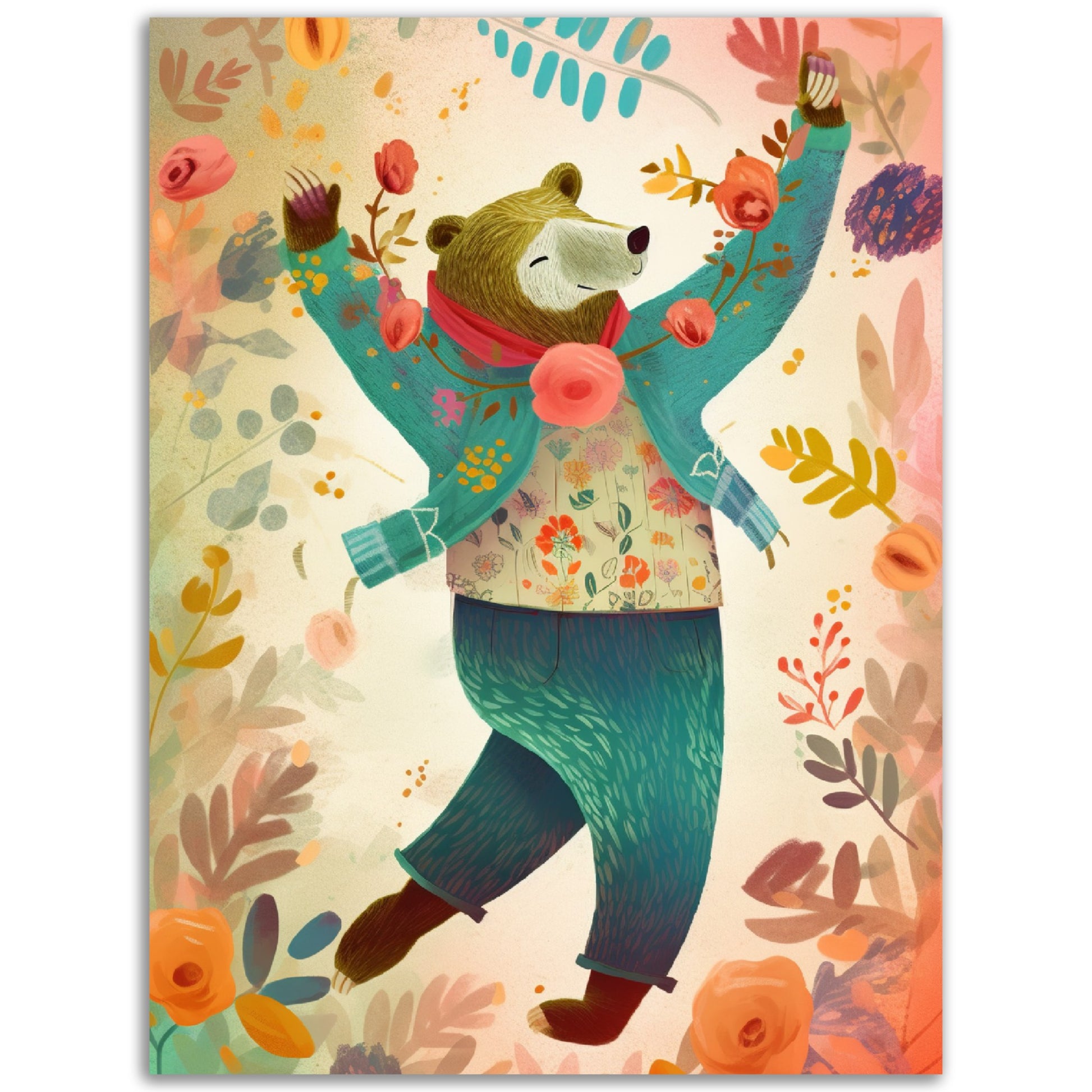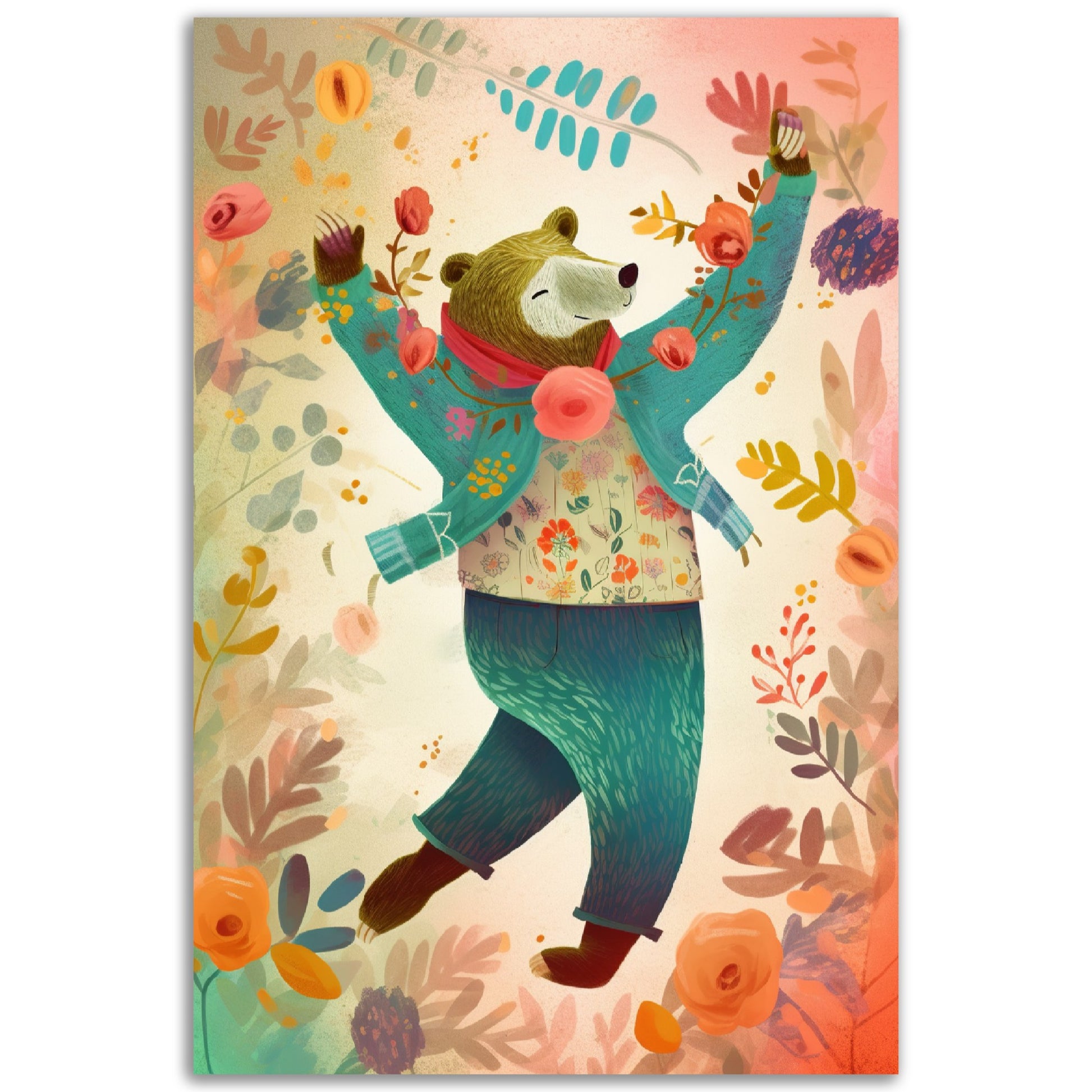 This stunning art piece captures the essence of pure joy and celebration. A whimsical bear dances amidst a vibrant garden of flowers, exuding a sense of playful energy and carefree abandon. The pastel textures and dreamlike quality of the illustration create a fantastical atmosphere, transporting the viewer to a world of pure imagination. The bear's celebratory pose and infectious smile are sure to bring a smile to anyone's face, making this piece the perfect addition to any space in need of a little extra happiness. Whether displayed in a child's bedroom or a living room, this joyful illustration is sure to brighten up any room and bring a sense of wonder and delight to all who see it.