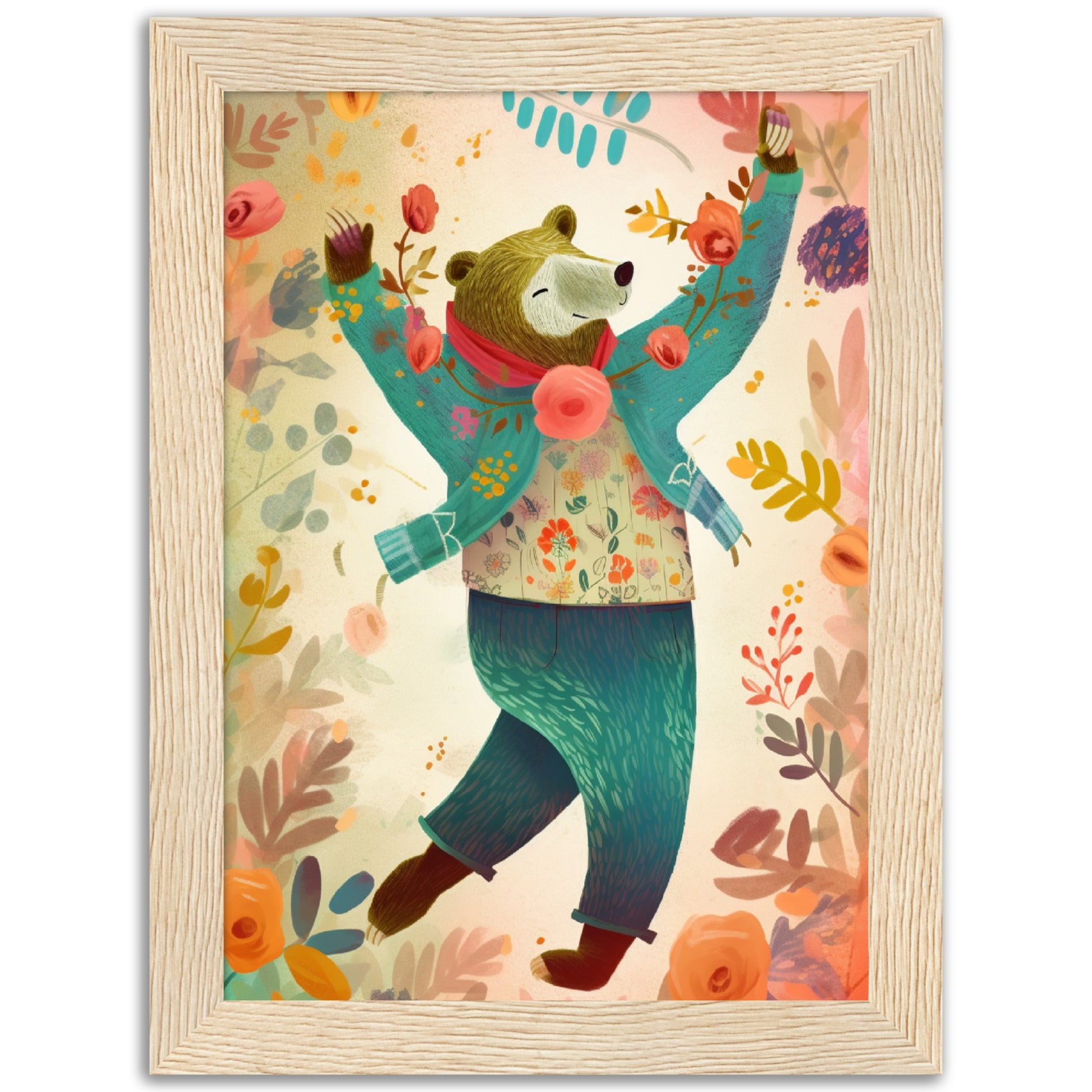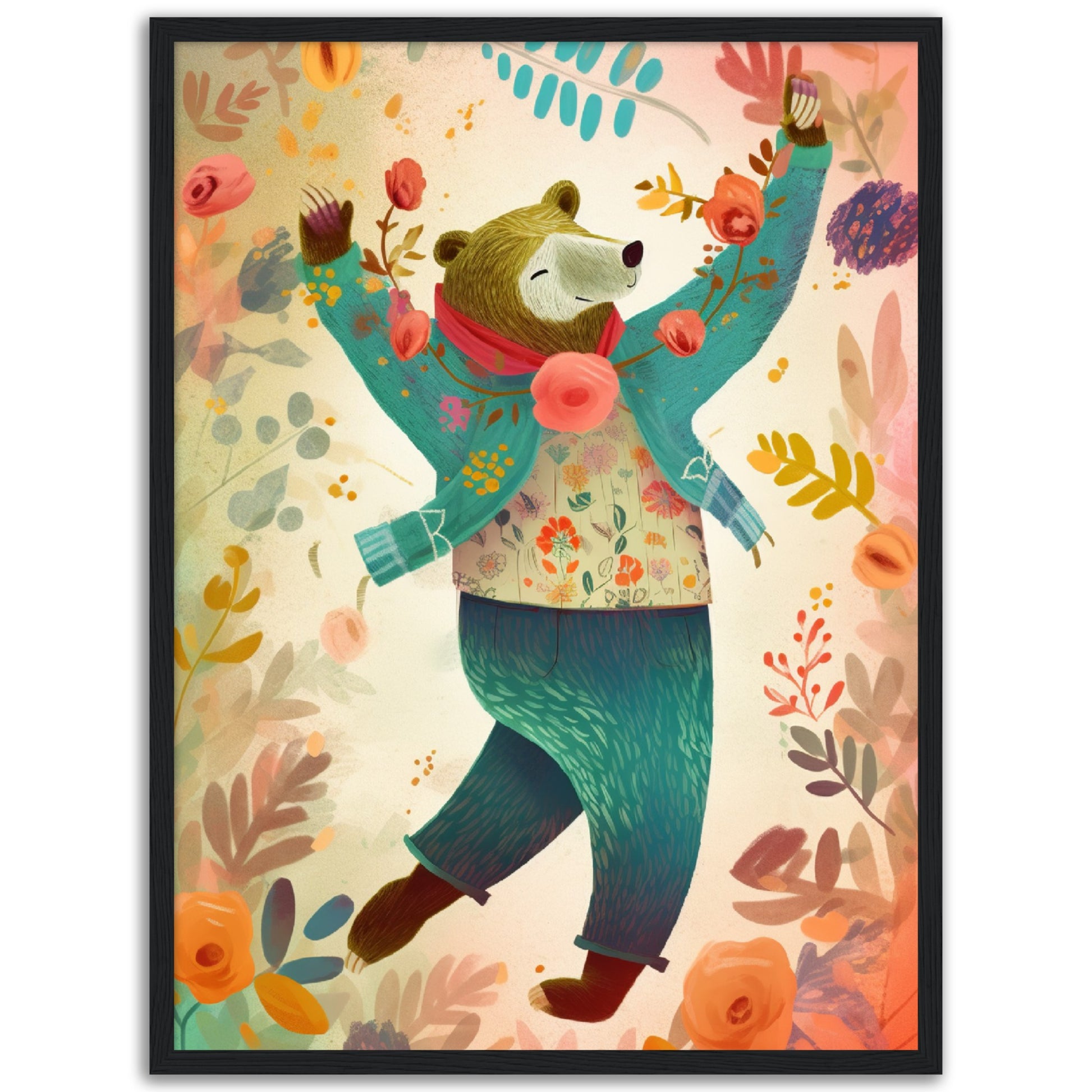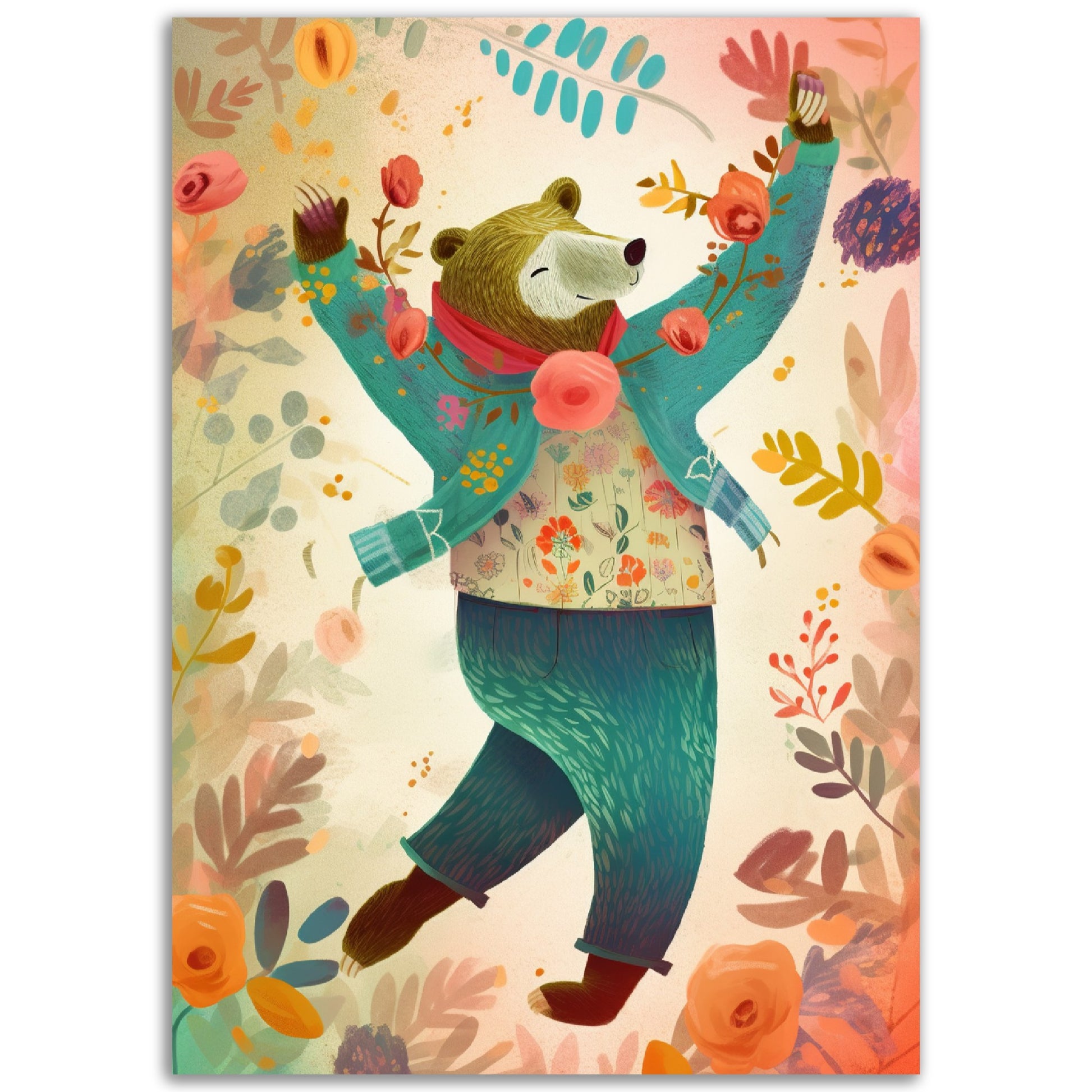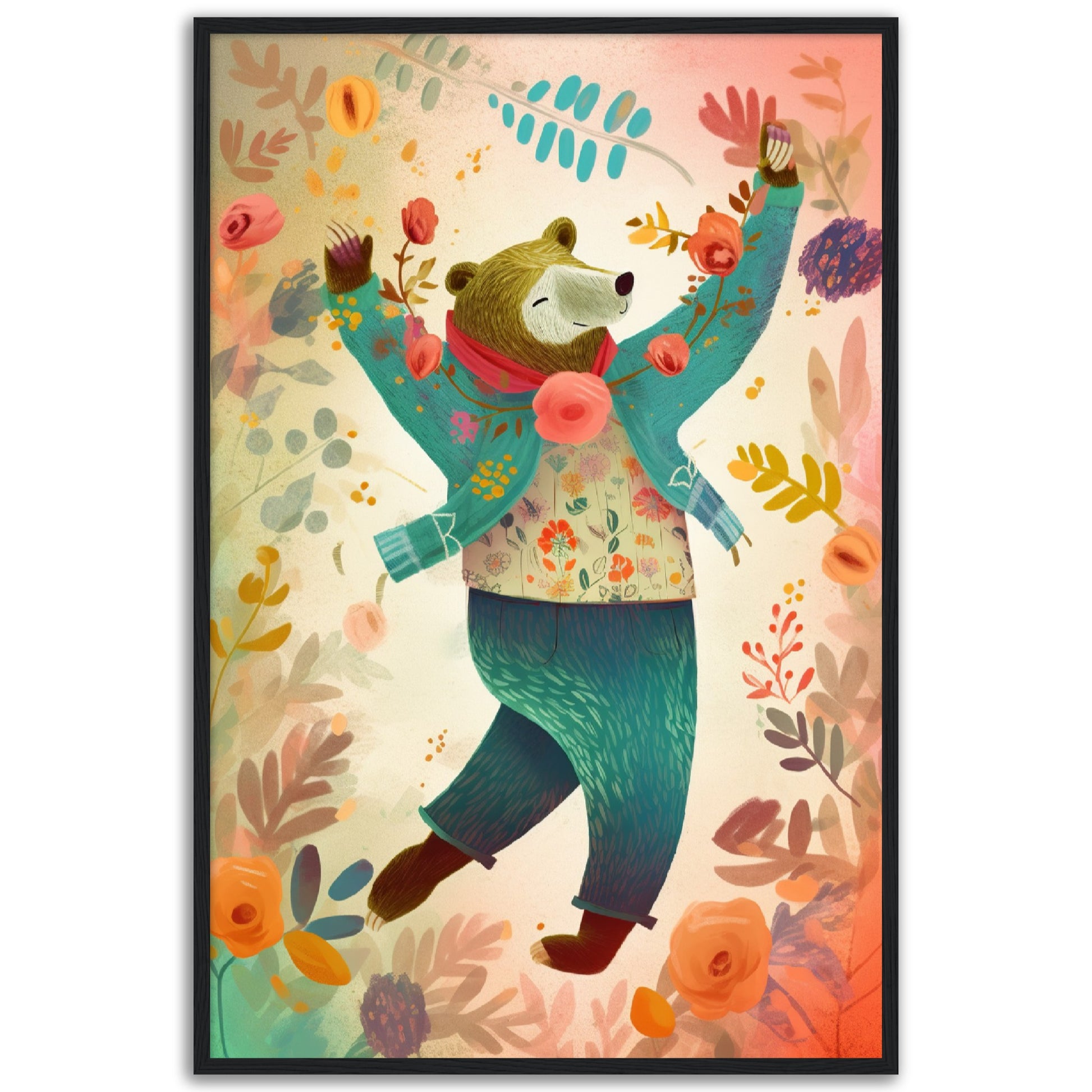 This stunning art piece captures the essence of pure joy and celebration. A whimsical bear dances amidst a vibrant garden of flowers, exuding a sense of playful energy and carefree abandon. The pastel textures and dreamlike quality of the illustration create a fantastical atmosphere, transporting the viewer to a world of pure imagination. The bear's celebratory pose and infectious smile are sure to bring a smile to anyone's face, making this piece the perfect addition to any space in need of a little extra happiness. Whether displayed in a child's bedroom or a living room, this joyful illustration is sure to brighten up any room and bring a sense of wonder and delight to all who see it.