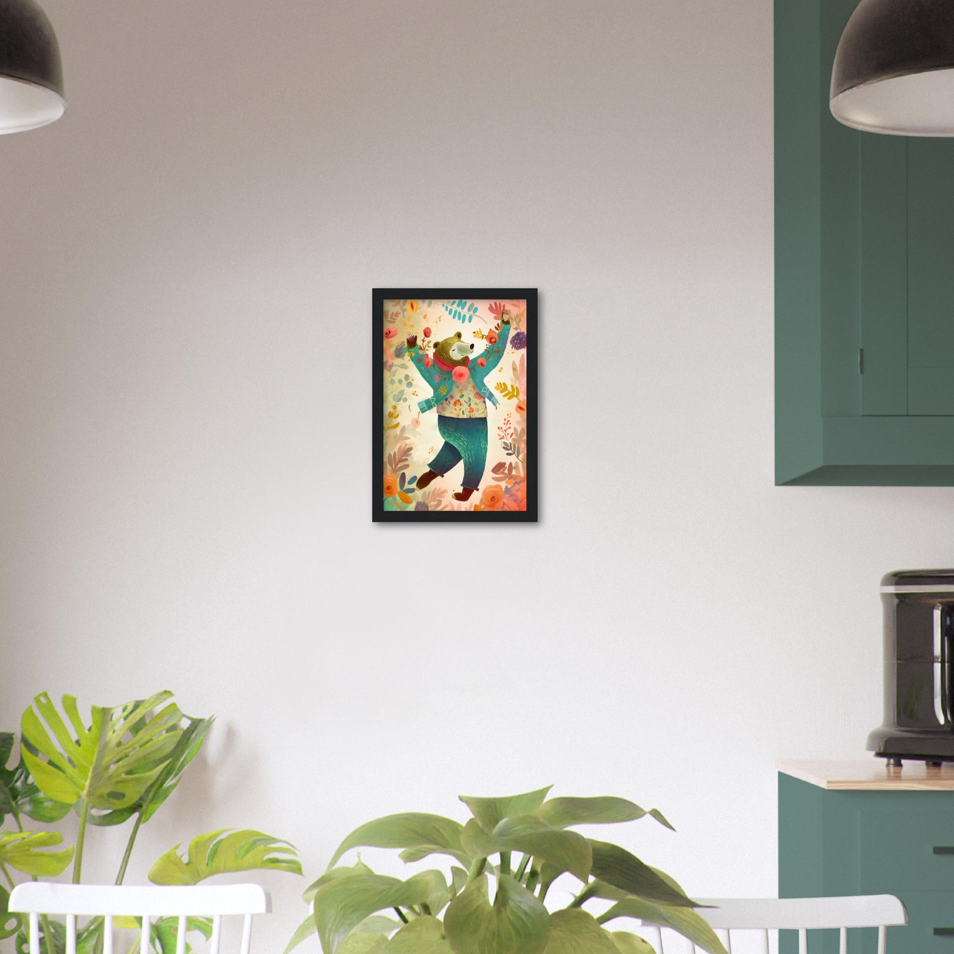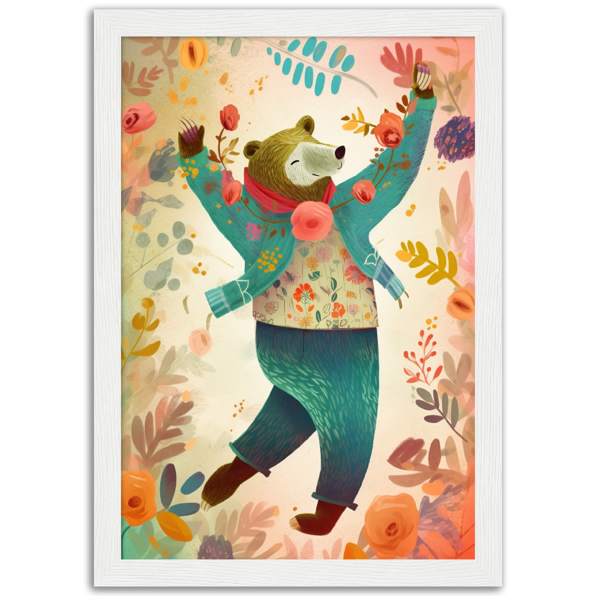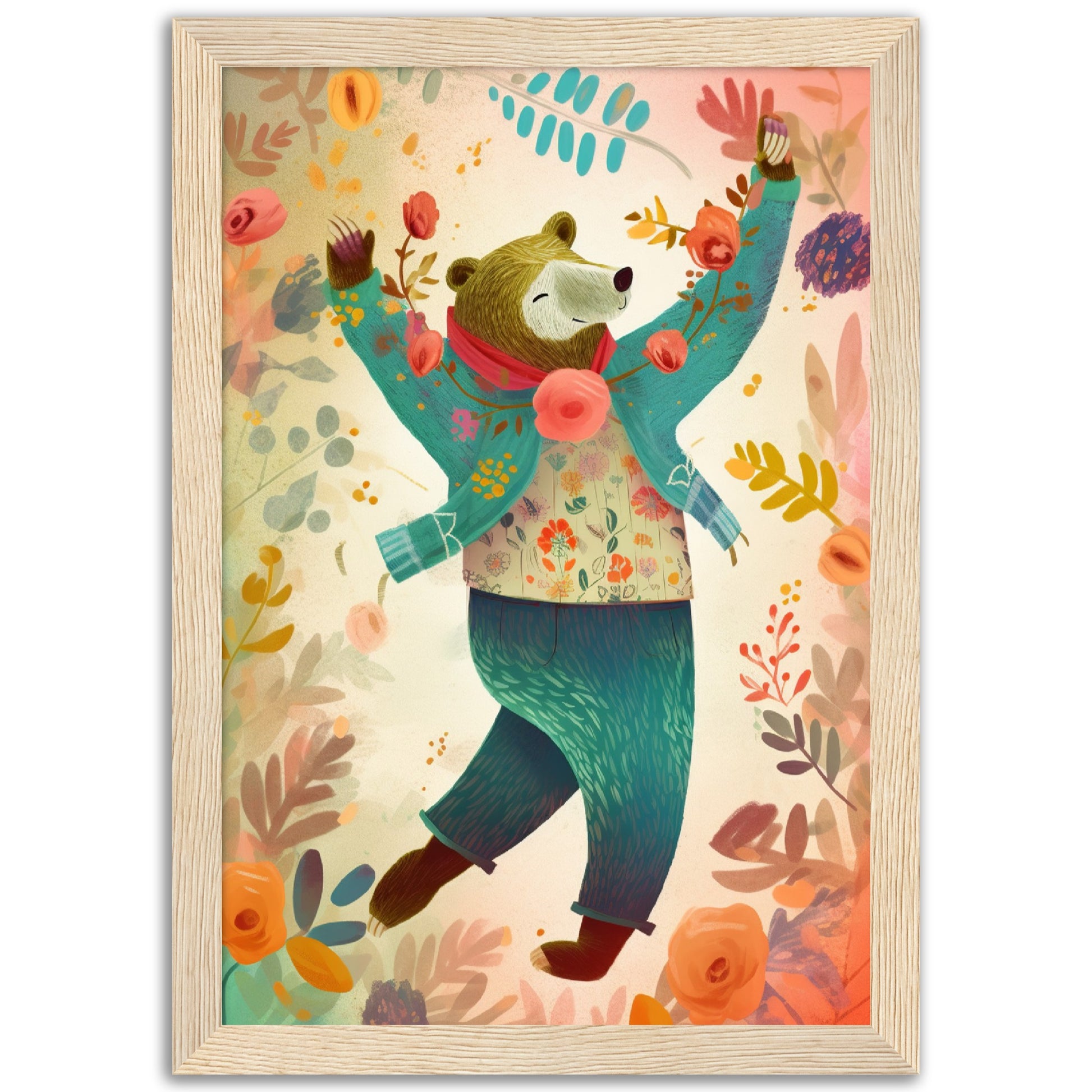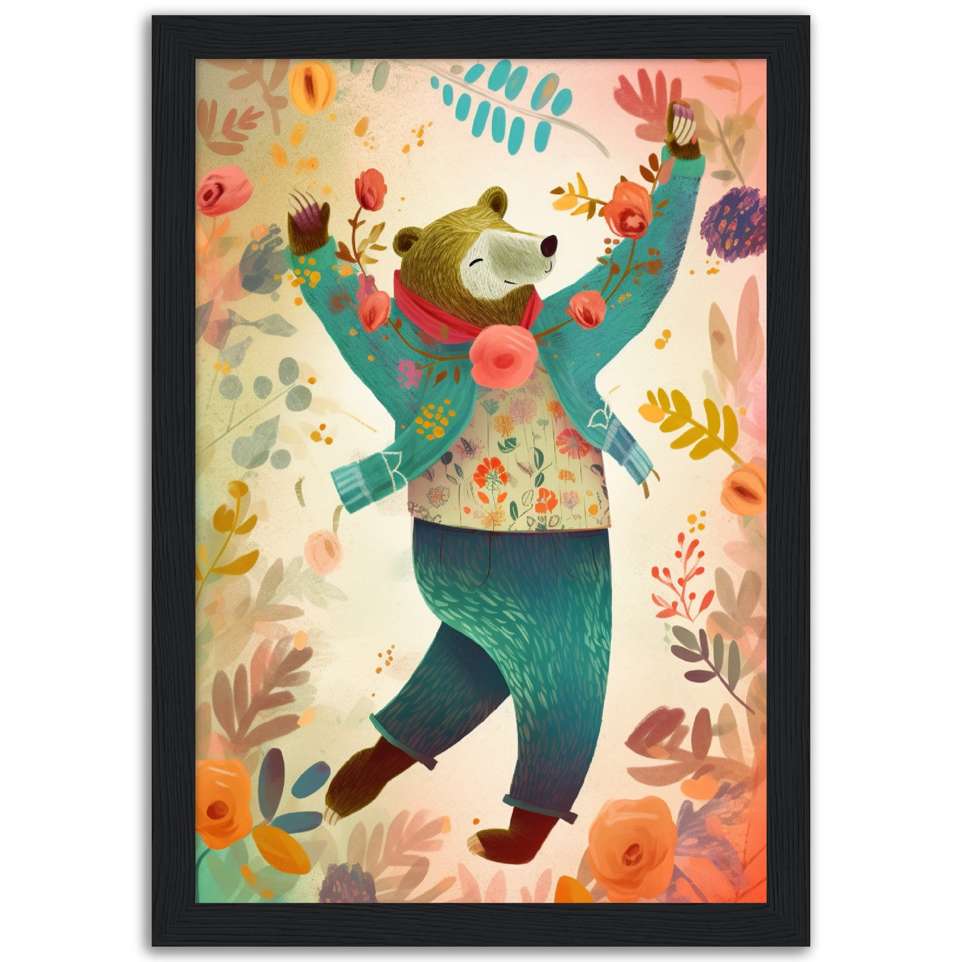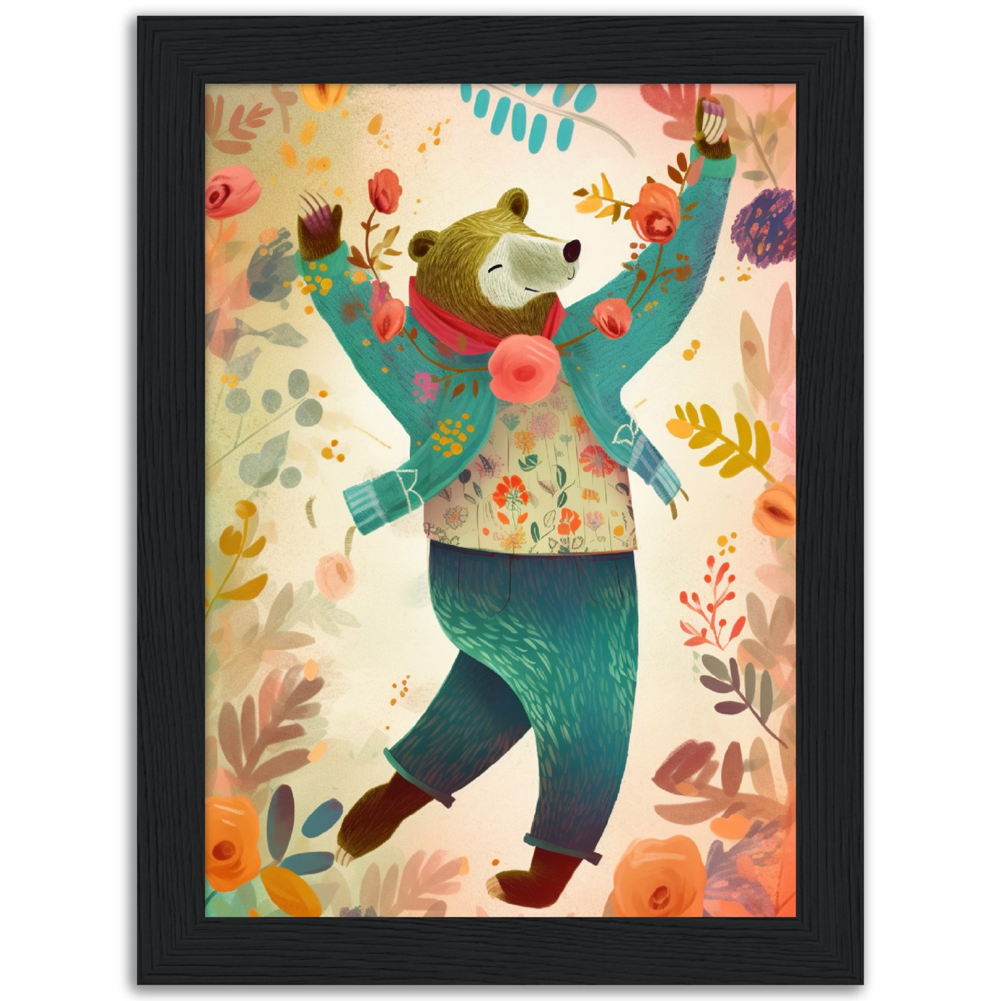 This stunning art piece captures the essence of pure joy and celebration. A whimsical bear dances amidst a vibrant garden of flowers, exuding a sense of playful energy and carefree abandon. The pastel textures and dreamlike quality of the illustration create a fantastical atmosphere, transporting the viewer to a world of pure imagination. The bear's celebratory pose and infectious smile are sure to bring a smile to anyone's face, making this piece the perfect addition to any space in need of a little extra happiness. Whether displayed in a child's bedroom or a living room, this joyful illustration is sure to brighten up any room and bring a sense of wonder and delight to all who see it.