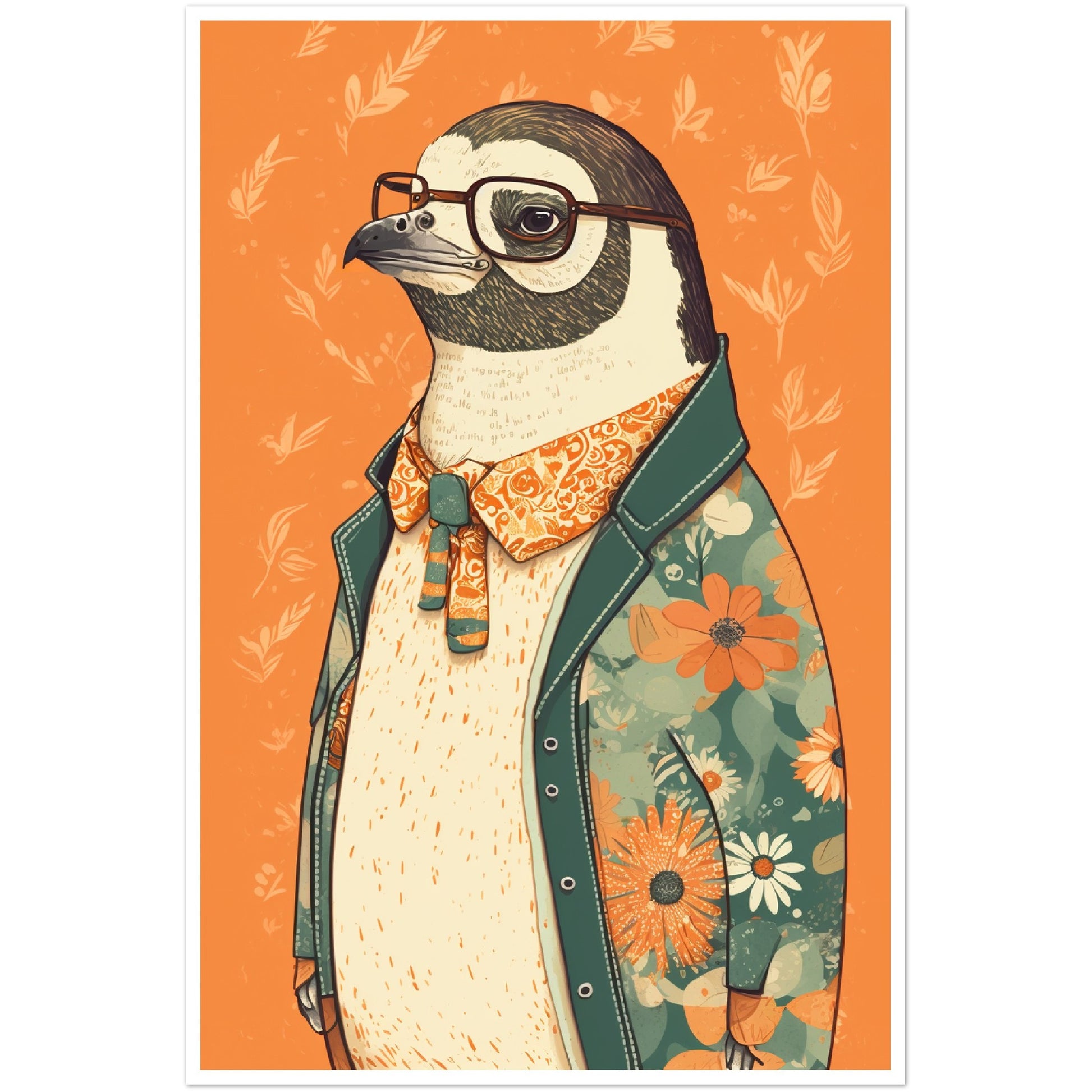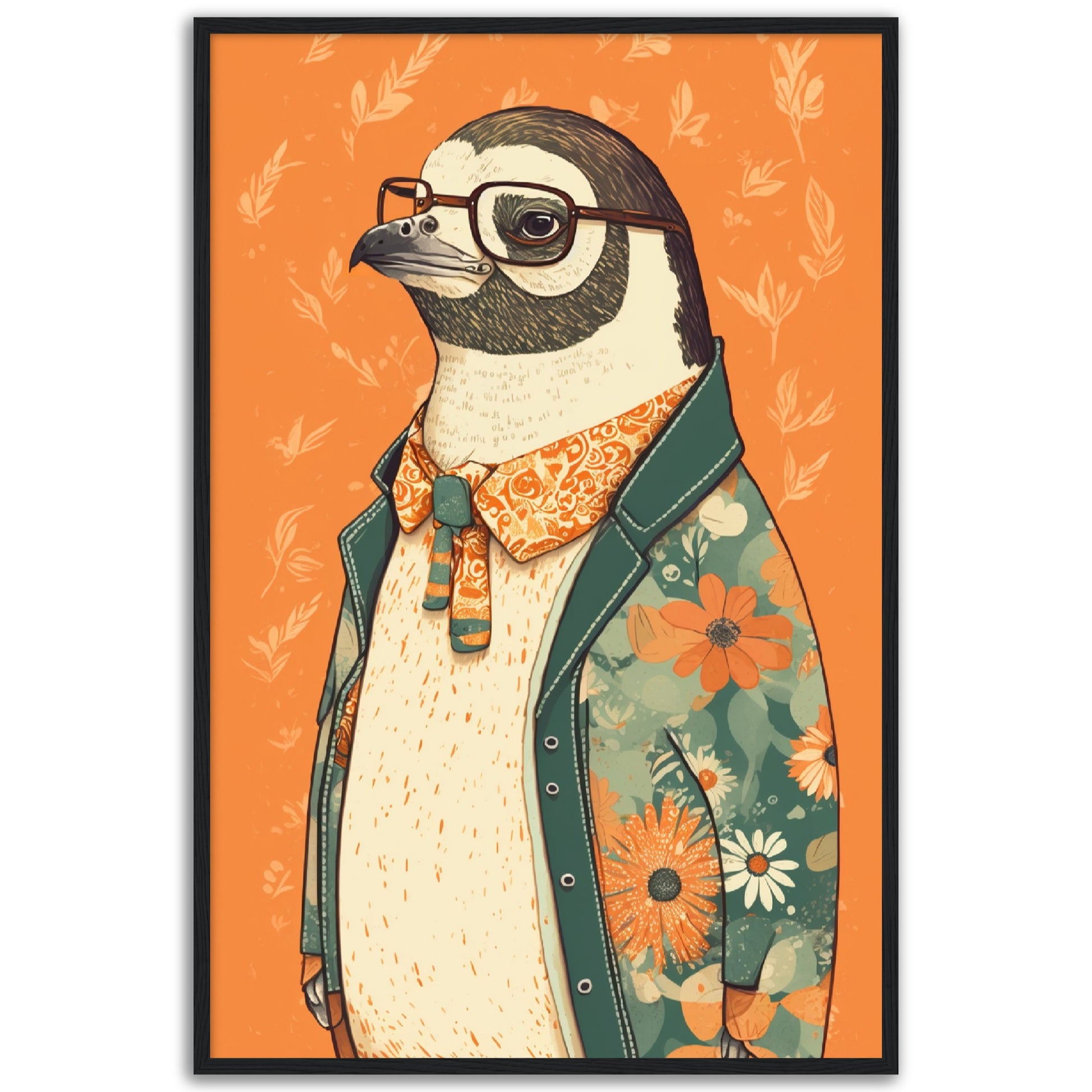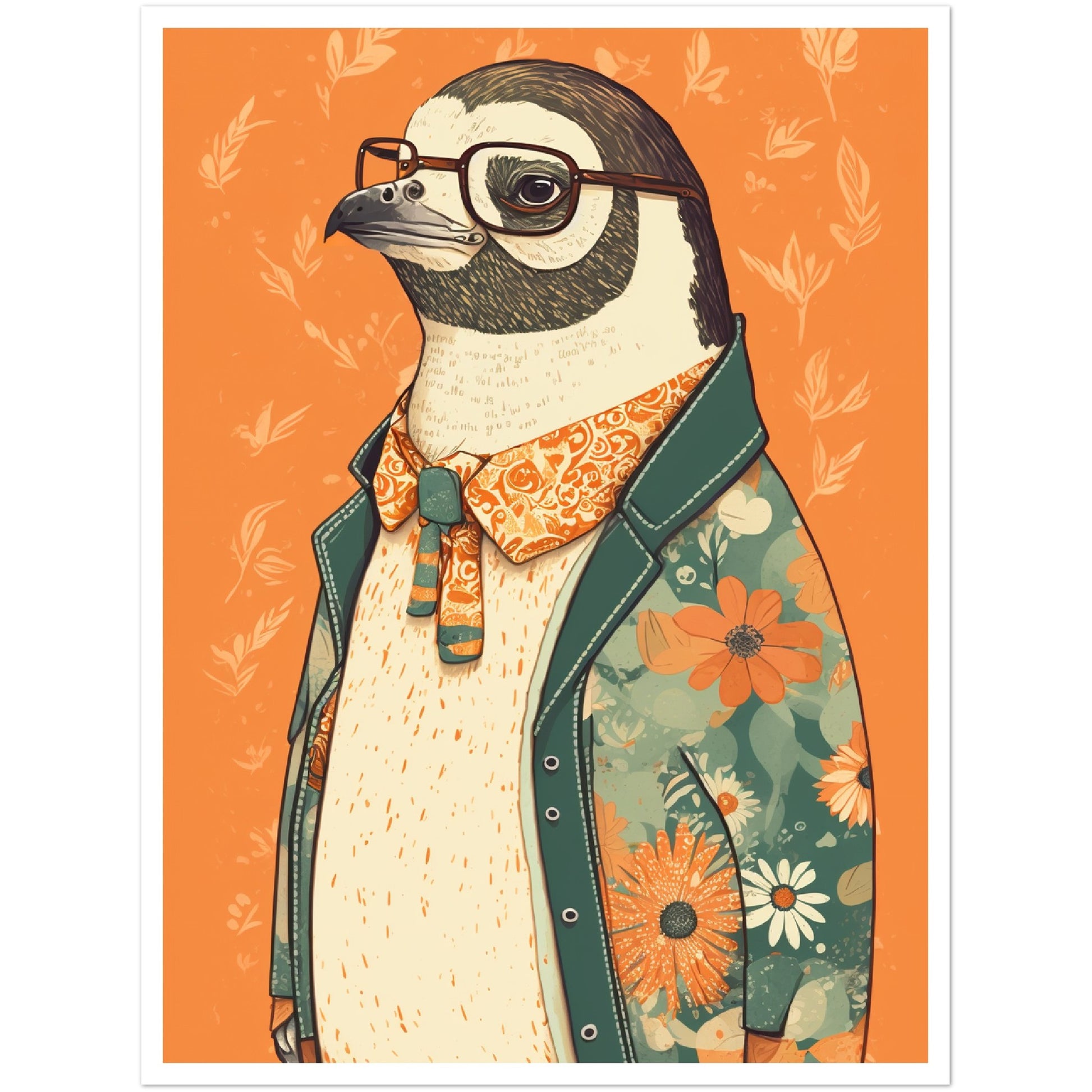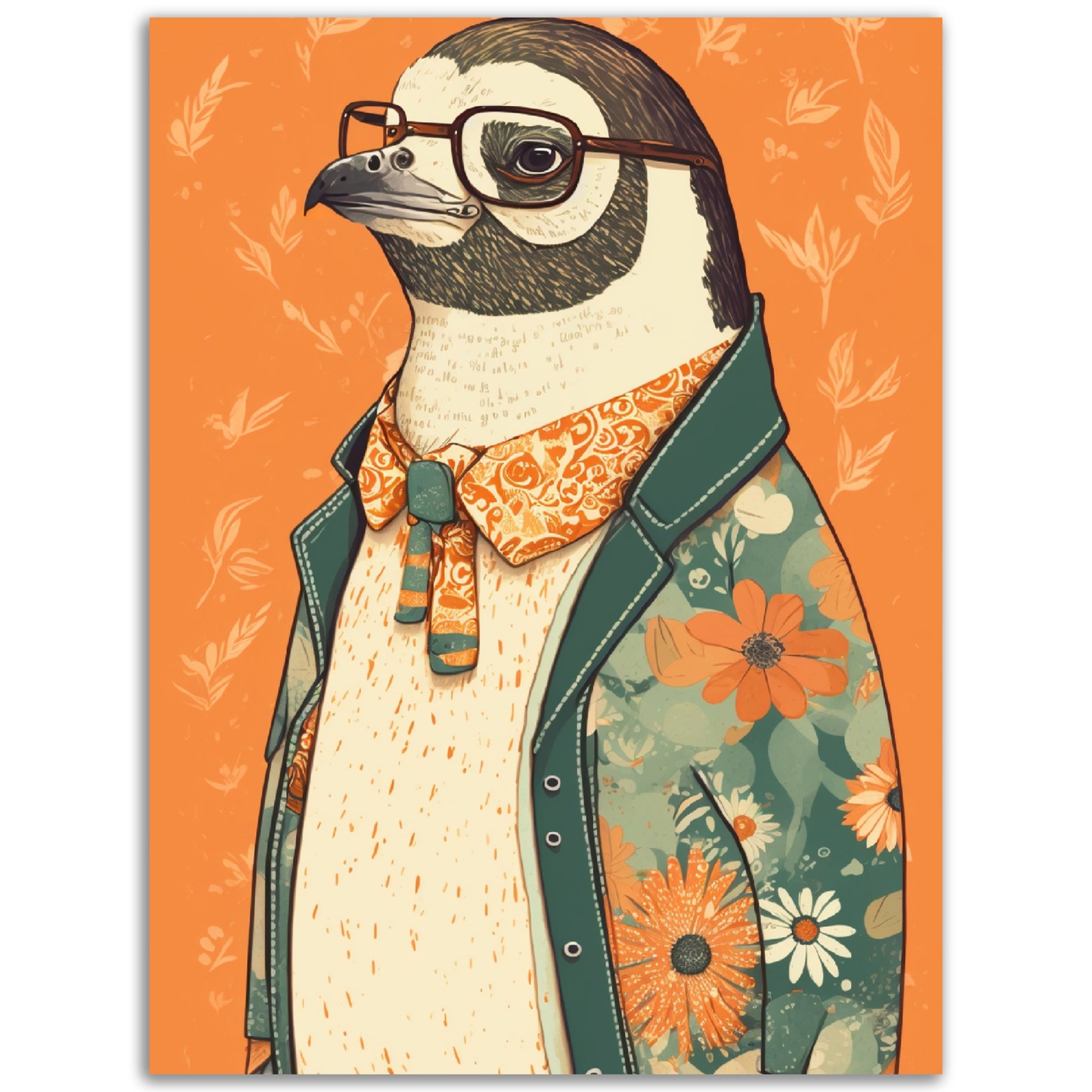 This art illustration features a charming penguin dressed in a floral patterned jacket and quirky fashionable glasses. Against a vibrant orange background, the penguin stands out as a unique and stylish character. The intricate details of the jacket and glasses add depth and texture to the piece, making it a delightful addition to any home or office. This artwork is perfect for those who appreciate whimsical and playful designs.