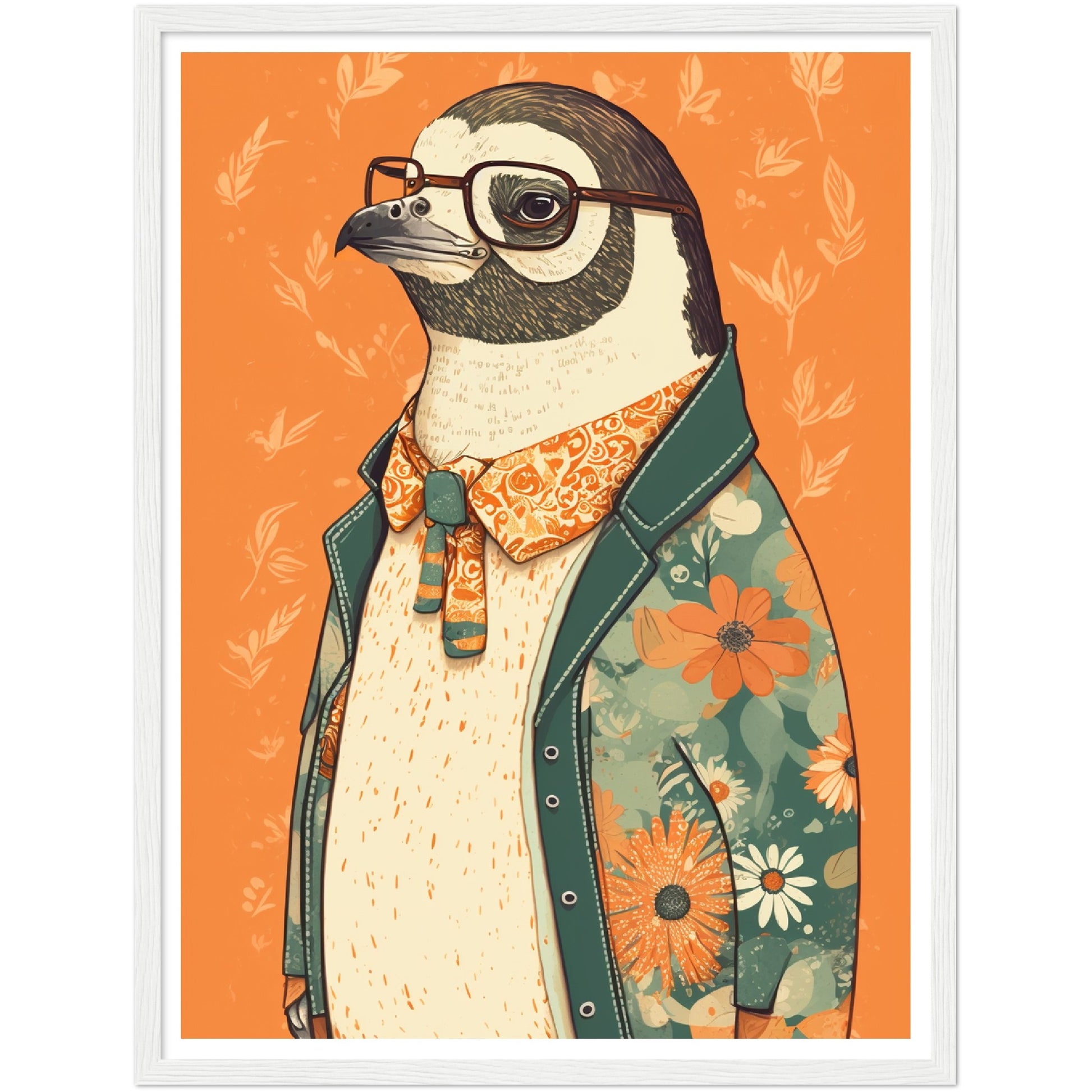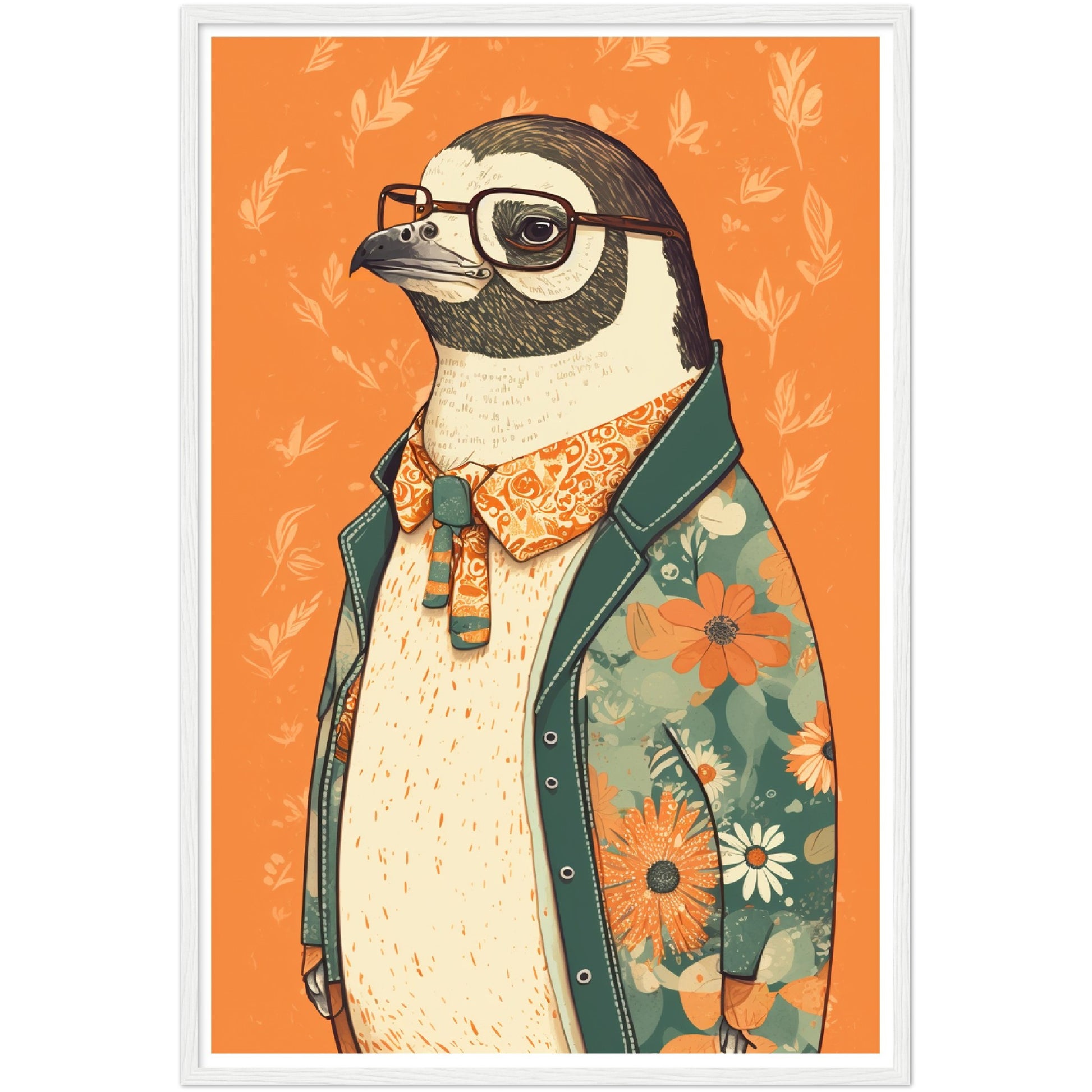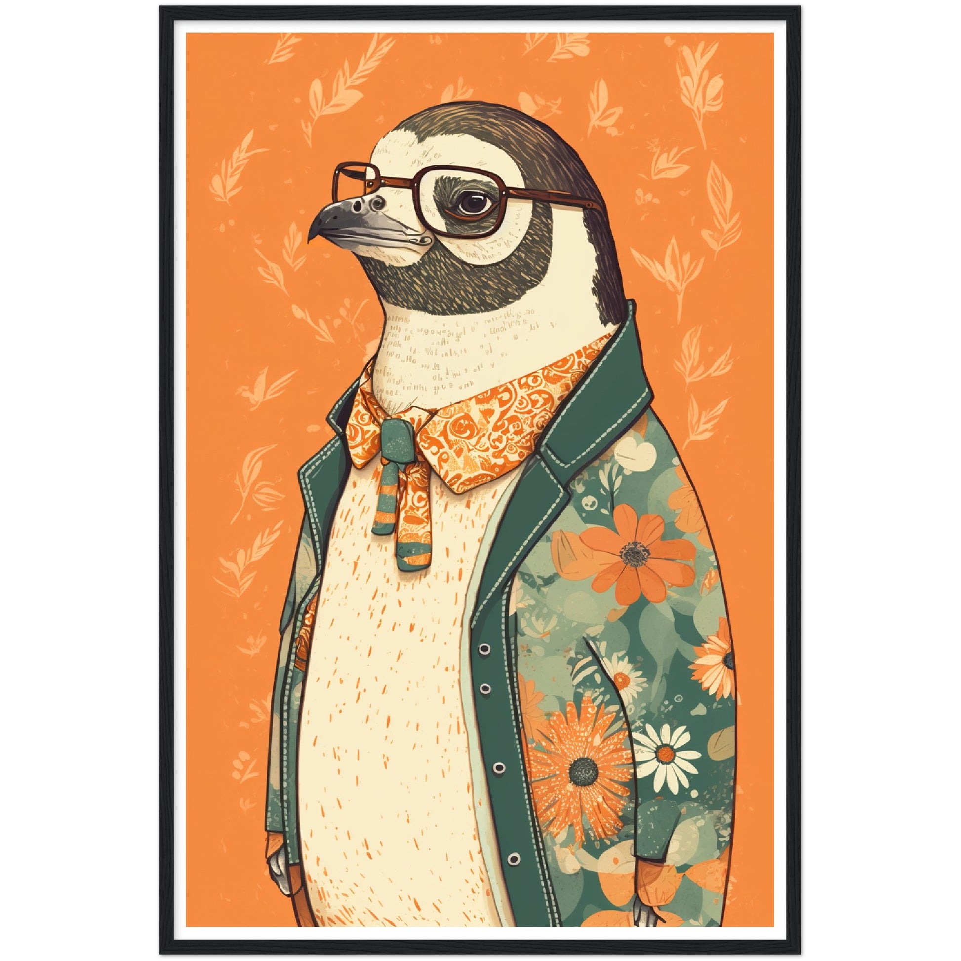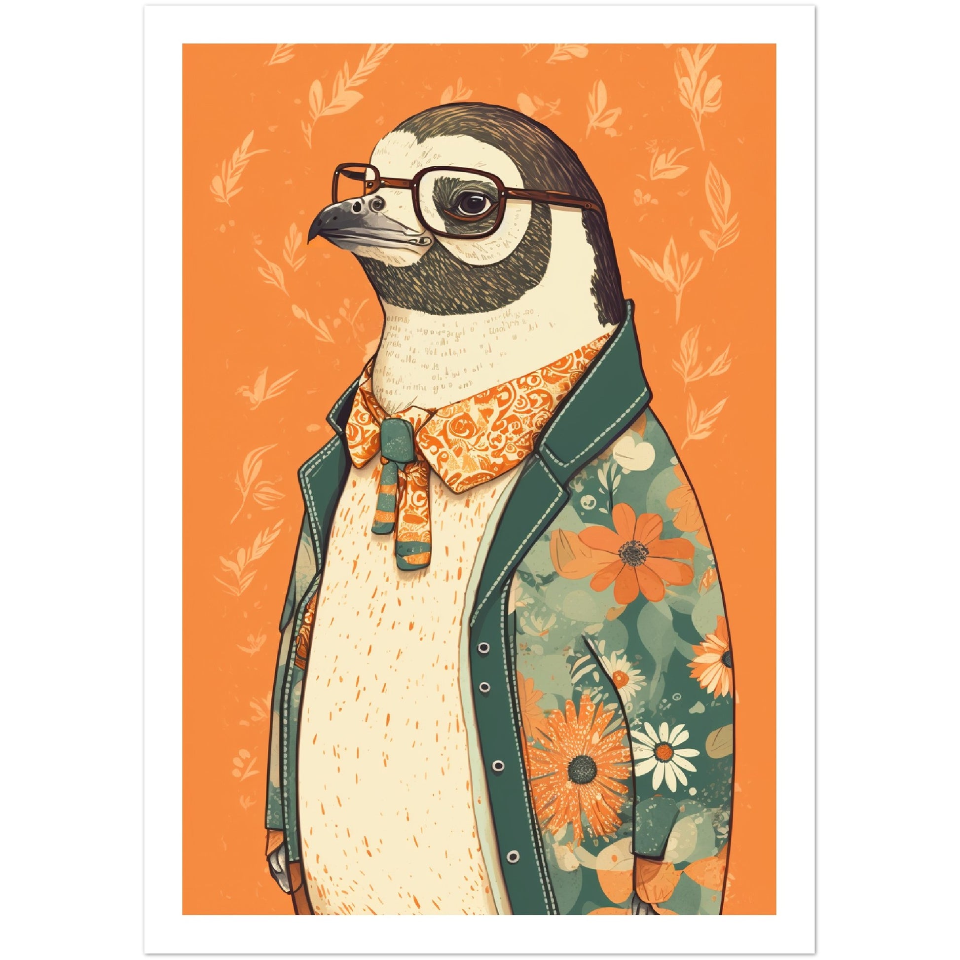 This art illustration features a charming penguin dressed in a floral patterned jacket and quirky fashionable glasses. Against a vibrant orange background, the penguin stands out as a unique and stylish character. The intricate details of the jacket and glasses add depth and texture to the piece, making it a delightful addition to any home or office. This artwork is perfect for those who appreciate whimsical and playful designs.