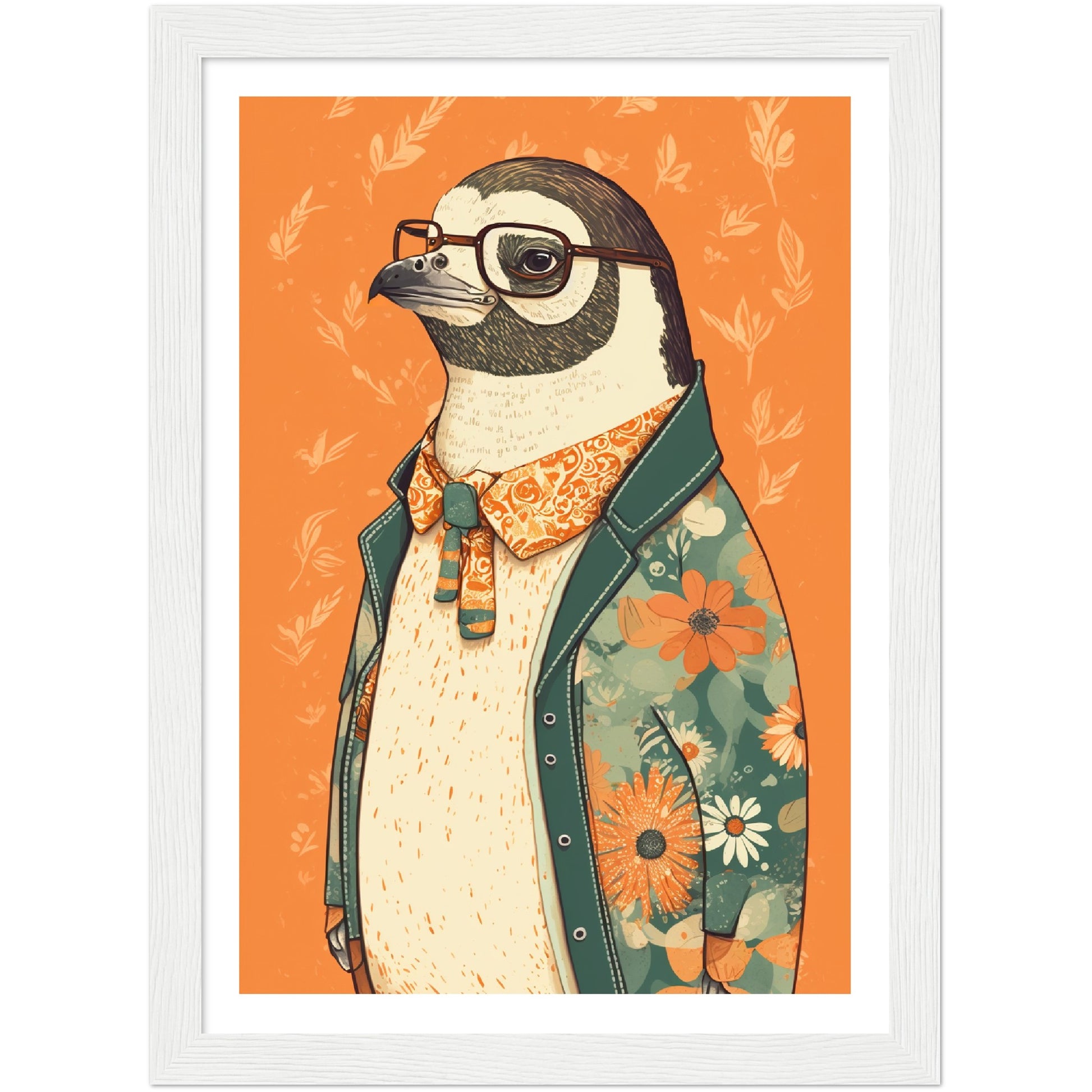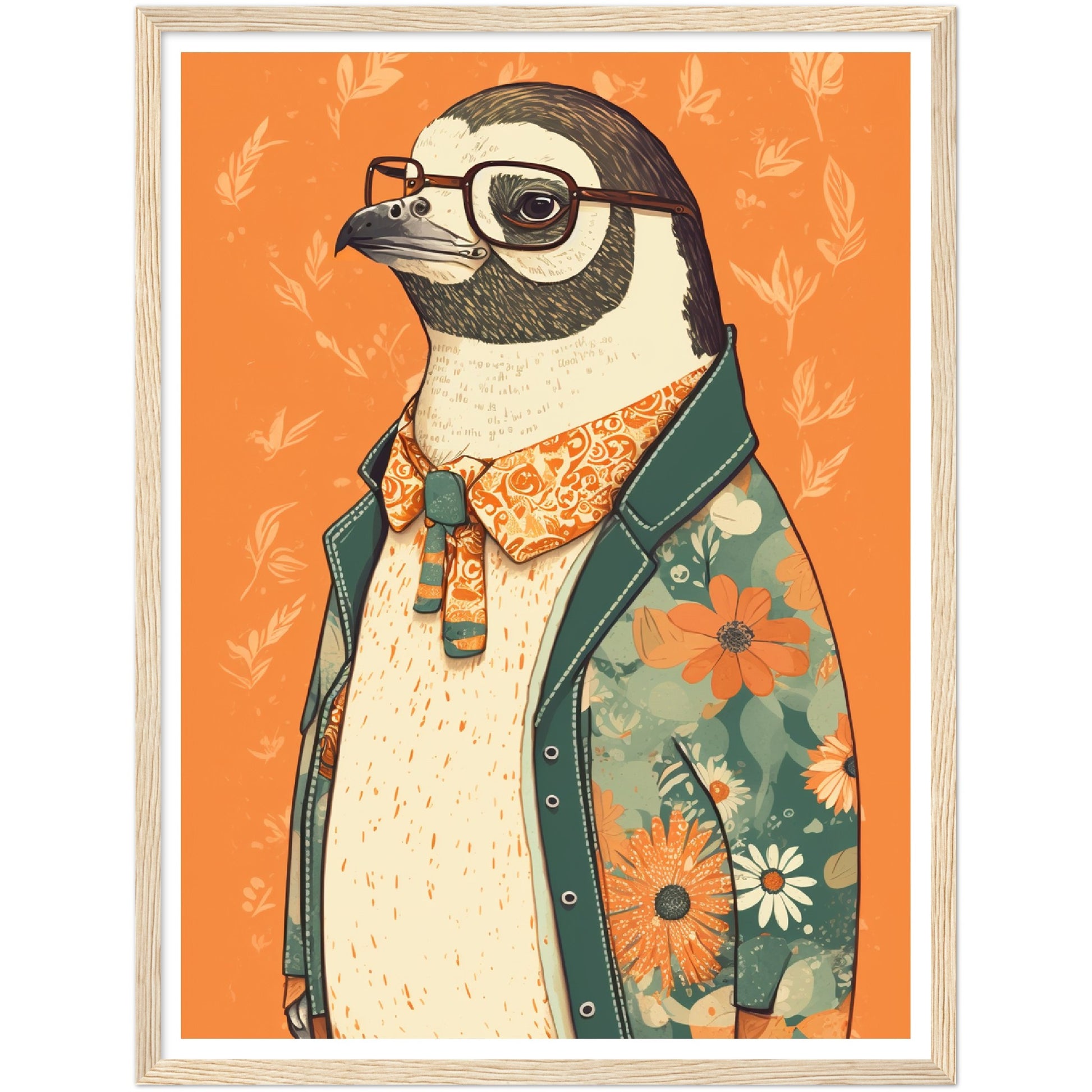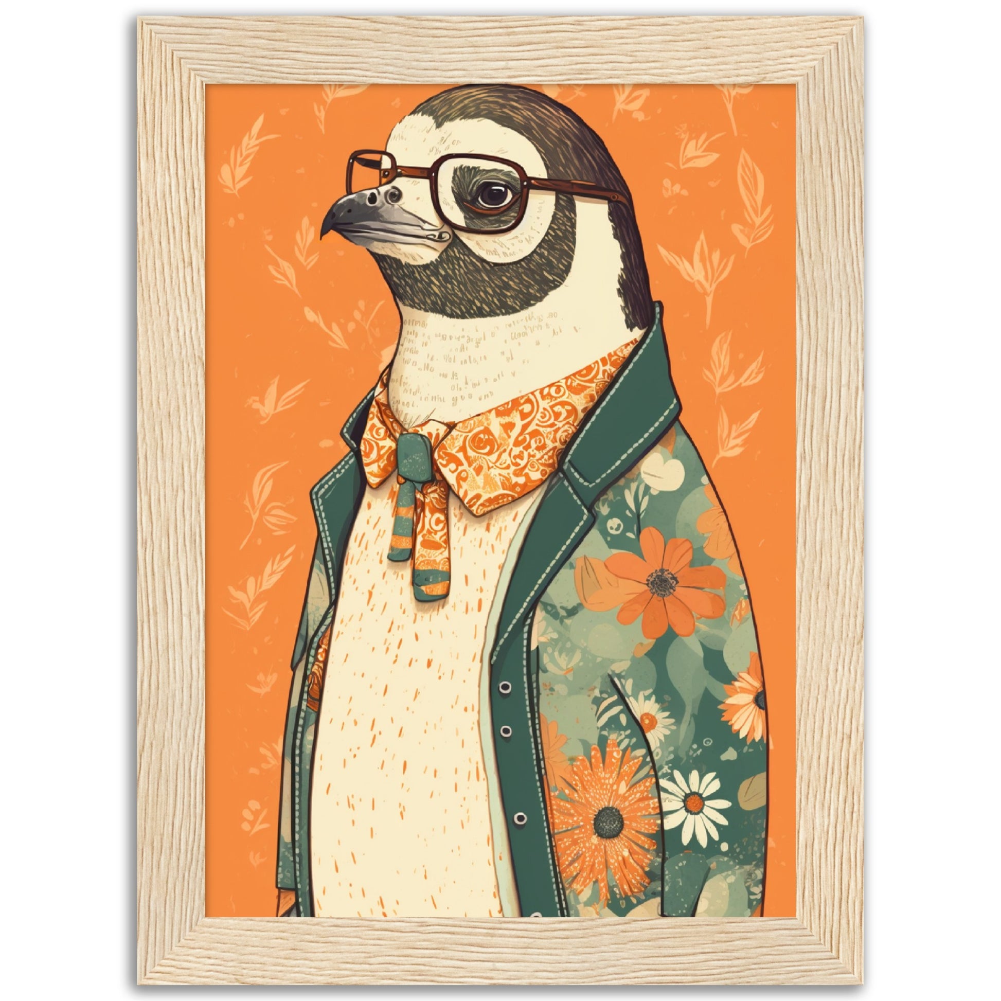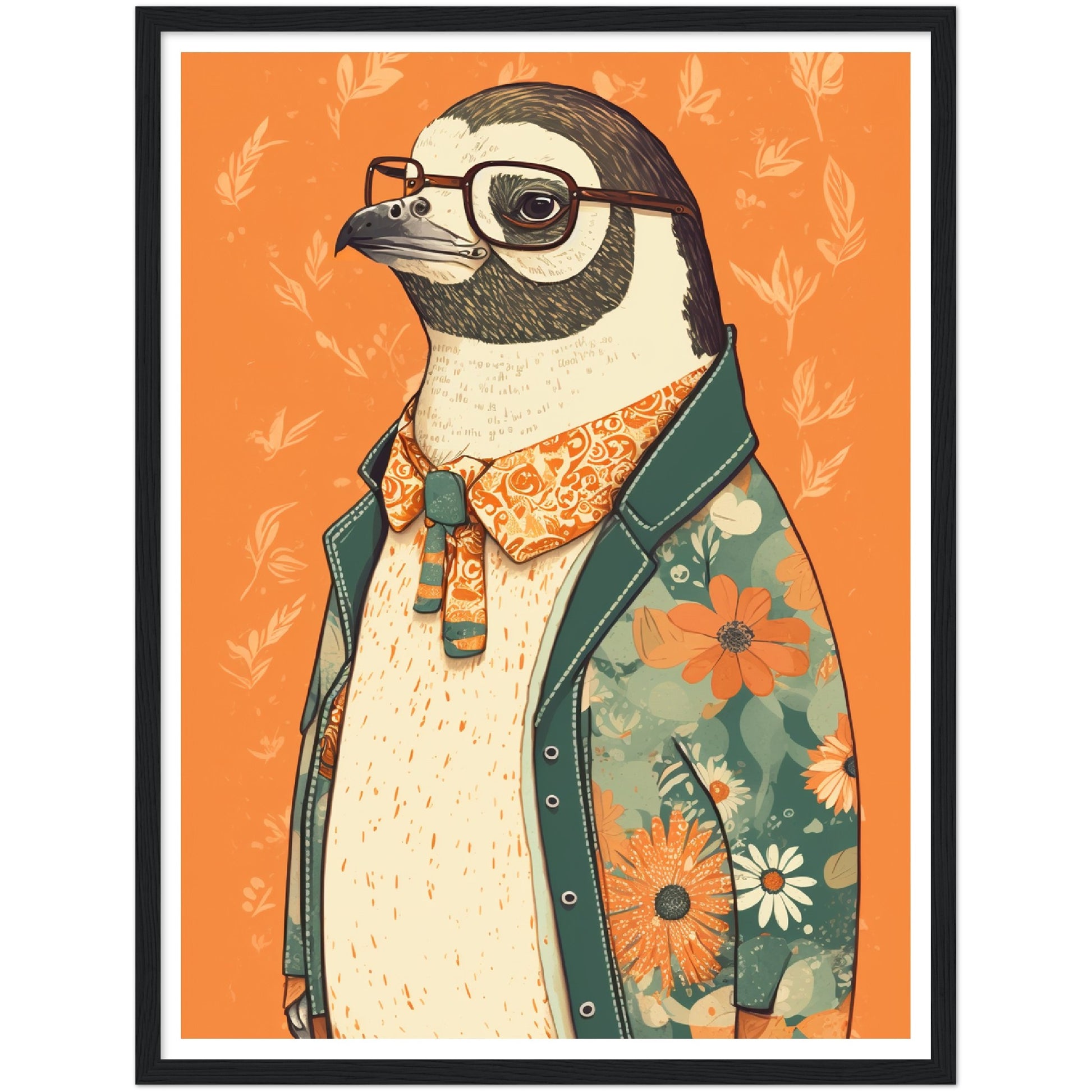 This art illustration features a charming penguin dressed in a floral patterned jacket and quirky fashionable glasses. Against a vibrant orange background, the penguin stands out as a unique and stylish character. The intricate details of the jacket and glasses add depth and texture to the piece, making it a delightful addition to any home or office. This artwork is perfect for those who appreciate whimsical and playful designs.