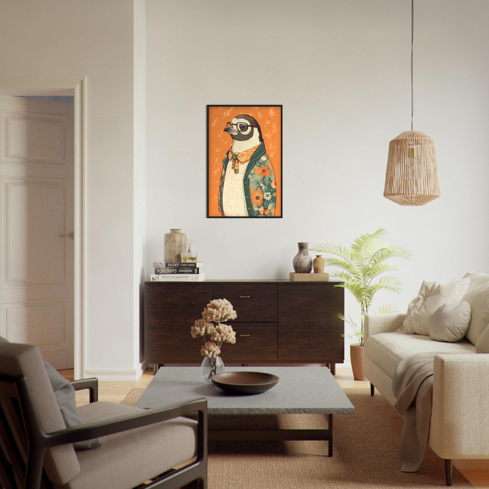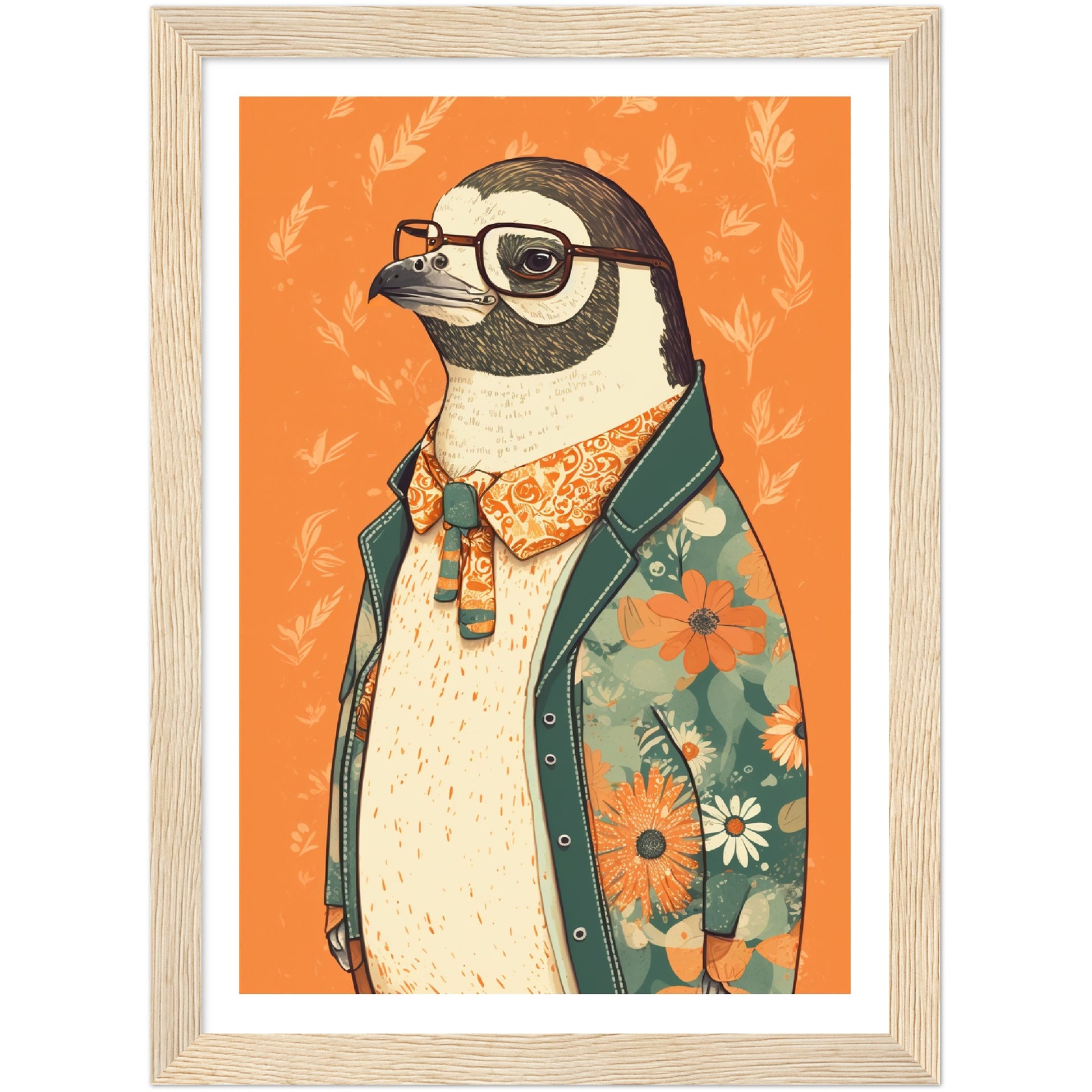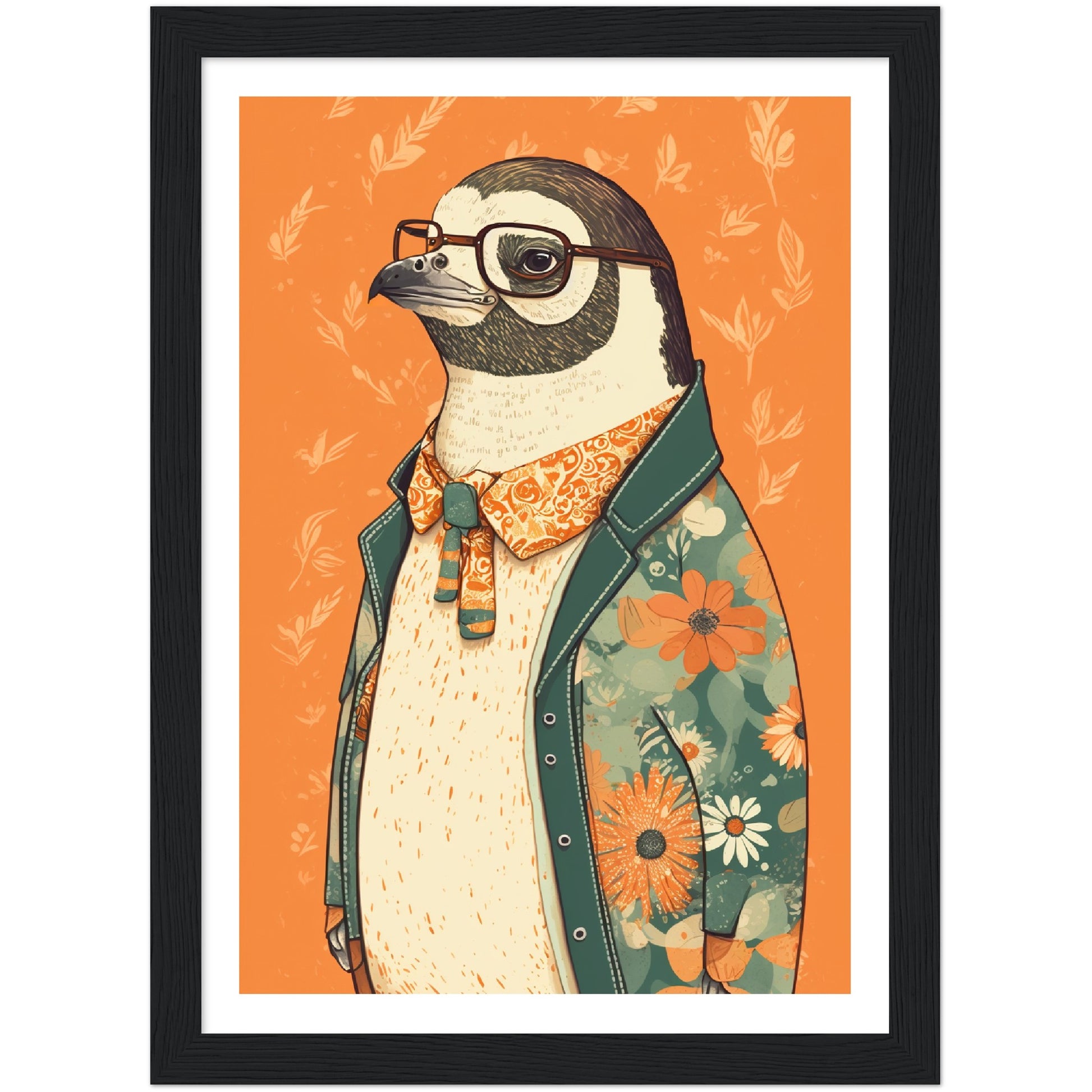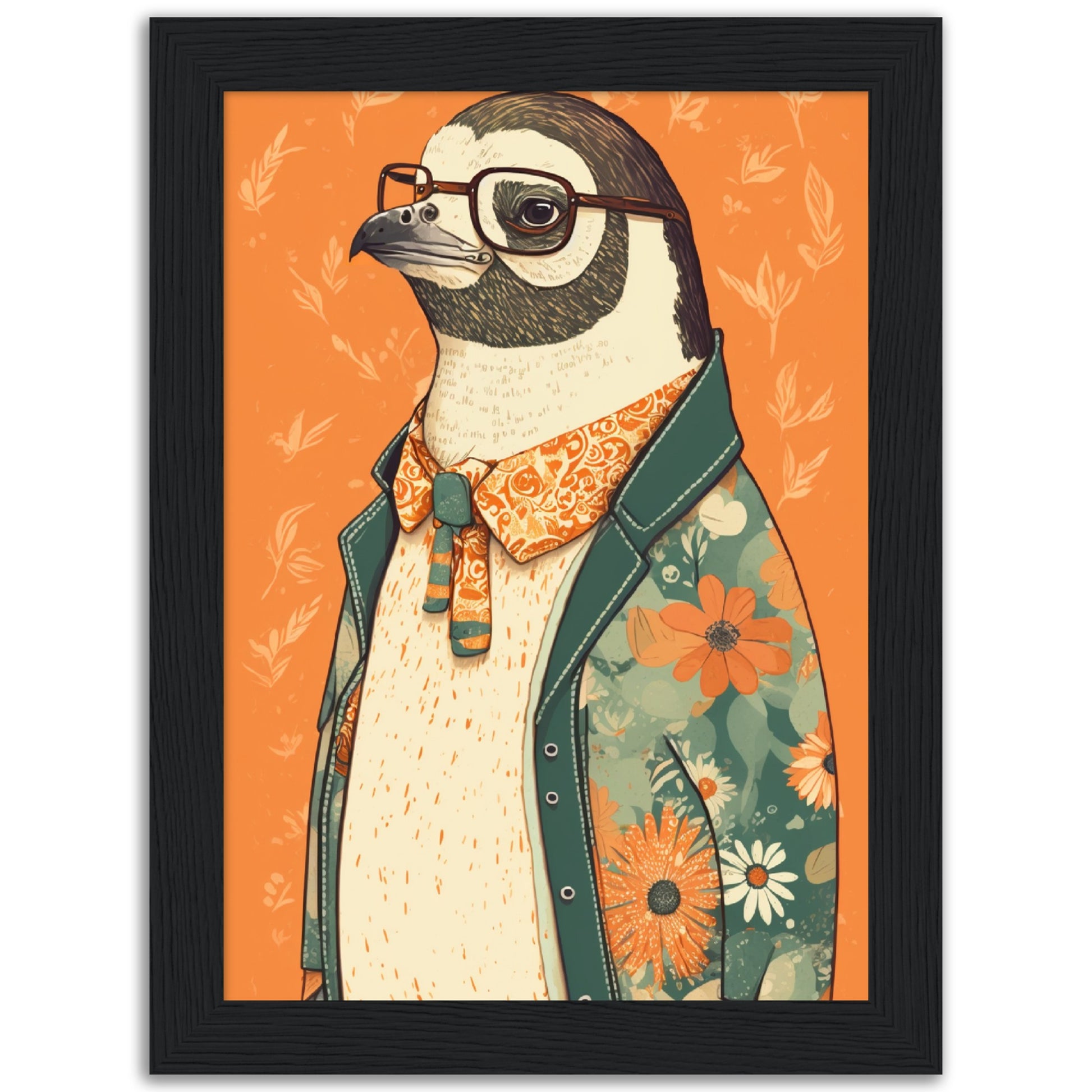 This art illustration features a charming penguin dressed in a floral patterned jacket and quirky fashionable glasses. Against a vibrant orange background, the penguin stands out as a unique and stylish character. The intricate details of the jacket and glasses add depth and texture to the piece, making it a delightful addition to any home or office. This artwork is perfect for those who appreciate whimsical and playful designs.