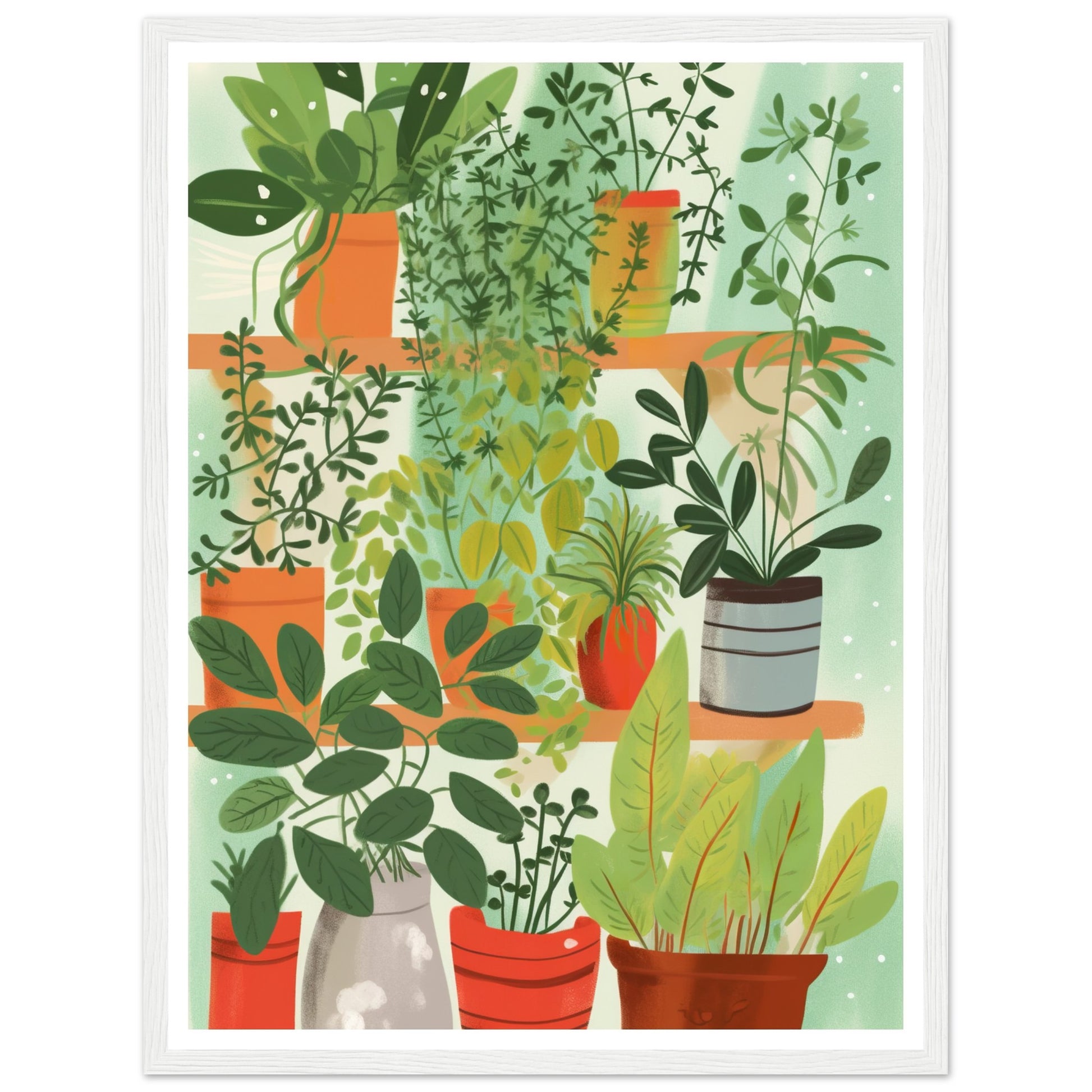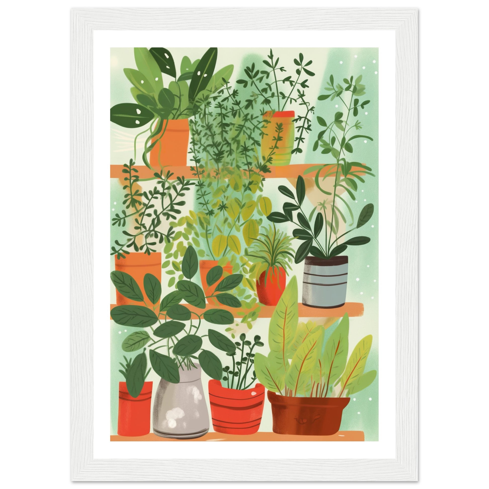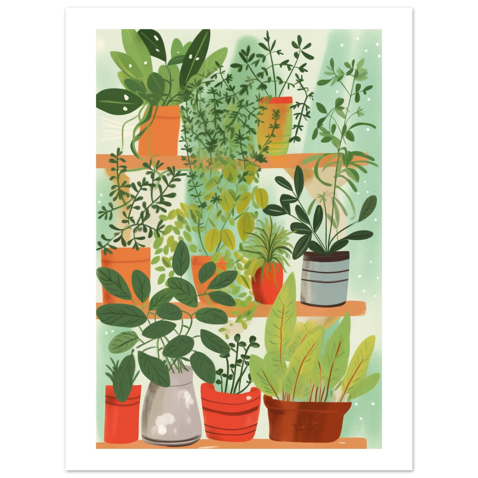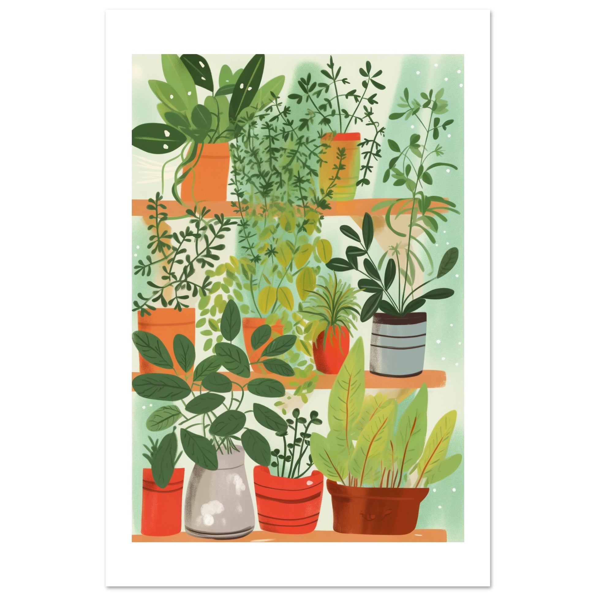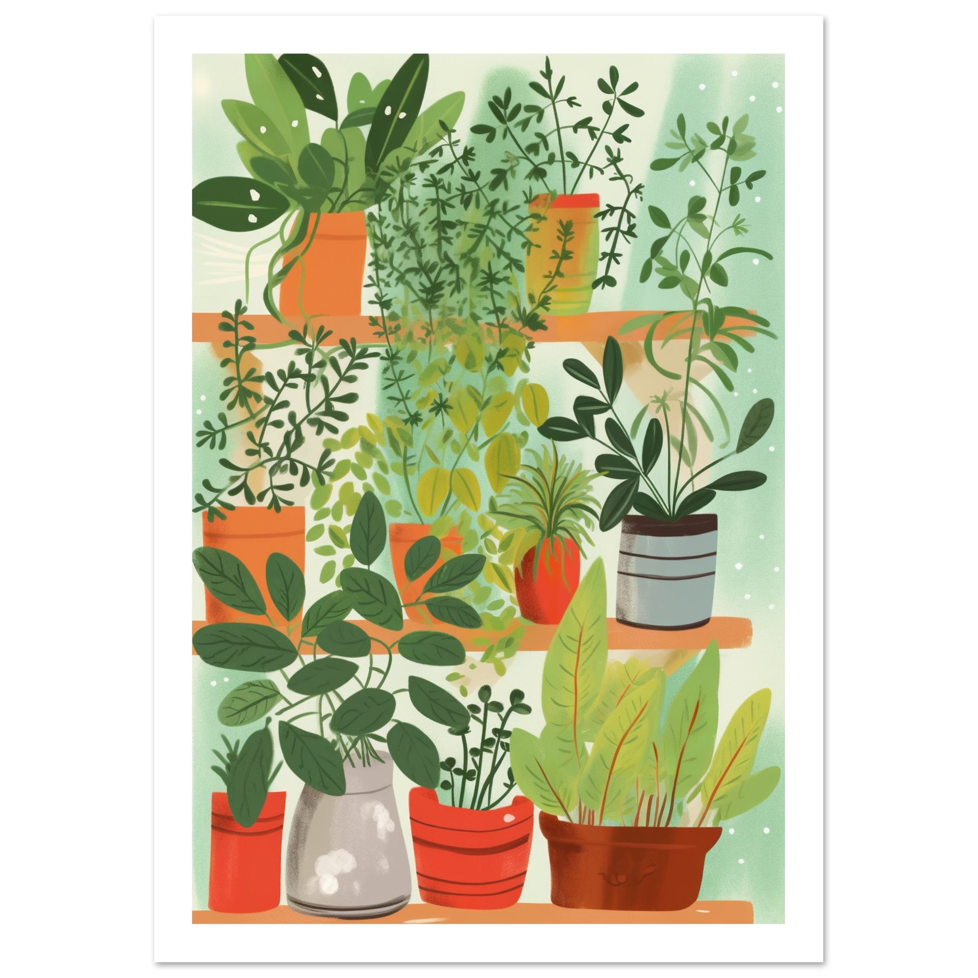 A whimsical and minimalist storybook-style illustration that brings the charm of kitchen herbs and plants to life. Set against a backdrop of muted tones, a delightful shelf becomes a sanctuary for an array of herbs and plants. Each plant is depicted with minimalistic elegance, capturing their distinctive shapes and textures. The illustration invites viewers into a world of culinary inspiration, where the aroma of fresh herbs and the beauty of nature converge.