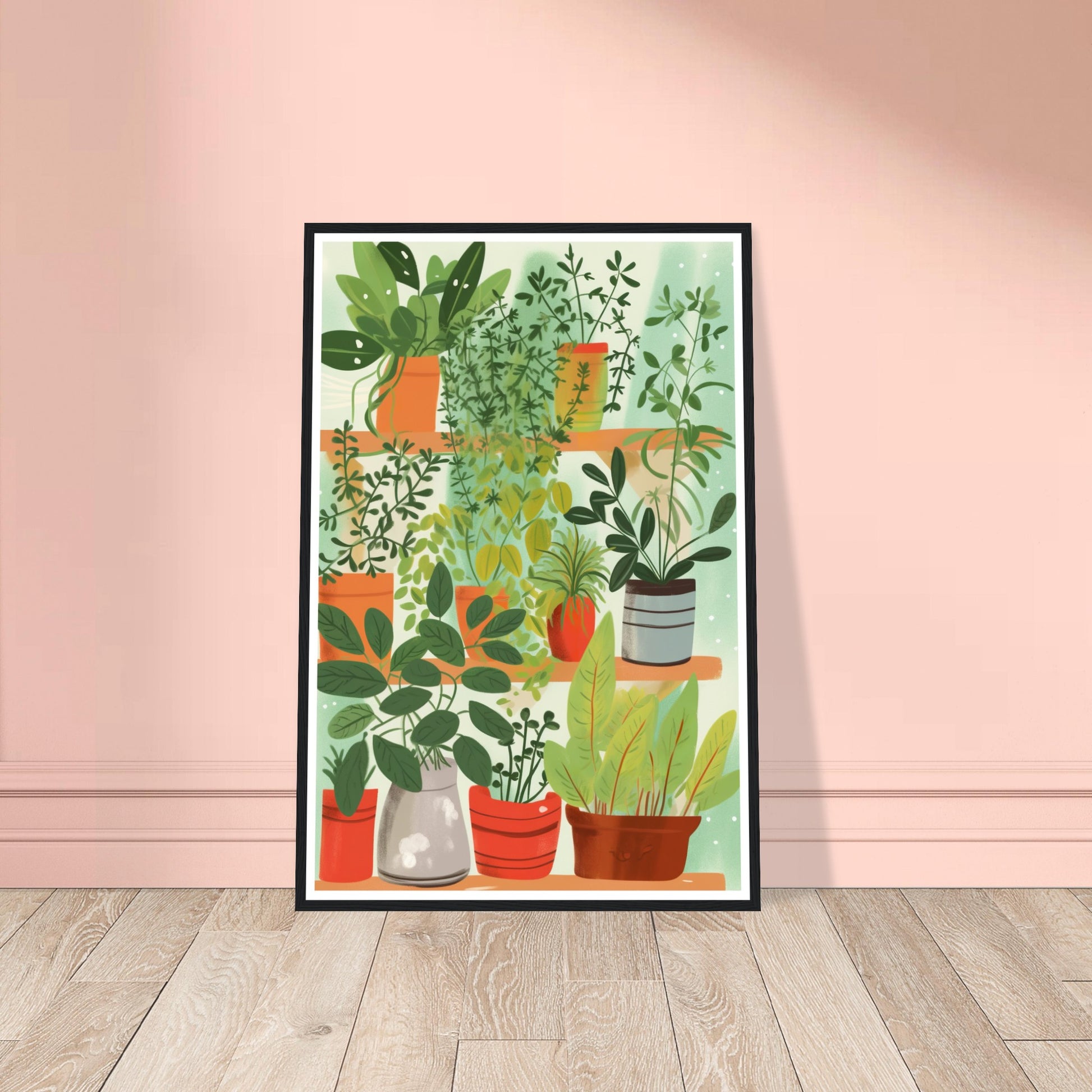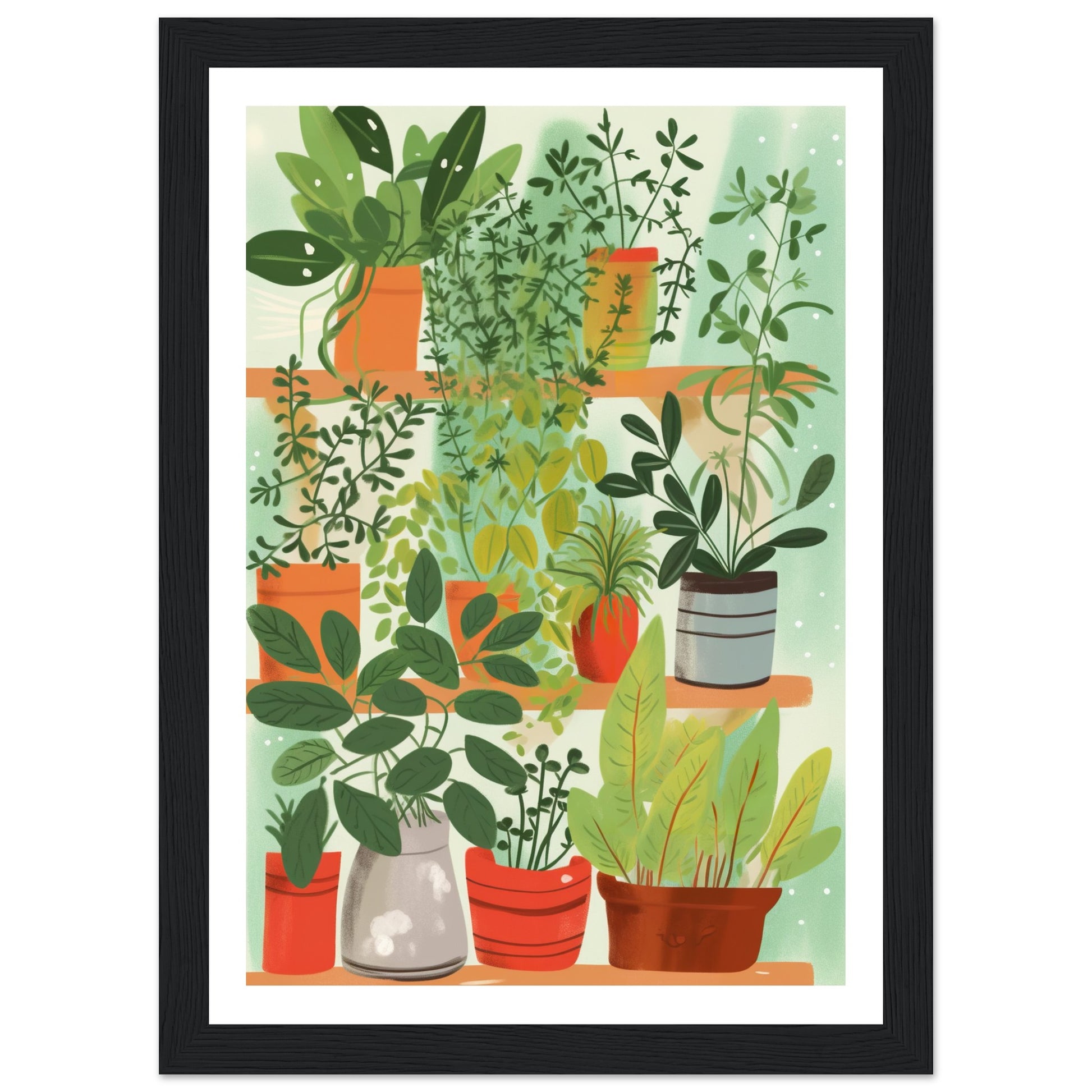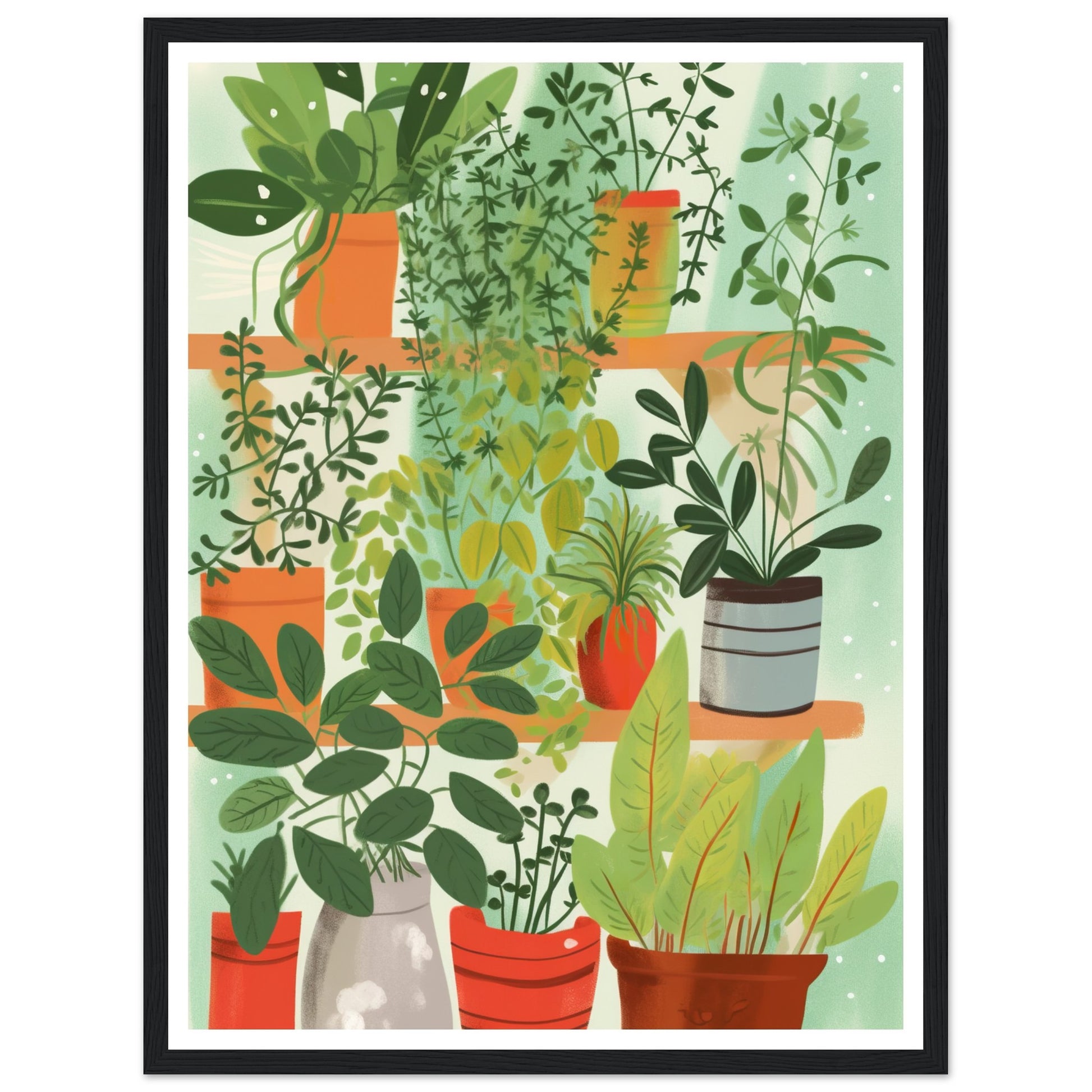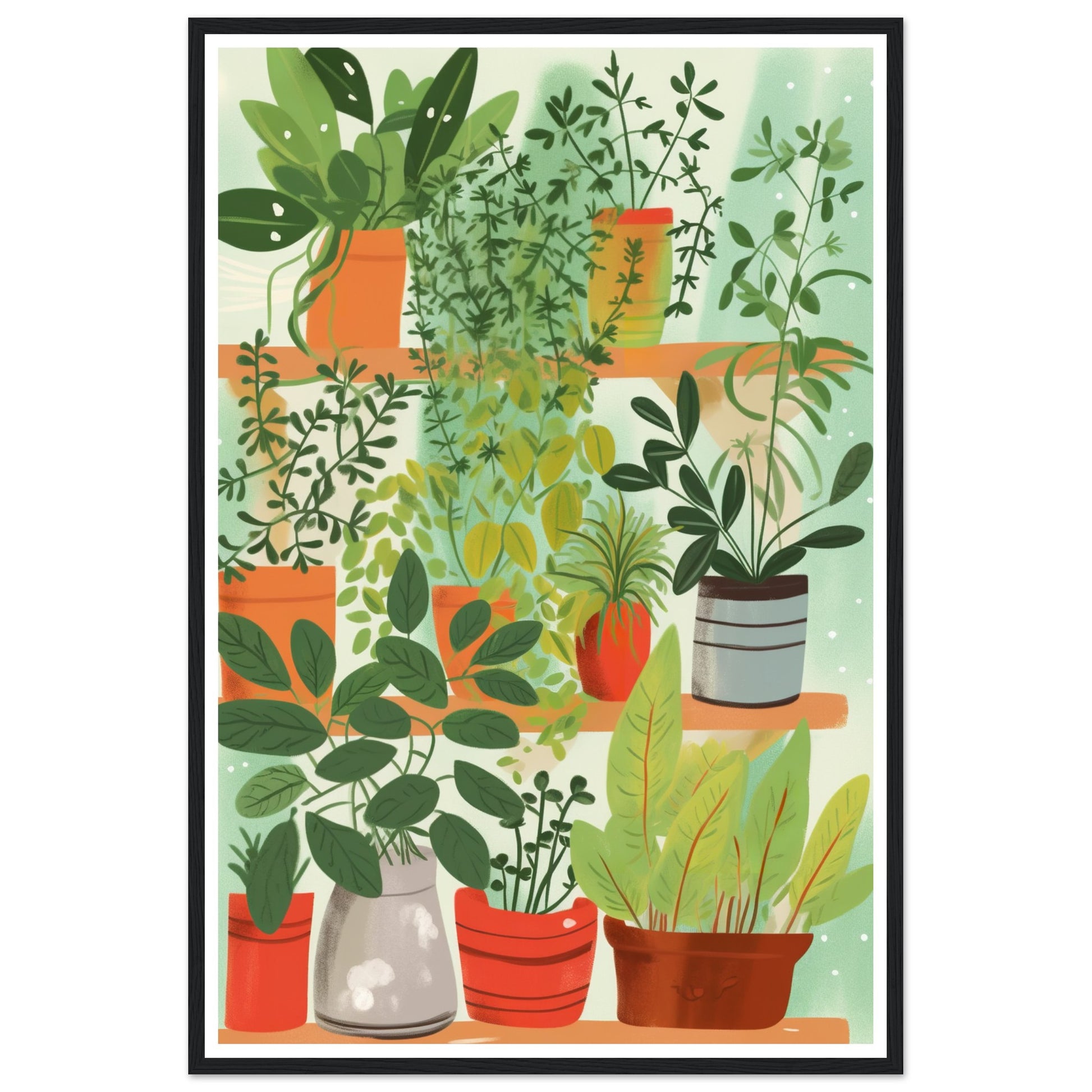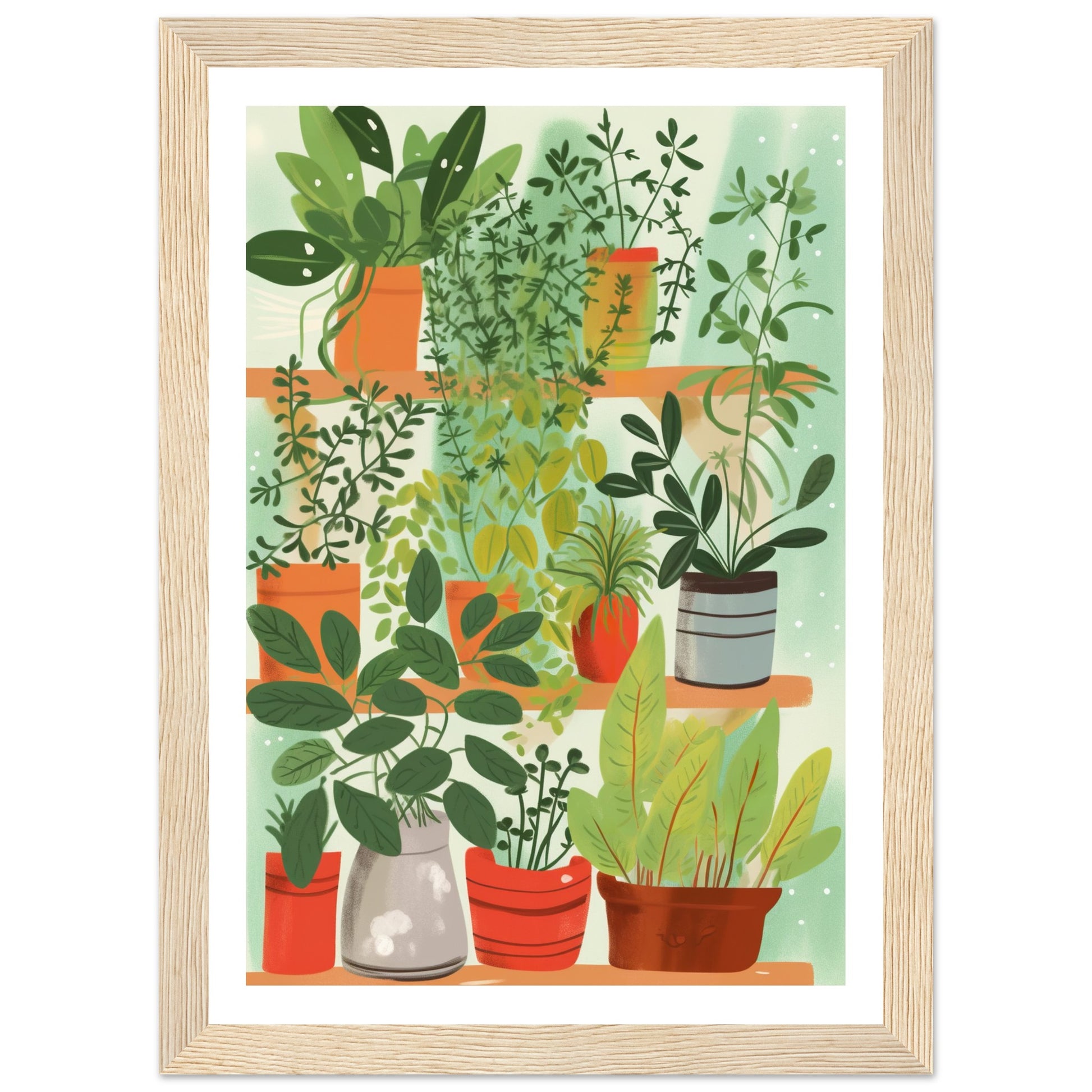 A whimsical and minimalist storybook-style illustration that brings the charm of kitchen herbs and plants to life. Set against a backdrop of muted tones, a delightful shelf becomes a sanctuary for an array of herbs and plants. Each plant is depicted with minimalistic elegance, capturing their distinctive shapes and textures. The illustration invites viewers into a world of culinary inspiration, where the aroma of fresh herbs and the beauty of nature converge.
