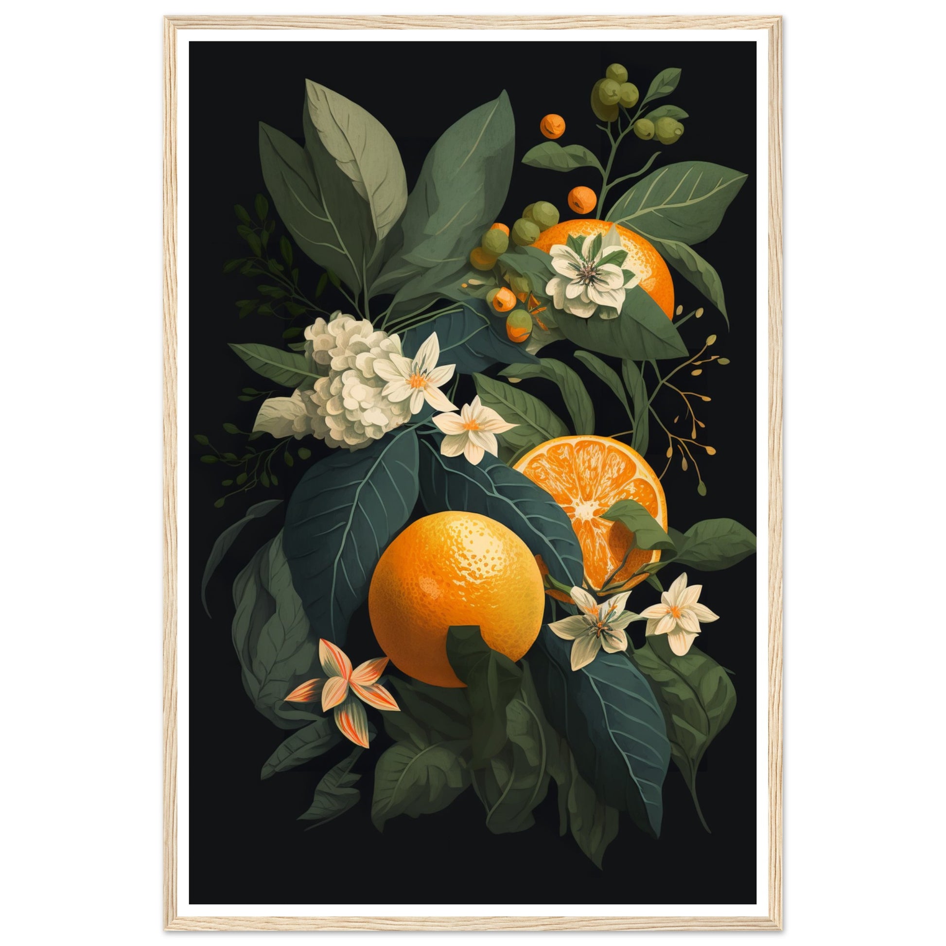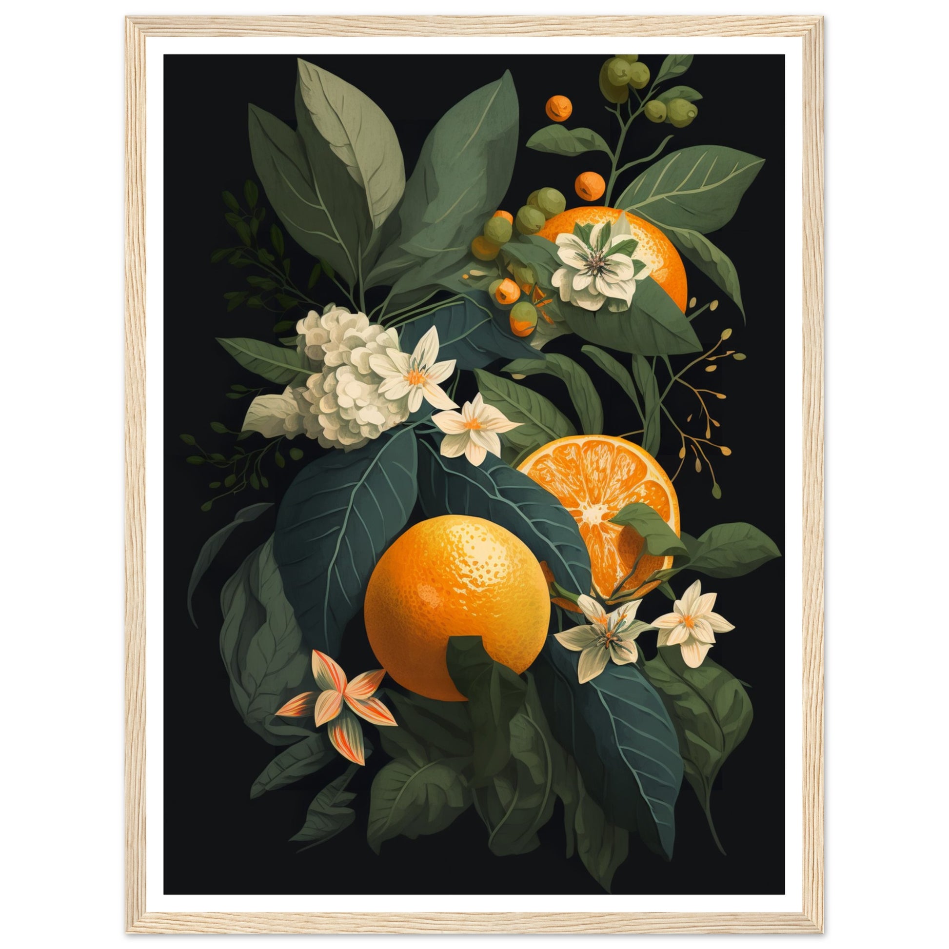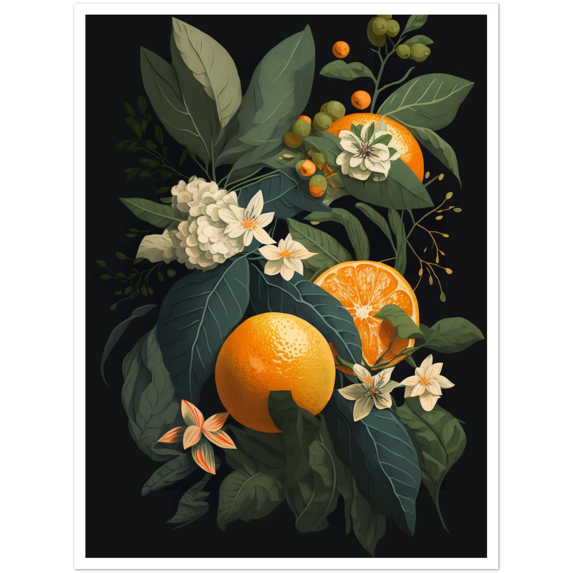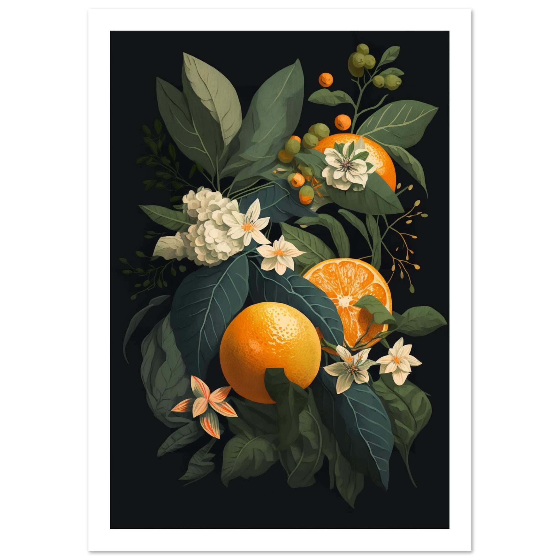 A classic art piece that celebrates the beauty of vibrant citrus in a charming vignette illustration style. The artwork showcases flourishing oranges with dark green stems, radiating a burst of tropical bliss. With its delightful charm and intricate details, this print brings a touch of botanical delight to any space.