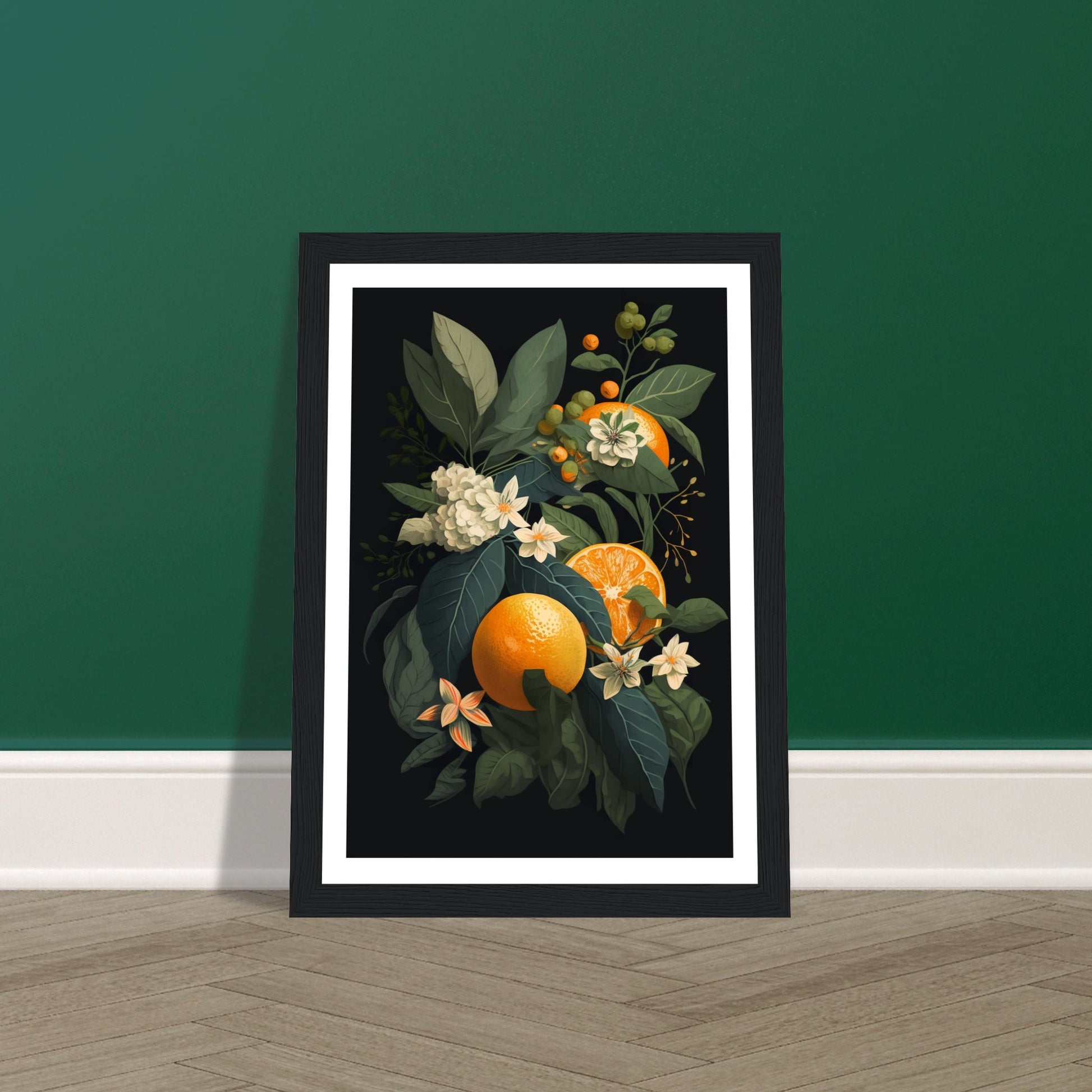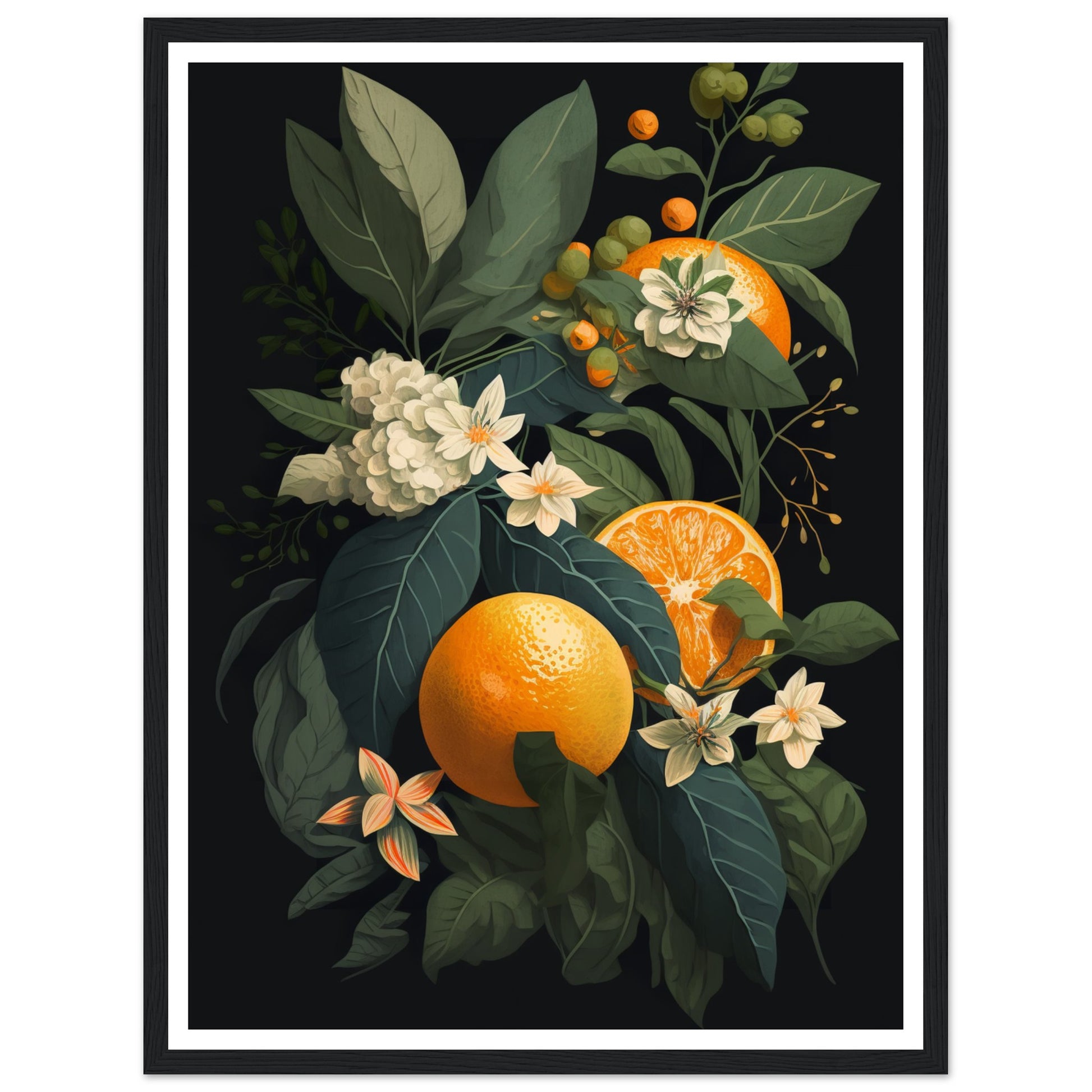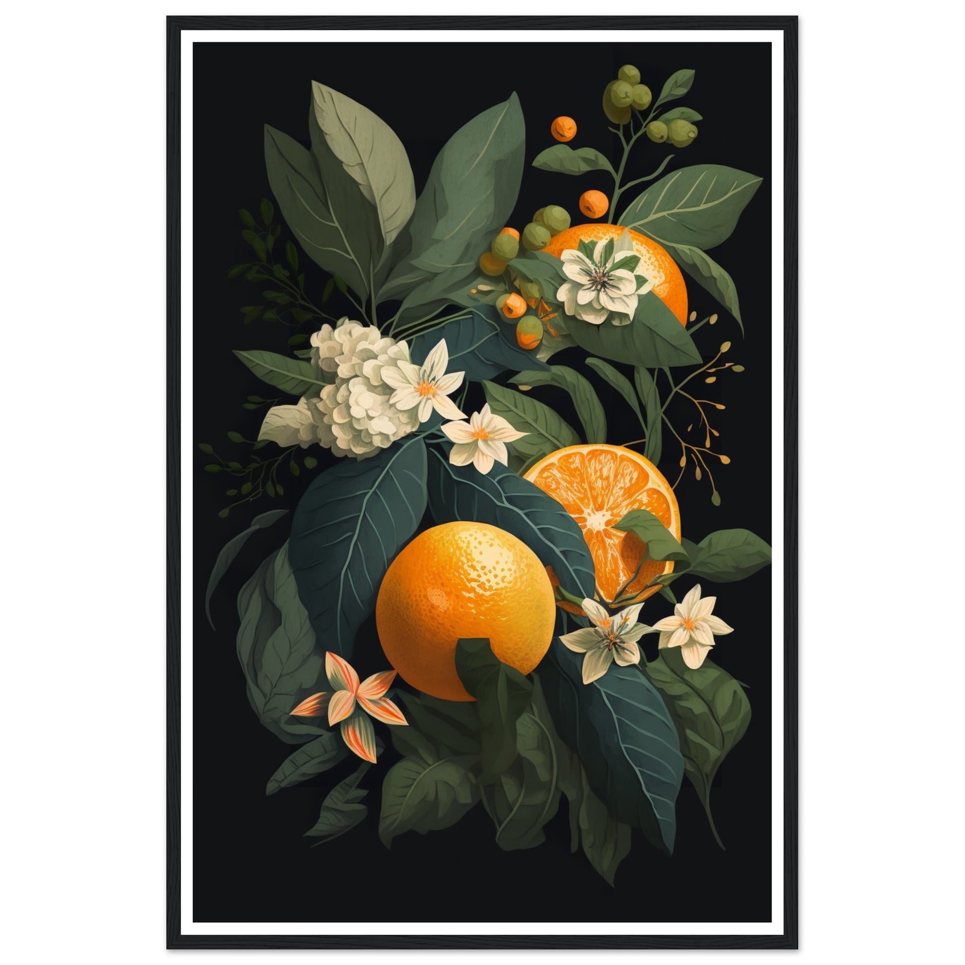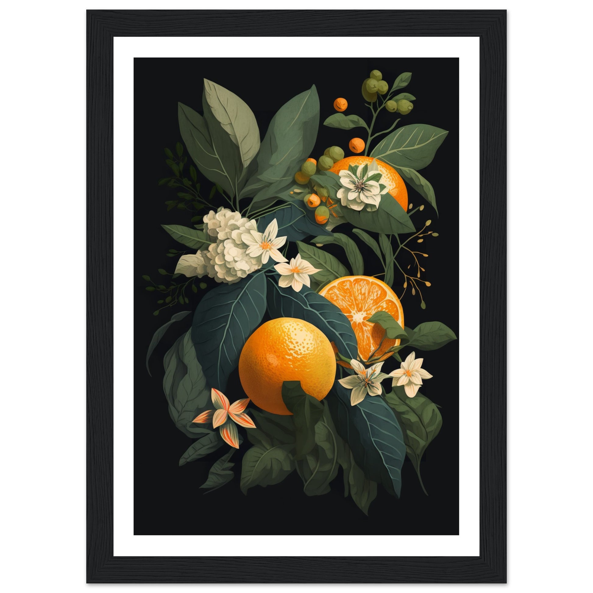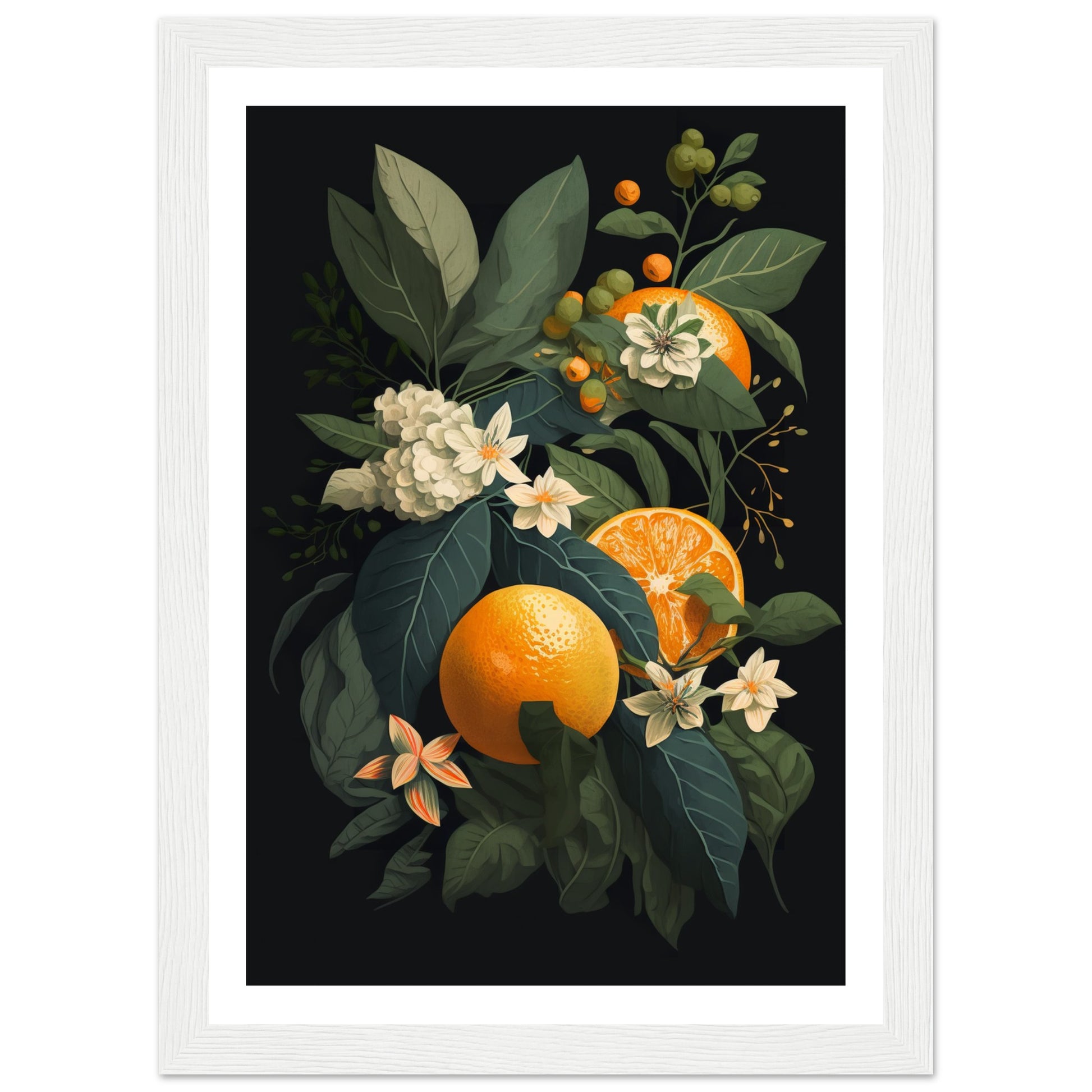 A classic art piece that celebrates the beauty of vibrant citrus in a charming vignette illustration style. The artwork showcases flourishing oranges with dark green stems, radiating a burst of tropical bliss. With its delightful charm and intricate details, this print brings a touch of botanical delight to any space.