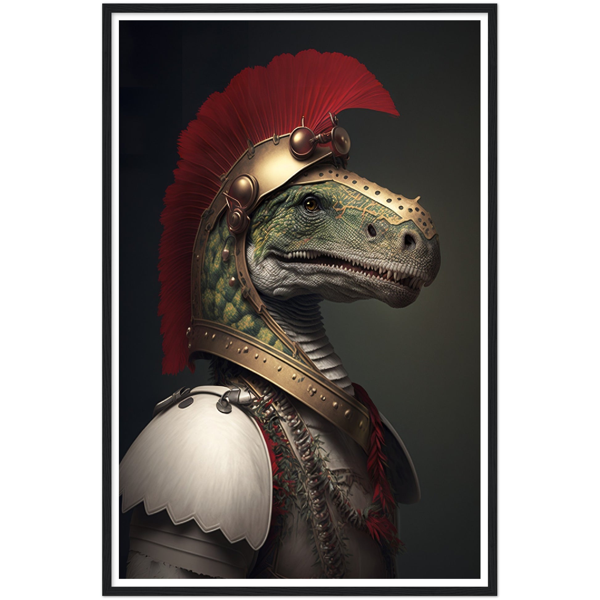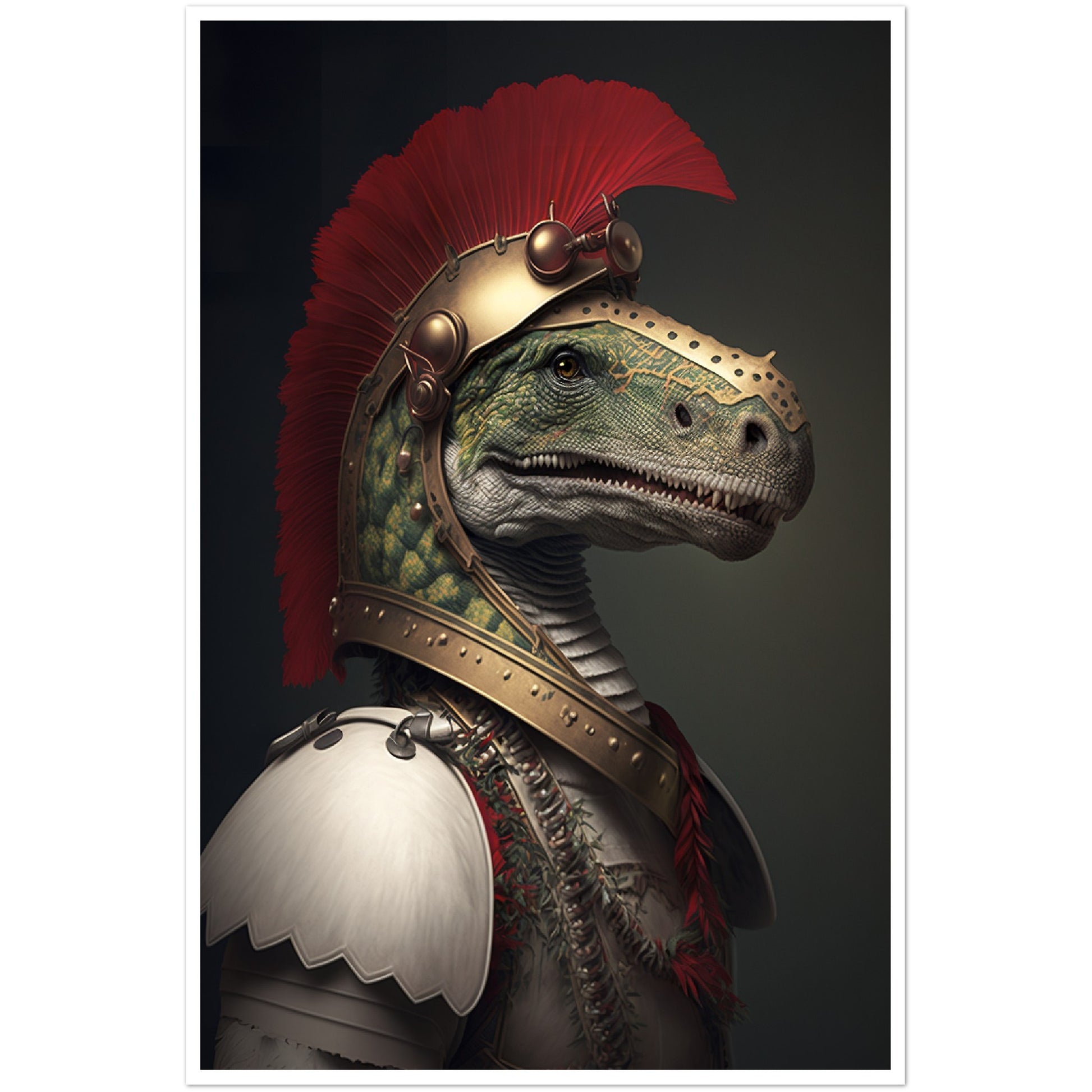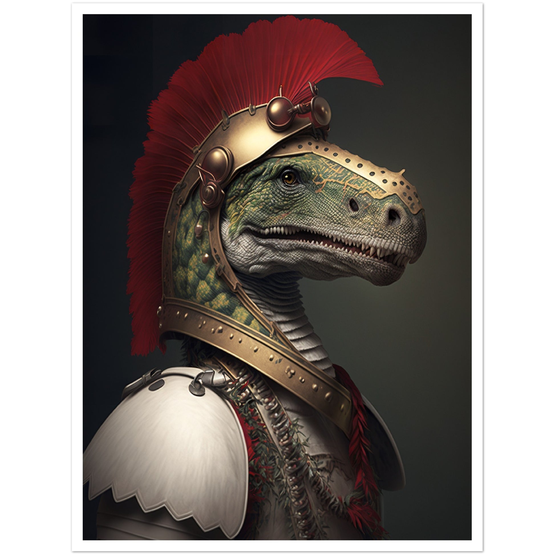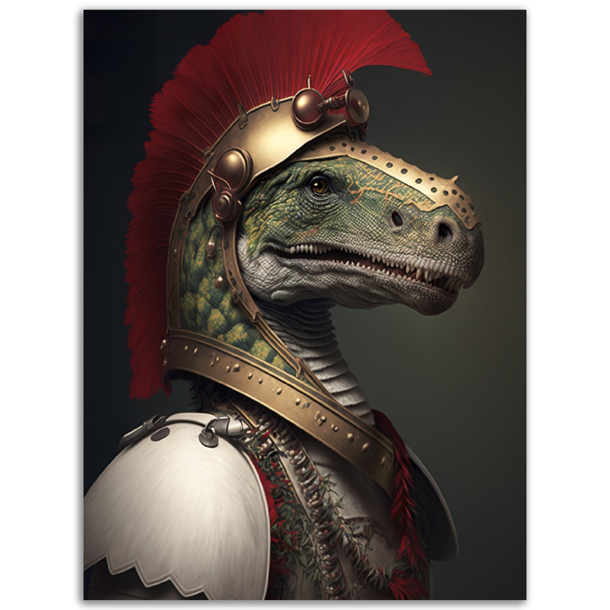 This unique artwork features a Roman portraiture of a dinosaur dressed as a Roman soldier. The illustration is expertly crafted with intricate details and vibrant colors that bring the scene to life. This piece is perfect for adding a touch of whimsy and humor to any space. It is sure to be a conversation starter and a favorite among dinosaur and history enthusiasts alike.