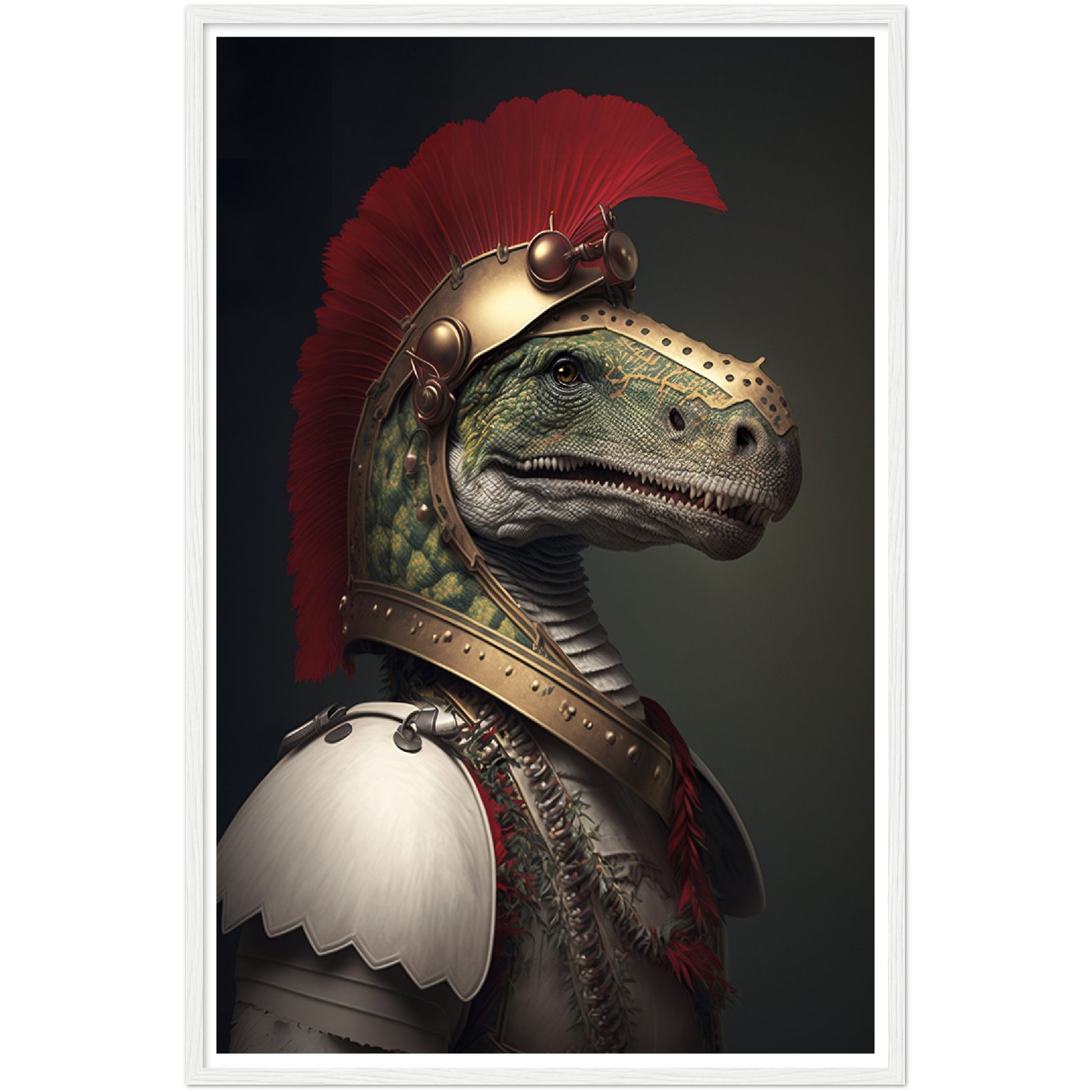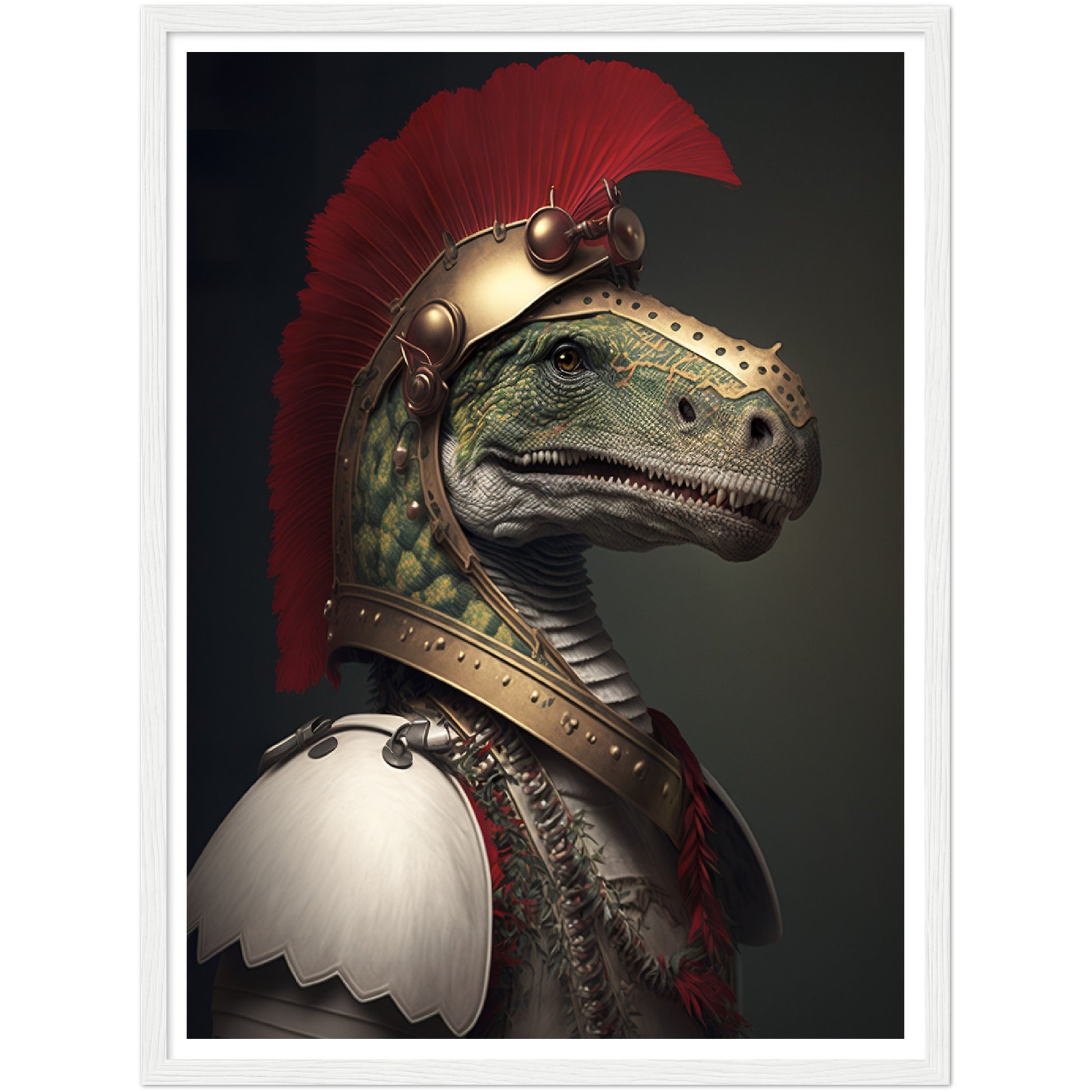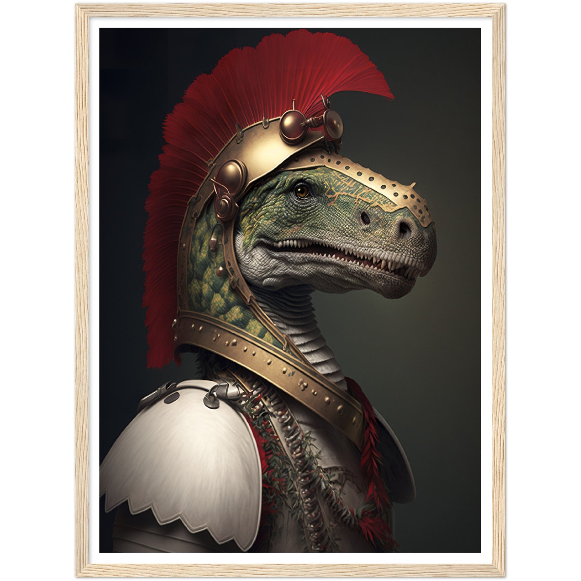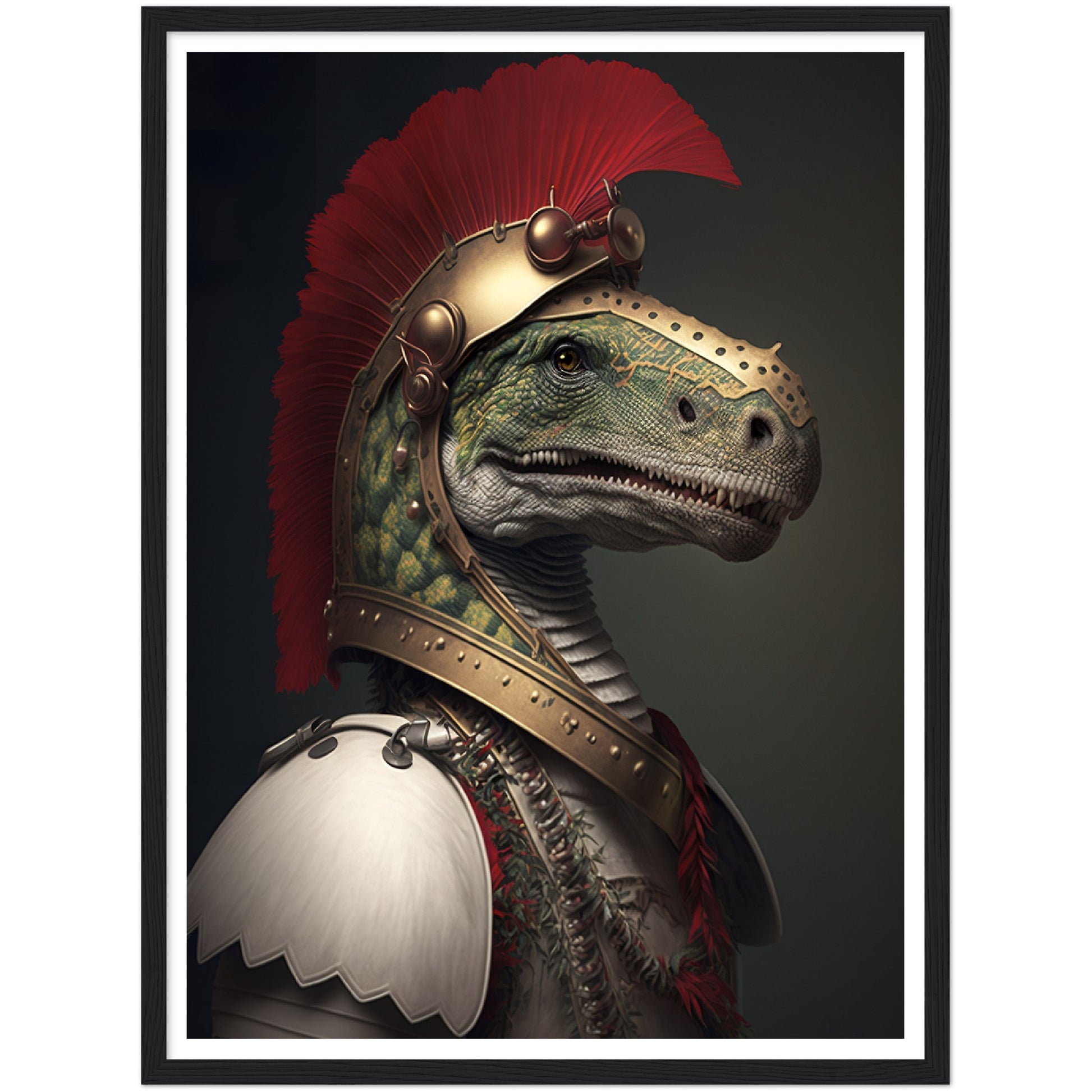 This unique artwork features a Roman portraiture of a dinosaur dressed as a Roman soldier. The illustration is expertly crafted with intricate details and vibrant colors that bring the scene to life. This piece is perfect for adding a touch of whimsy and humor to any space. It is sure to be a conversation starter and a favorite among dinosaur and history enthusiasts alike.