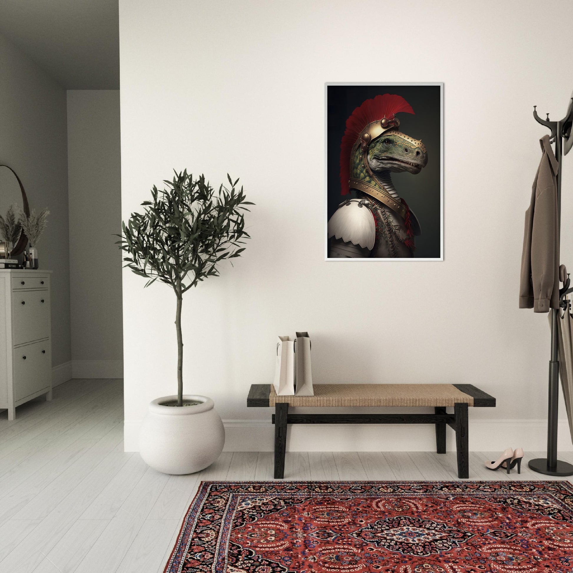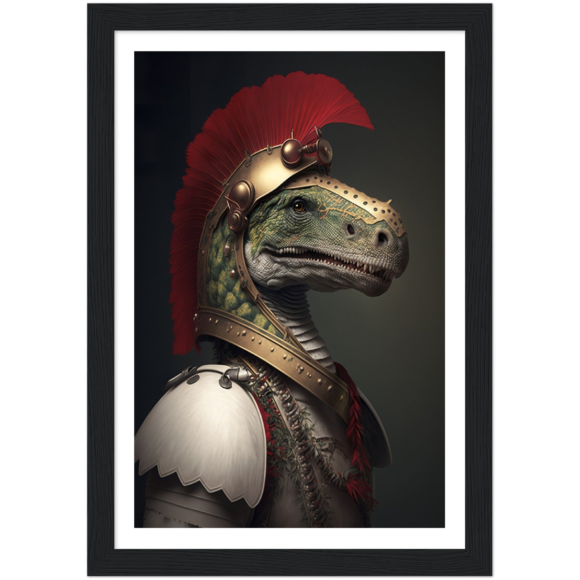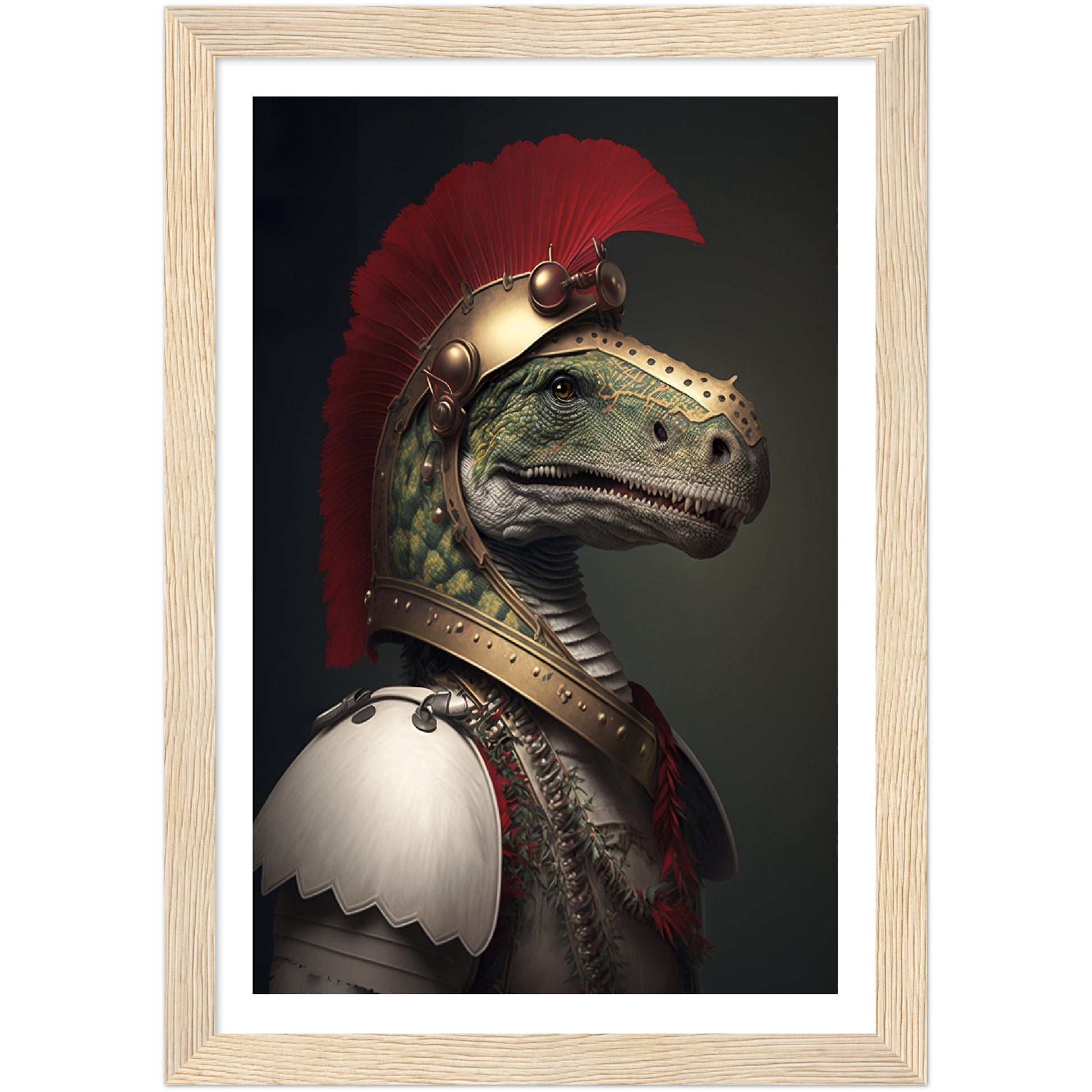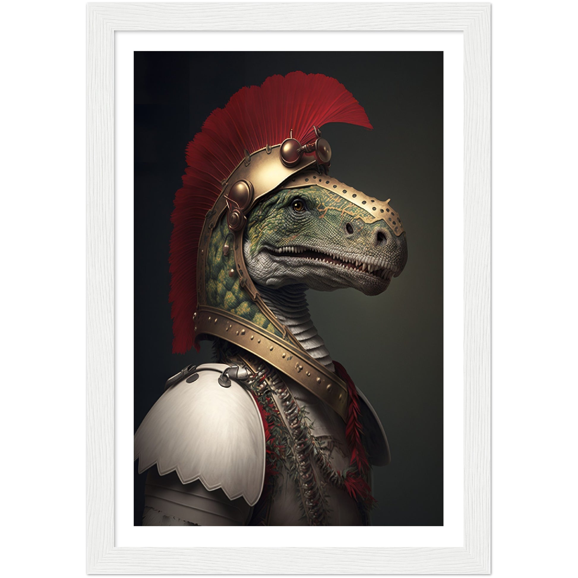 This unique artwork features a Roman portraiture of a dinosaur dressed as a Roman soldier. The illustration is expertly crafted with intricate details and vibrant colors that bring the scene to life. This piece is perfect for adding a touch of whimsy and humor to any space. It is sure to be a conversation starter and a favorite among dinosaur and history enthusiasts alike.
