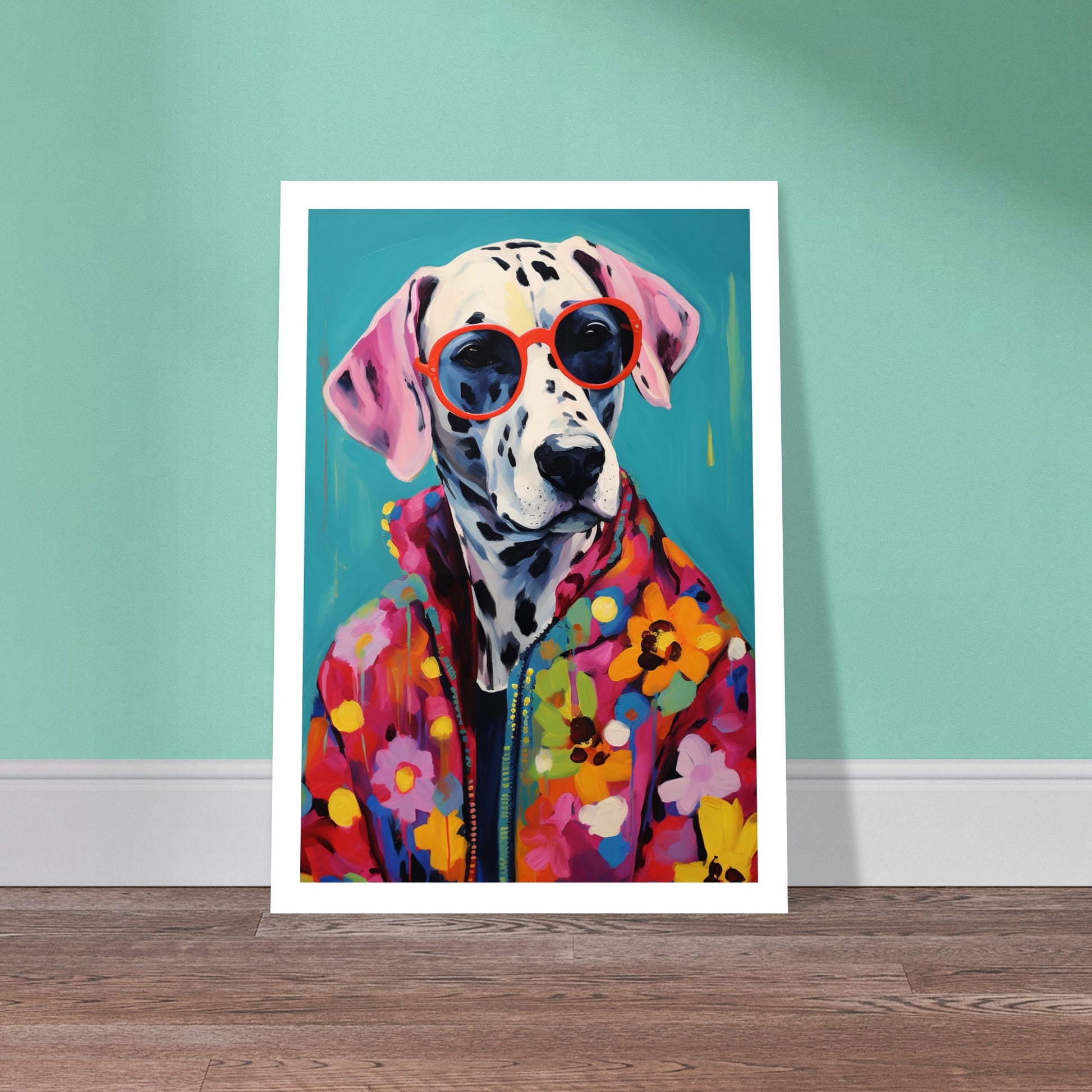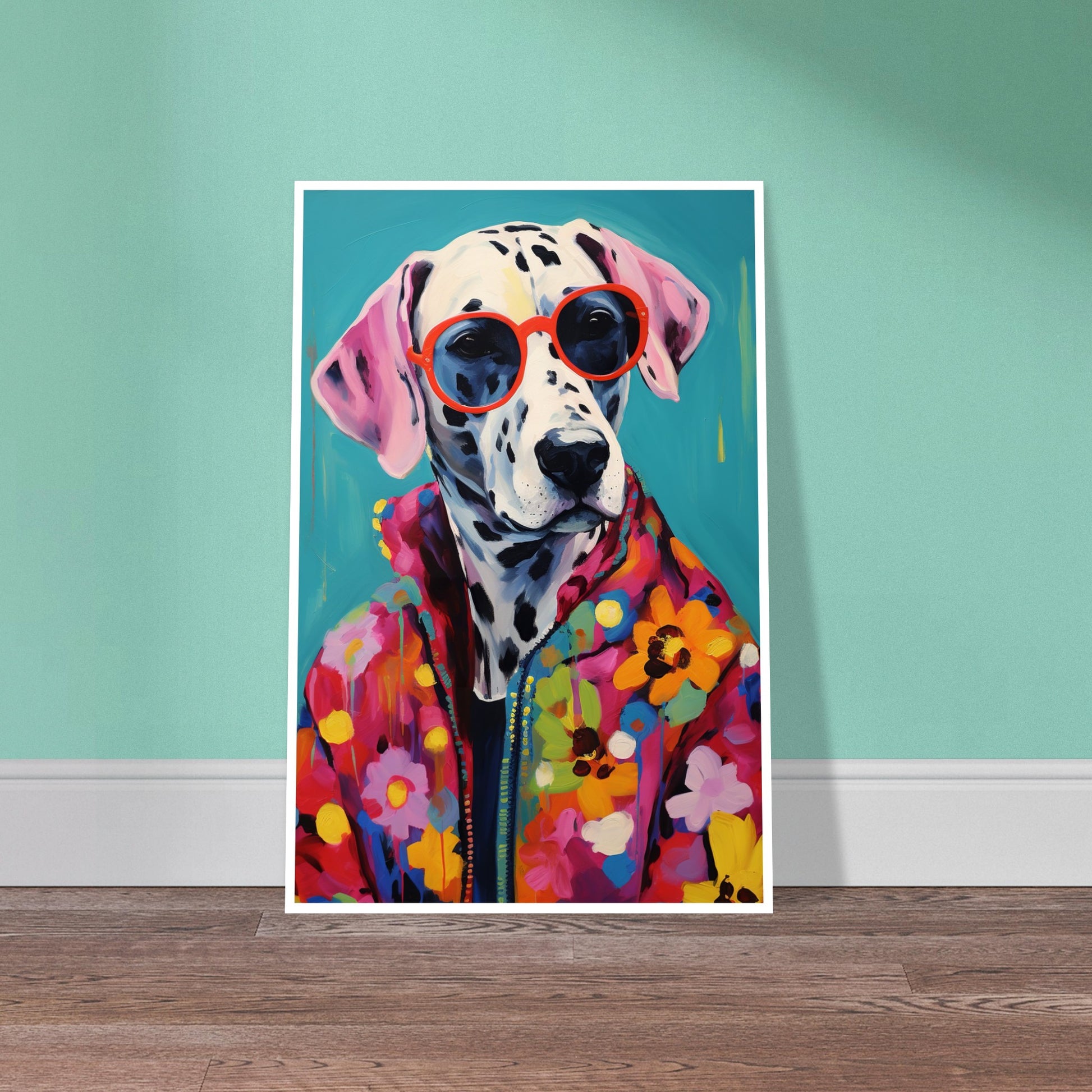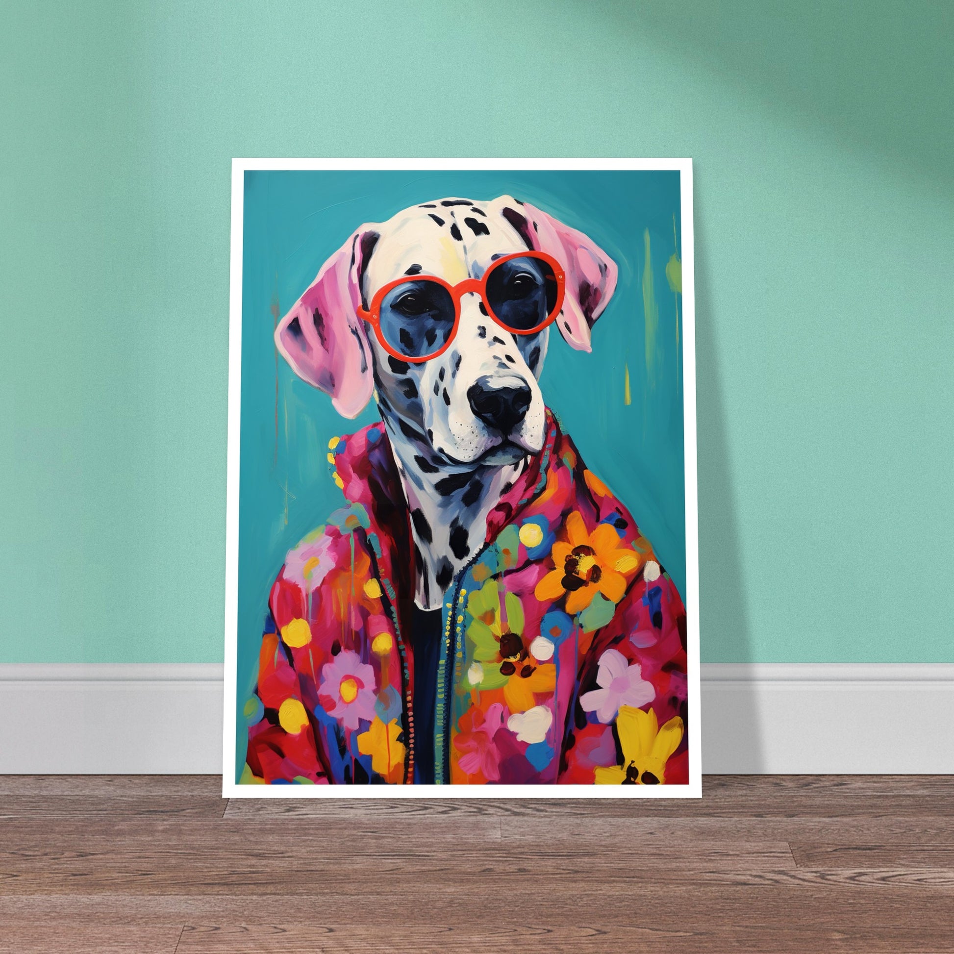 A painting of a Dalmatian wearing a vibrant hippy flower power inspired jacket and red sunglasses. A stylish and whimsical animal portrait that will add a groovy feel to any room.