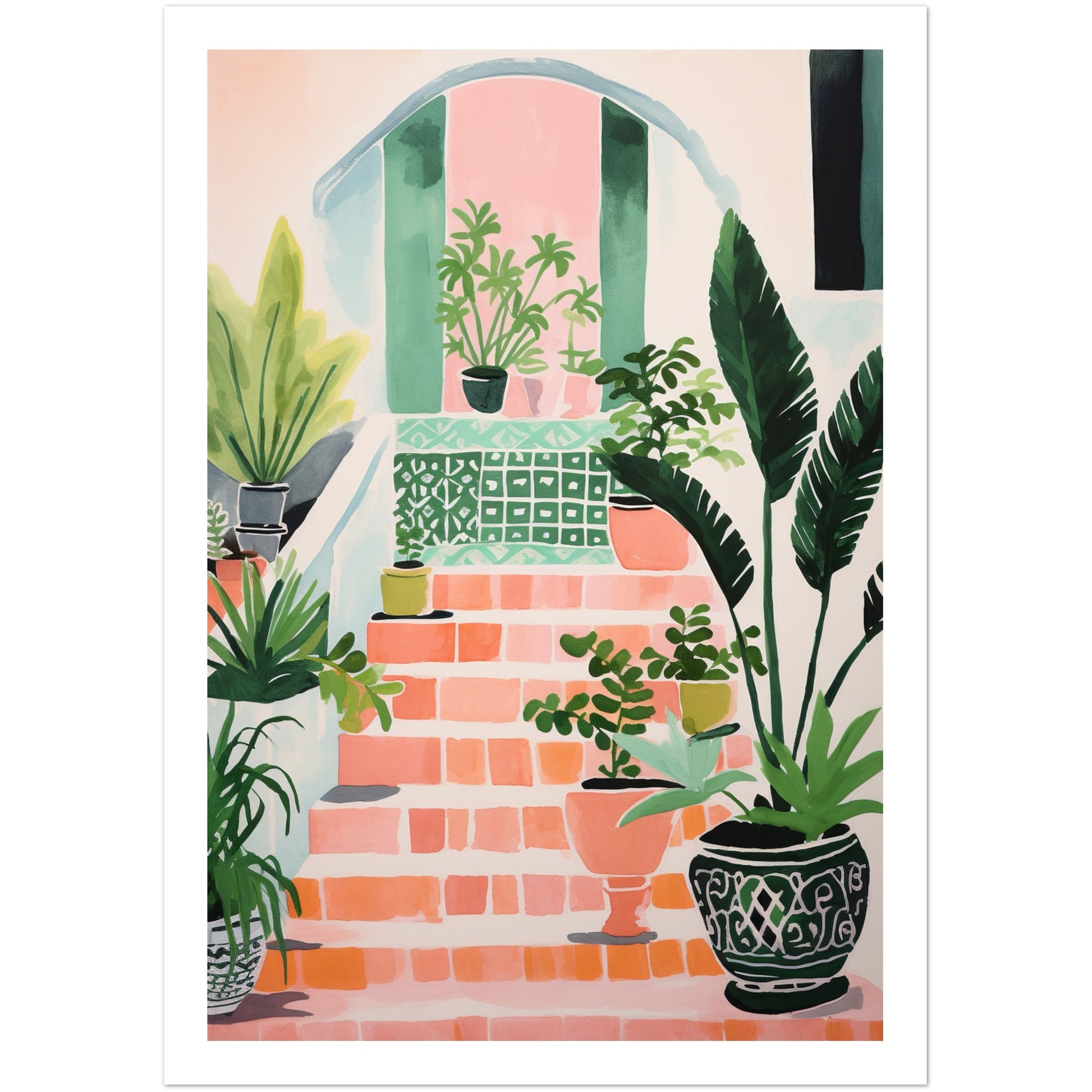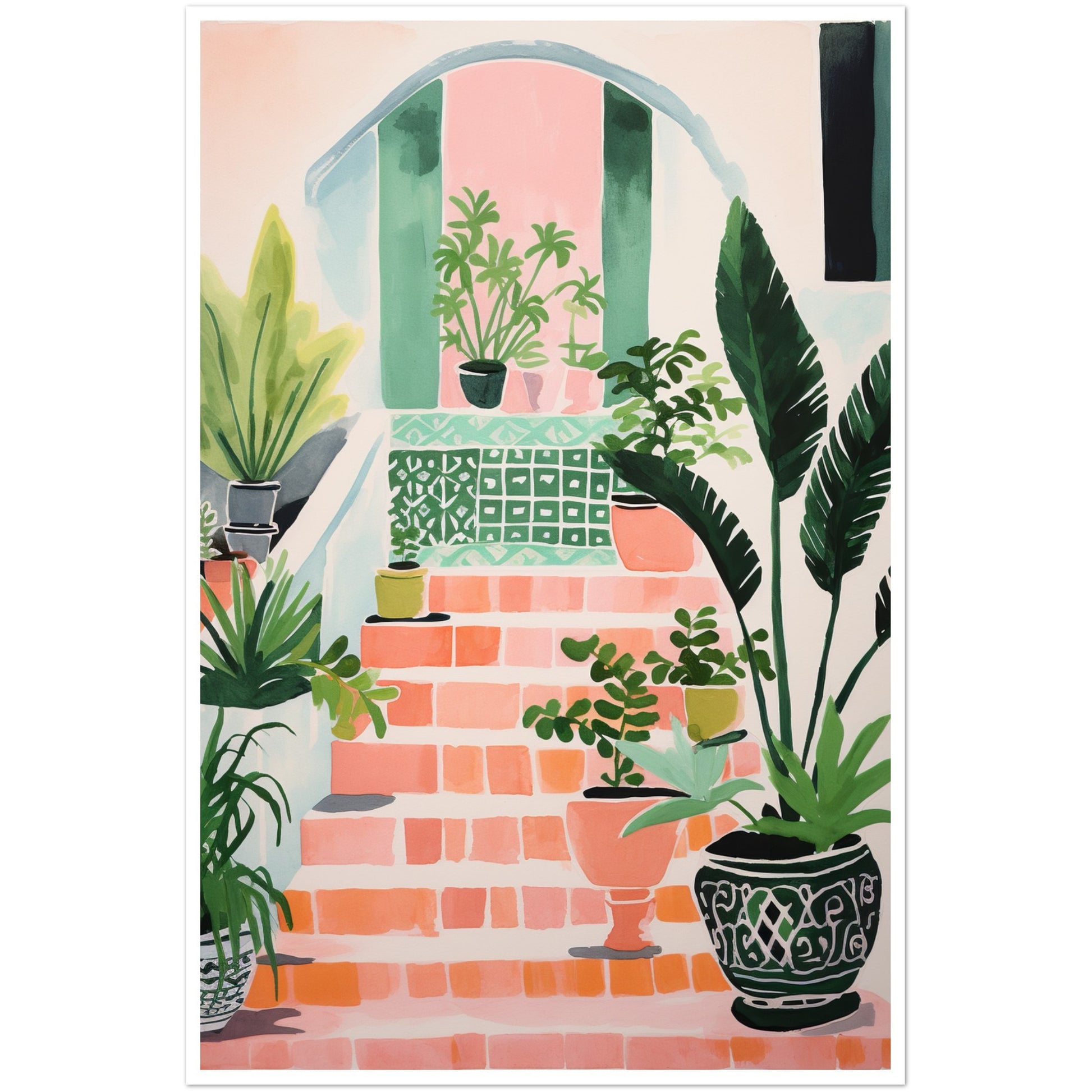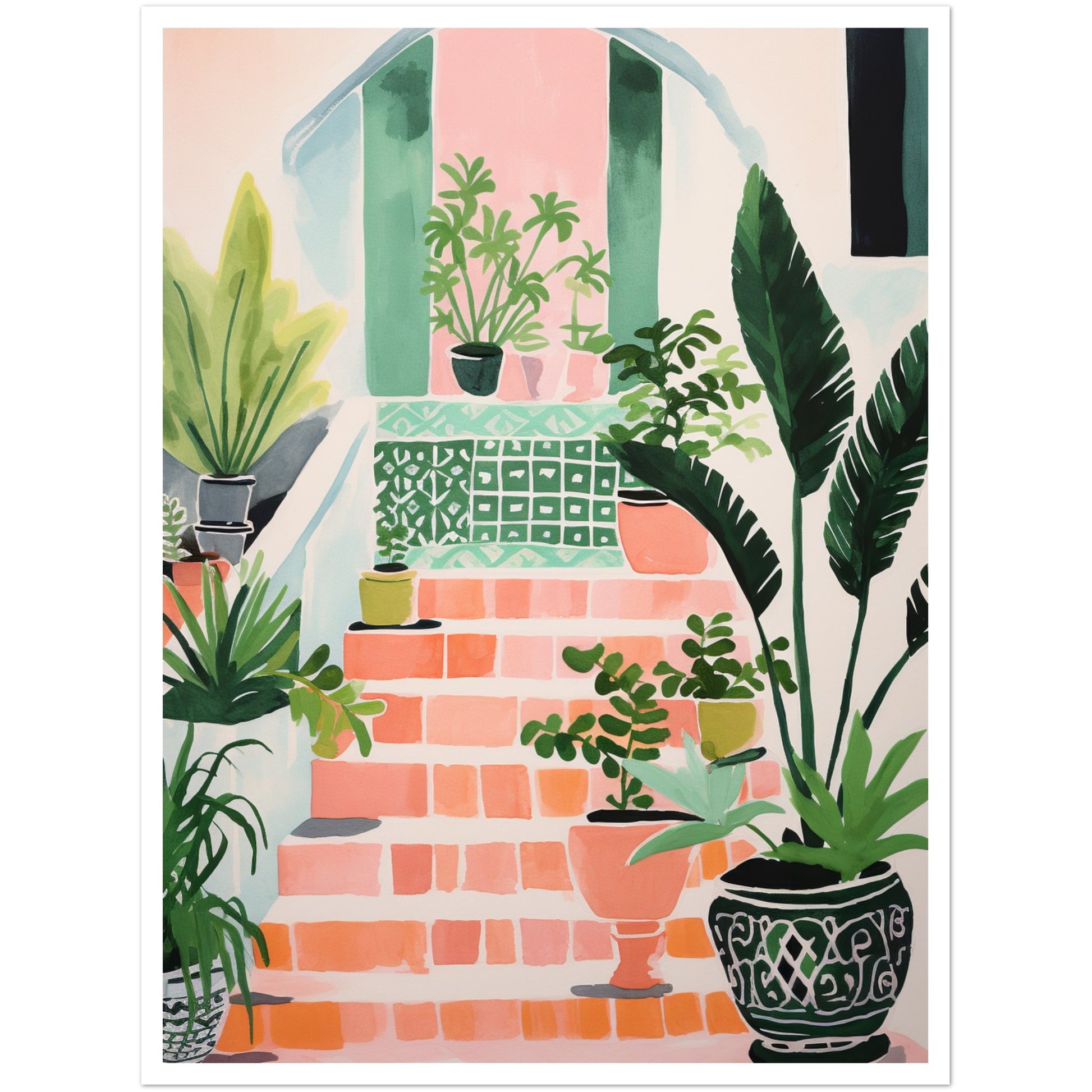Transport yourself to the enchanting world of Mediterranean charm with our "Mediterranean Villa Stairs and Vibrant Potted Plants" art print. This captivating design showcases the elegance of villa stairs adorned with vibrant potted plants, brought to life through simple, colorful, and quirky watercolor-inspired illustrations in soft pastel tones.