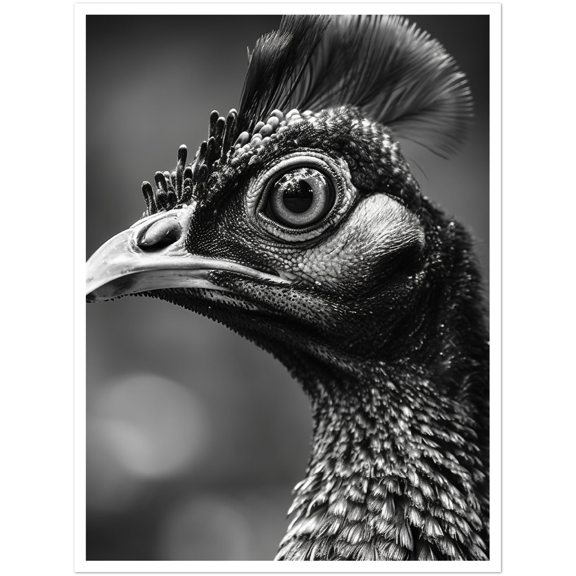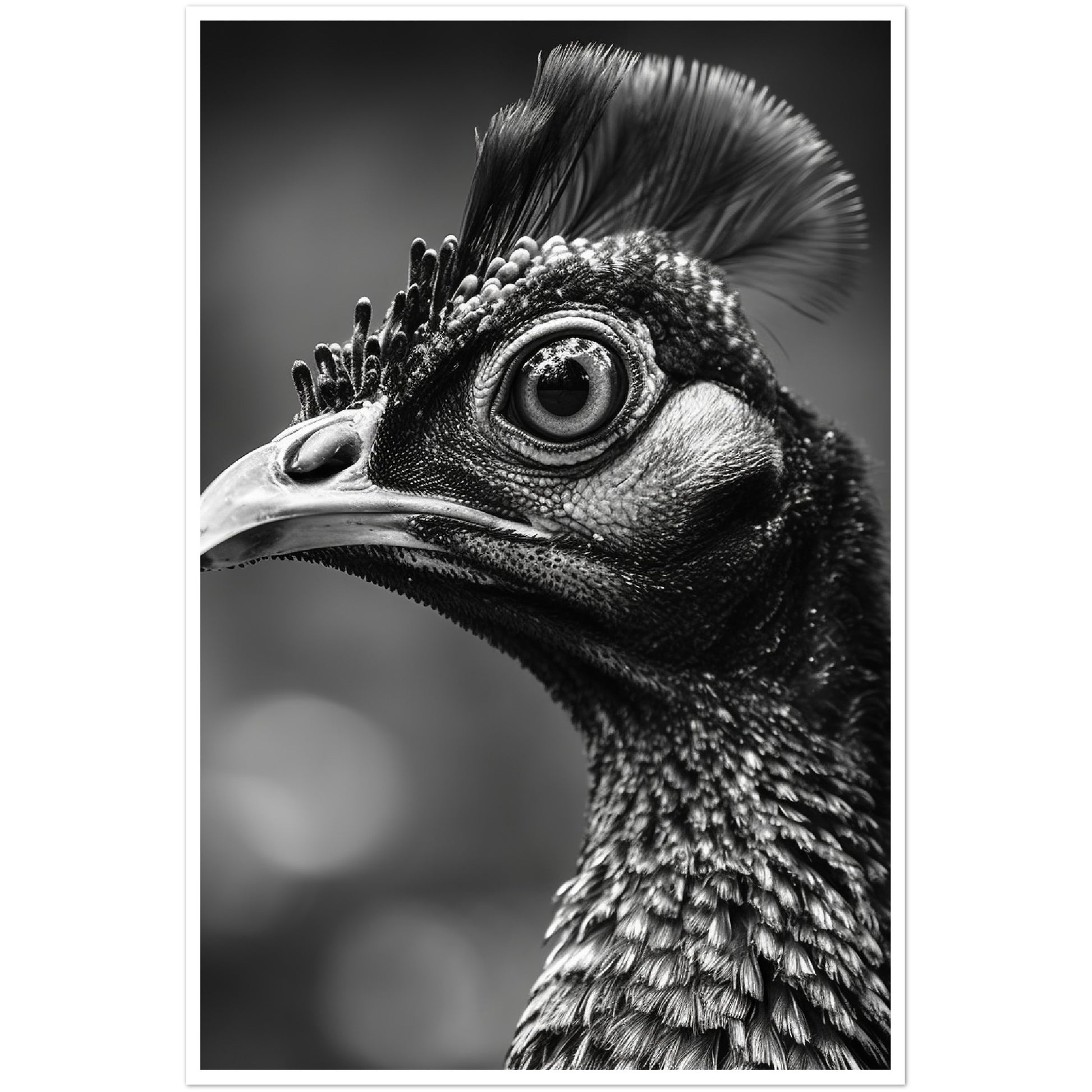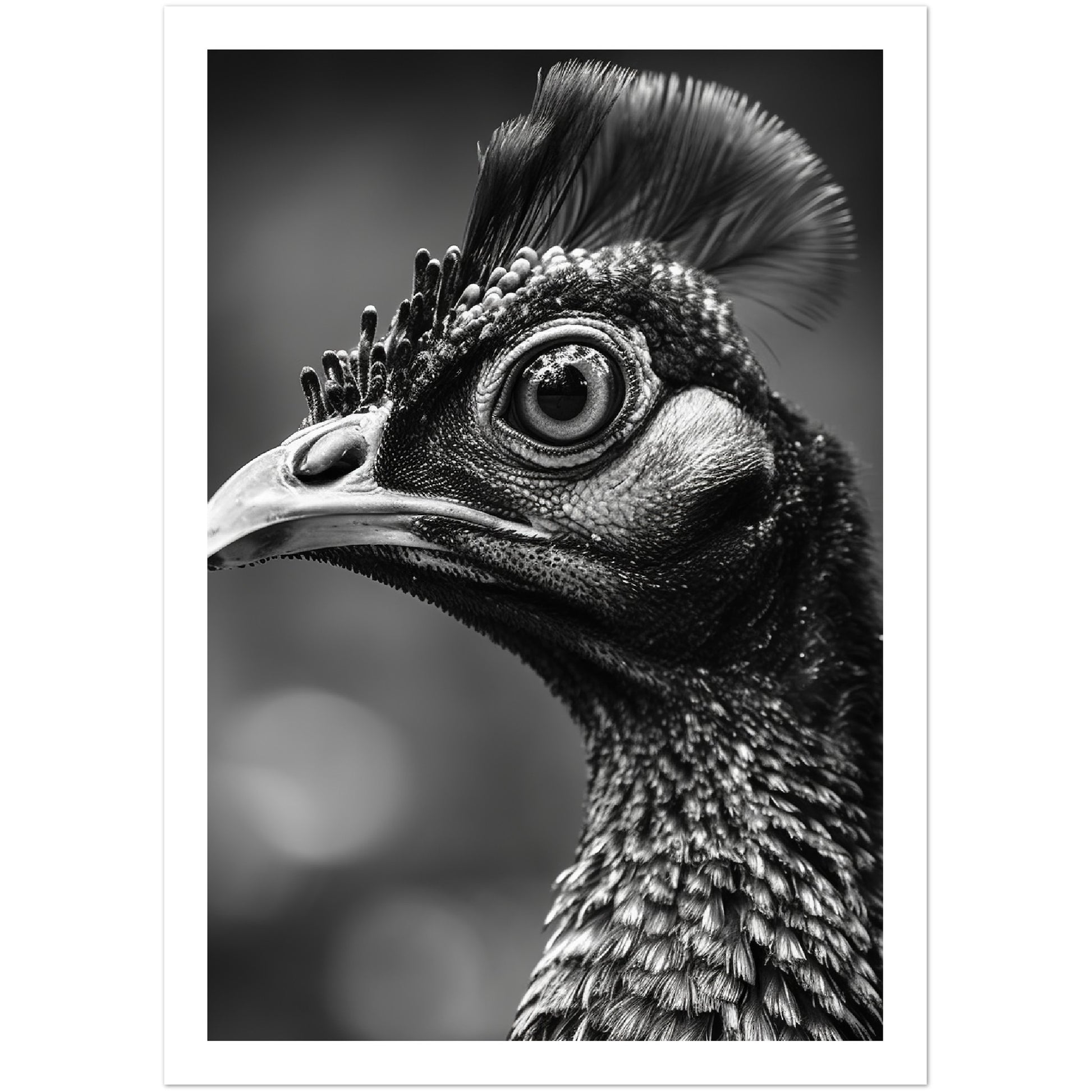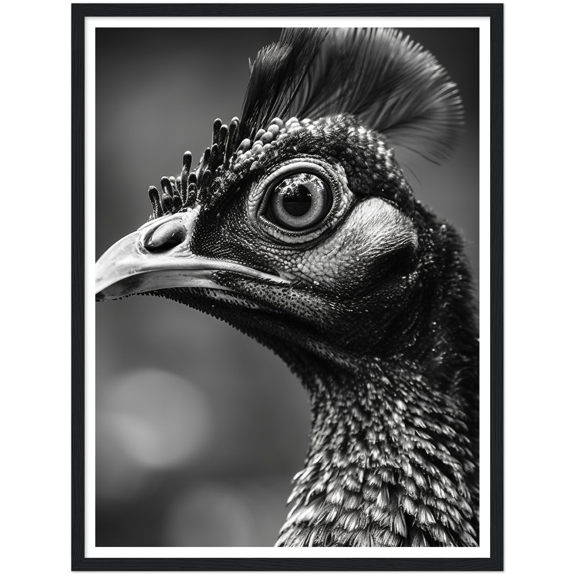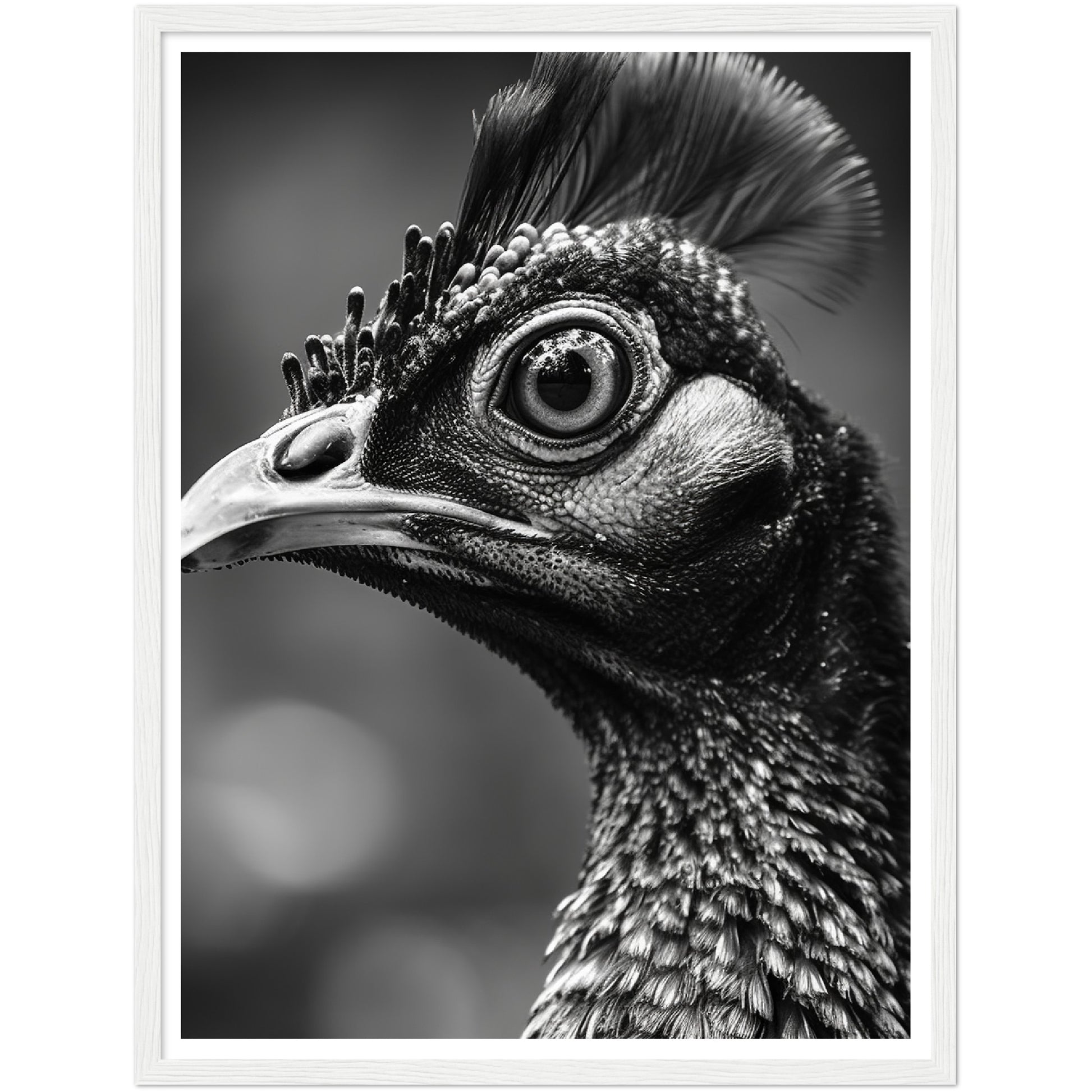 This stunning black and white photograph captures the intricate beauty of a peacock's face in a close-up, cropped composition. The intricate details of the bird's feathers and iridescent eyes are highlighted. The image is both elegant and dramatic, making it a perfect addition to any modern or traditional decor. This piece is ideal for those who appreciate the natural world and the intricate details of its creatures. It is sure to be a conversation starter.