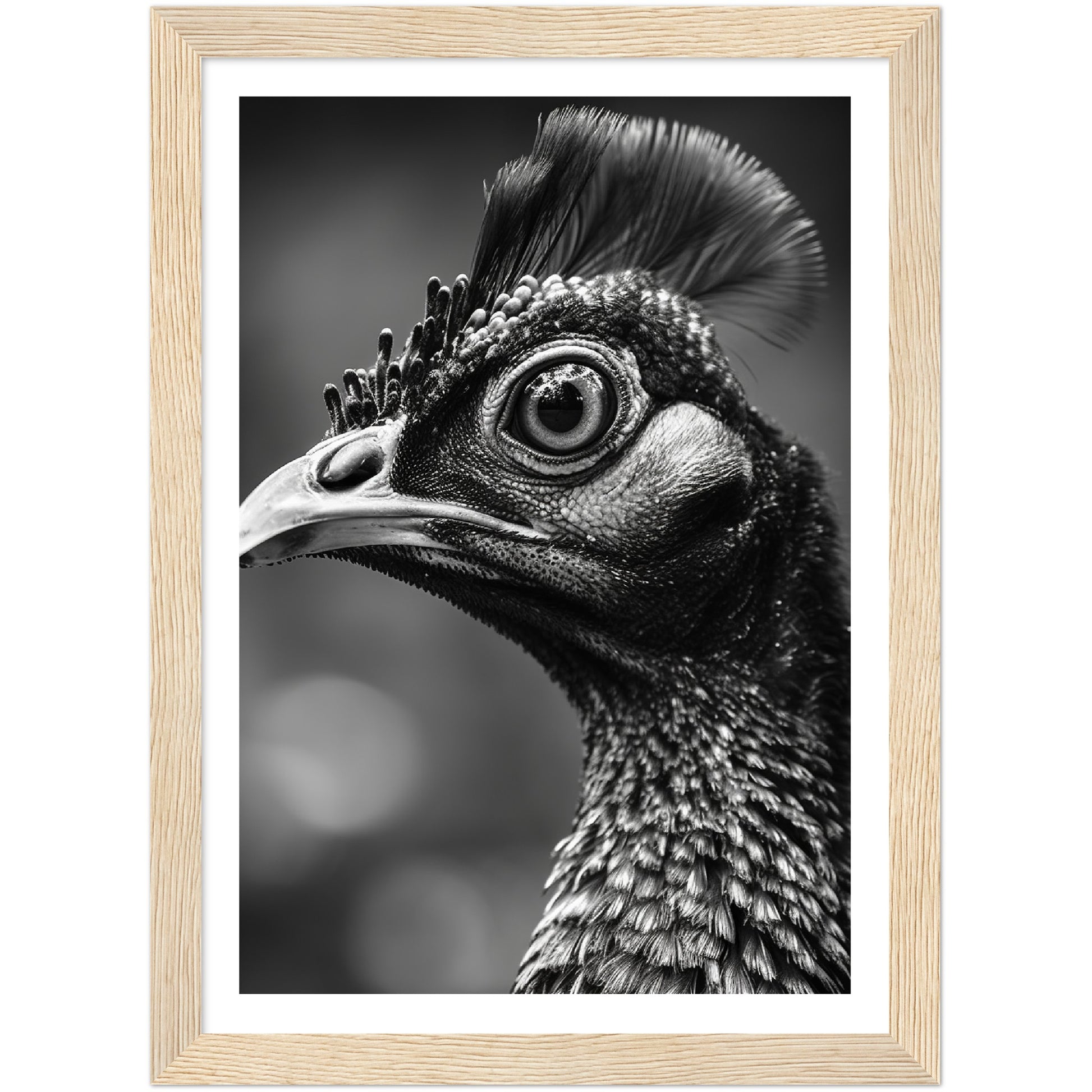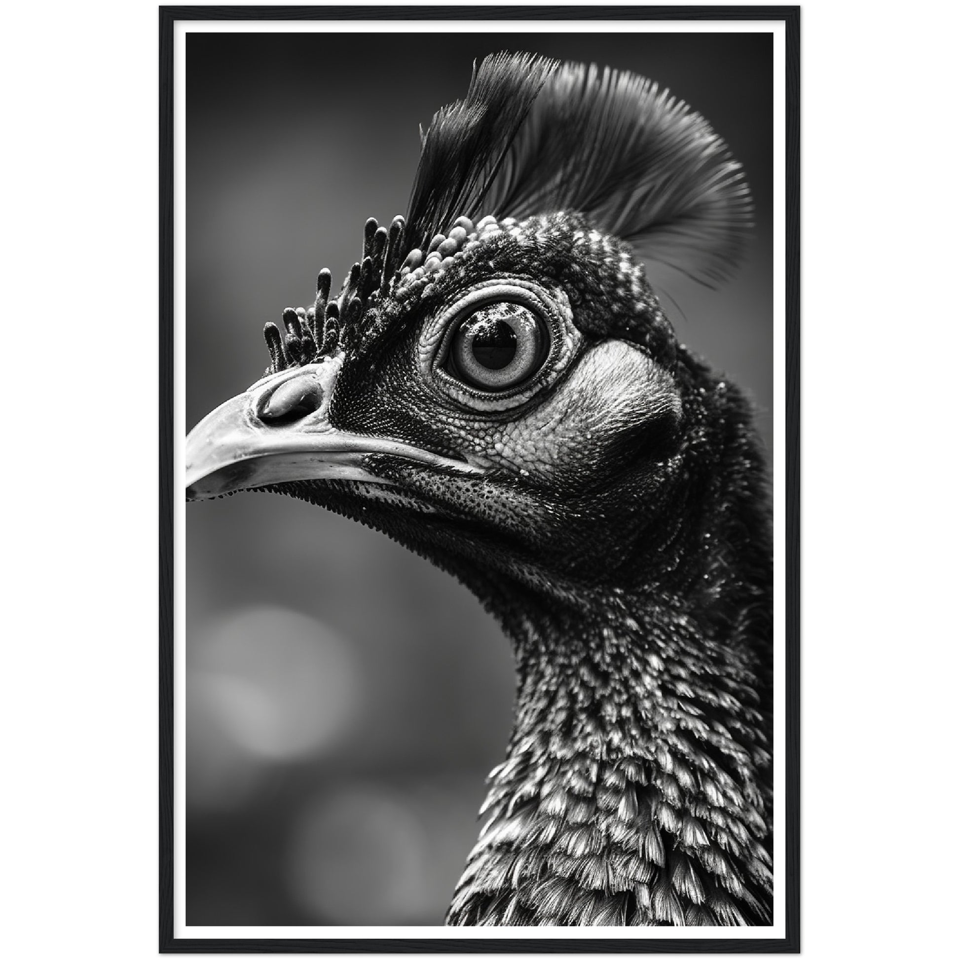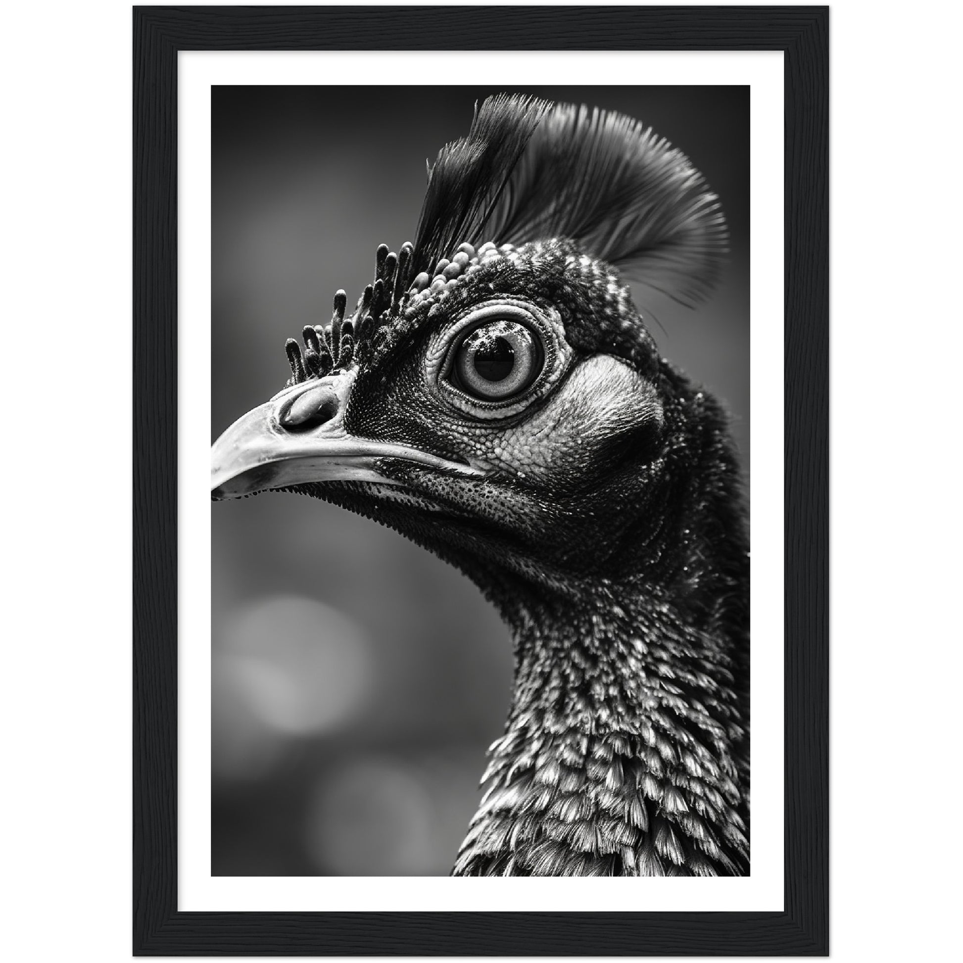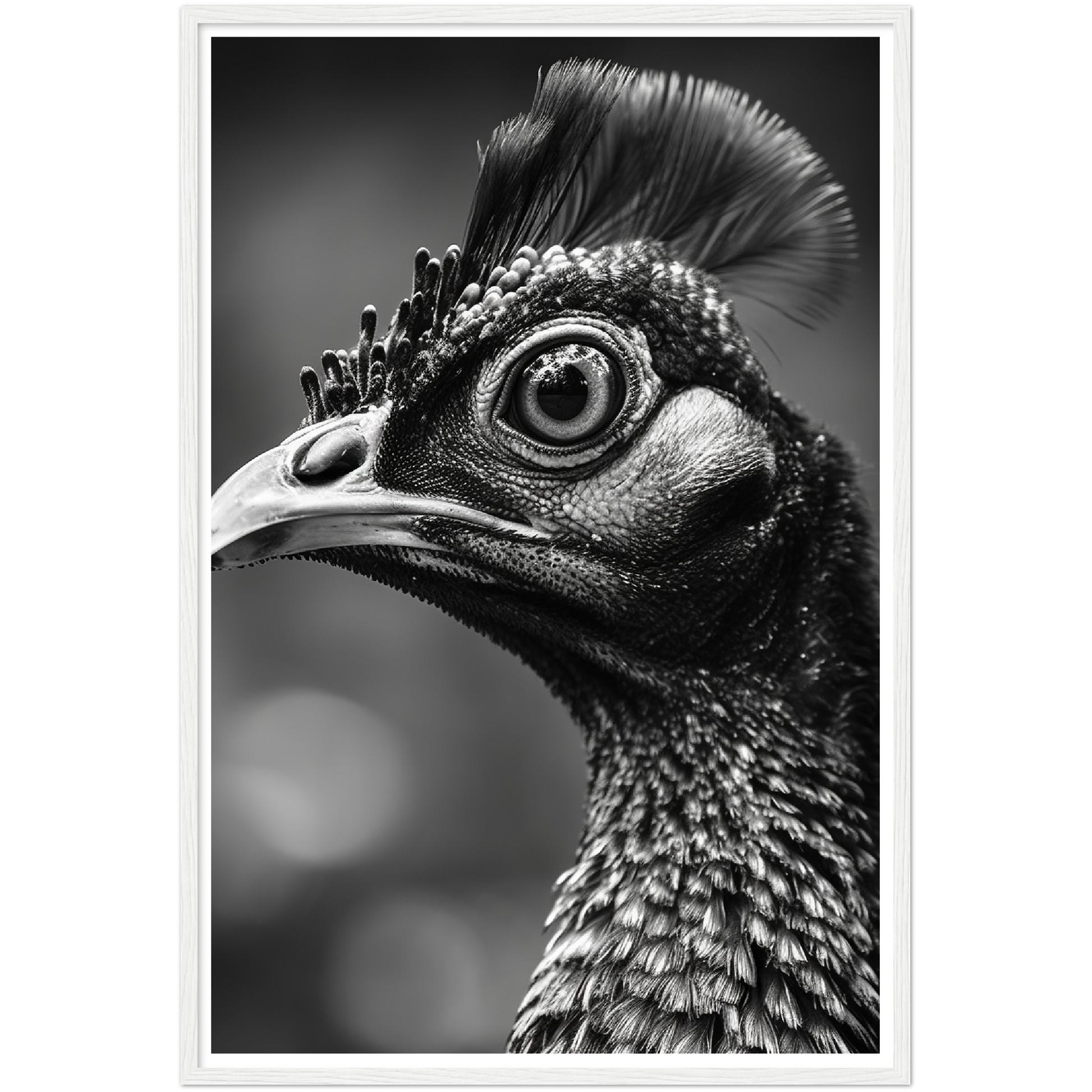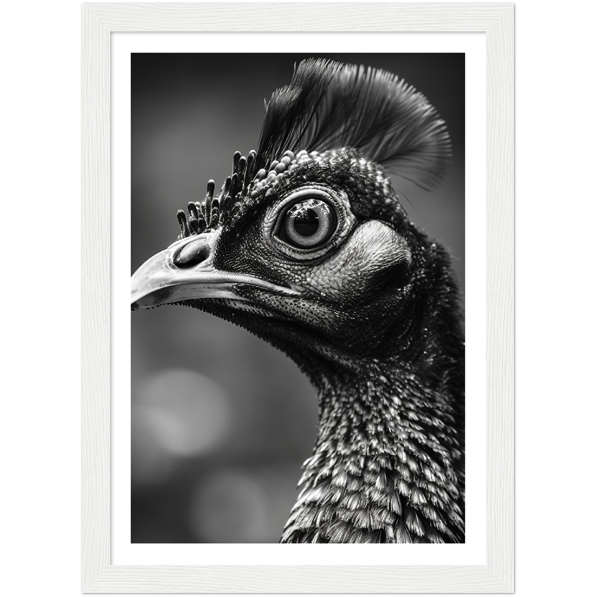 This stunning black and white photograph captures the intricate beauty of a peacock's face in a close-up, cropped composition. The intricate details of the bird's feathers and iridescent eyes are highlighted. The image is both elegant and dramatic, making it a perfect addition to any modern or traditional decor. This piece is ideal for those who appreciate the natural world and the intricate details of its creatures. It is sure to be a conversation starter.
