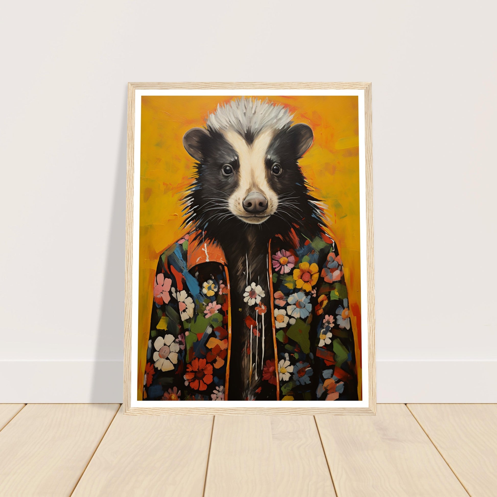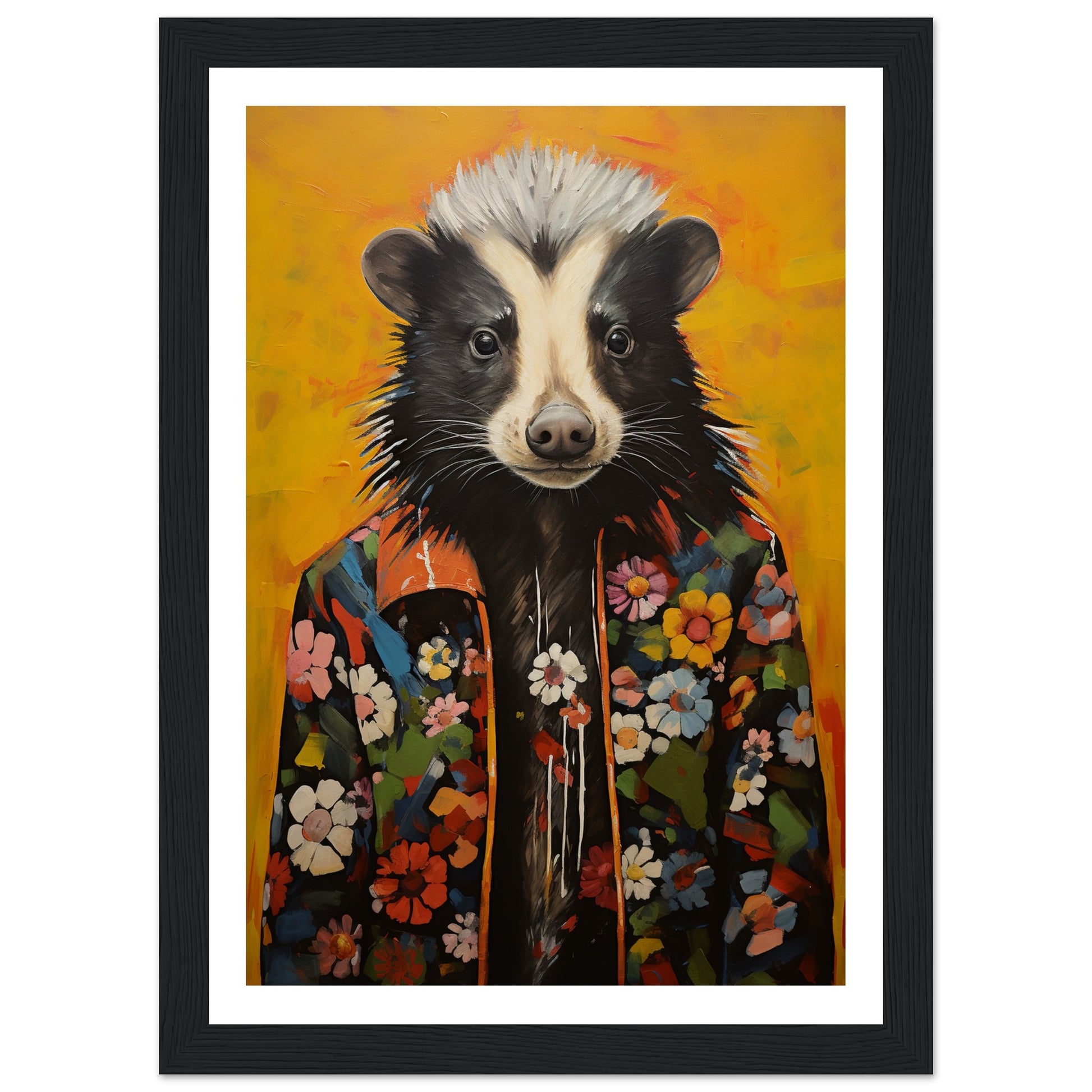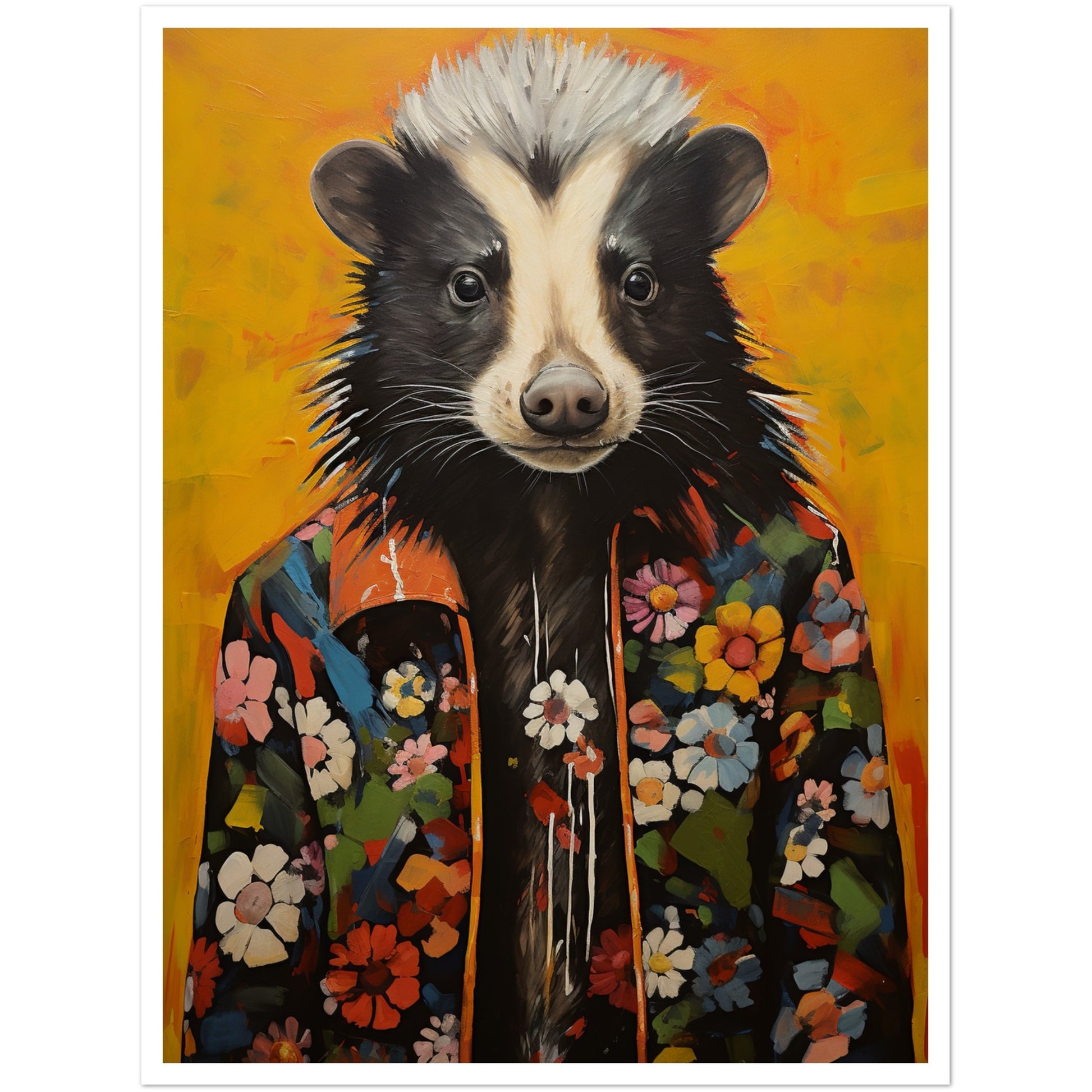 Imagine a skunk like you've never seen before, dressed to impress in a vibrant flower power jacket and decked out with all the hippest hippy accessories. This whimsical portrait effortlessly blends style with a naturalist aesthetic, capturing the spirit of an era when peace, love, and freedom were all the rage.