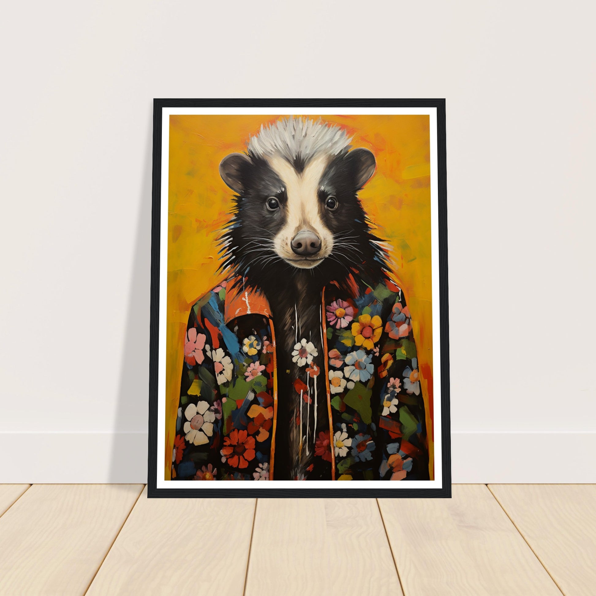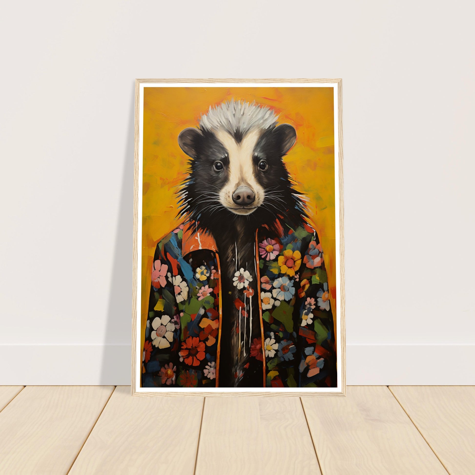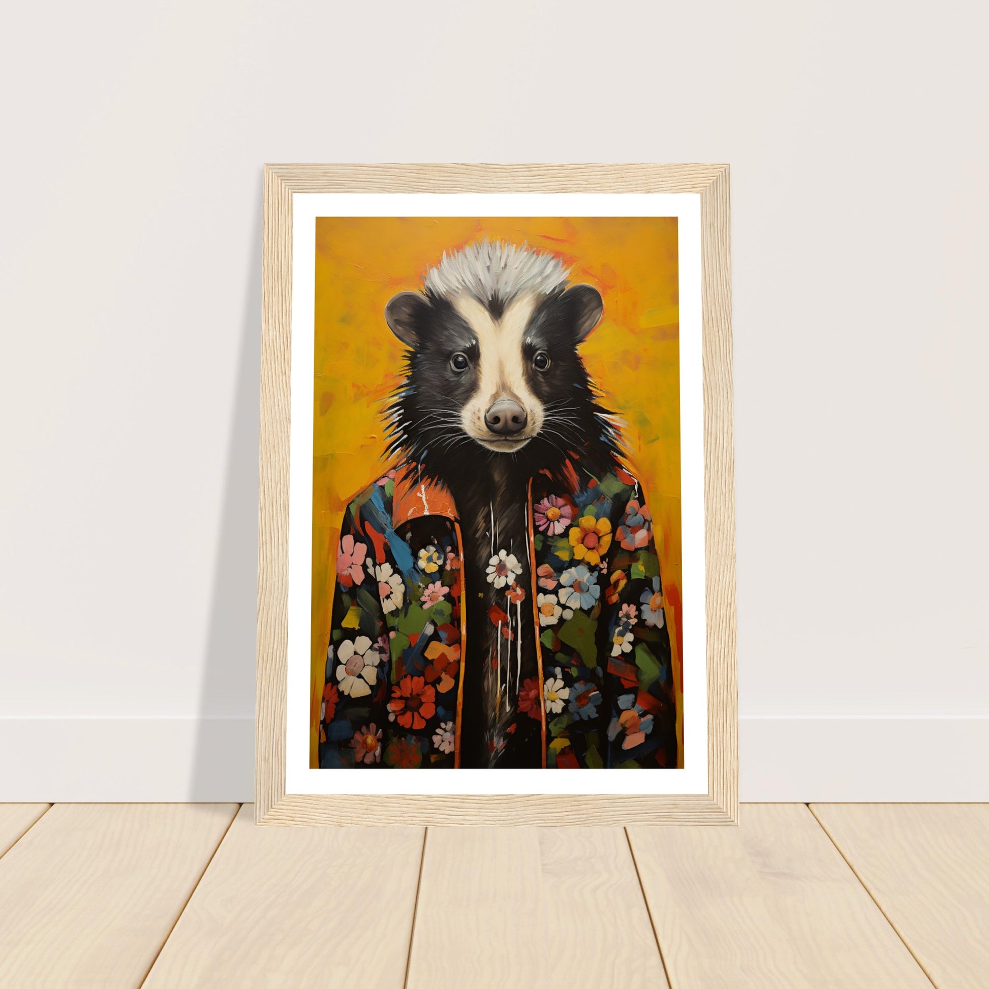 Imagine a skunk like you've never seen before, dressed to impress in a vibrant flower power jacket and decked out with all the hippest hippy accessories. This whimsical portrait effortlessly blends style with a naturalist aesthetic, capturing the spirit of an era when peace, love, and freedom were all the rage.
