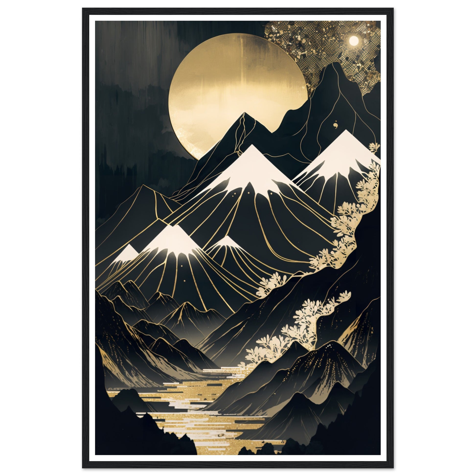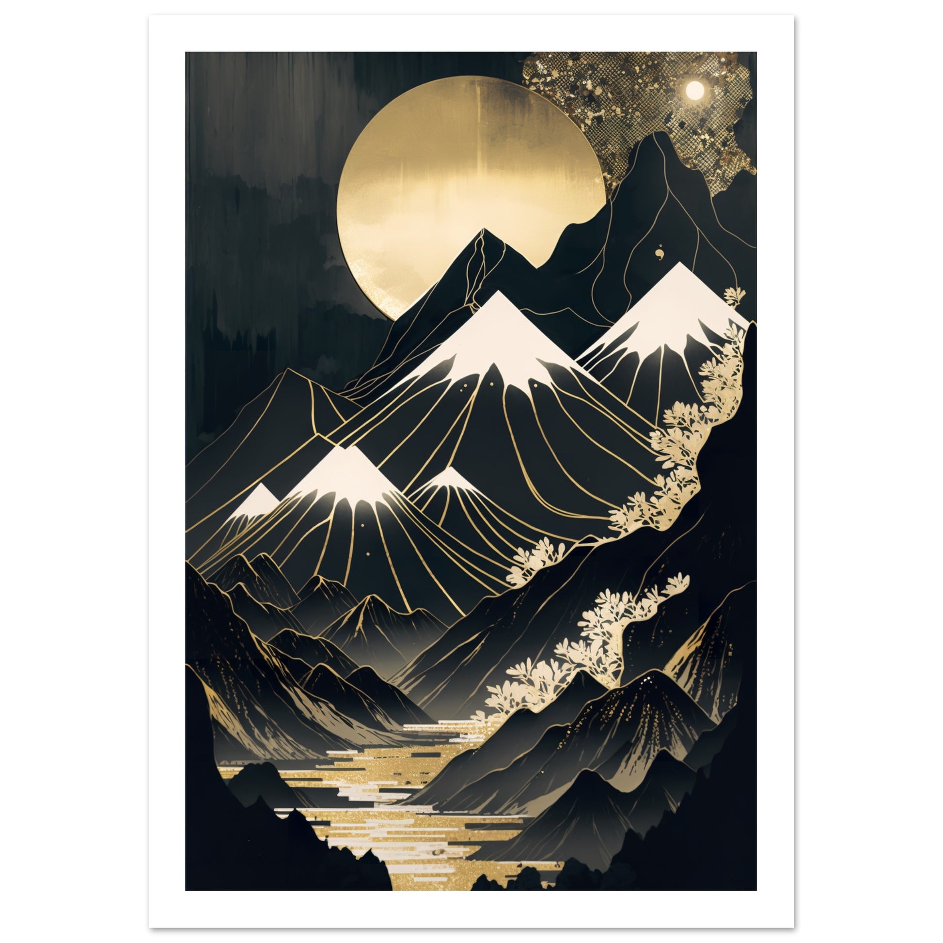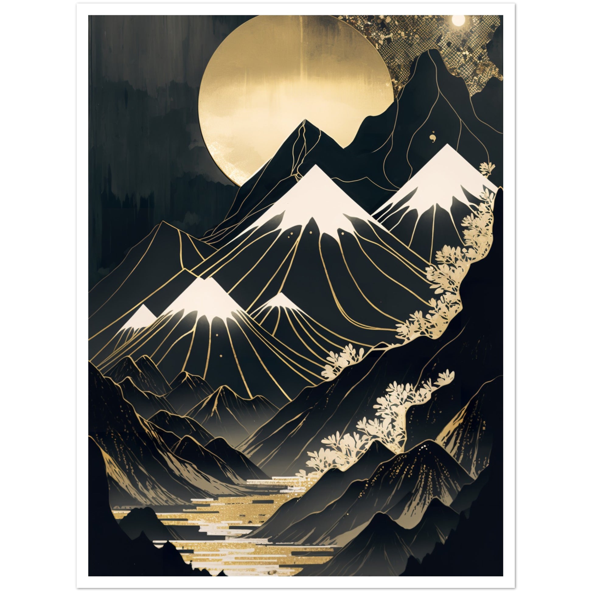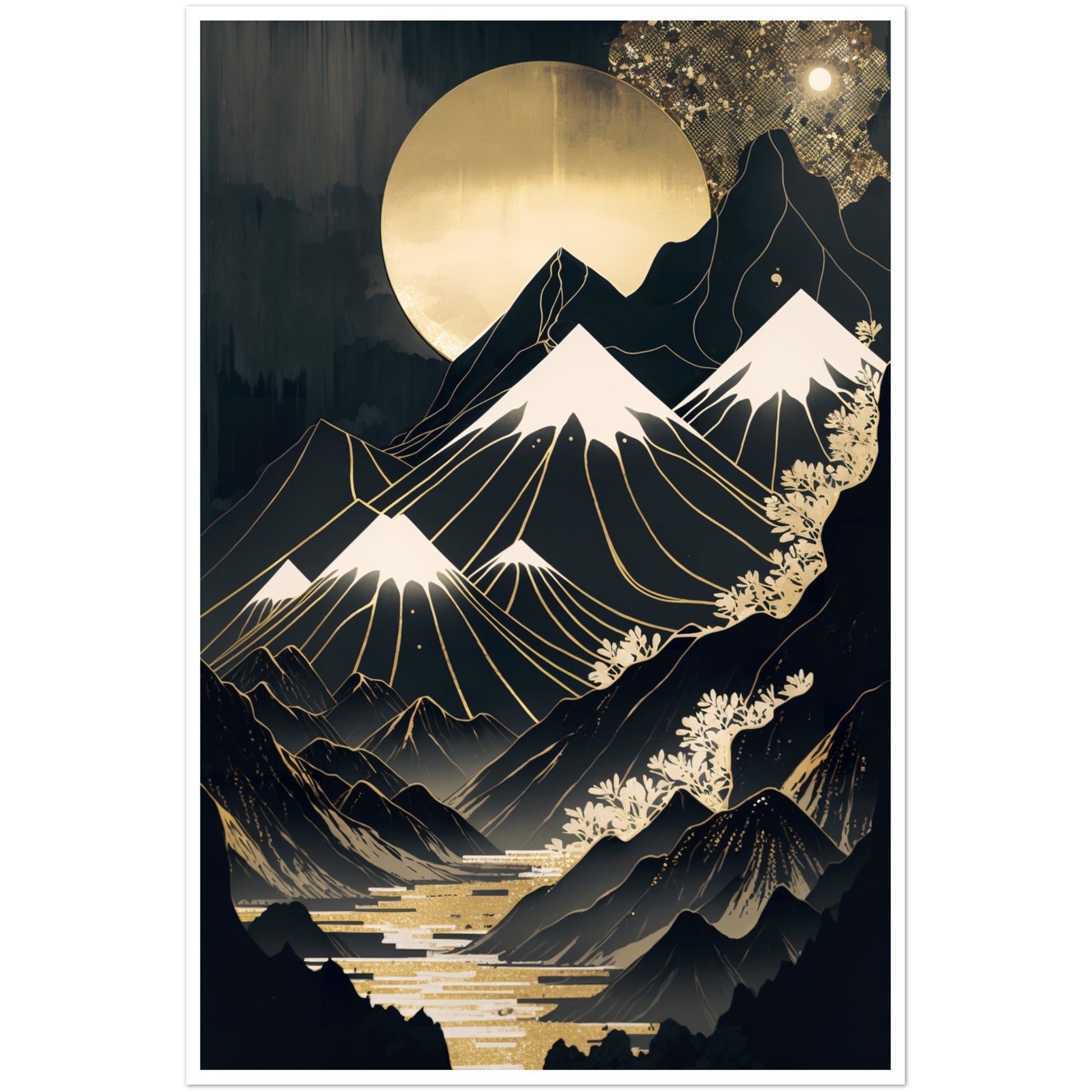 This artwork showcases dark mountainous vistas illuminated by a golden sun, accentuated with shiny gold accents. The combination of the dark tones and shimmering gold creates a mystical and enchanting atmosphere. Immerse yourself in the beauty of the twilight hours, where the mountains come alive with a captivating allure.