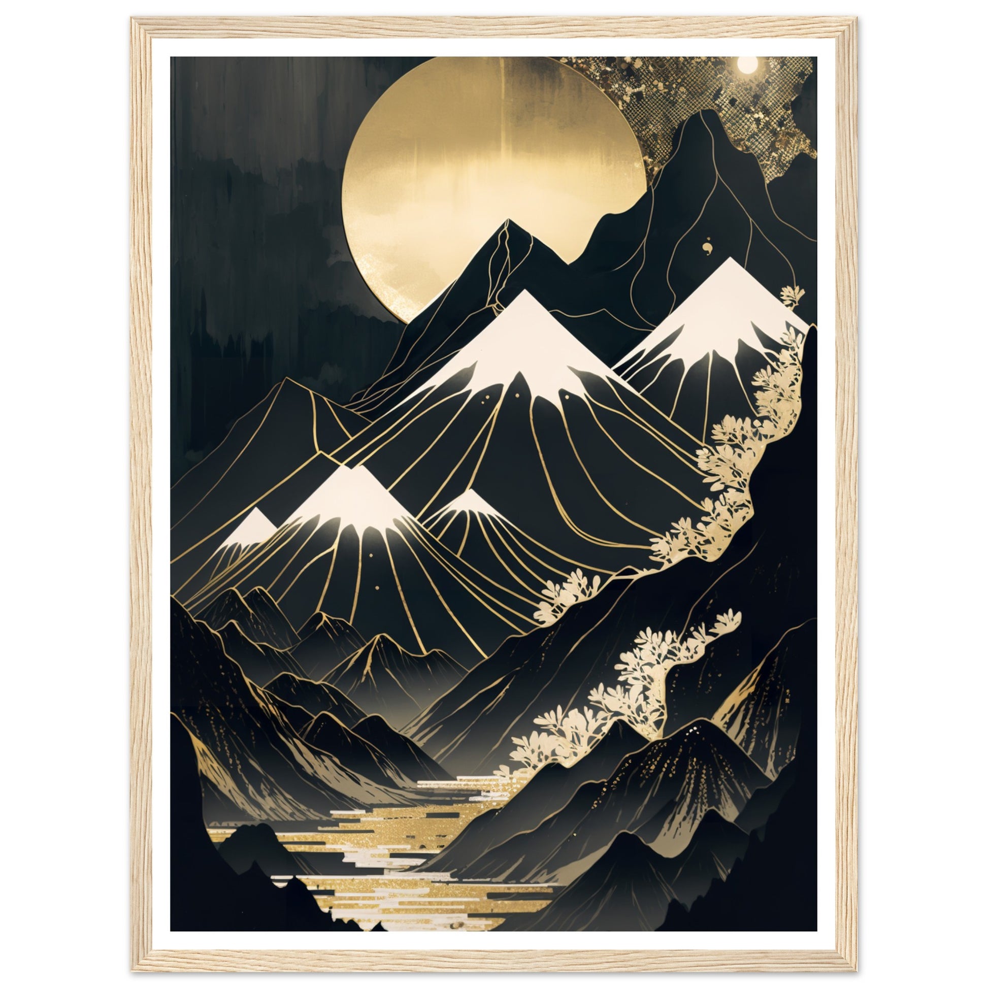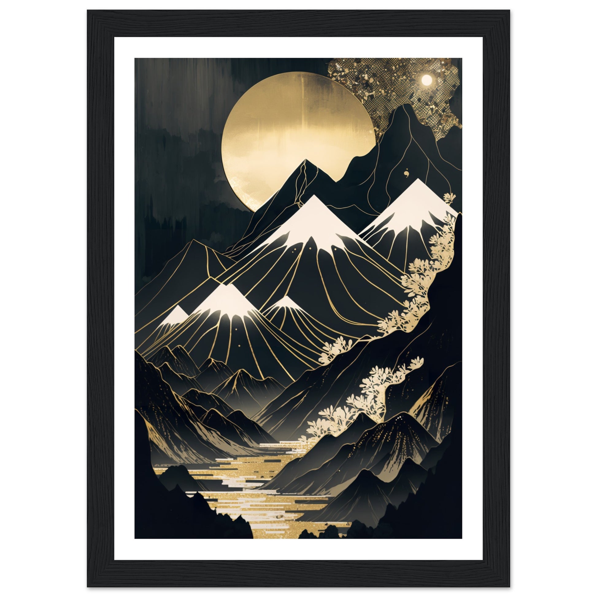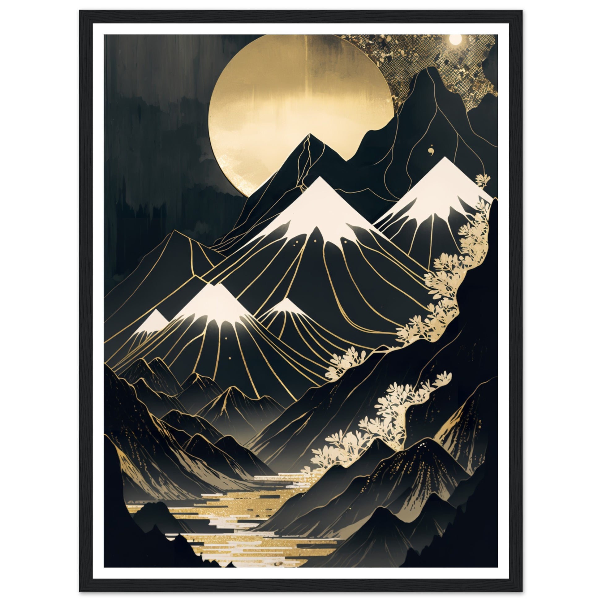 This artwork showcases dark mountainous vistas illuminated by a golden sun, accentuated with shiny gold accents. The combination of the dark tones and shimmering gold creates a mystical and enchanting atmosphere. Immerse yourself in the beauty of the twilight hours, where the mountains come alive with a captivating allure.