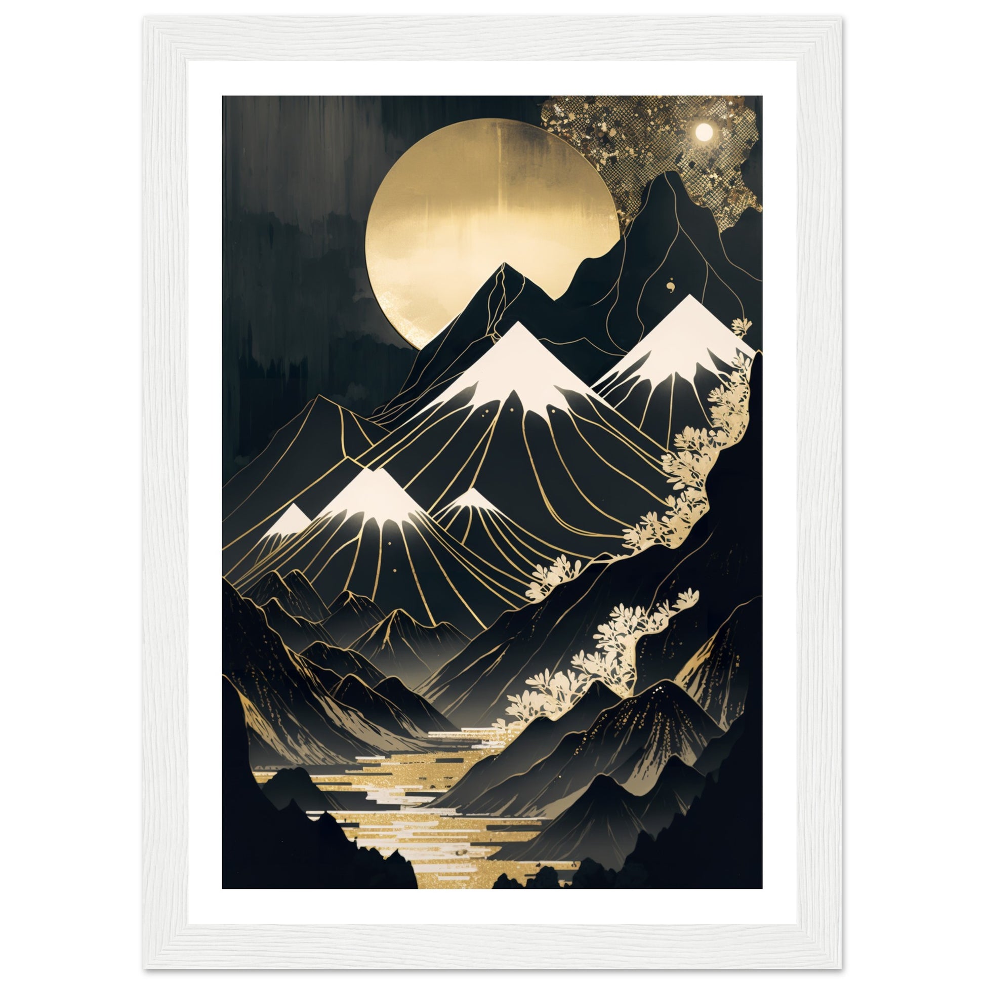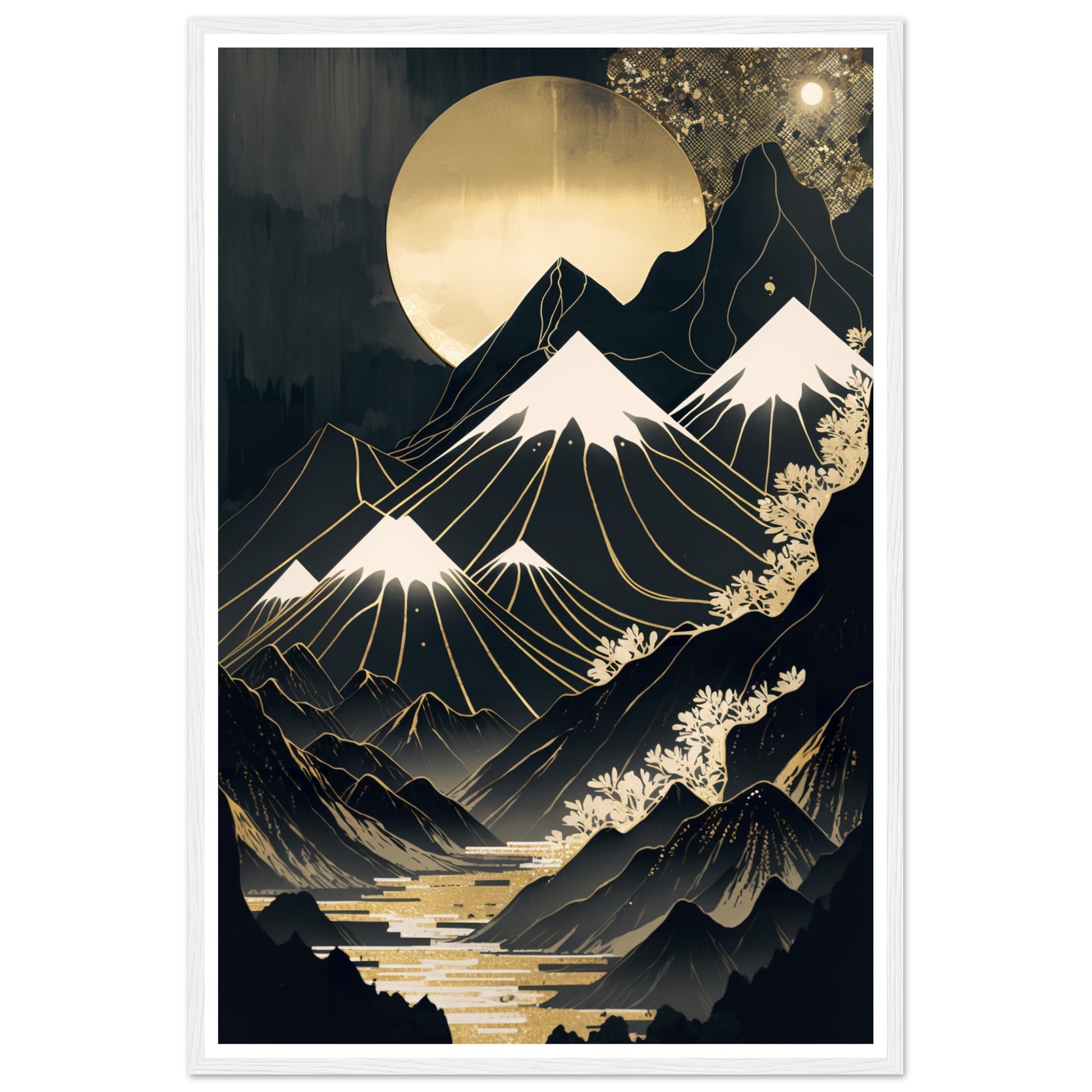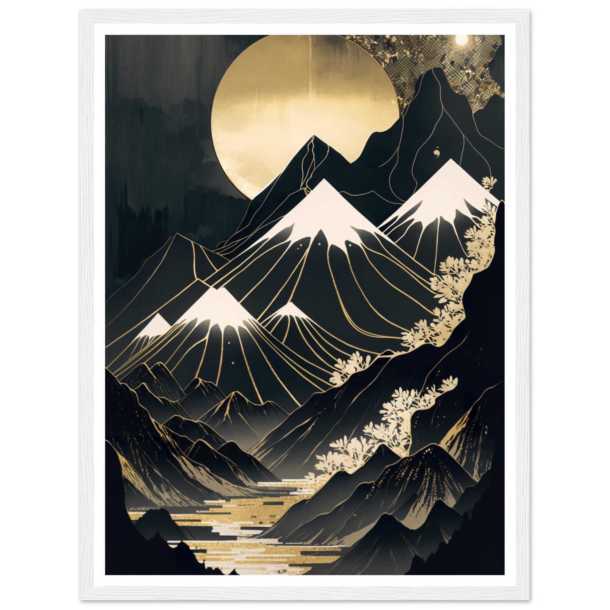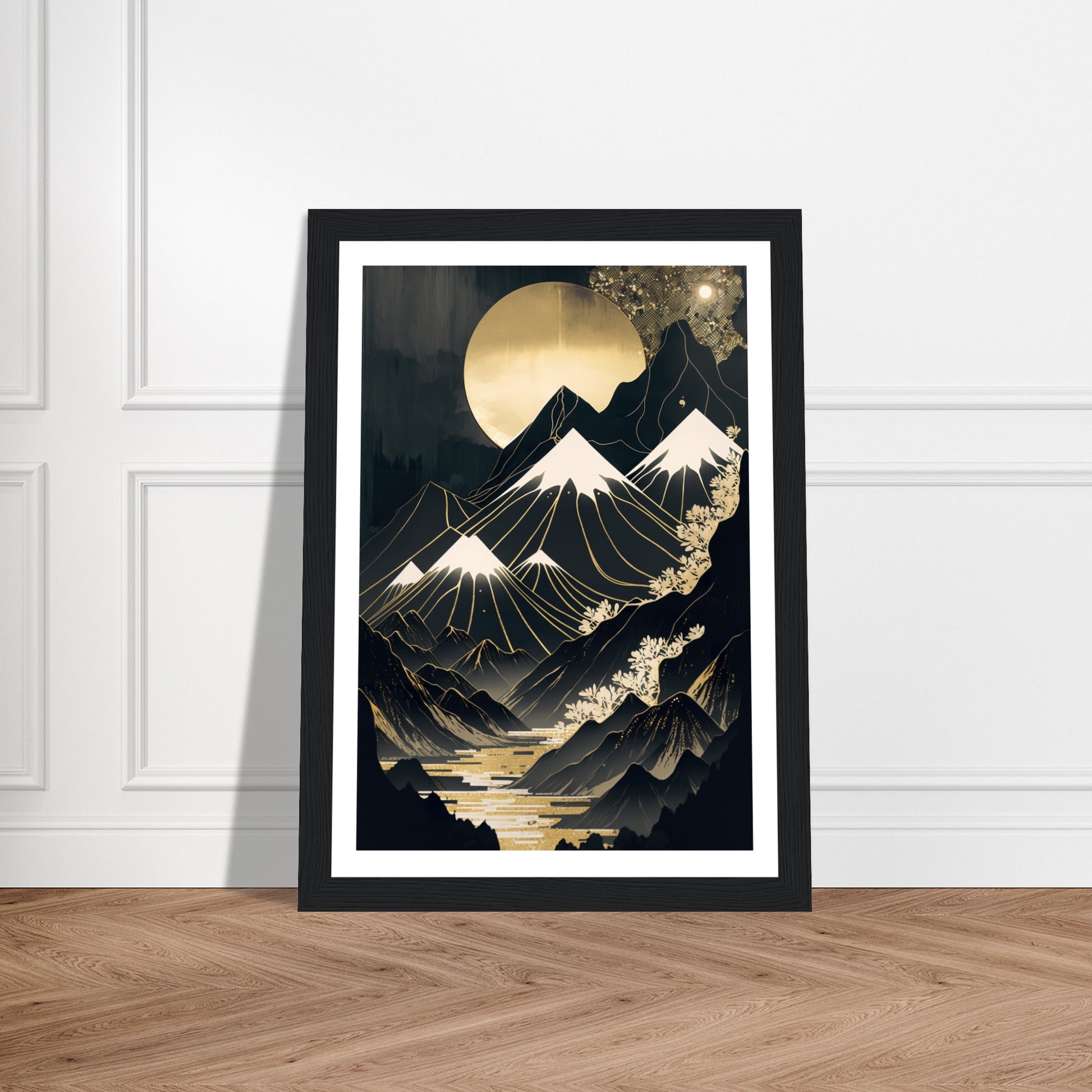 This artwork showcases dark mountainous vistas illuminated by a golden sun, accentuated with shiny gold accents. The combination of the dark tones and shimmering gold creates a mystical and enchanting atmosphere. Immerse yourself in the beauty of the twilight hours, where the mountains come alive with a captivating allure.