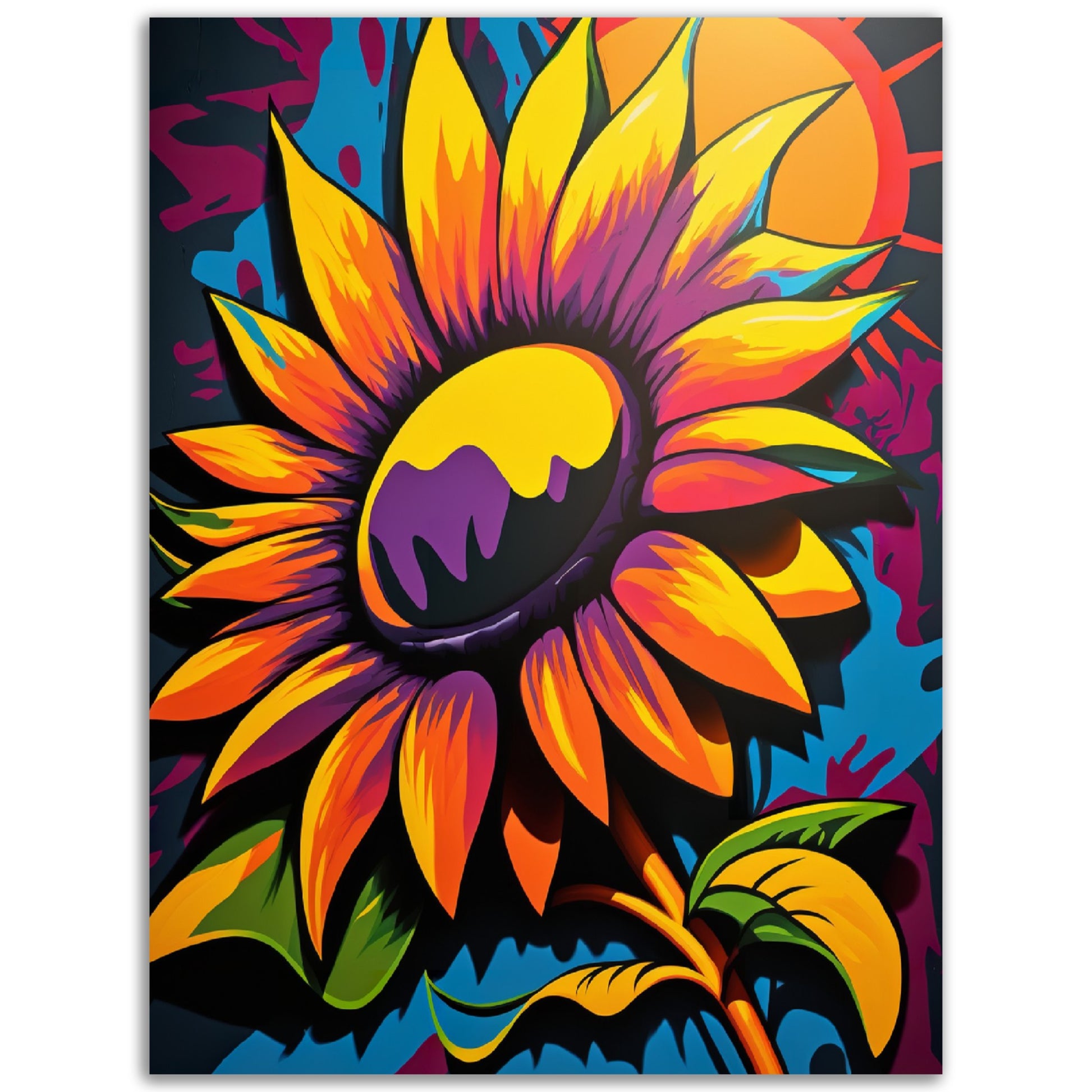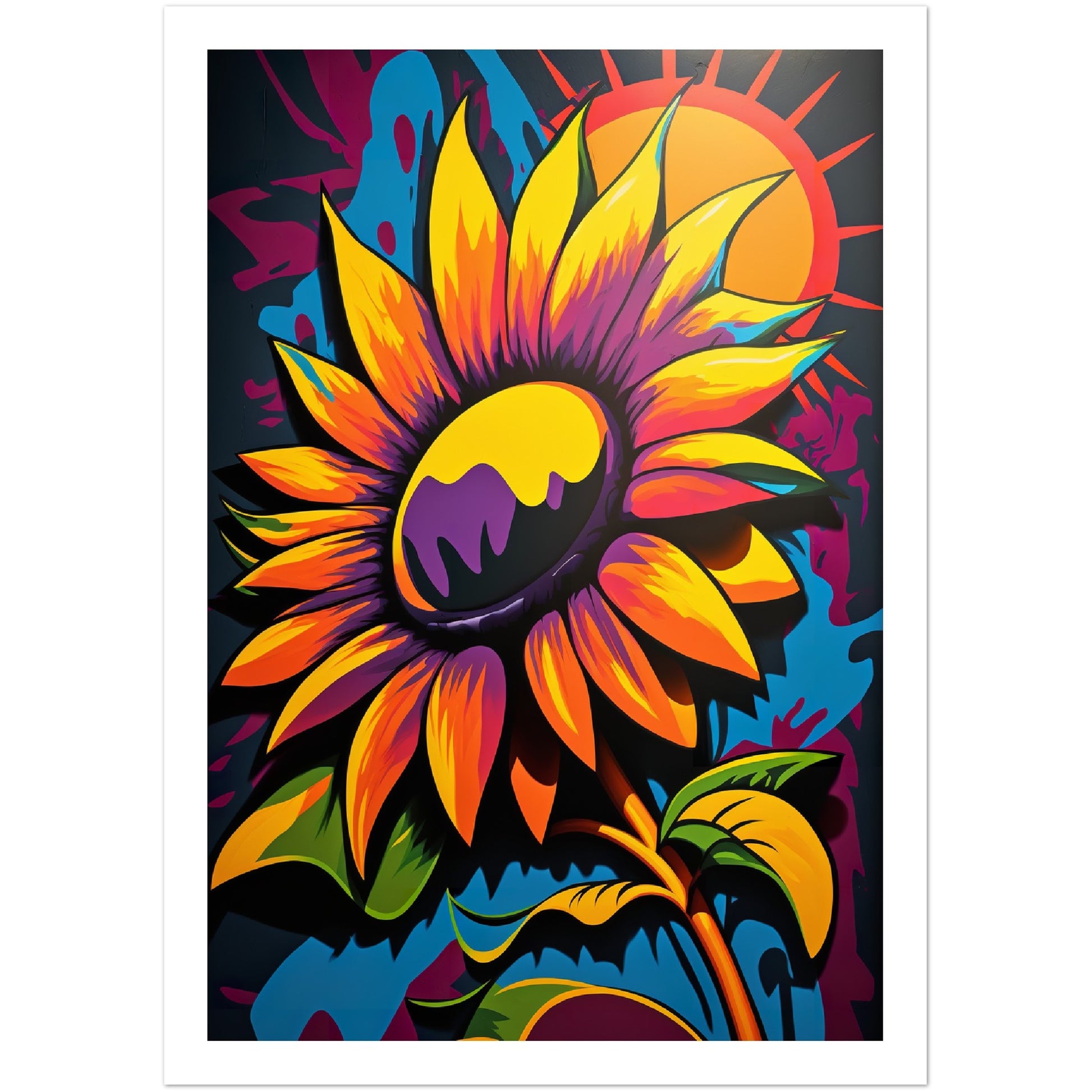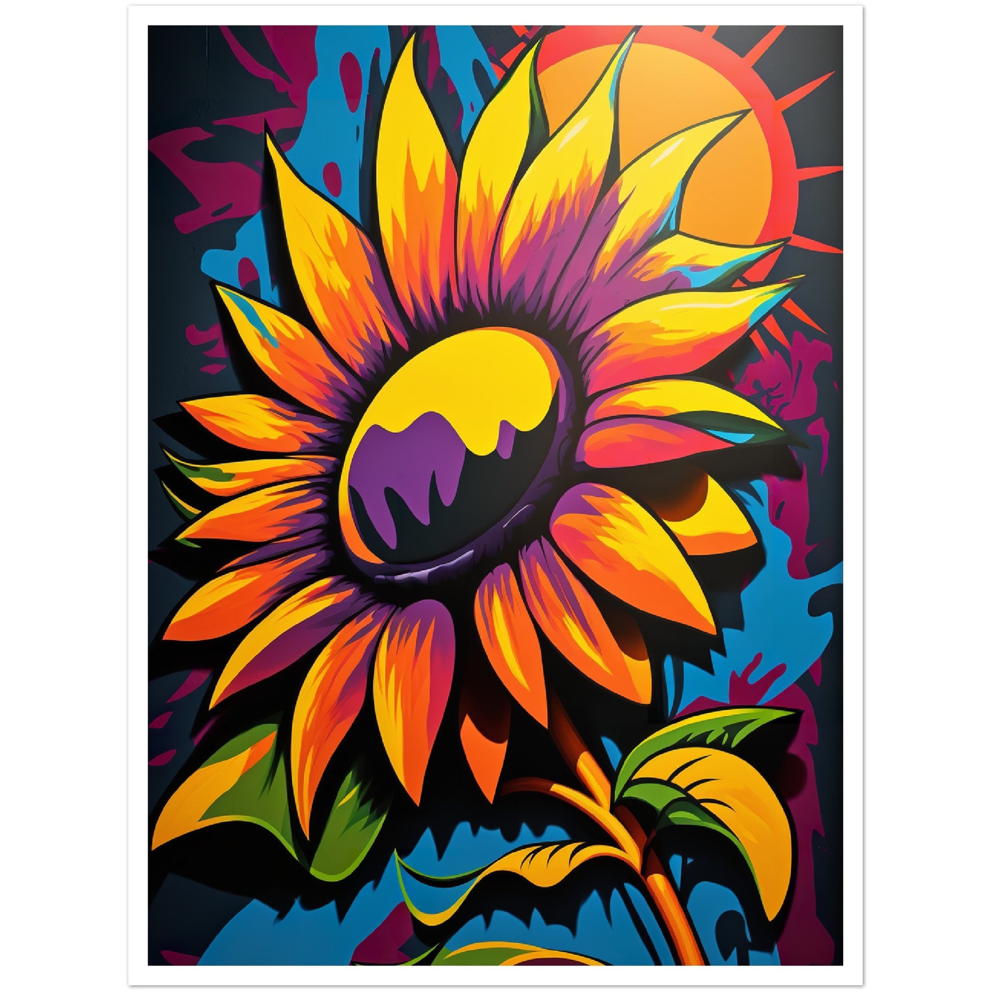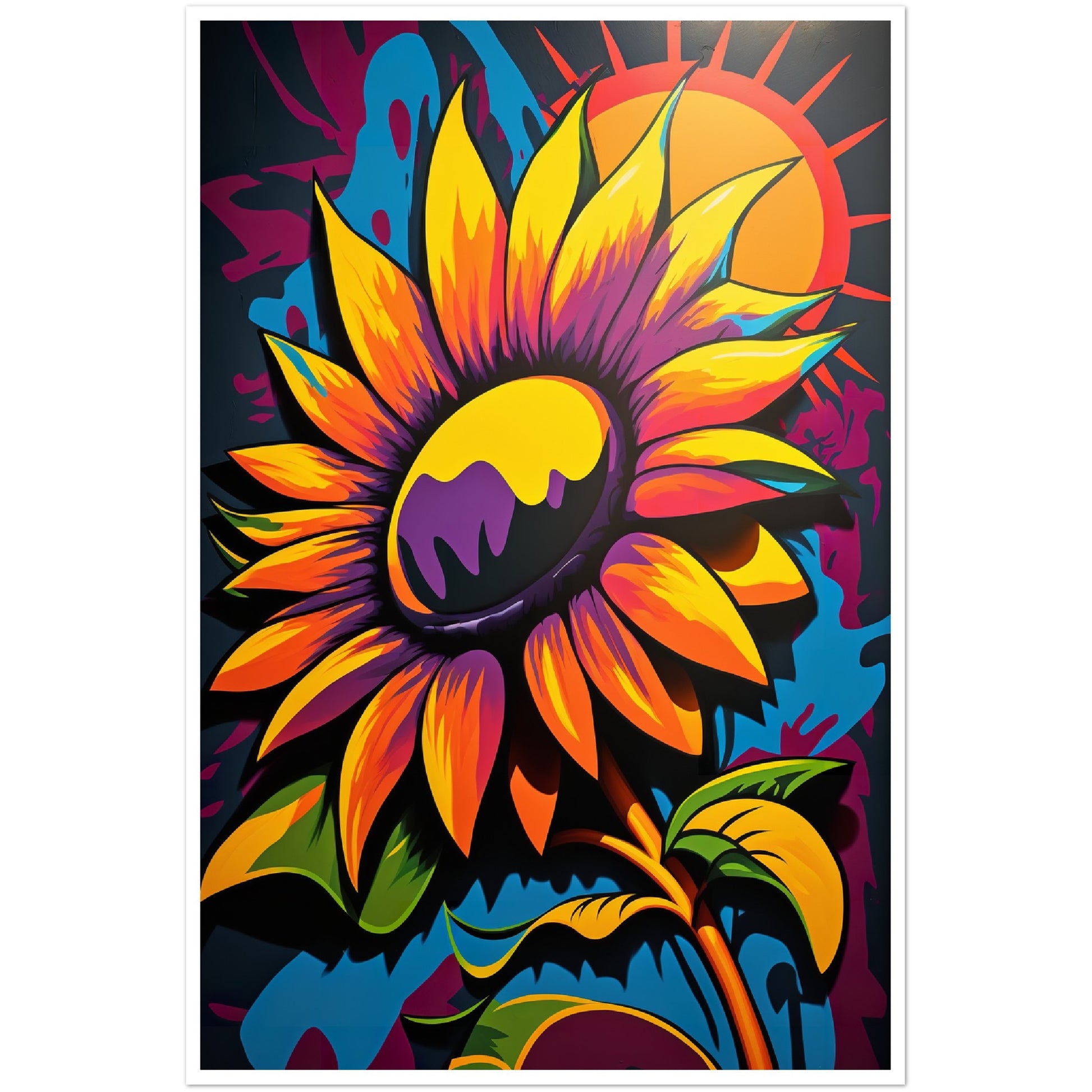 This vibrant graffiti inspired illustration features a stunning sunflower in all its glory. The bold colors and abstract shapes in the background add to the energy and movement of the piece. The attention to detail and use of contrasting colors make this artwork truly stand out. Perfect for adding a pop of color and personality to any space.