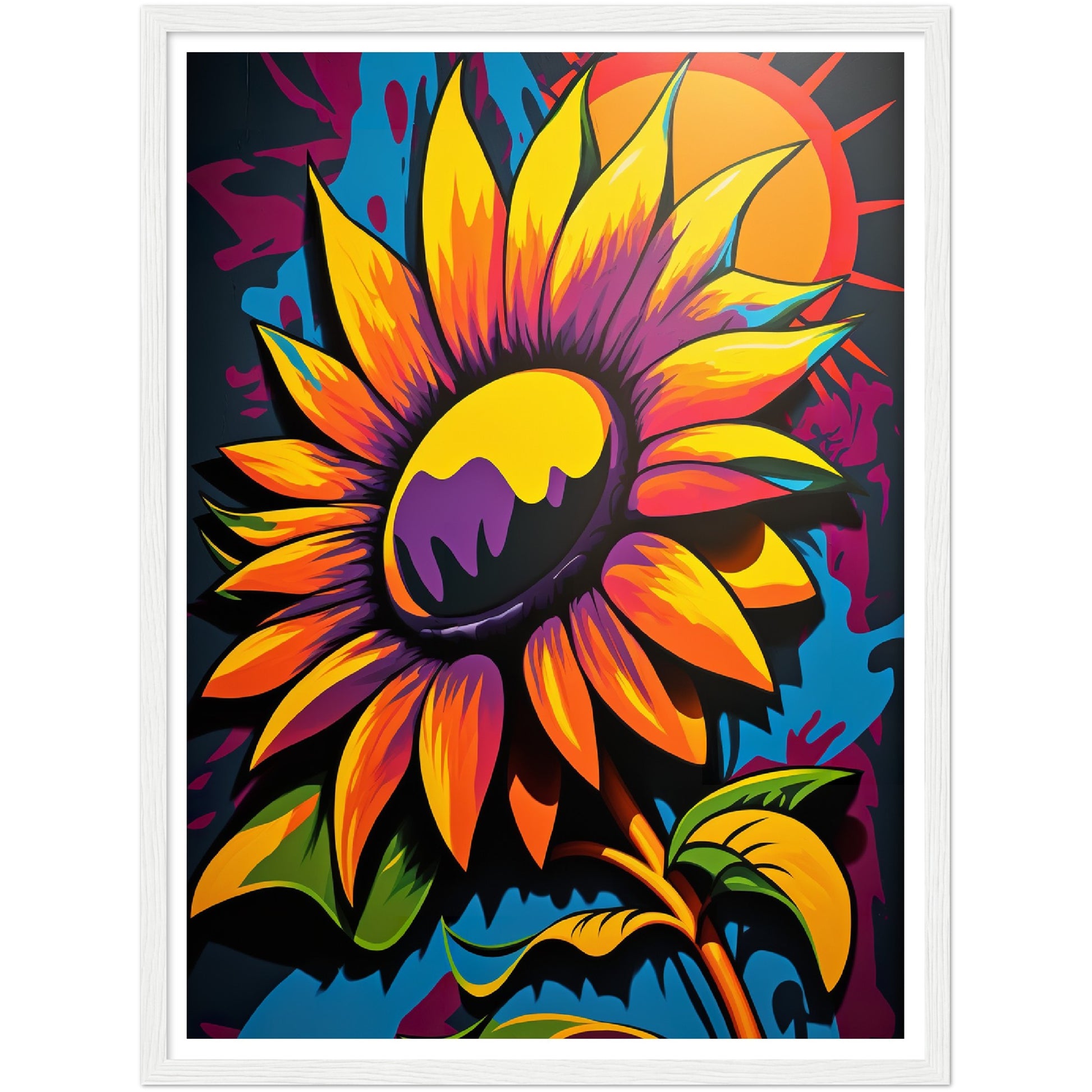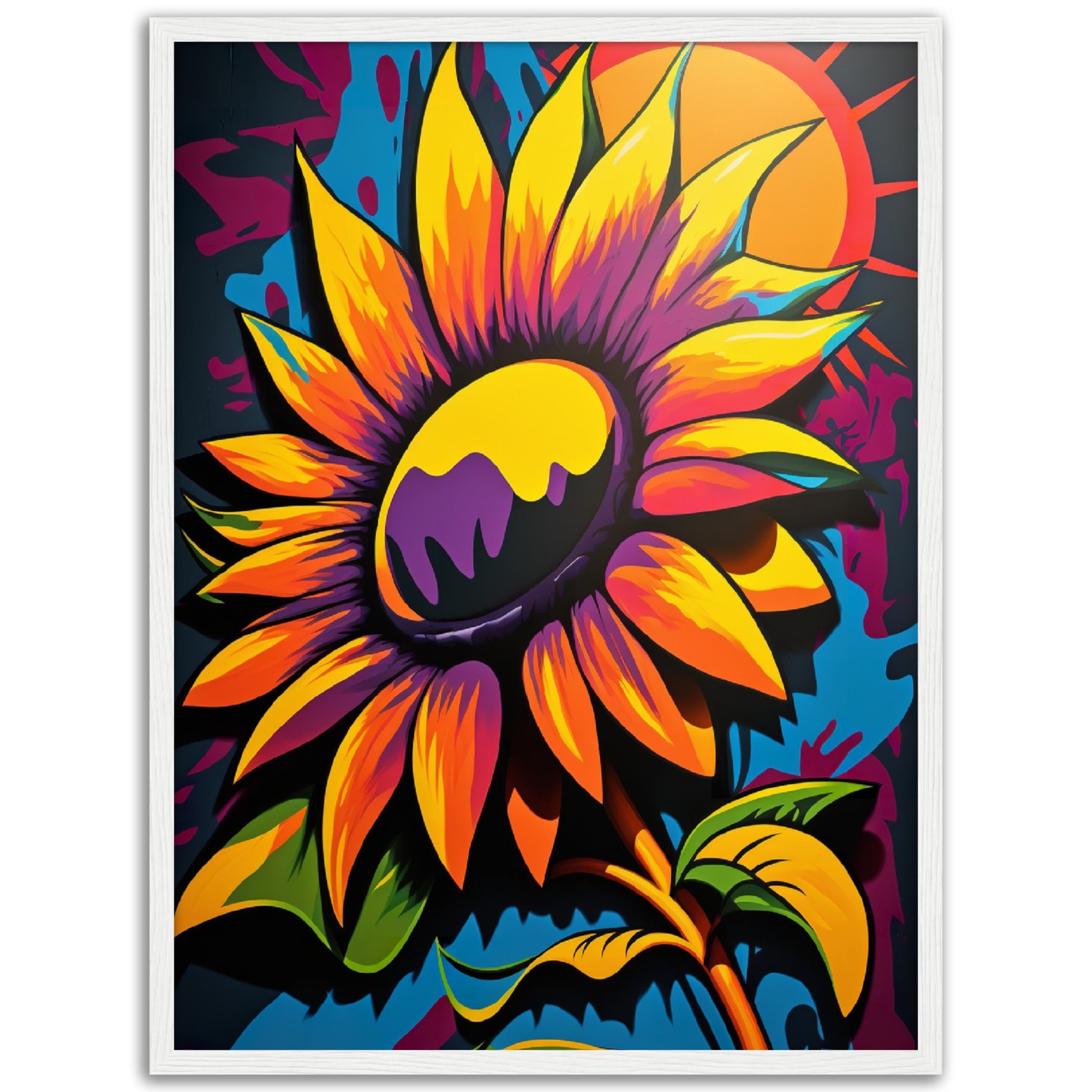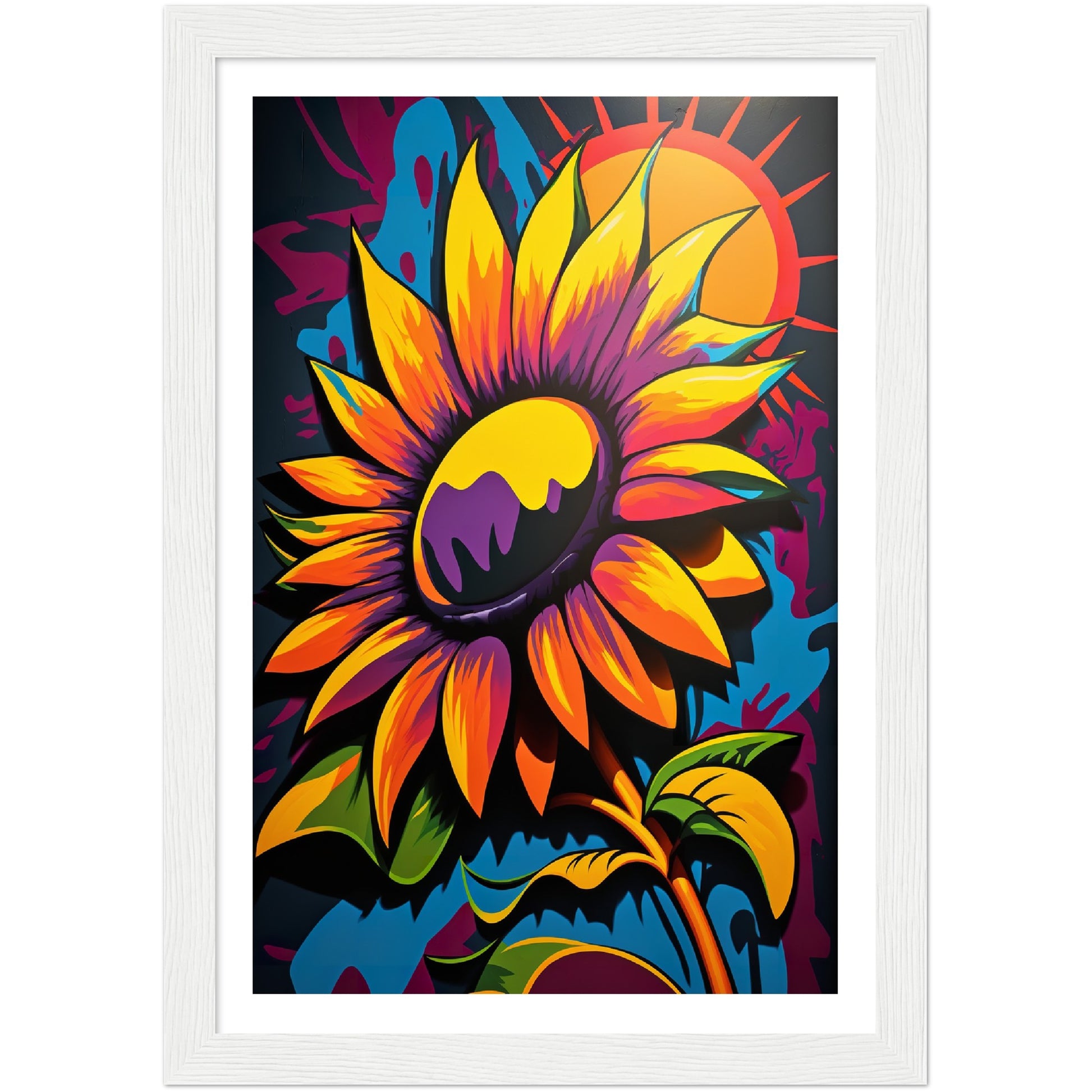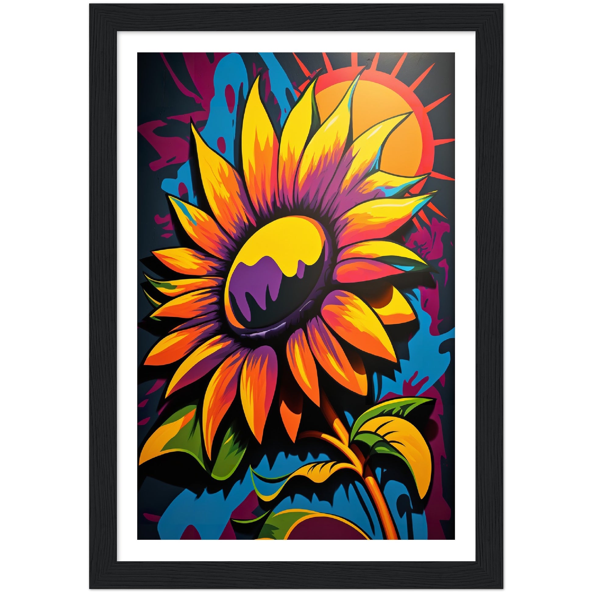 This vibrant graffiti inspired illustration features a stunning sunflower in all its glory. The bold colors and abstract shapes in the background add to the energy and movement of the piece. The attention to detail and use of contrasting colors make this artwork truly stand out. Perfect for adding a pop of color and personality to any space.